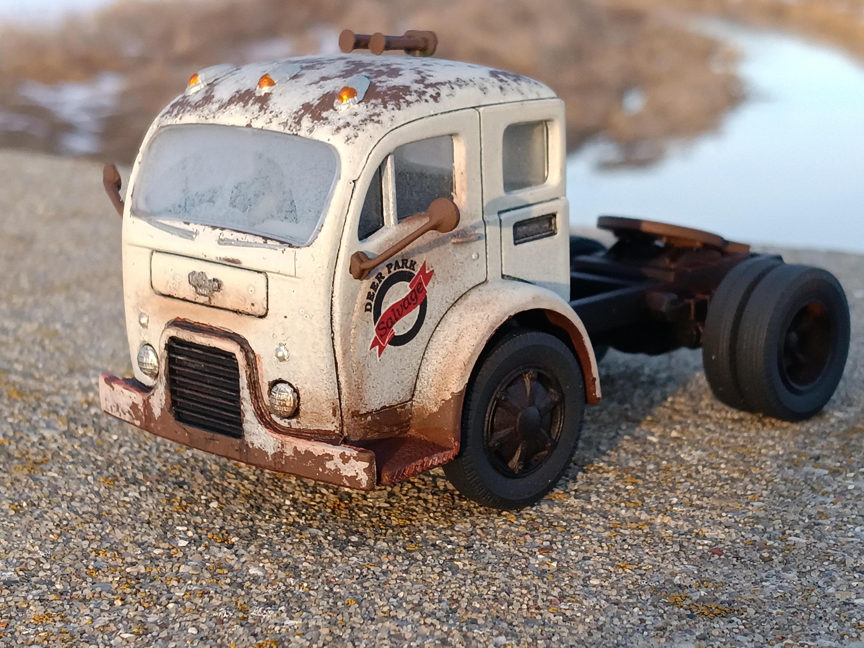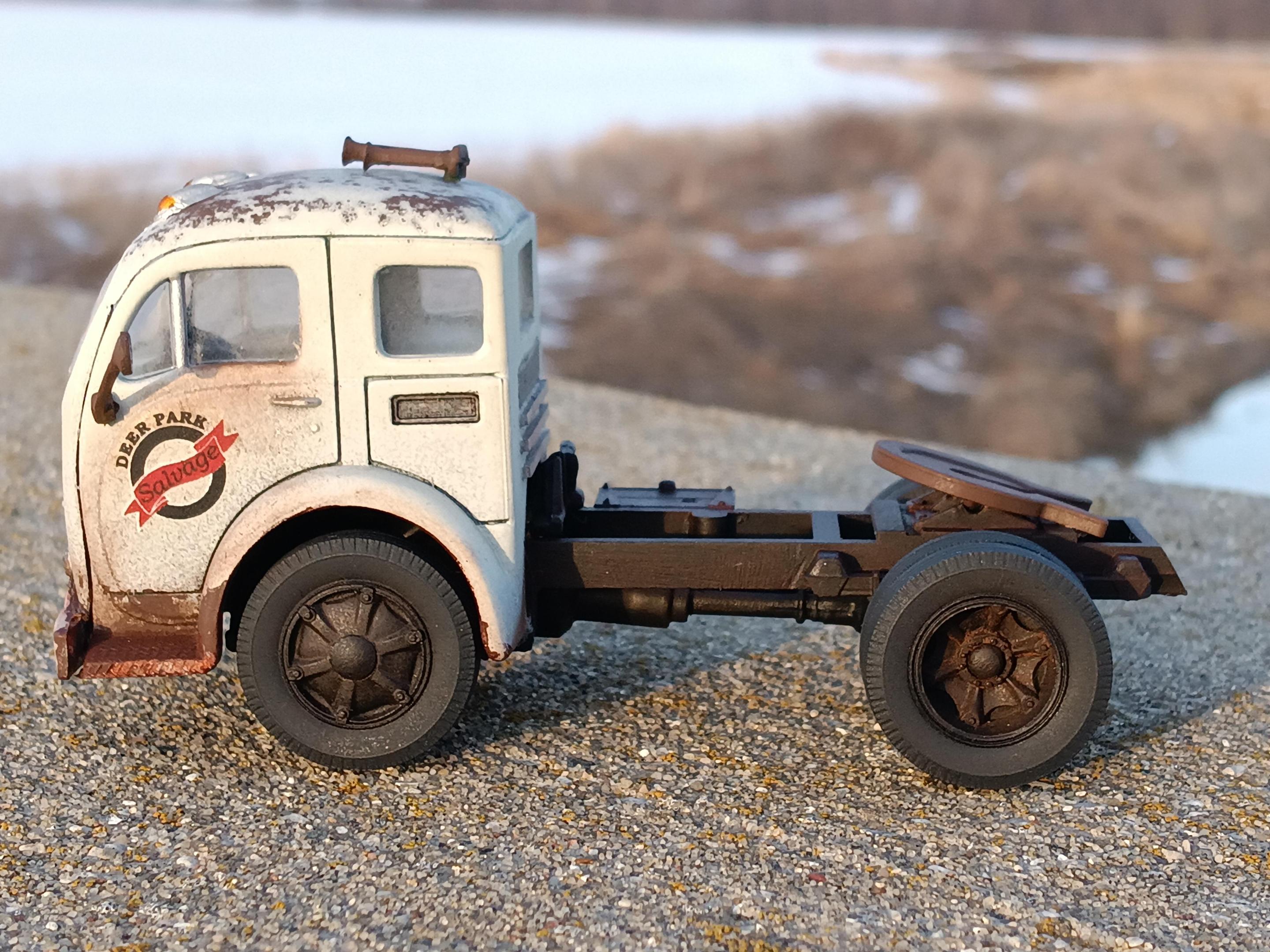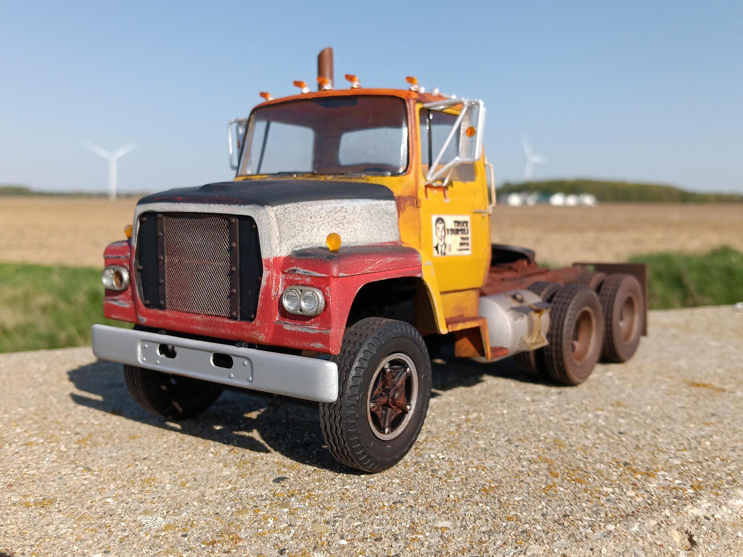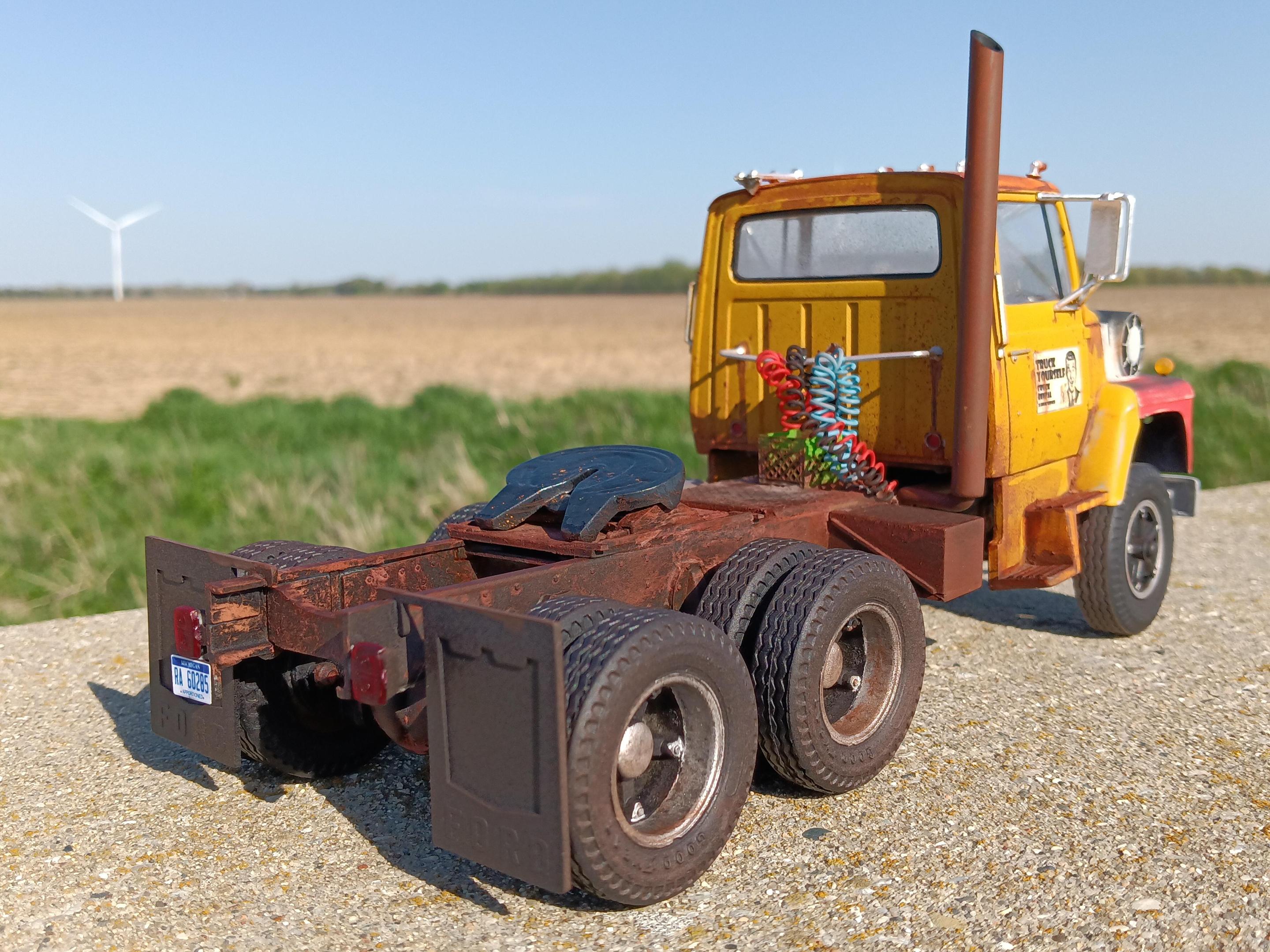 13. So... I had an incomplete AMT plow truck, a box or two of spare Louisville parts, some AITM rear wheels and tires, and some Models by Dave cab steps. I decided to combine the whole mess into one tattered tractor. The quad headlights came from a White Road Boss, I added them after seeing a junkyard Louisville that had been fitted with a similar setup. The paint scheme on the hood was inspired by a neighbor's old LNT dump truck.