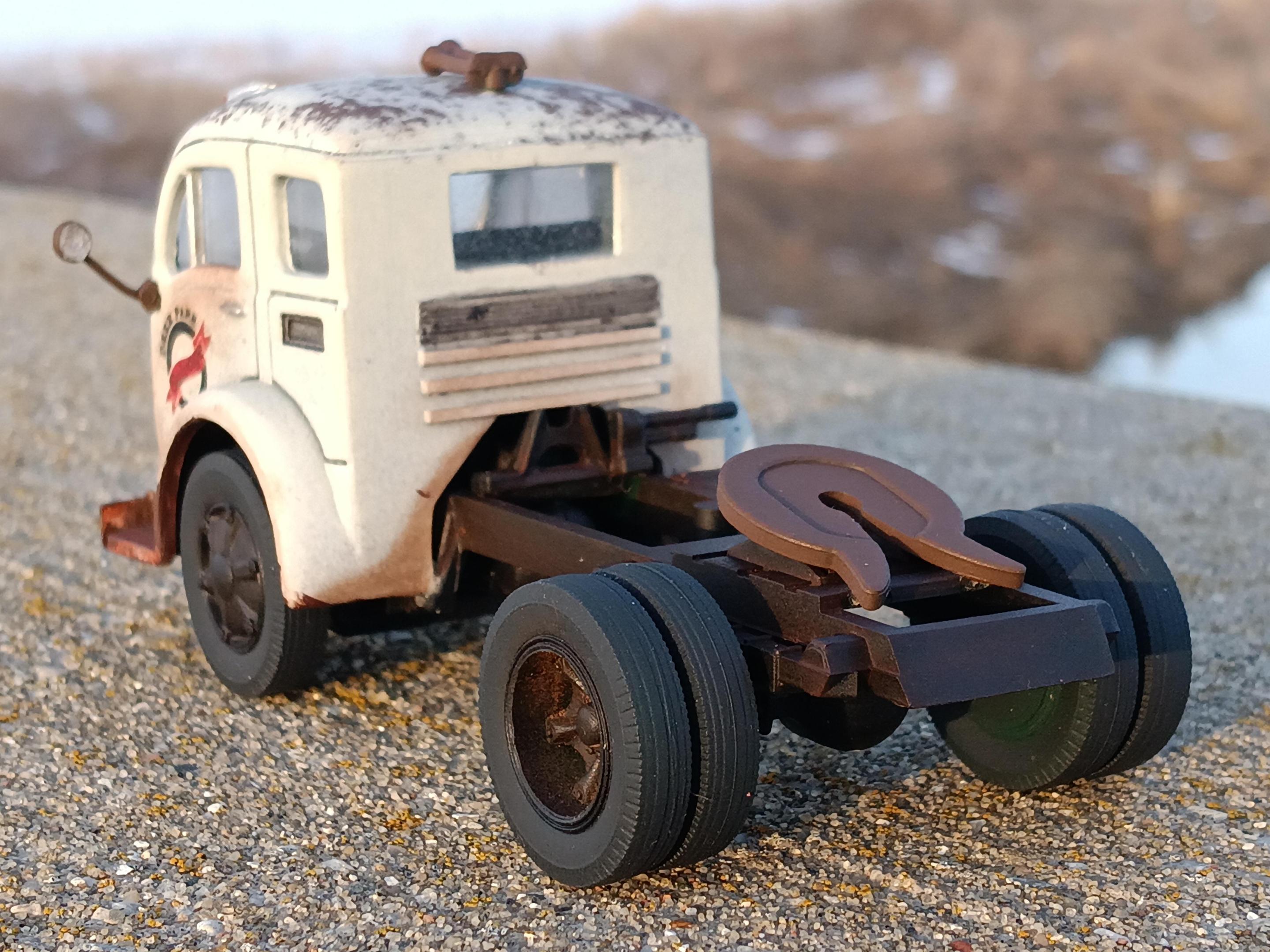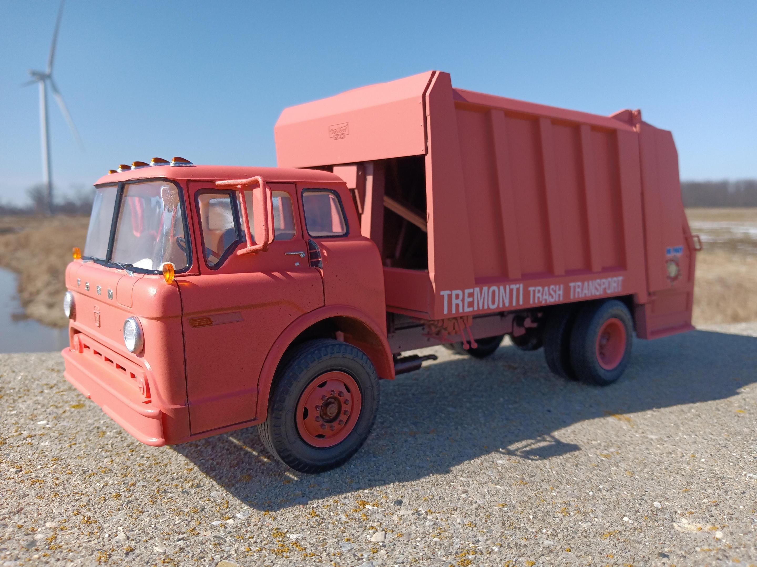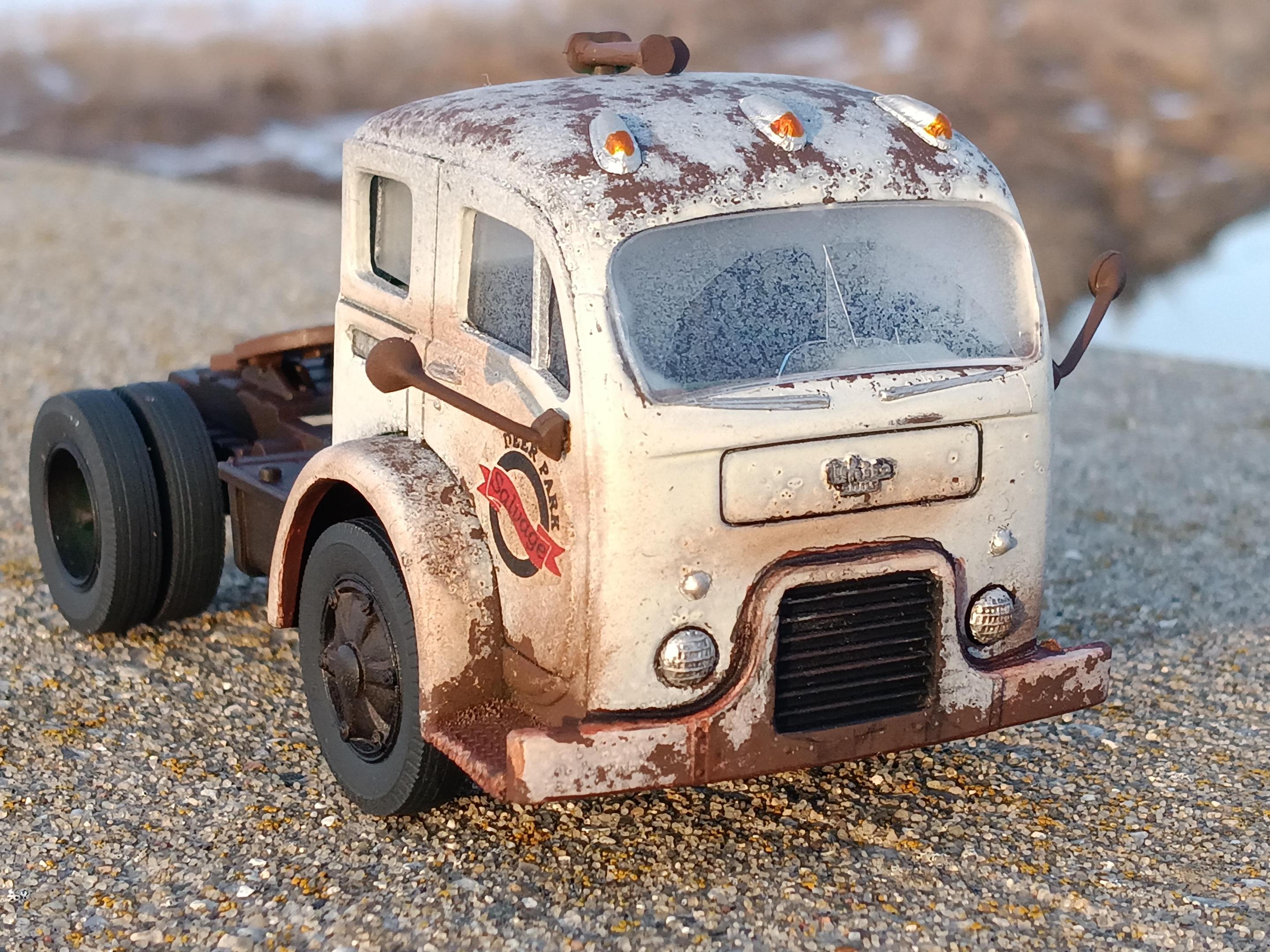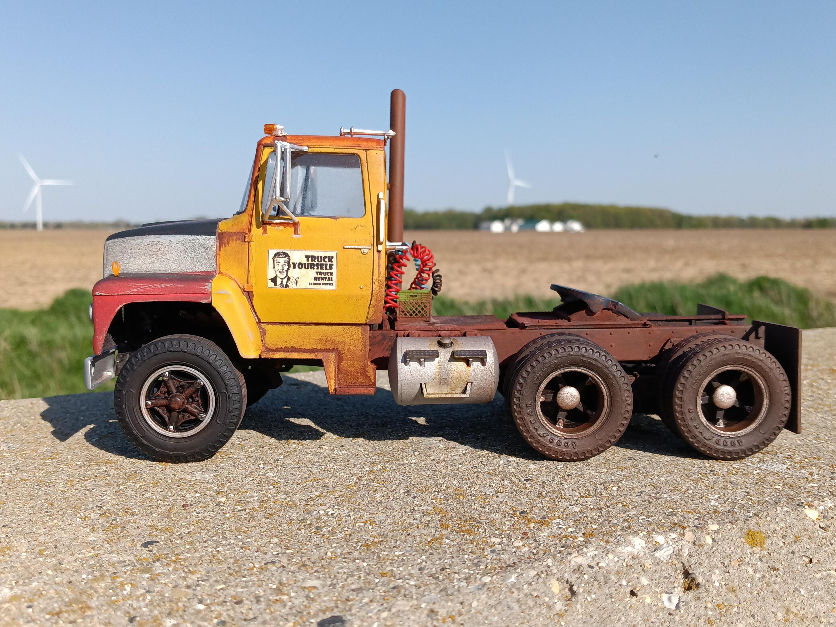13. So... I had an incomplete AMT plow truck, a box or two of spare Louisville parts, some AITM rear wheels and tires, and some Models by Dave cab steps. I decided to combine the whole mess into one tattered tractor. The quad headlights came from a White Road Boss, I added them after seeing a junkyard Louisville that had been fitted with a similar setup. The paint scheme on the hood was inspired by a neighbor's old LNT dump truck.