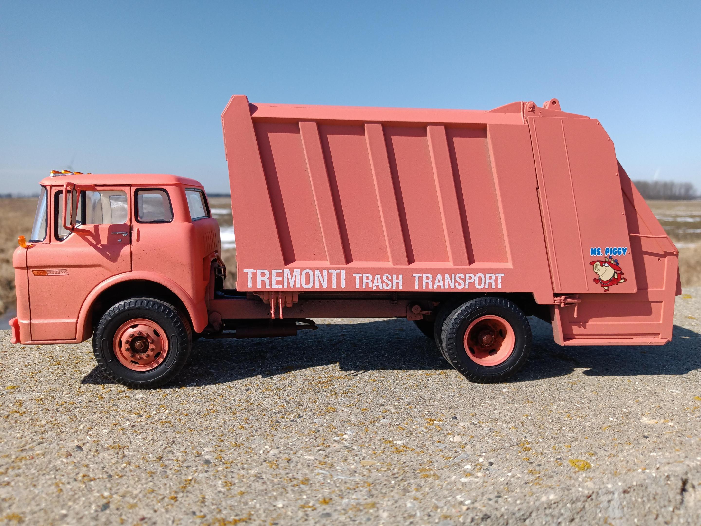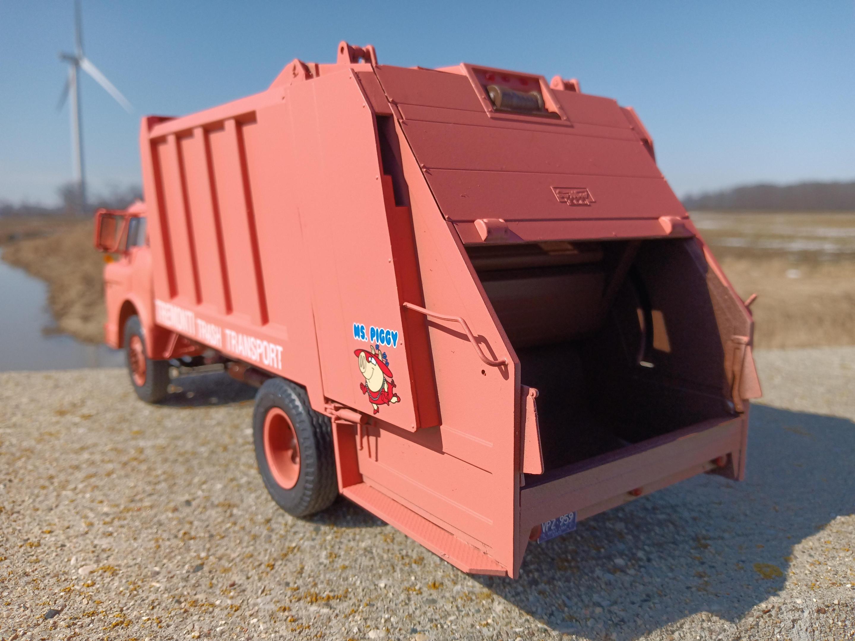 22. Mostly box stock buildup of the AMT kit. It's been treated to a hasty, "get it done before the shift starts" pink paint job (Krylon Colormaxx Matte Sunrise) and lettering, and some cutesy Ms. Piggy graphics to go with the color. Eventually it will get weathered and filled with trash. But for now it's just for show because Mr. Tremonti wants to show that he runs a legit business and not a Mafia front company... Wait... Forget I said that last part...