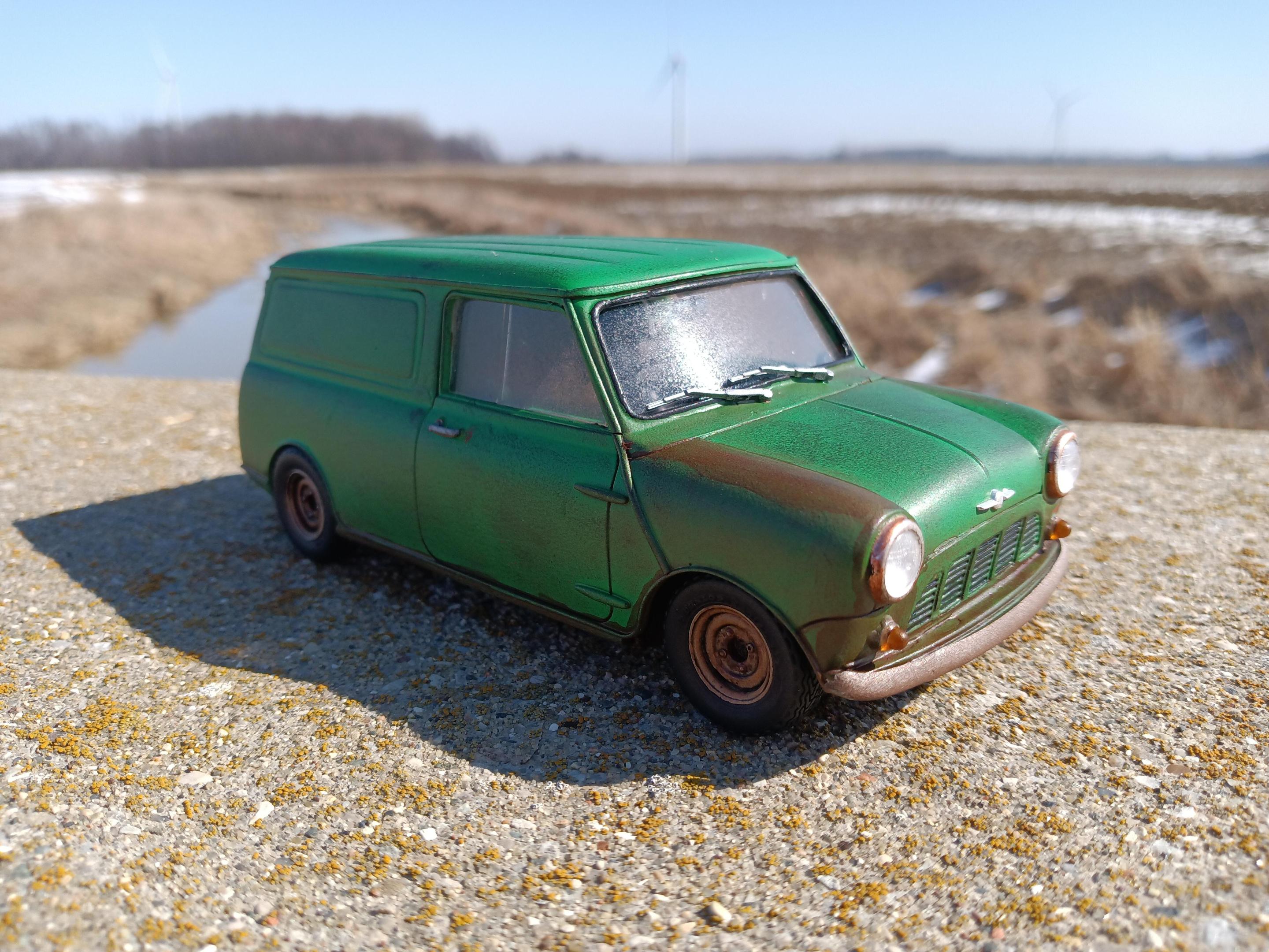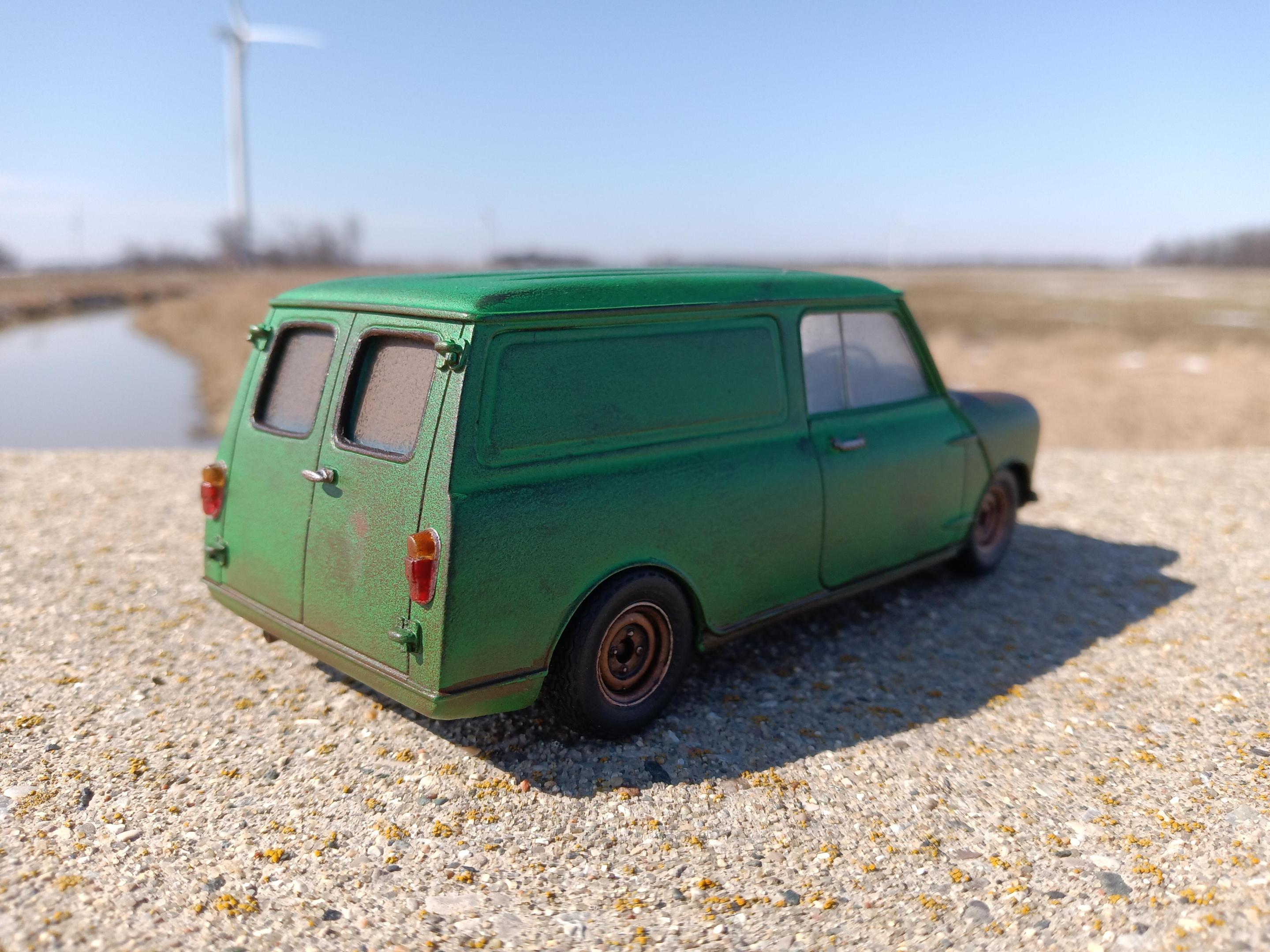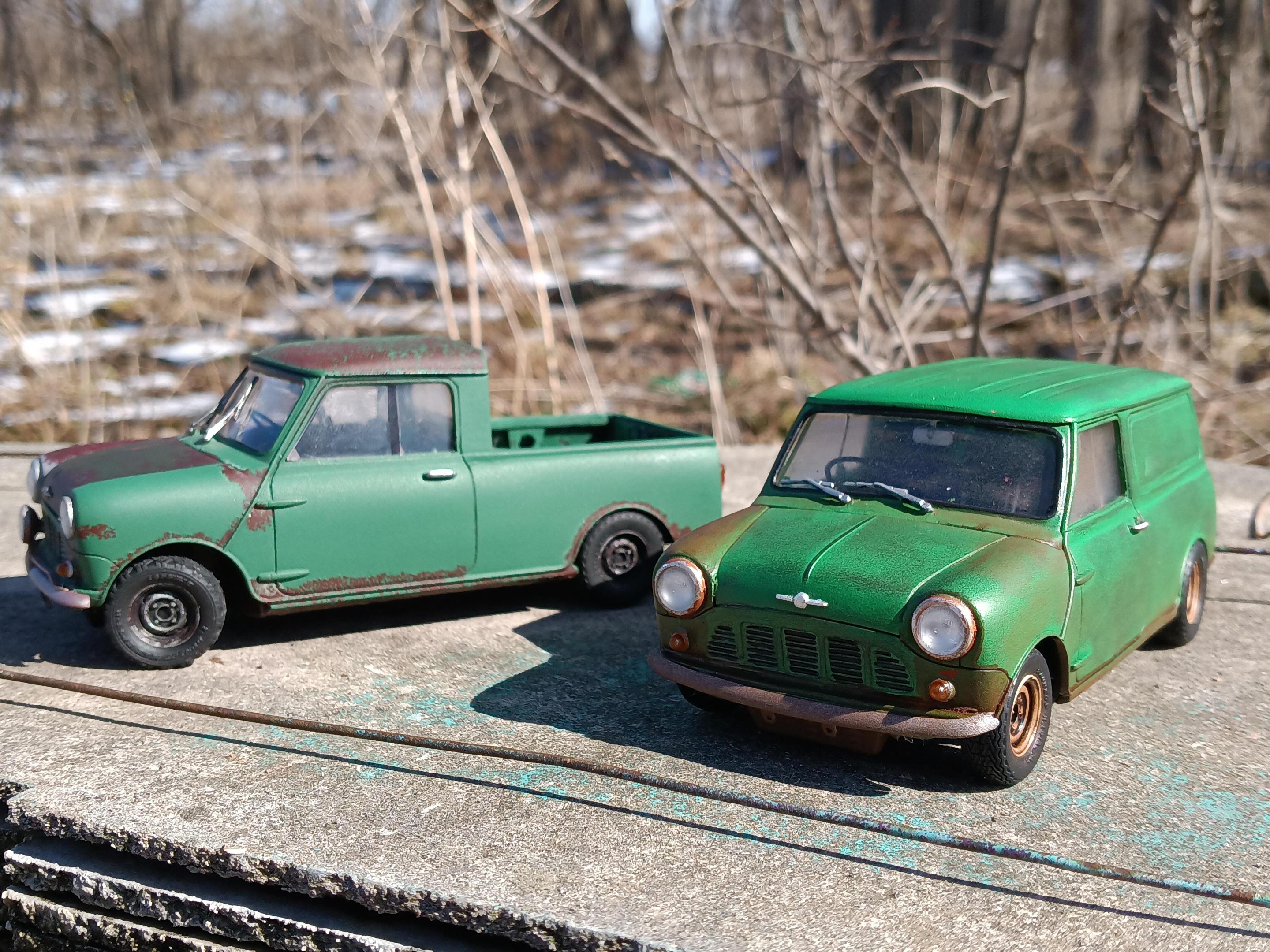 24. Just a fun little combination of an incomplete Tamiya kit and an old resin conversion kit. Paint is distressed Tamiya Park Green on the body and Krylon Colonial Ivory on the wheels. Monroe weathering powder simulates rust and London grime, with help from Vallejo rust washes. The body was missing A panel seams and fuel filler cutout. I used d-shaped plastic strip to add the seams and completely forgot adding that fuel fill cutout. In the immortal words of Homer Simpson... D'OH!!!! The pickup in the last picture was built years ago from a Tamiya kit with a Scale Kraft transkit. It recently got new number plate decals as the original front plate had chipped badly. Next Mini I build won't be green. ? I think. Possibly.