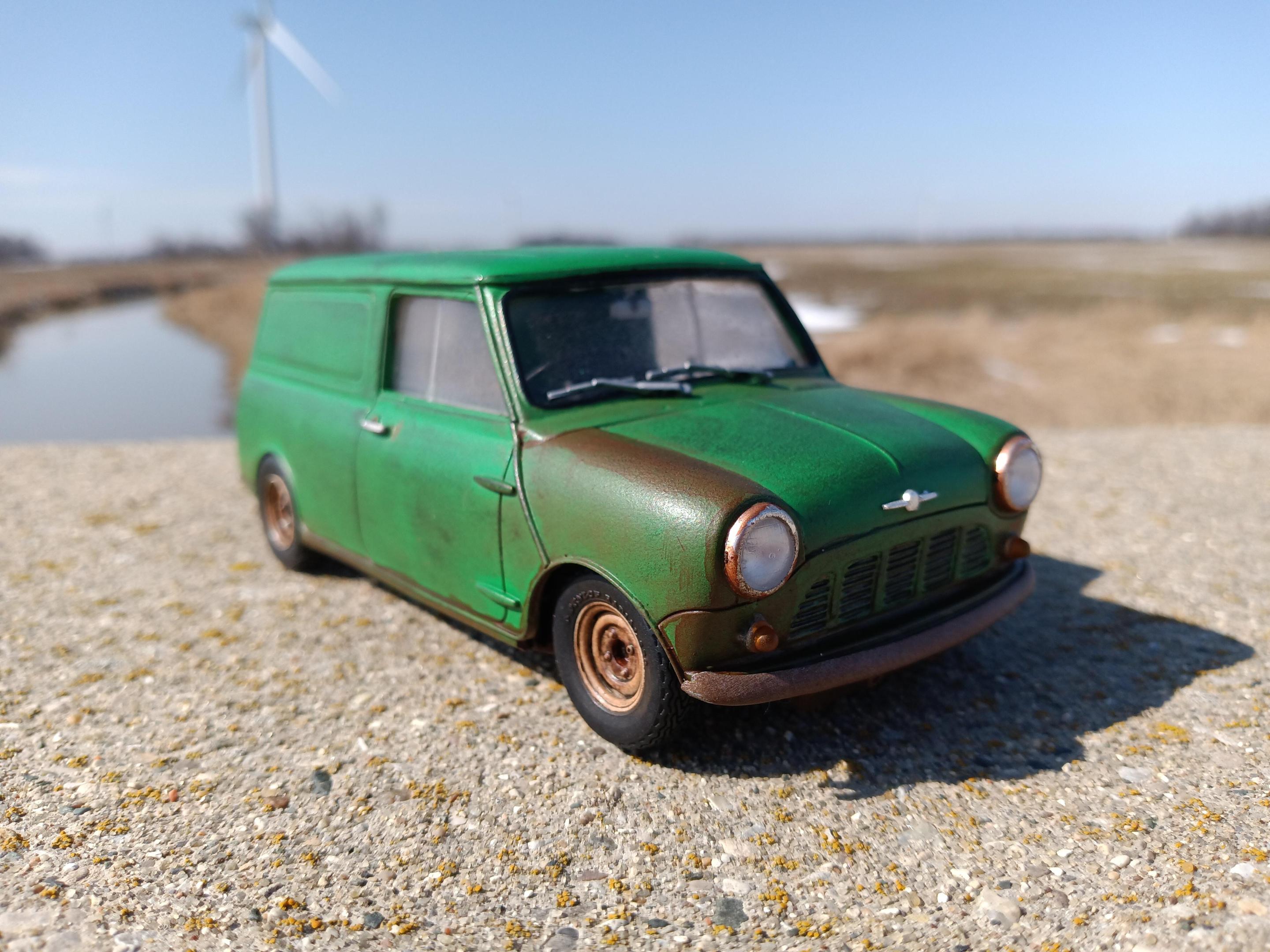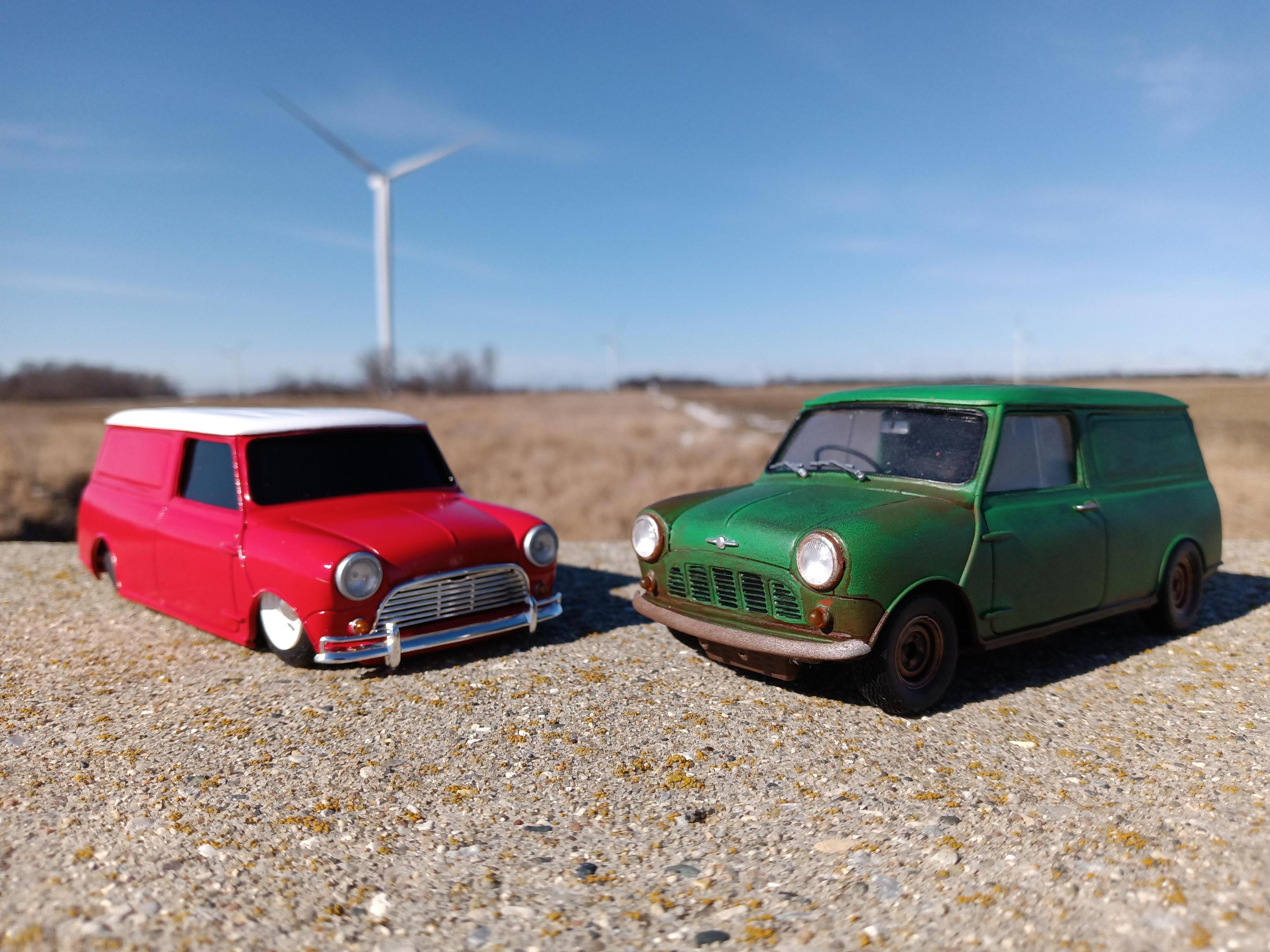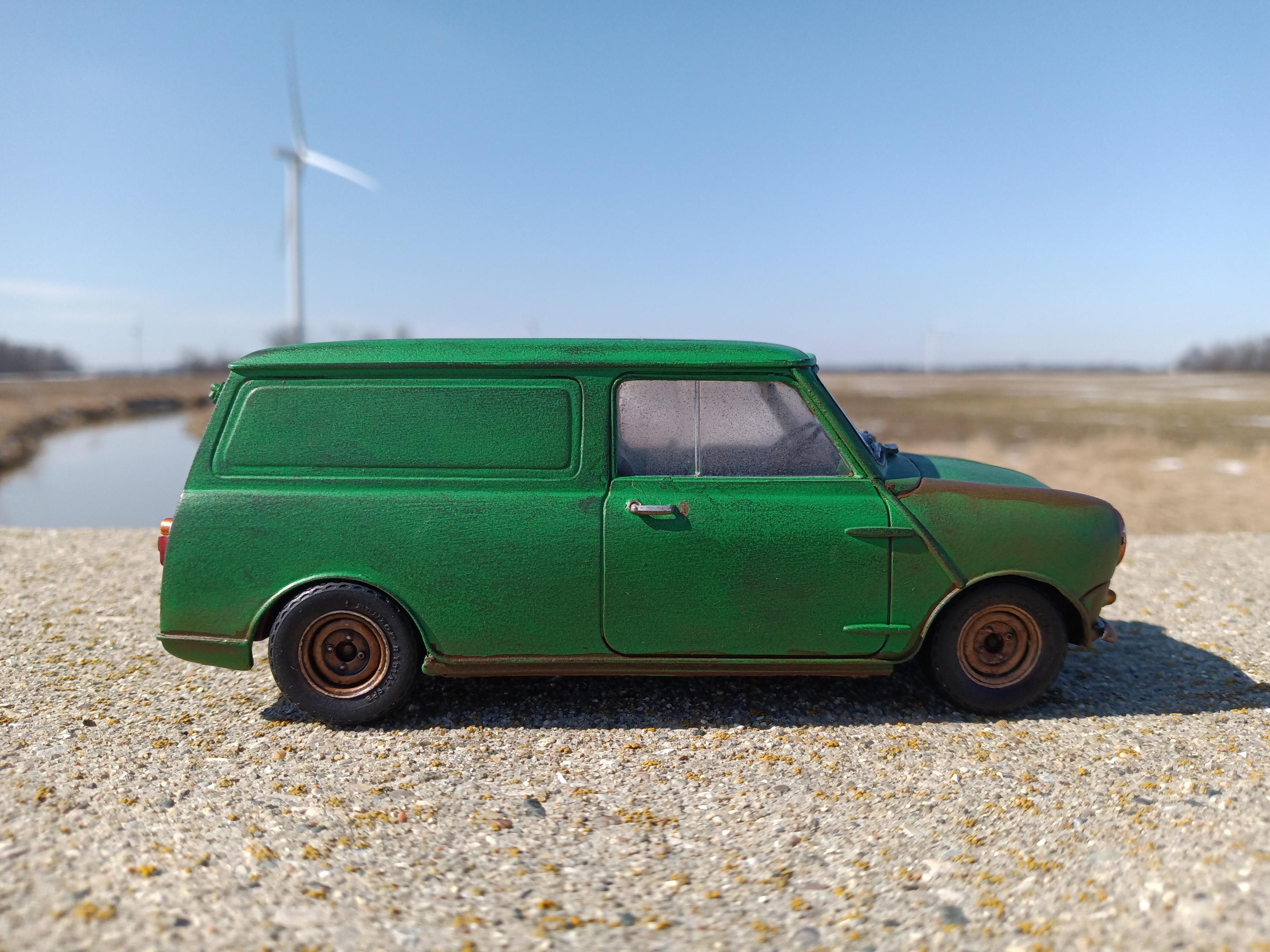 24. Just a fun little combination of an incomplete Tamiya kit and an old resin conversion kit. Paint is distressed Tamiya Park Green on the body and Krylon Colonial Ivory on the wheels. Monroe weathering powder simulates rust and London grime, with help from Vallejo rust washes. The body was missing A panel seams and fuel filler cutout. I used d-shaped plastic strip to add the seams and completely forgot adding that fuel fill cutout. In the immortal words of Homer Simpson... D'OH!!!! The pickup in the last picture was built years ago from a Tamiya kit with a Scale Kraft transkit. It recently got new number plate decals as the original front plate had chipped badly. Next Mini I build won't be green. ? I think. Possibly.