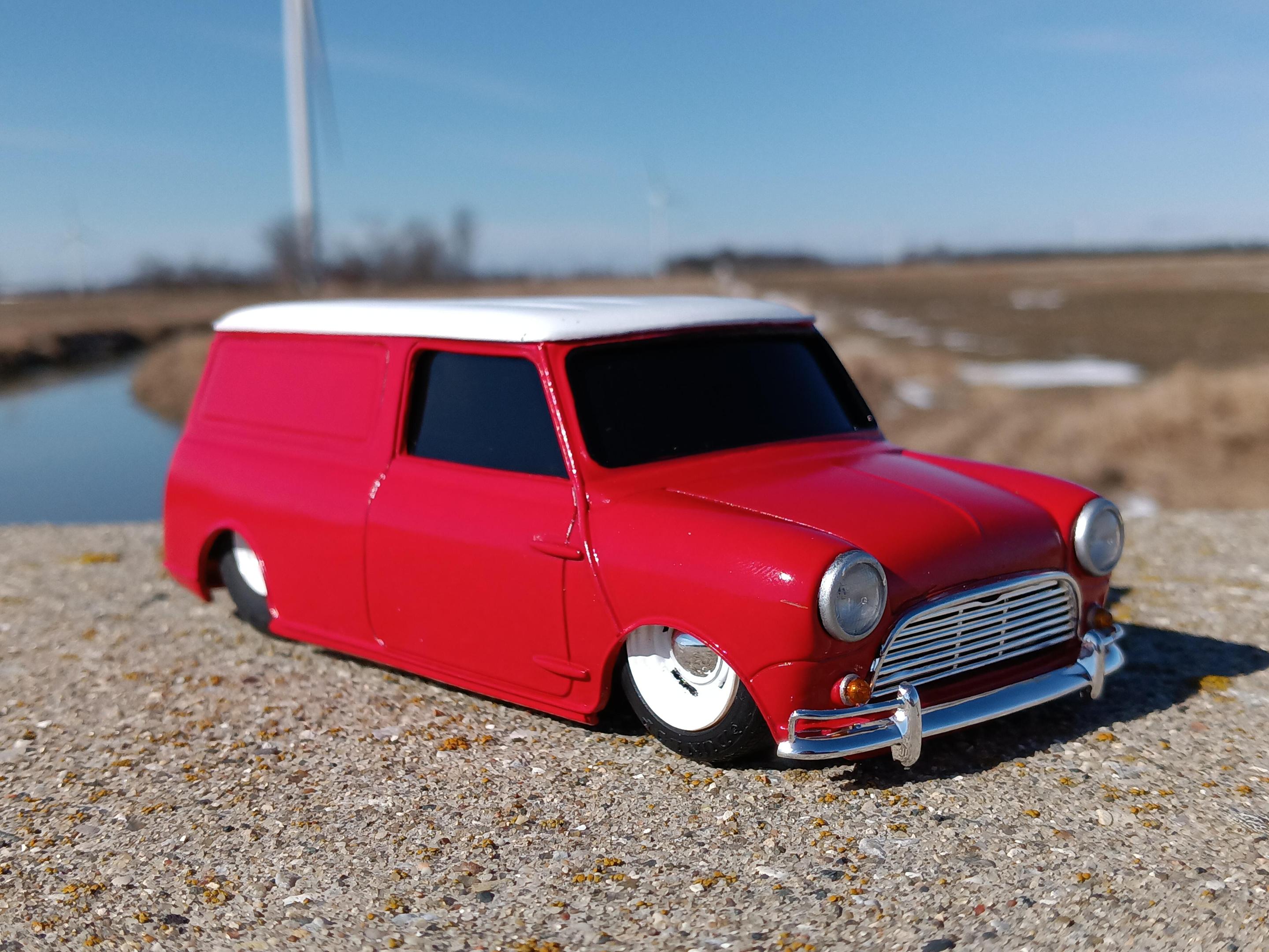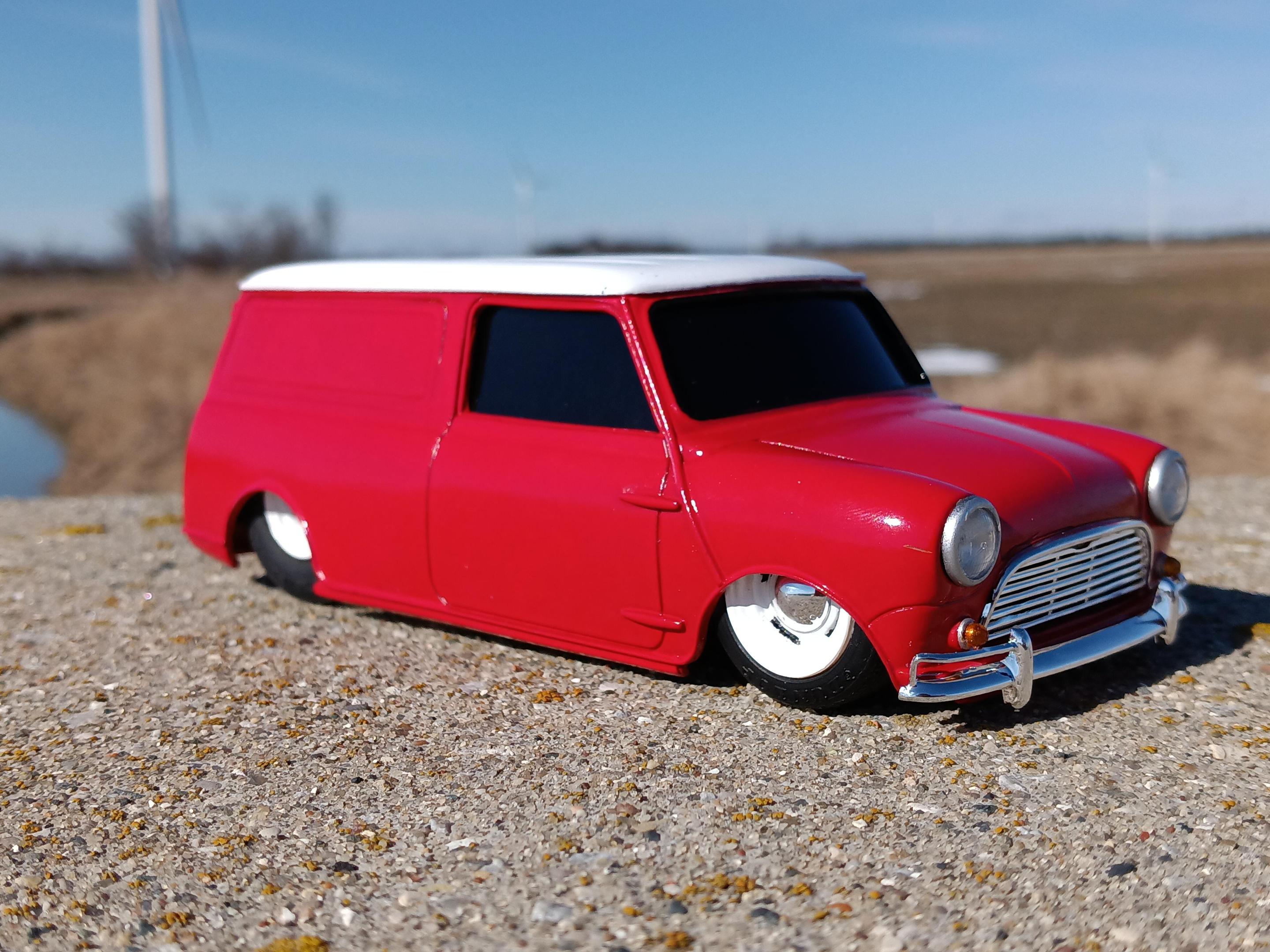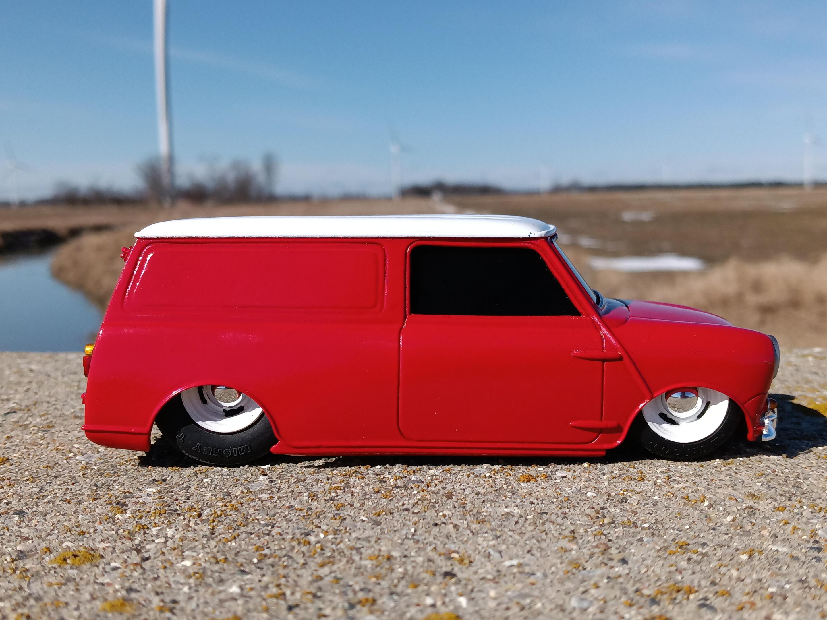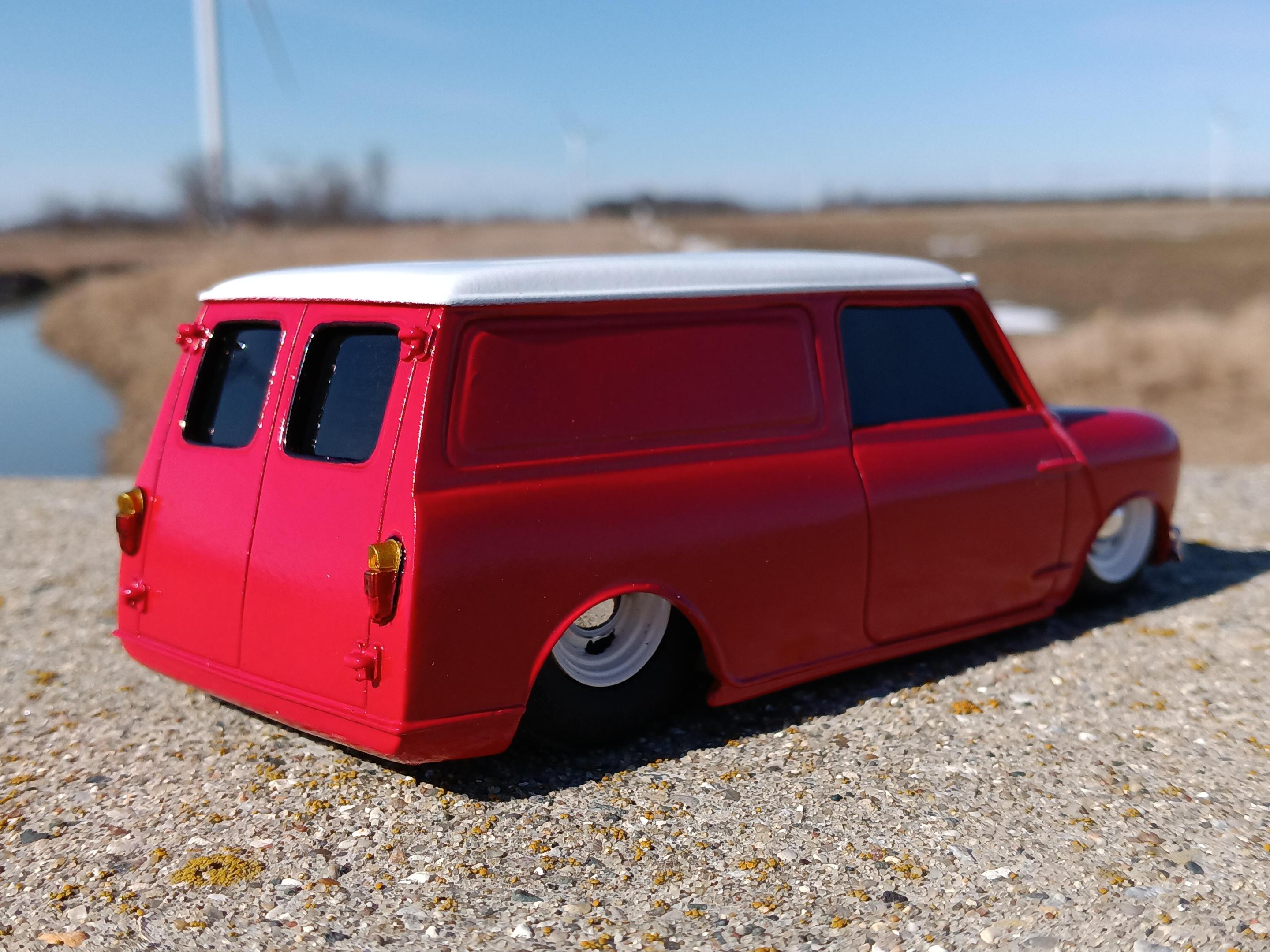 19. This is my other Morris Mini Van. I actually started this 5 or 6 years ago but it languished in the box until I finished the green one I posted a few days ago. It's a slammer, since it will ultimately become a trailer/flatbed load I chose not to go crazy with the details. Wheels and hubcaps are from a Revell 64 Chevrolet pickup, with parts box Dunlop tires up front and Mickey Thompsons out back. The body has shaved handles and wipers, but the A panel seams missing from the resin body was added using Evergreen D strip. Paint is Colorshot Stiletto (red) and Marshmallow (white). Told you the next Mini would not be green. ??Spare Tamiya kit parts fill out the rest.
