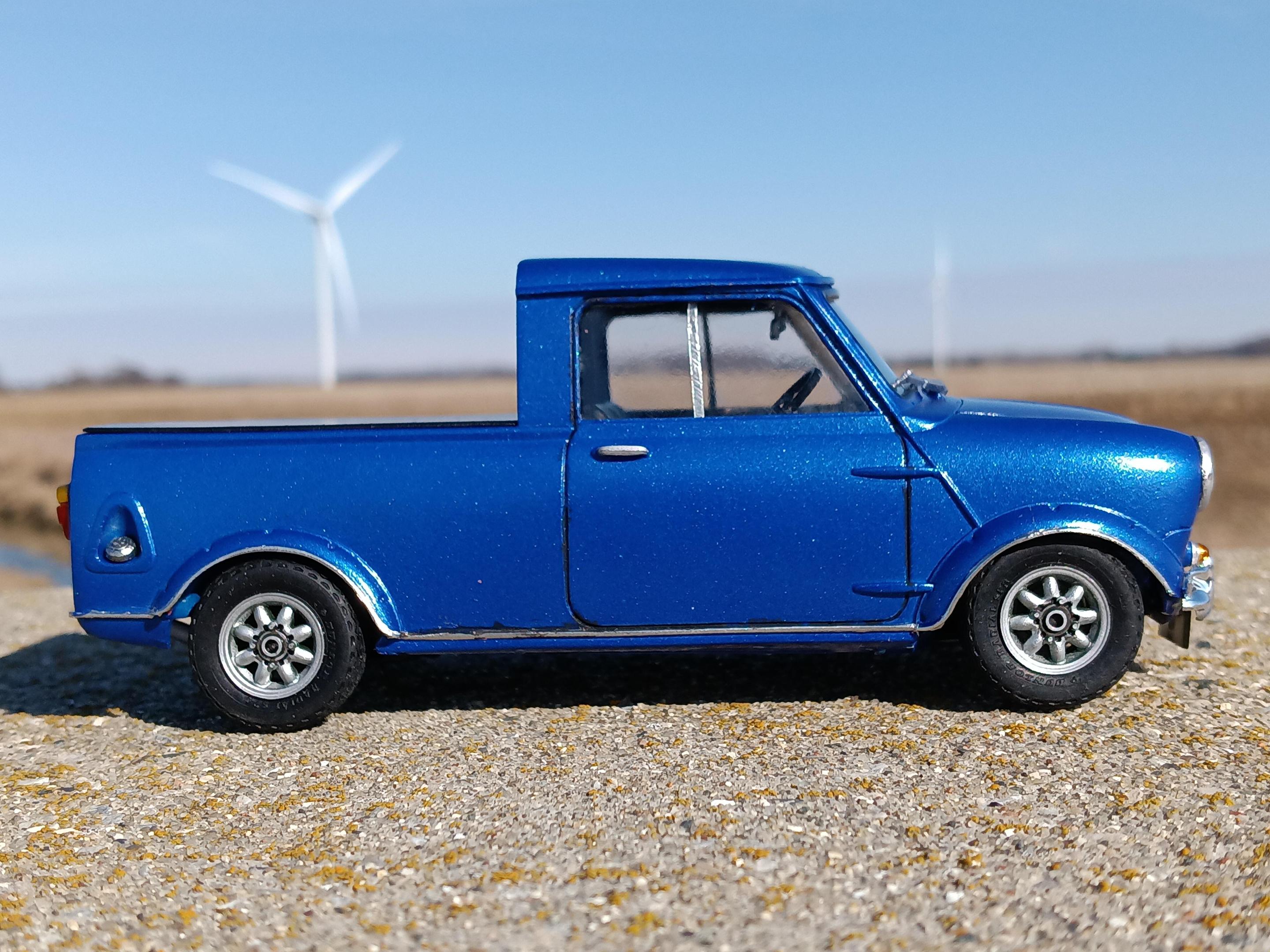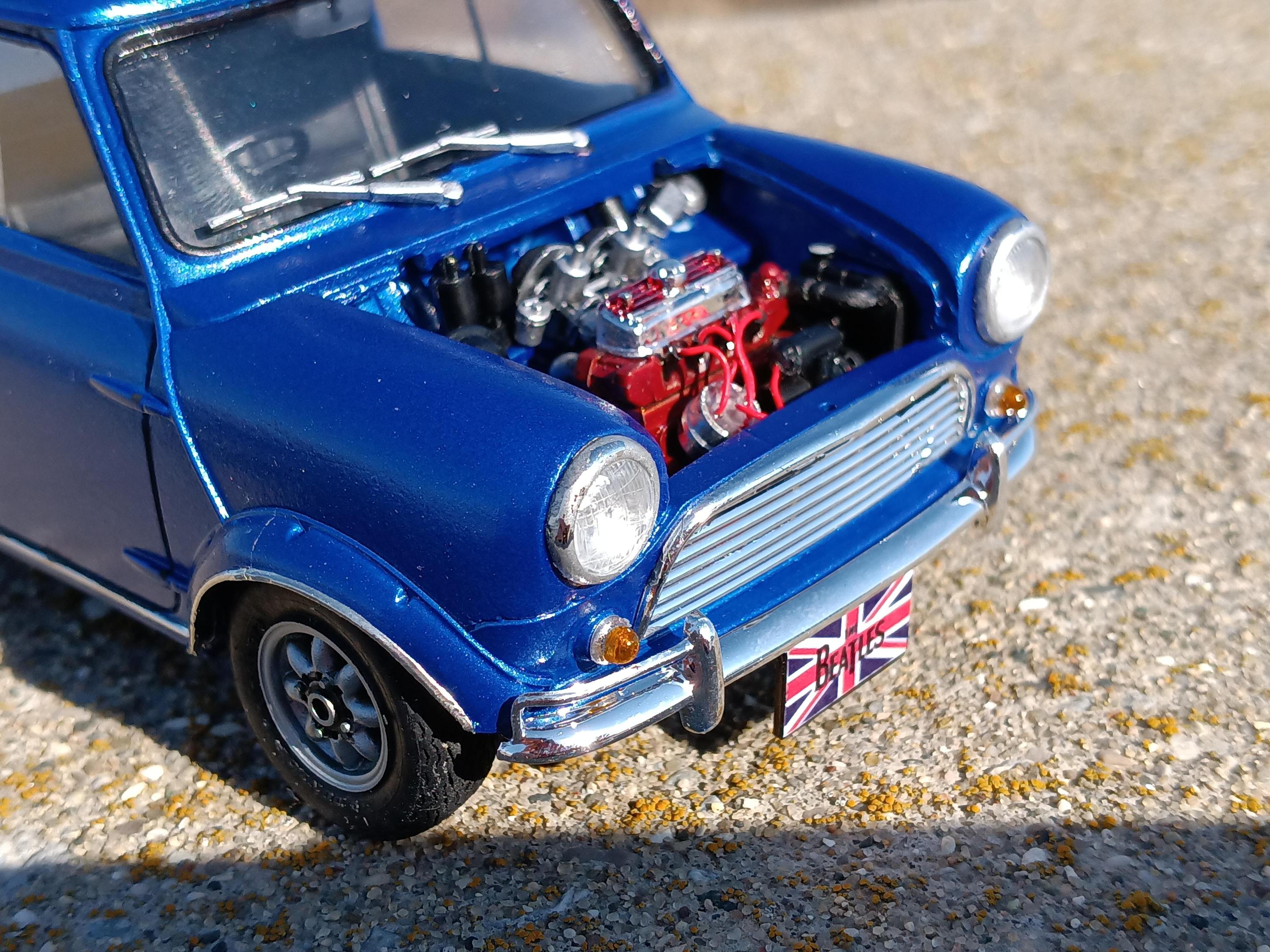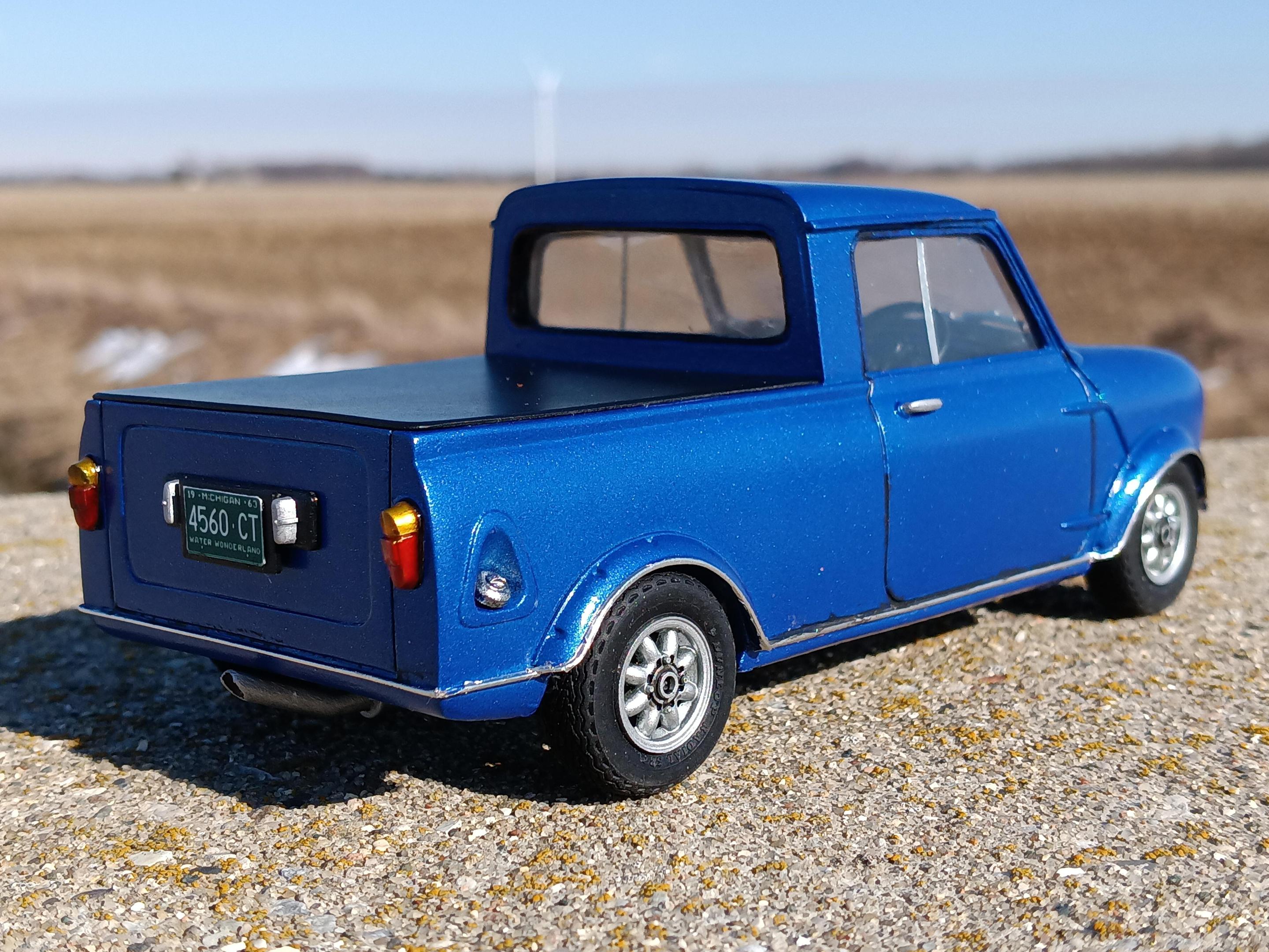 18. Well, my recent Morris Mini trilogy ends. ? This is the old Scale Kraft resin transkit combined with the Tamiya Morris Mini Cooper racing car. I cut out the pickup grille opening and splash apron and grafted in the Tamiya part to use the passenger car grille. The front flares are modified to clear a factory bumper. Paint is Testors Star Spangled Blue. The Beatles front plate was home printed and out back is a 1963 Michigan plate from Three Inches Under. My panel washes need a little cleanup and some foil work needs touch up (again... Gotta love digital photos and natural sunlight) but overall I'm really happy with how this came out.