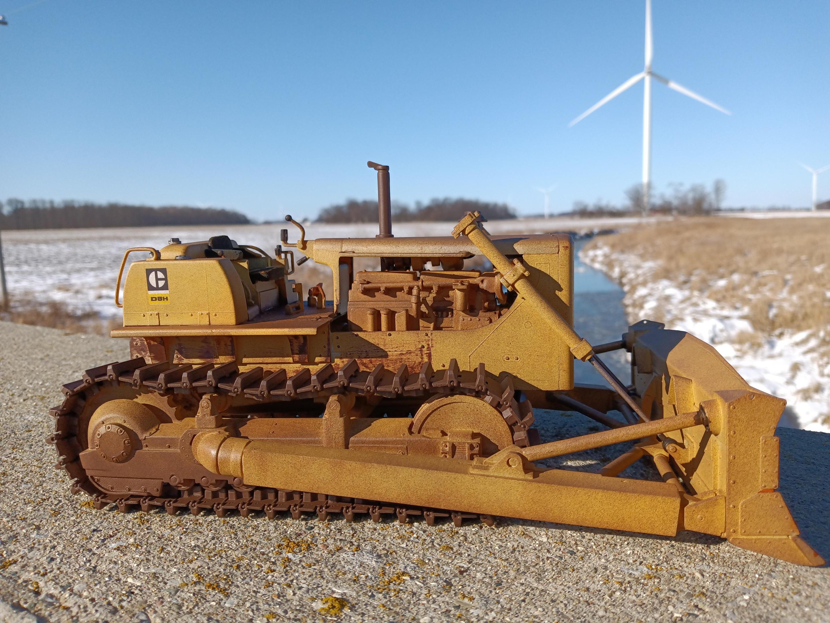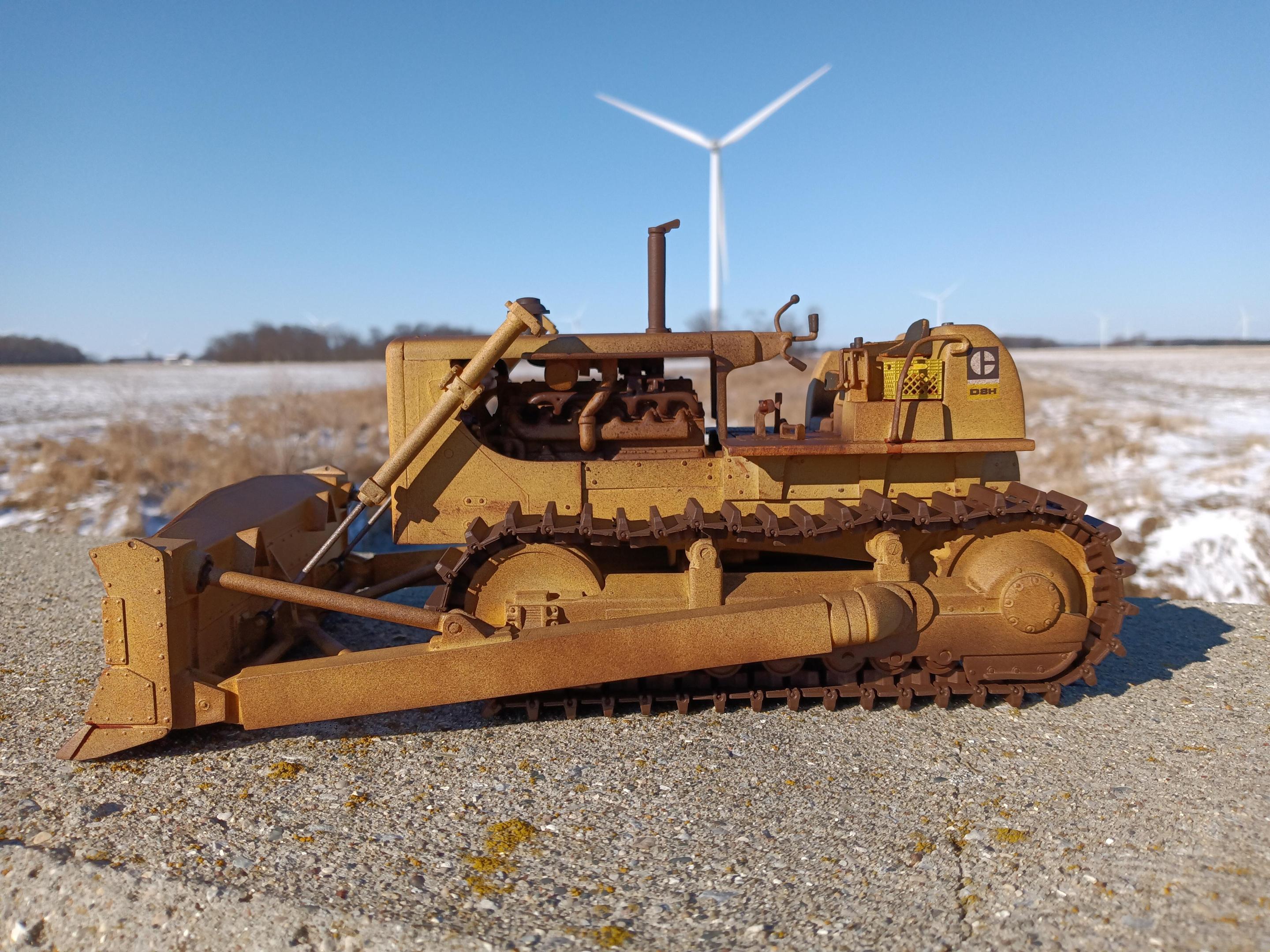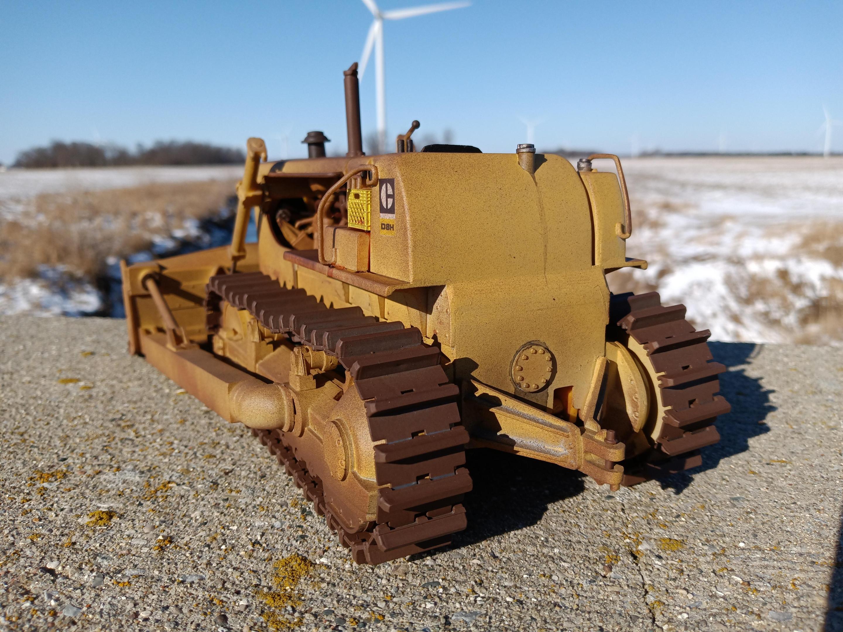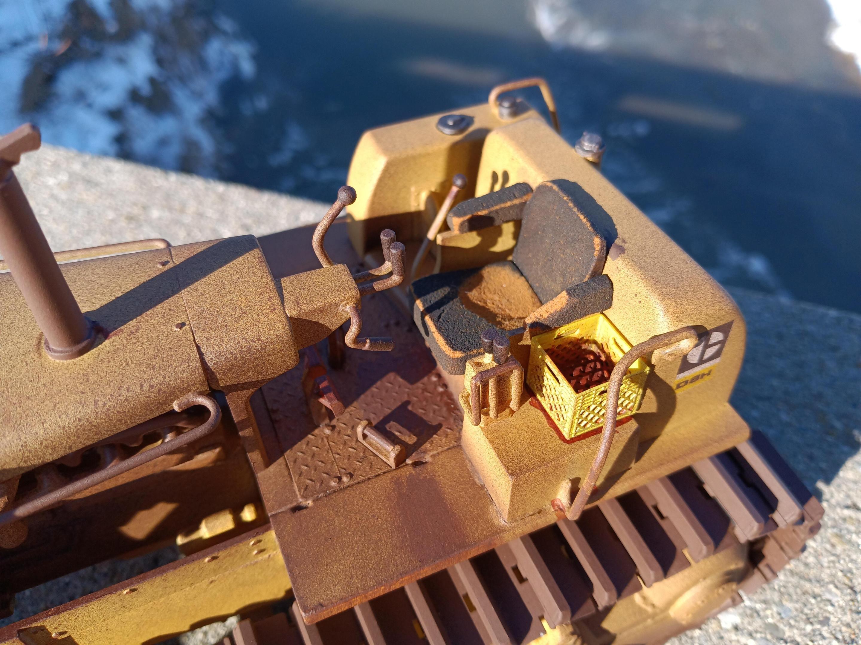 17. My brother got this for me for Christmas a few years back. I didn't do much aside from strip the chrome parts and stick it back in the stash. About a year ago I ran across some aftermarket decals, featuring a grille pattern and Caterpillar graphics. I don't know who printed them, they came with an envelope of various decals I bought along with a few other farm and construction kits. Anyway... Earlier this winter I finally decided it was this kit's turn at the bench. I kept it mostly box stock, with three exceptions. Obviously the aftermarket decals, and also a milk crate for a little extra storage, and seat cushions cut from balsa foam. The balsa foam was painted Tamiya Rubber Black and then sanded to simulate exposed padding. I went with the drawbar option instead of the ripper. Paint overall is Revell Matt Yellow, with Tamiya Linoleum Deck Brown on the tracks. LDB was also brushed and misted to simulate rust and grime, along with Tamiya Hull Red. The blade face is Revell Steel misted with more LDB and washed with Vallejo rust wash. Monroe weathering powder was also applied throughout. I definitely wanted a weathered appearance but something a touch more subtle than how a lot of people tend to build these. It's actually a pleasant kit to build, despite what I've heard about it. Kicking myself now for waiting this long to tear into one. Eventually I may add some hydraulic hoses but overall I'm happy enough with it.