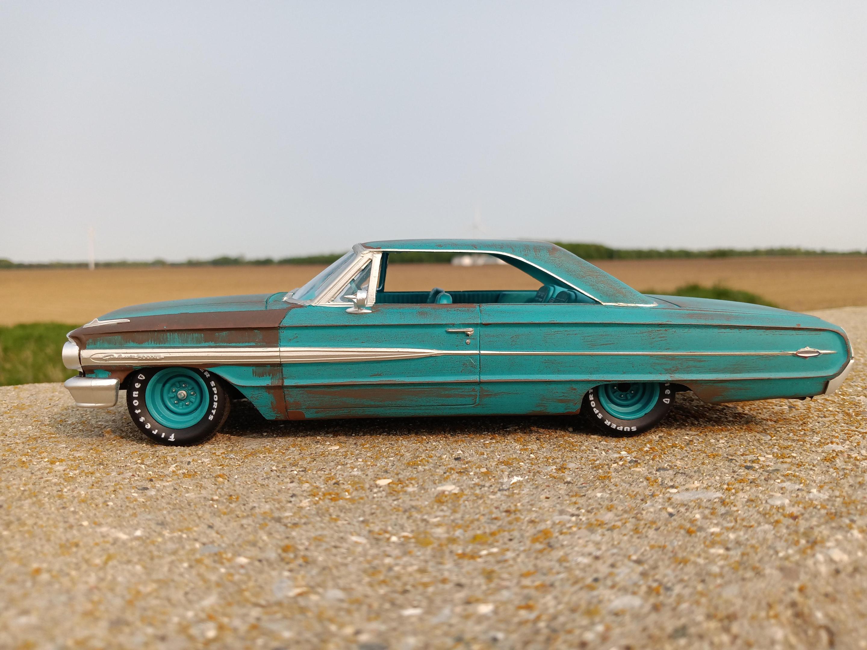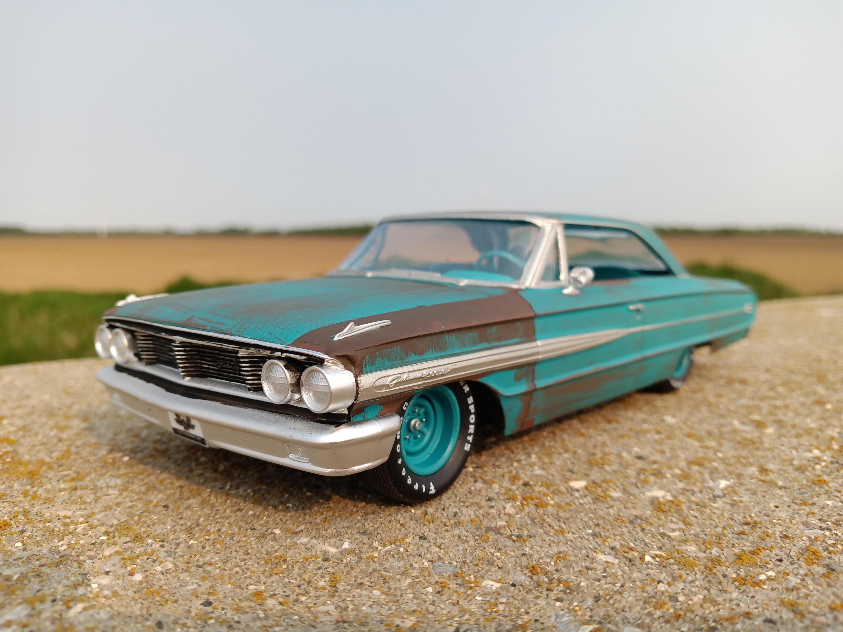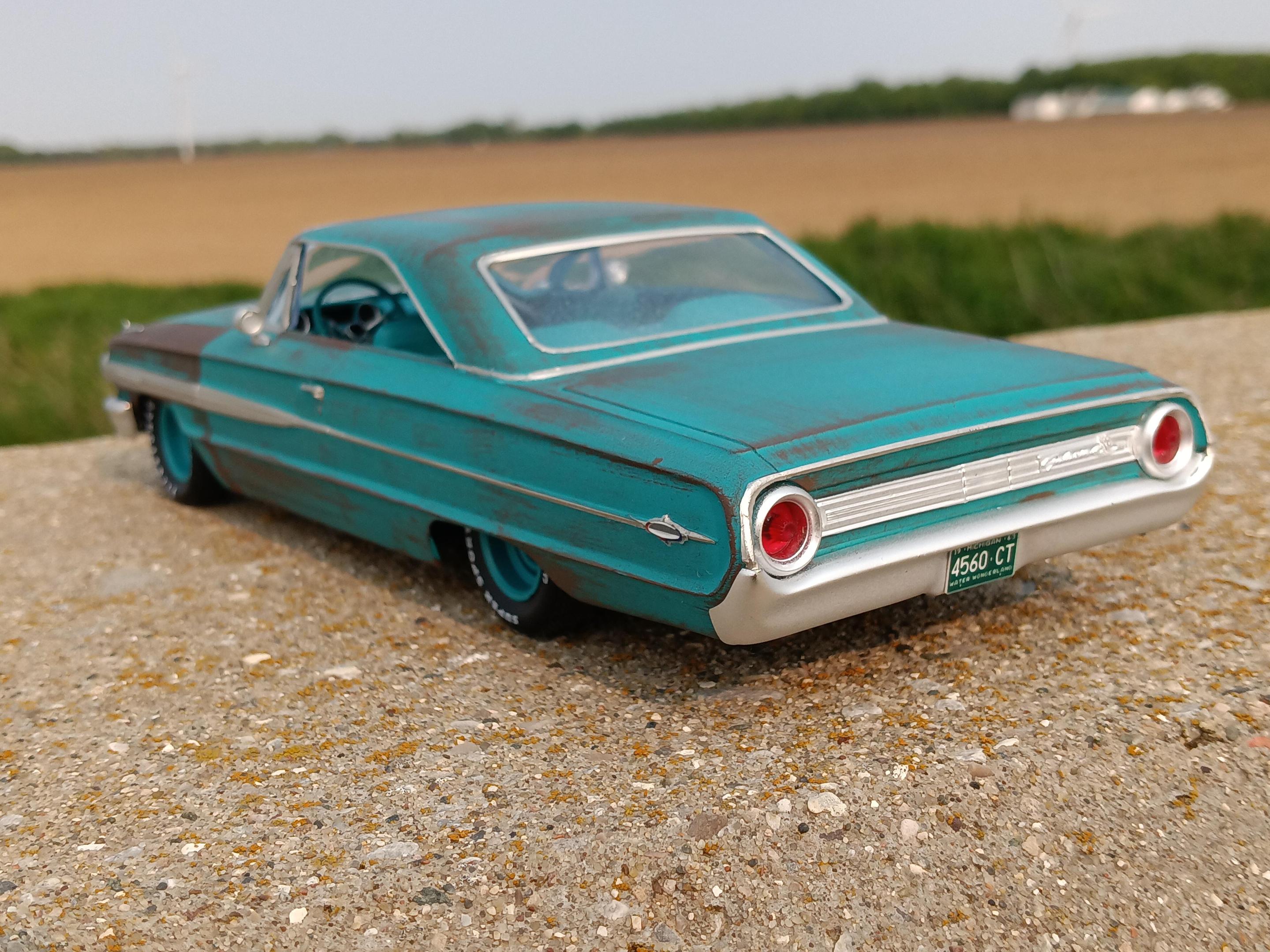 9. Simple build of a simple kit. A simple, lumpy, warped kit. The wheels came from a 1970 Ford cop car, printed Firestones came from the spares pile. I robbed some side mirrors from a 1960 Ranchero. The rest is box stock. The matte Krylon teal was distressed with a Vallejo rust paint set.