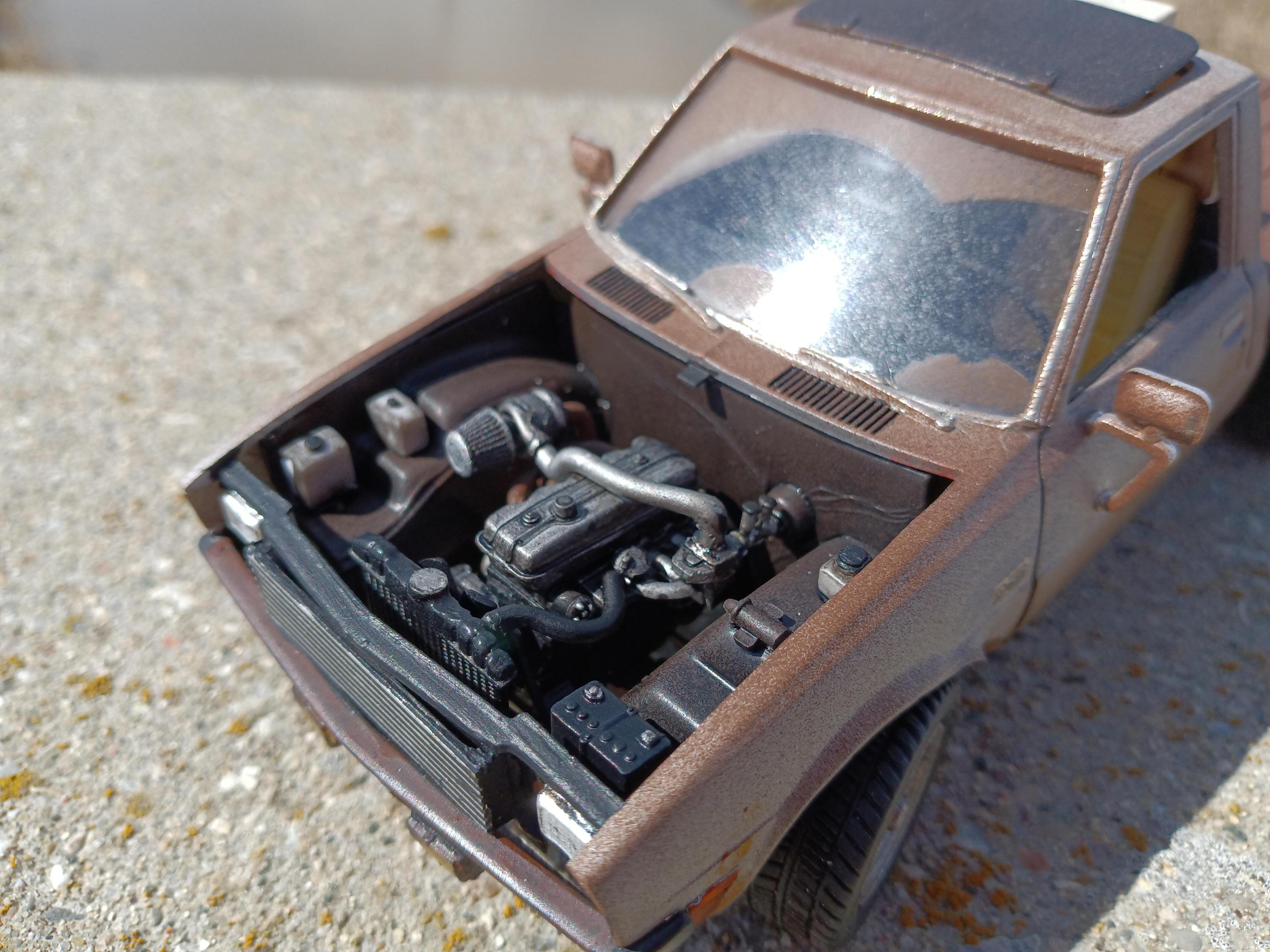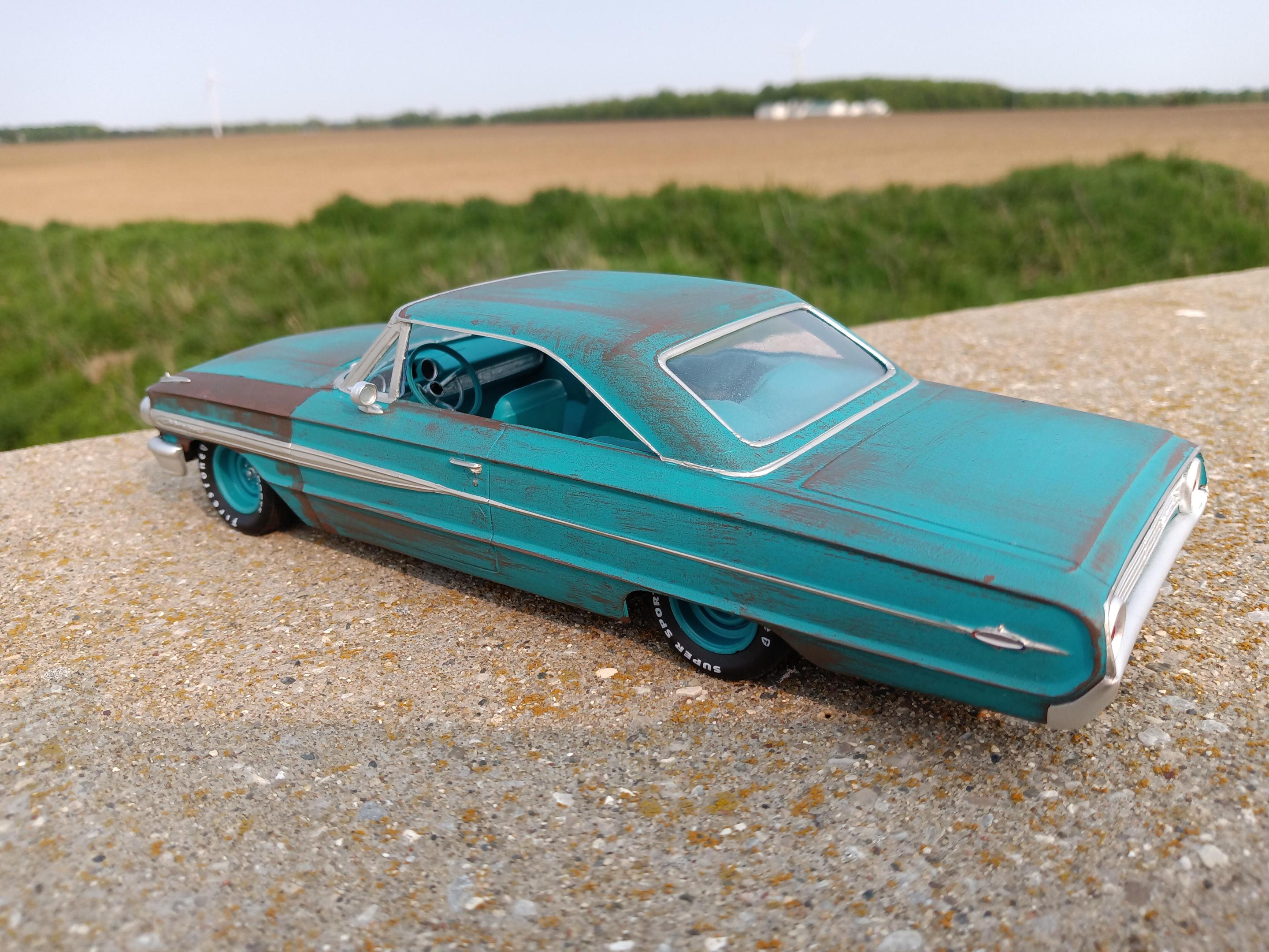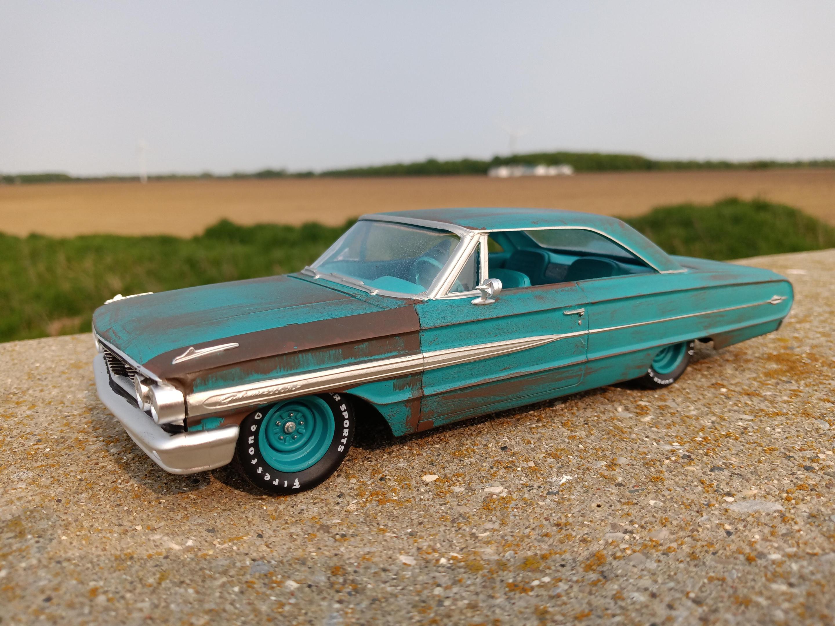 9. Simple build of a simple kit. A simple, lumpy, warped kit. The wheels came from a 1970 Ford cop car, printed Firestones came from the spares pile. I robbed some side mirrors from a 1960 Ranchero. The rest is box stock. The matte Krylon teal was distressed with a Vallejo rust paint set.