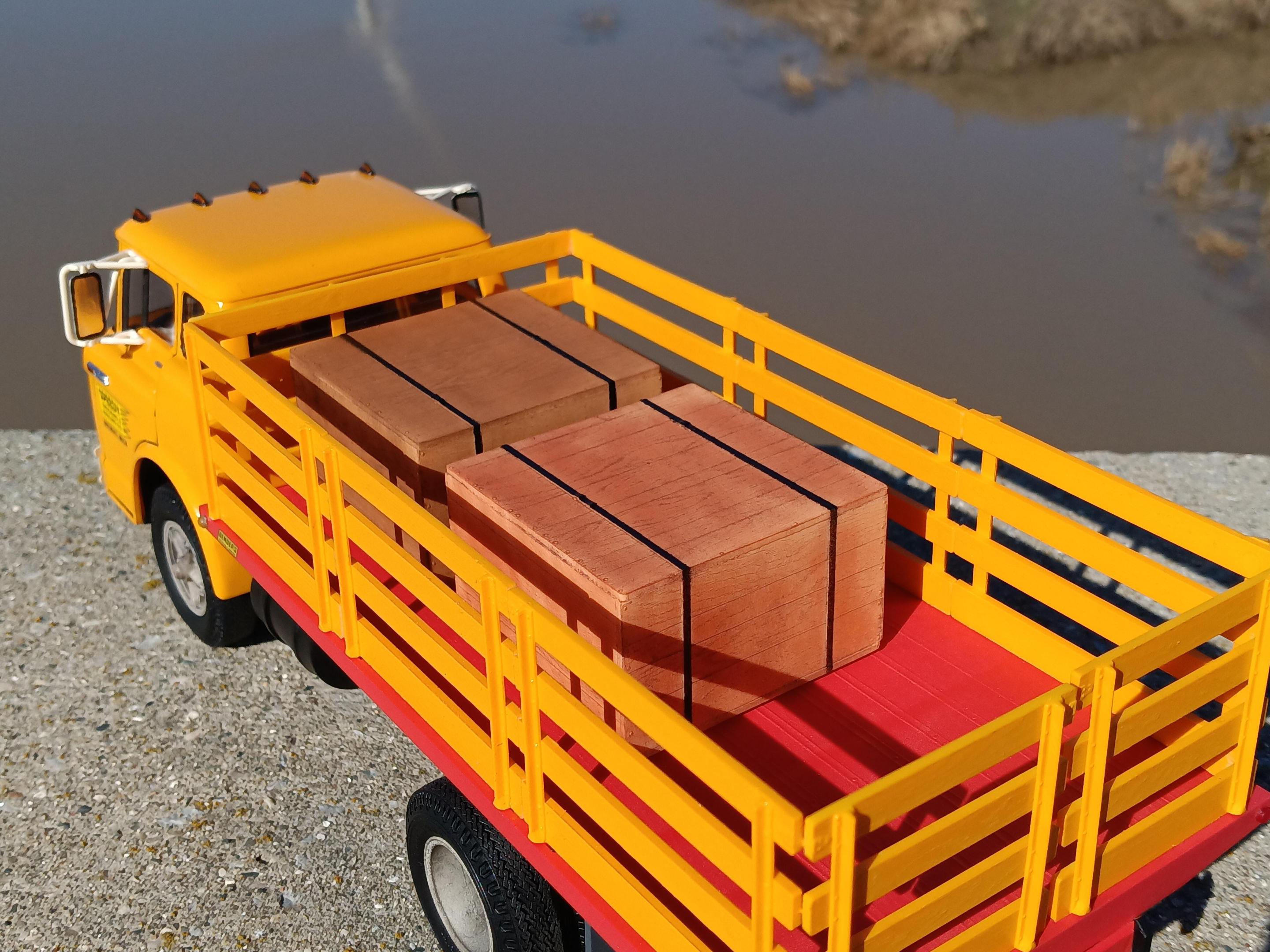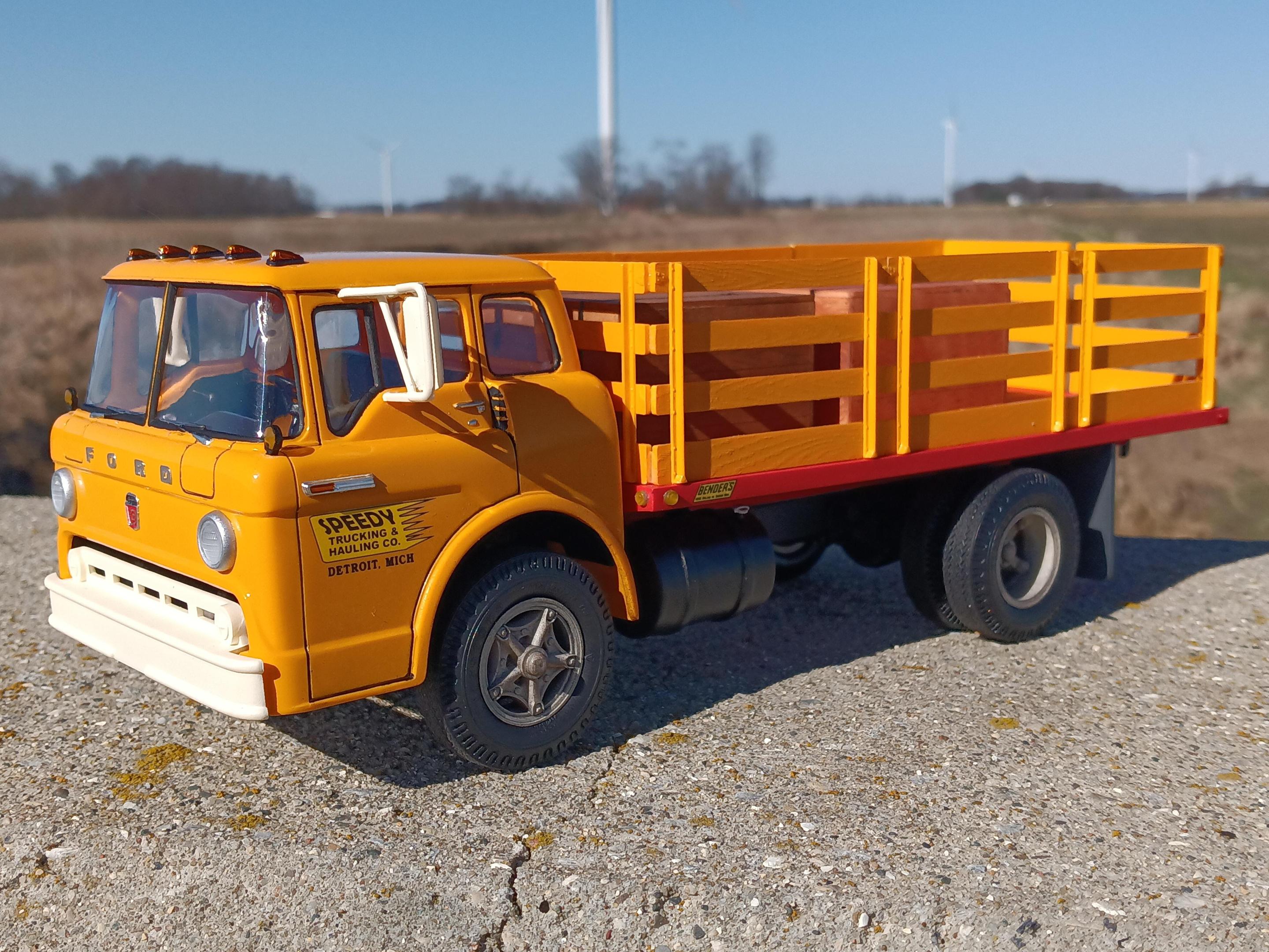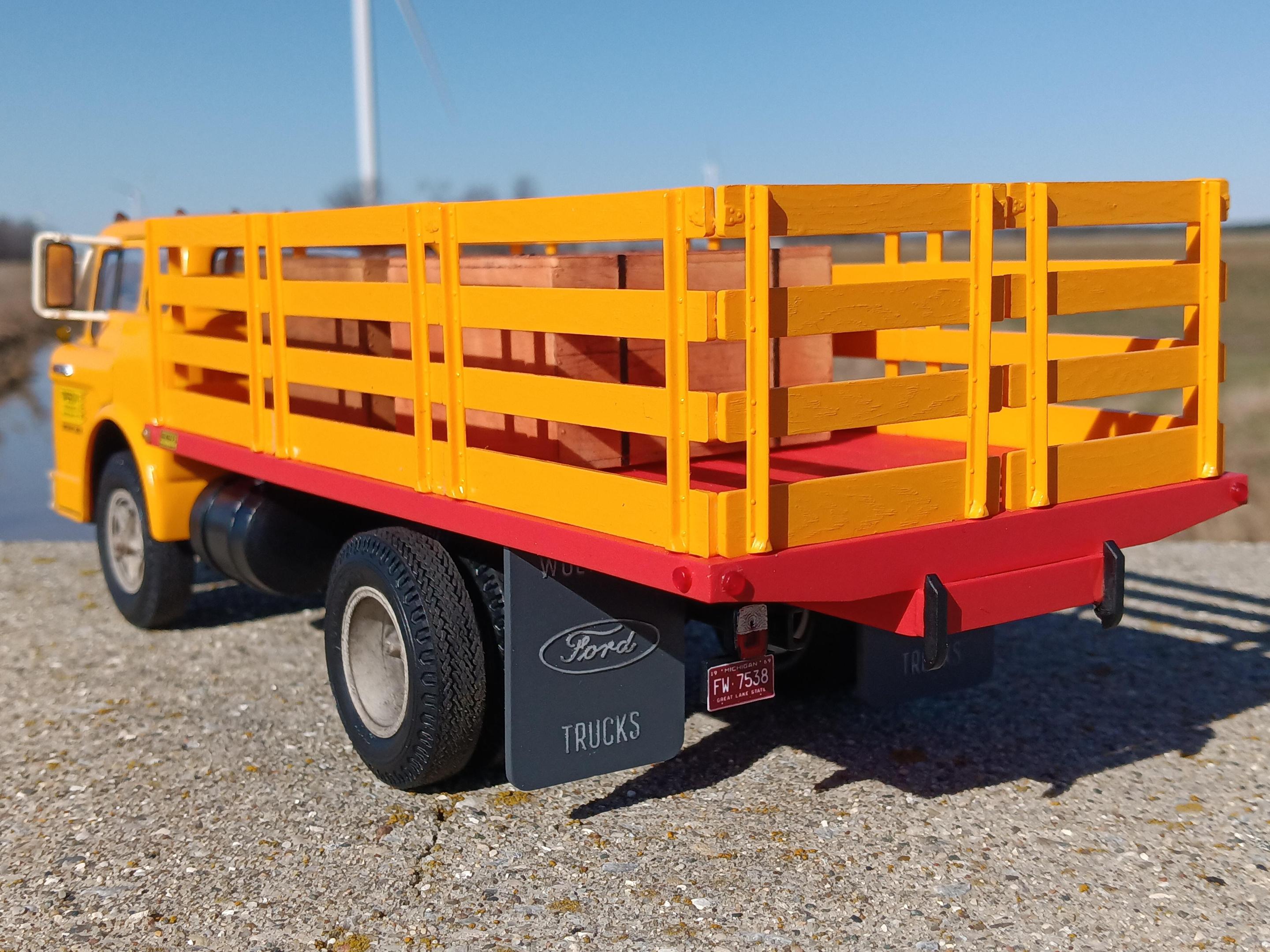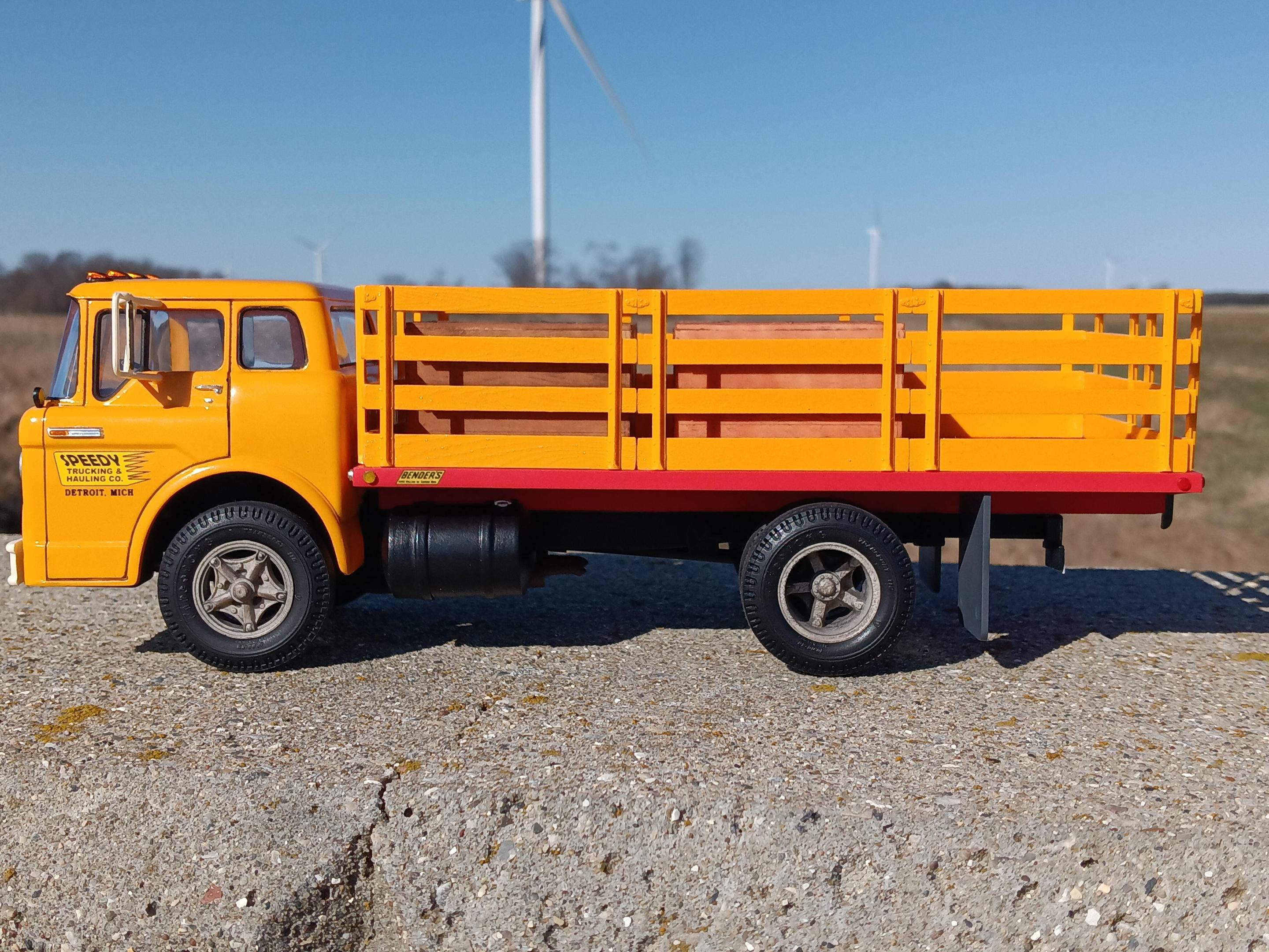 15. This is an original T596 kit that I bought a couple of years ago. I just love that old rigid plastic. ? The hardened vinyl tires I could do without but hey ... That's the tradeoff I guess. Inspired by the box art I used that and a Purple Wave auction listing for a 1969 C700 as my guide. The paint is Tamiya Camel Yellow overall, with the bed finished in Krylon Scarlet. The chrome was stripped (no thick nasty undercoat in 1971... Another plus for the old kits) and refinished in Krylon Colonial Ivory, which is a decent match for aged Ford Oxford White. The Speedy decals are from Gofer Racing, I changed the location from Chicago to Detroit with a section of old Fred Cady graphics. Wheels and underside were lightly weathered. The Bender's stickers are from the AMT Autocar dump truck. The box art showed the door emblem above the character line, 1968-1970 style, while the actual cab has it below, 1971-1990 style. I sanded off the original emblem and replaced it with the Moebius 1967-1972 F100 hood emblem. There's a "bonus" set of these in the 65 and 66 kits. Speaking of, I modified a 65 F100 bench seat to use here. The crates were painted Tamiya Flat Flesh and dusted with weathering powder.