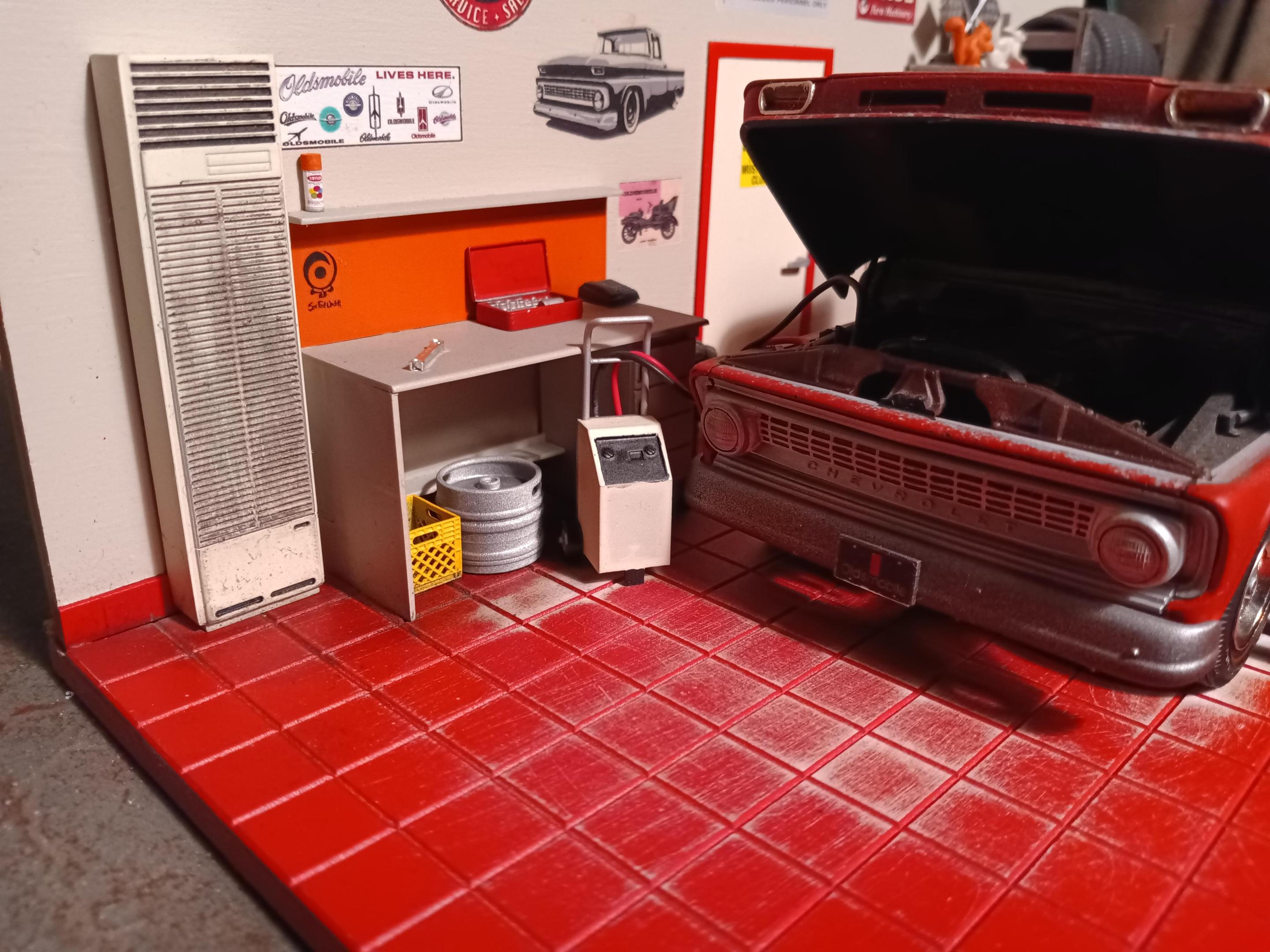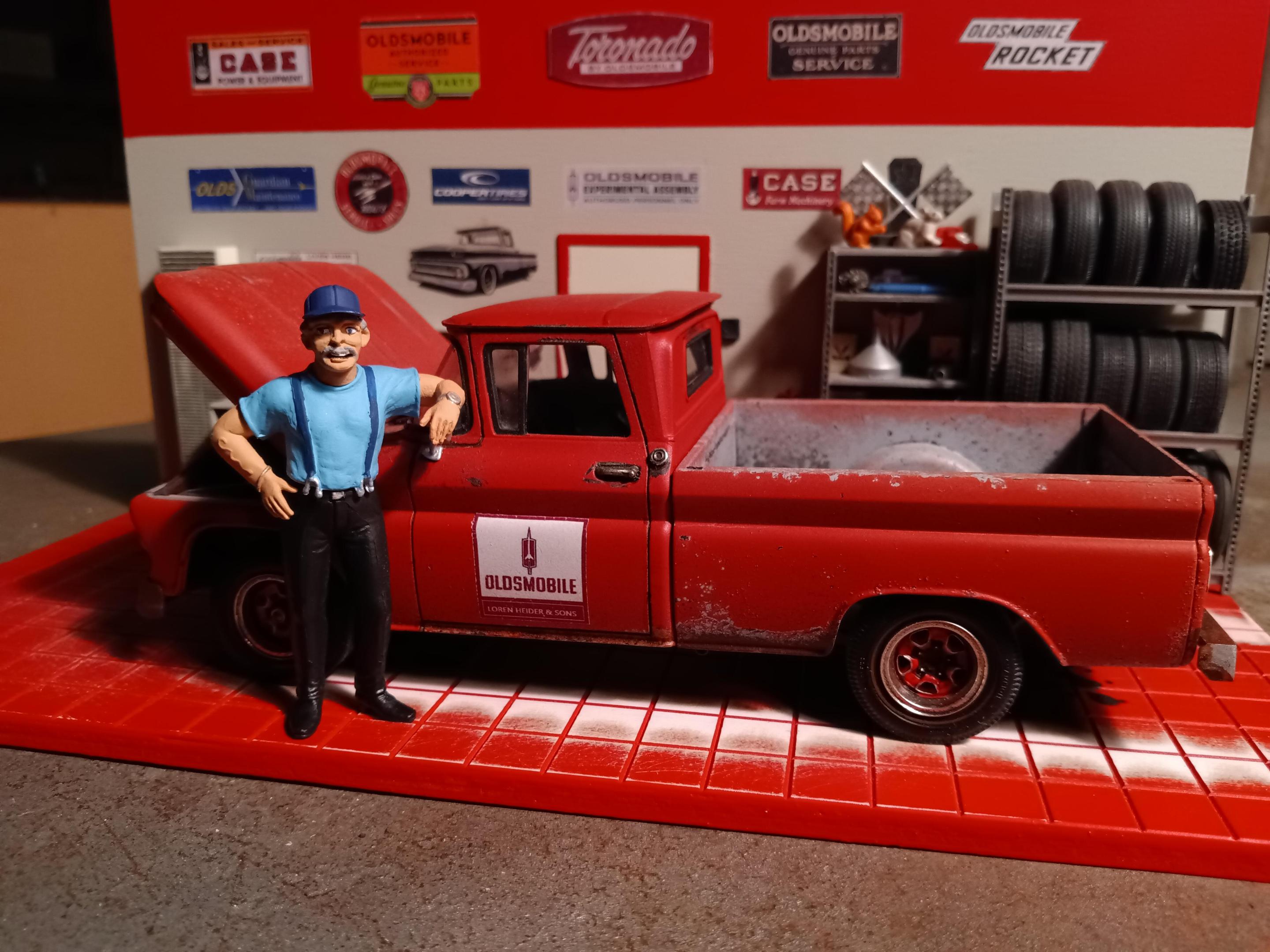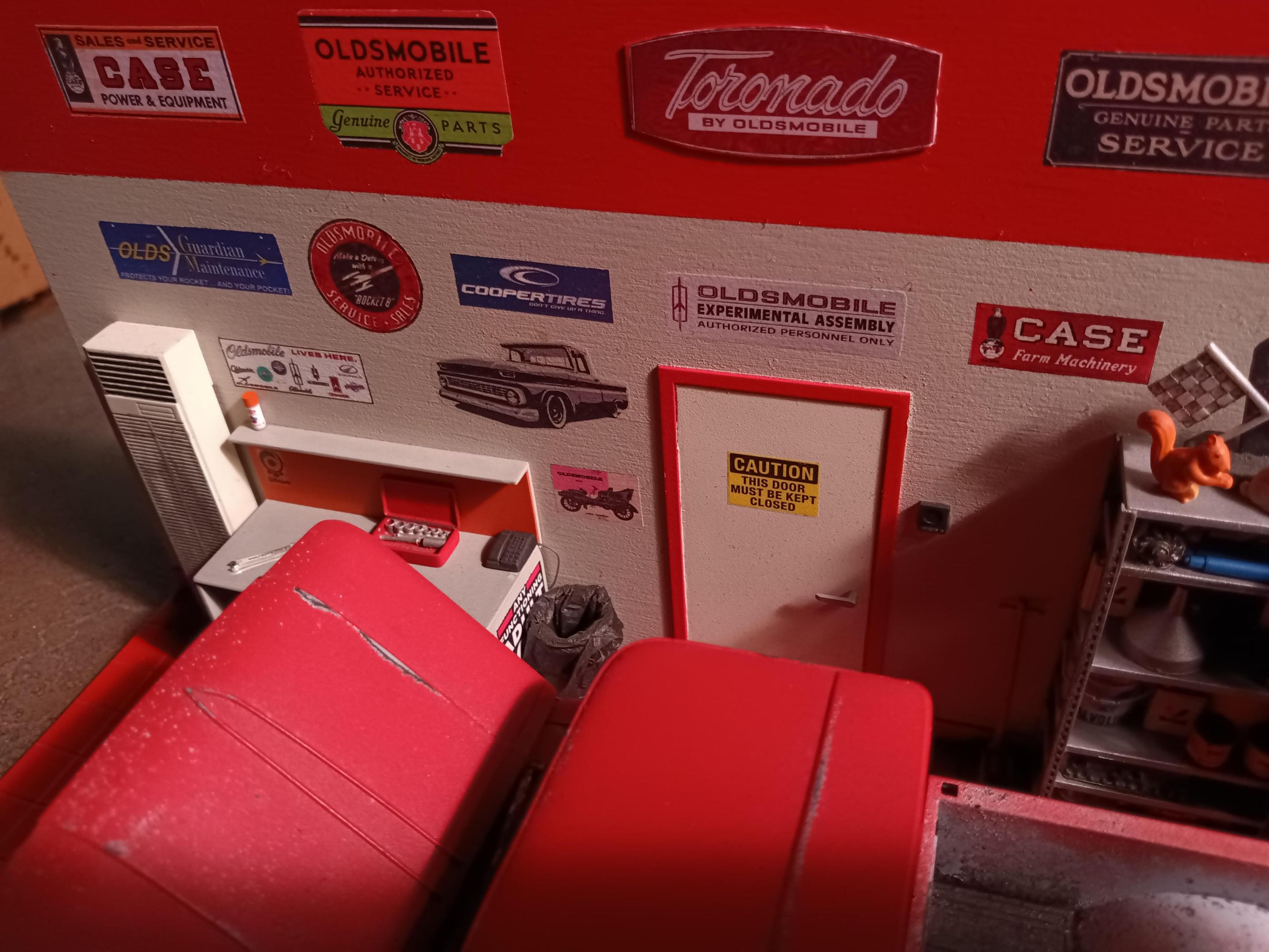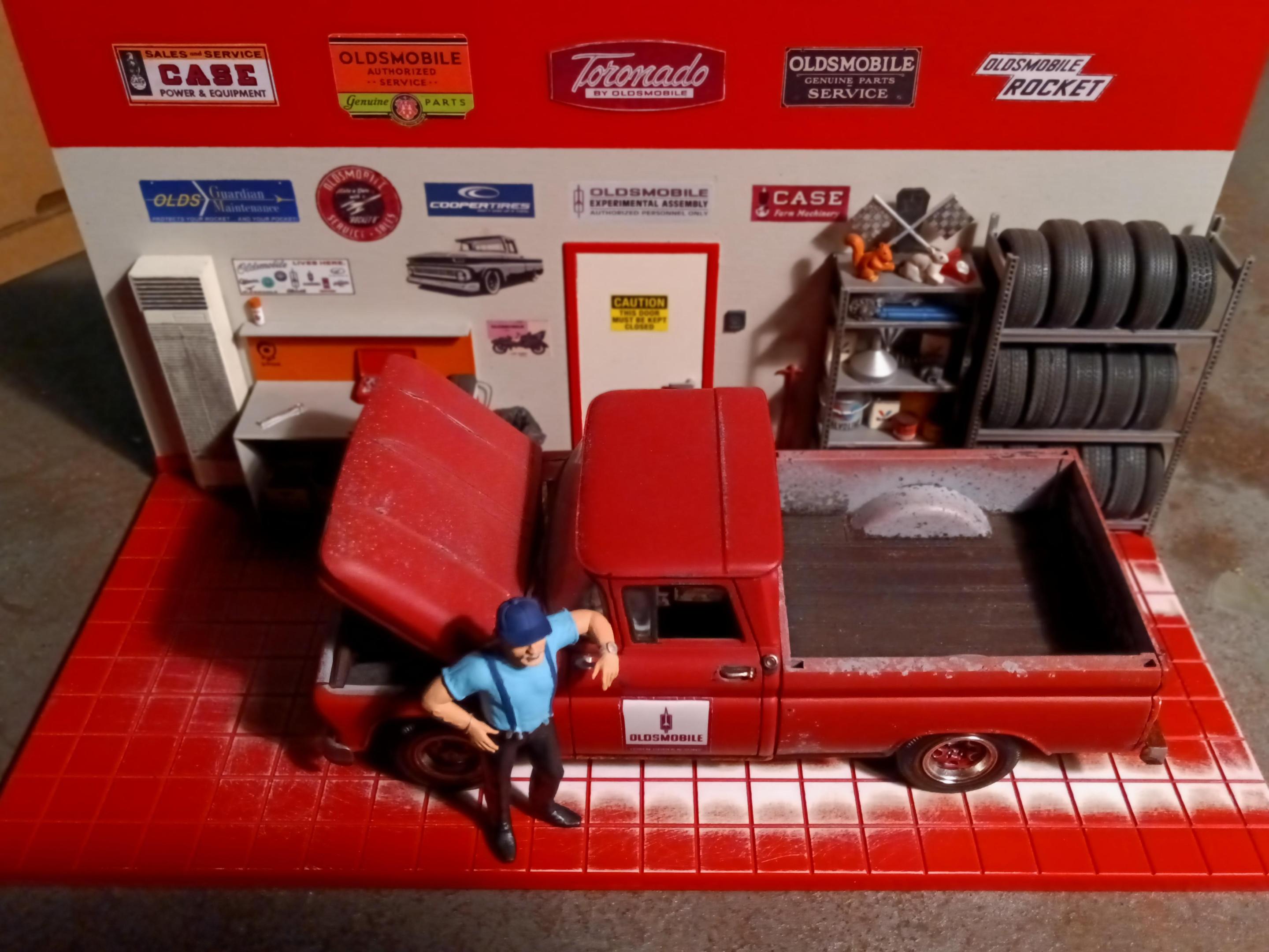 7. Oldsmobile may be gone, but Heider Auto Sales, which sold them from 1932 all the way up until the end in 2004, is still around, selling and servicing all used makes and models. Every car show season, service manager Dan Hopkins, takes it upon himself to get the old shop truck ready for summertime cruise duties. The truck is stored for winter in a room that was once used to prep new Oldsmobiles for delivery to their new owners. Now it is just where the 1963 Chevrolet "company truck" lives. Over the years Dan and Dan... The other Dan being Dan Heider, owner of Heider Automotive, have decorated the room with Olds and Case signage (as the Heider family got their start selling Case farm equipment almost a decade before they got into the Oldsmobile game). The display itself is just two pieces of Midwest plywood, fastened together at a 90 degree angle. The floor is Evergreen tile, and the various filler items are from the spare parts pile. There are also a sprinkling of Iceman Collections items... A spray can, a milk crate, and a beer keg.