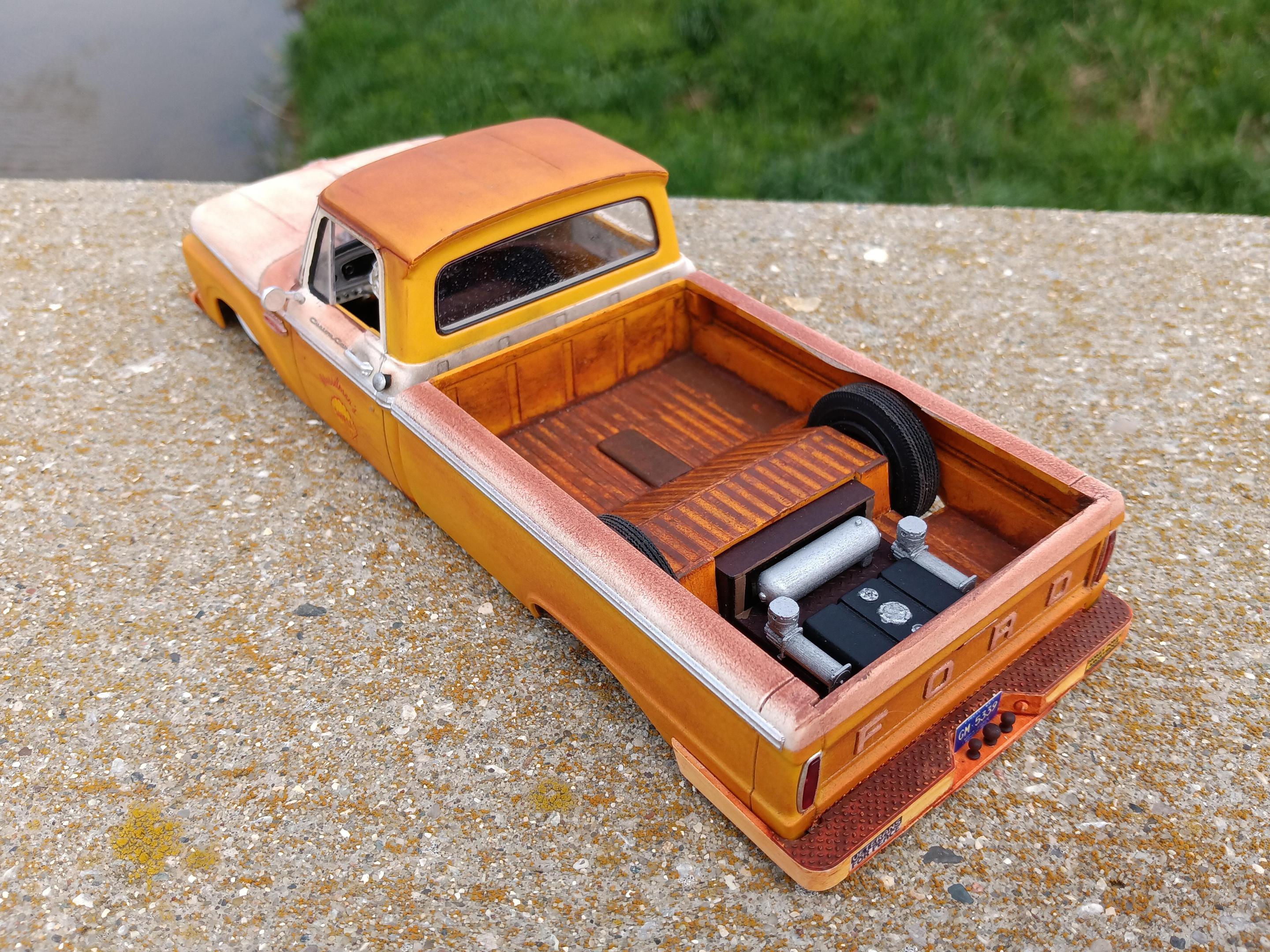 23. Nice! This is the Lindberg kit, which is currently available again as an AMT. It's the only full detail glue kit of a tenth generation F150 with a four wheel drive chassis, and if I remember correctly, a manual transmission. The Revell kits are all rear wheel drive and the regular cab Flareside Revell just reissued is an SVT Lightning.
