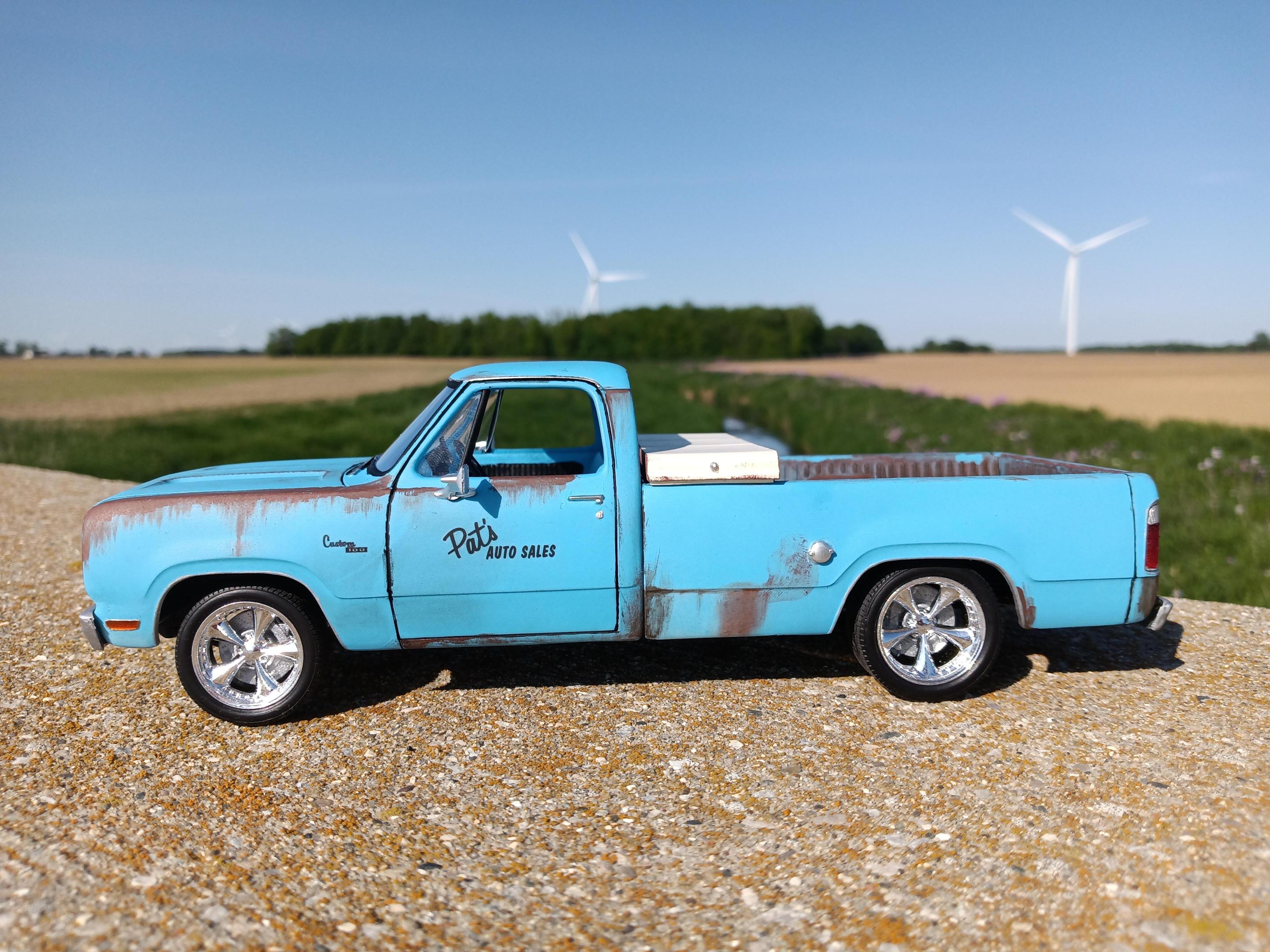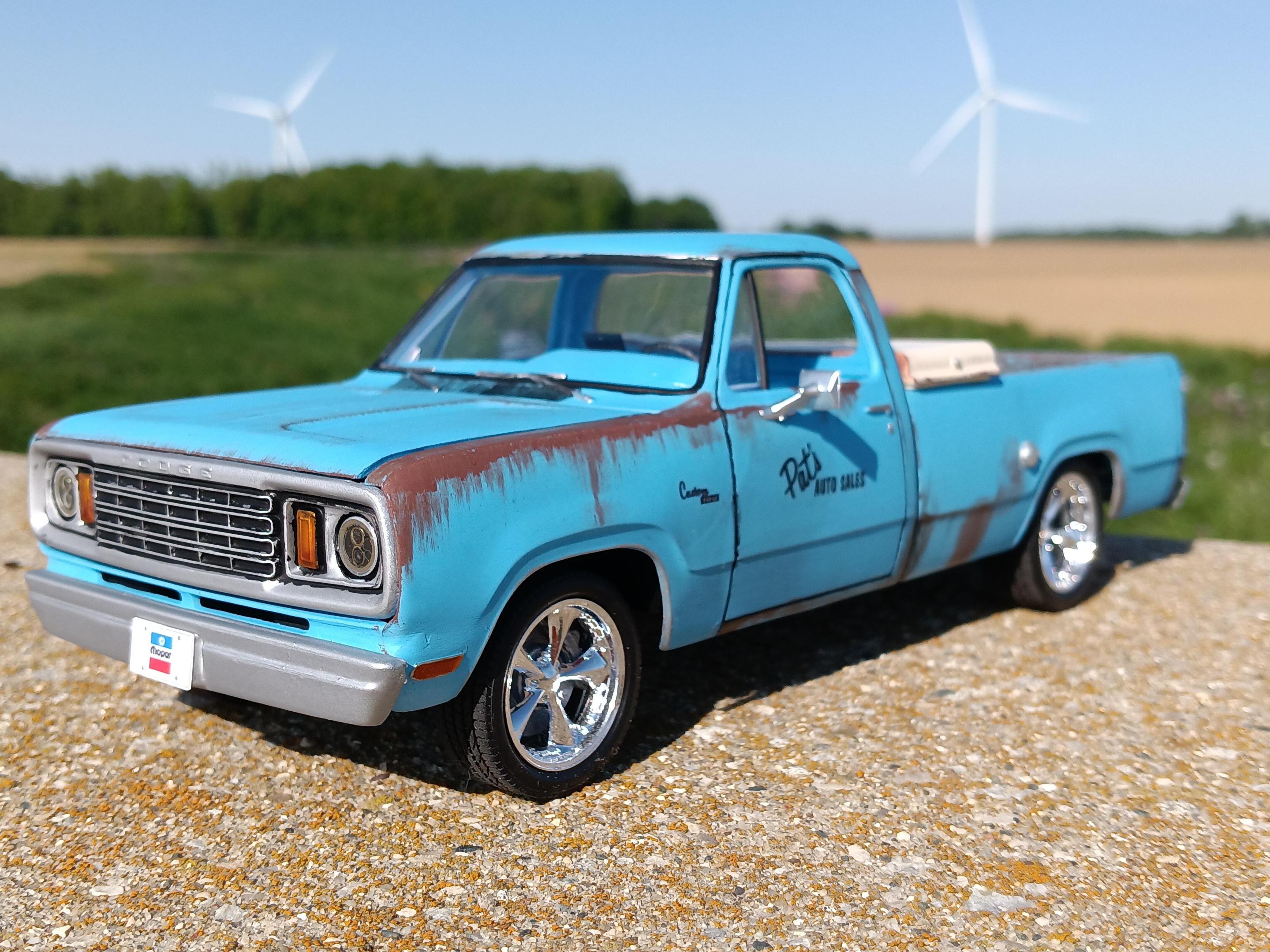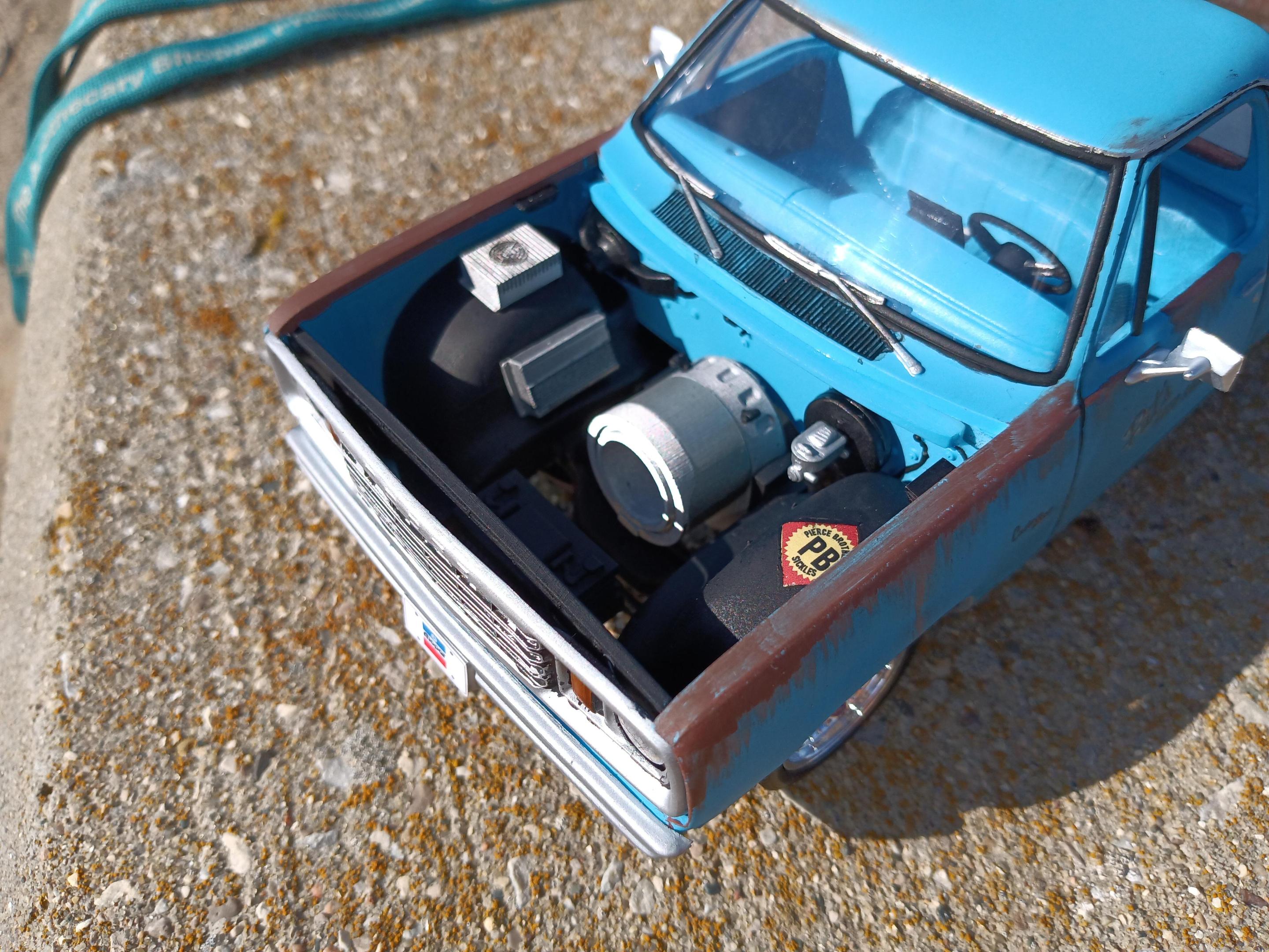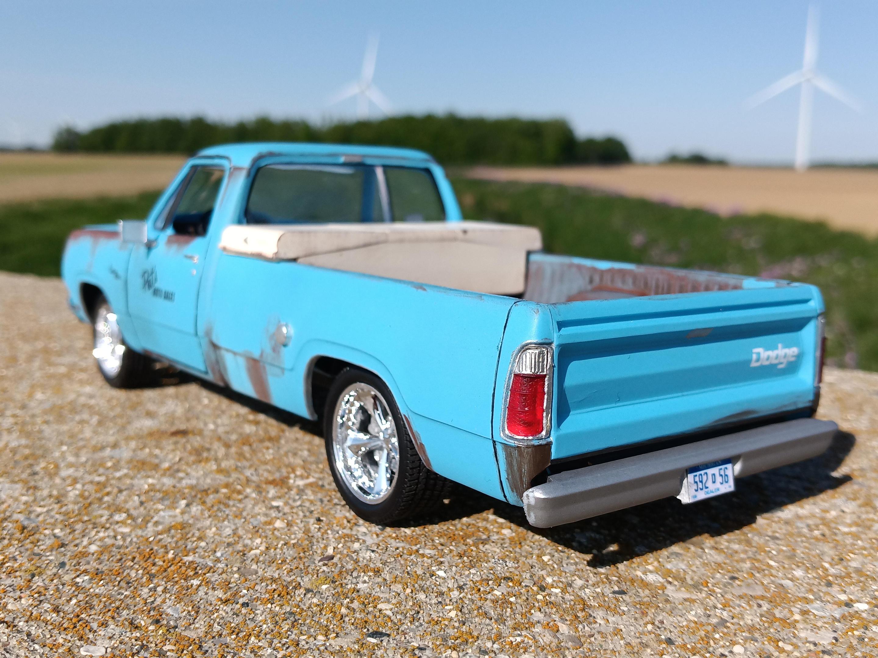 8. The Pierce Brothers have spent the last twenty odd years making a name for themselves doing Cummins 6BT retrofits. But Arvid "Pat" Patrick came to them with a different project. He wanted to try an EV conversion. He had an EVs West Tesla S crate motor, some Foose wheels, a 1978 Dodge truck with a blown 360... And a saddle toolbox from another light blue Dodge he owned years ago. Eager to try something outside their normal projects, the brothers put the pieces together, adding big disc brakes, LED headlights, and a touch screen, along with an updated sound system. Aside from the door markings, the truck's worn original finish was retained. Model is the MPC kit with a Tesla power unit from Iceman Collections , Olson Brothers tool box, Revell USA Foose 56 Ford wheels and tires, and door decals from an MPC Vega stocker. The paint is Colorshot Splash, distressed with the Vallejo Rust and Steel Weathering Set, and sealed with Revell flat clear. The LED headlights were made with plastic discs and photoetched rings.