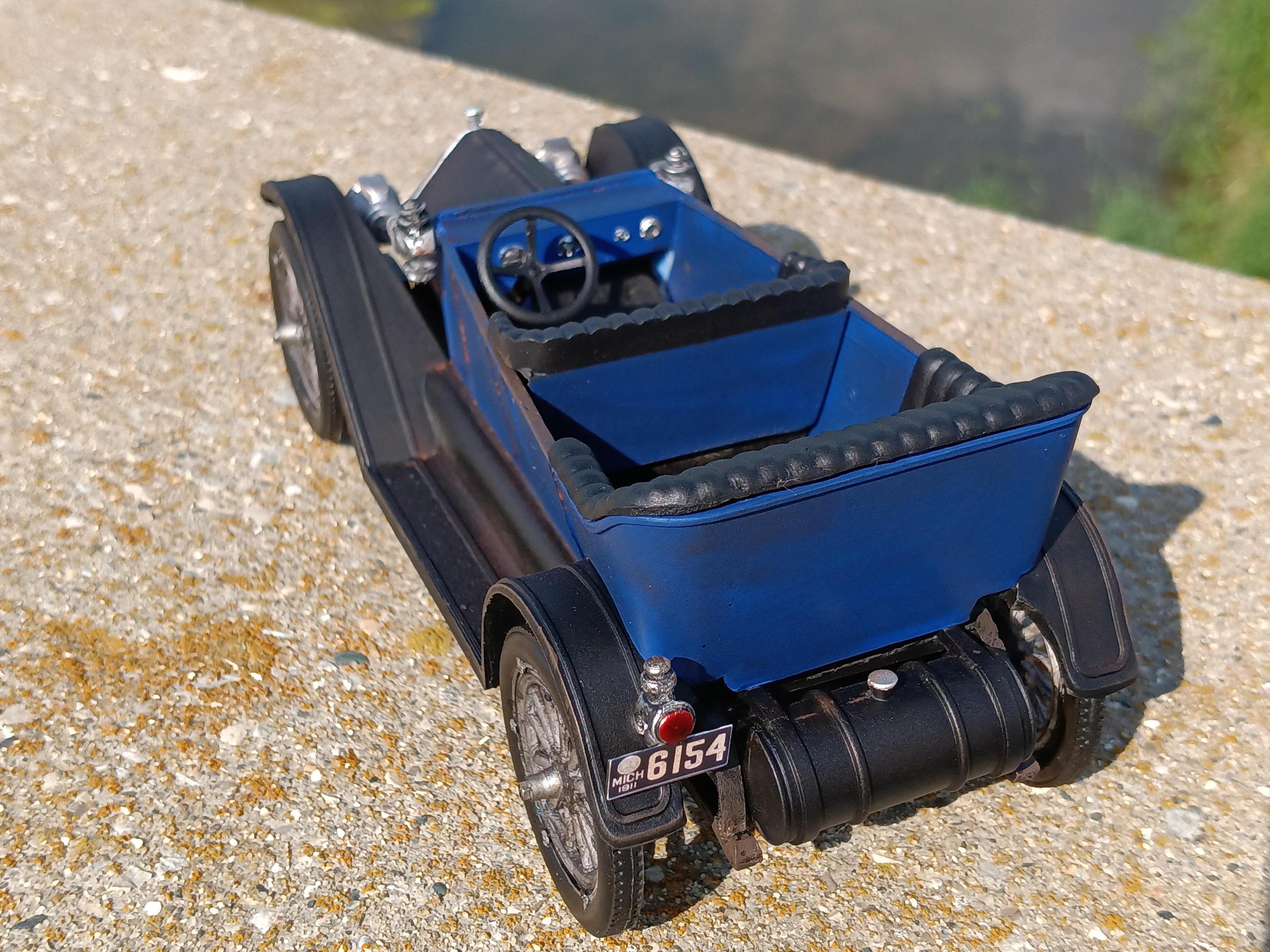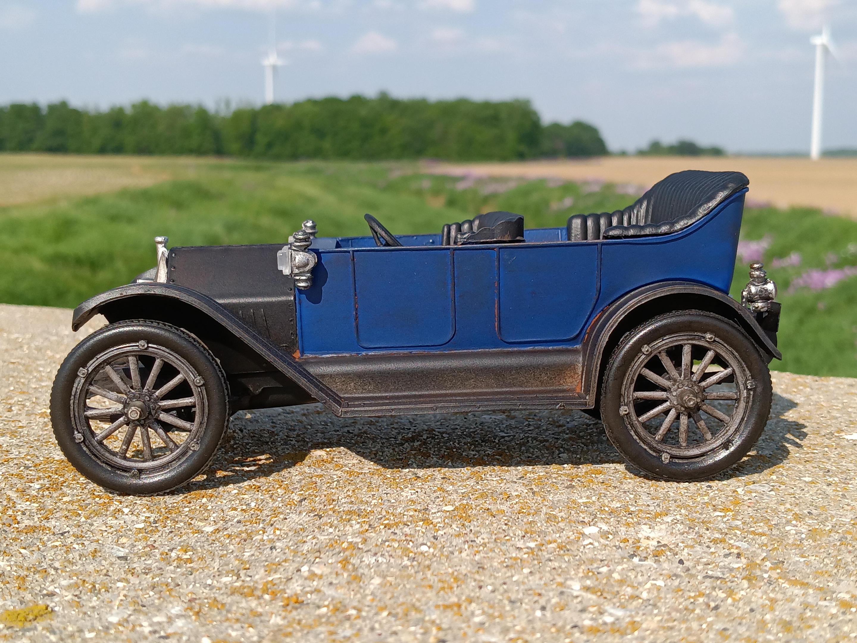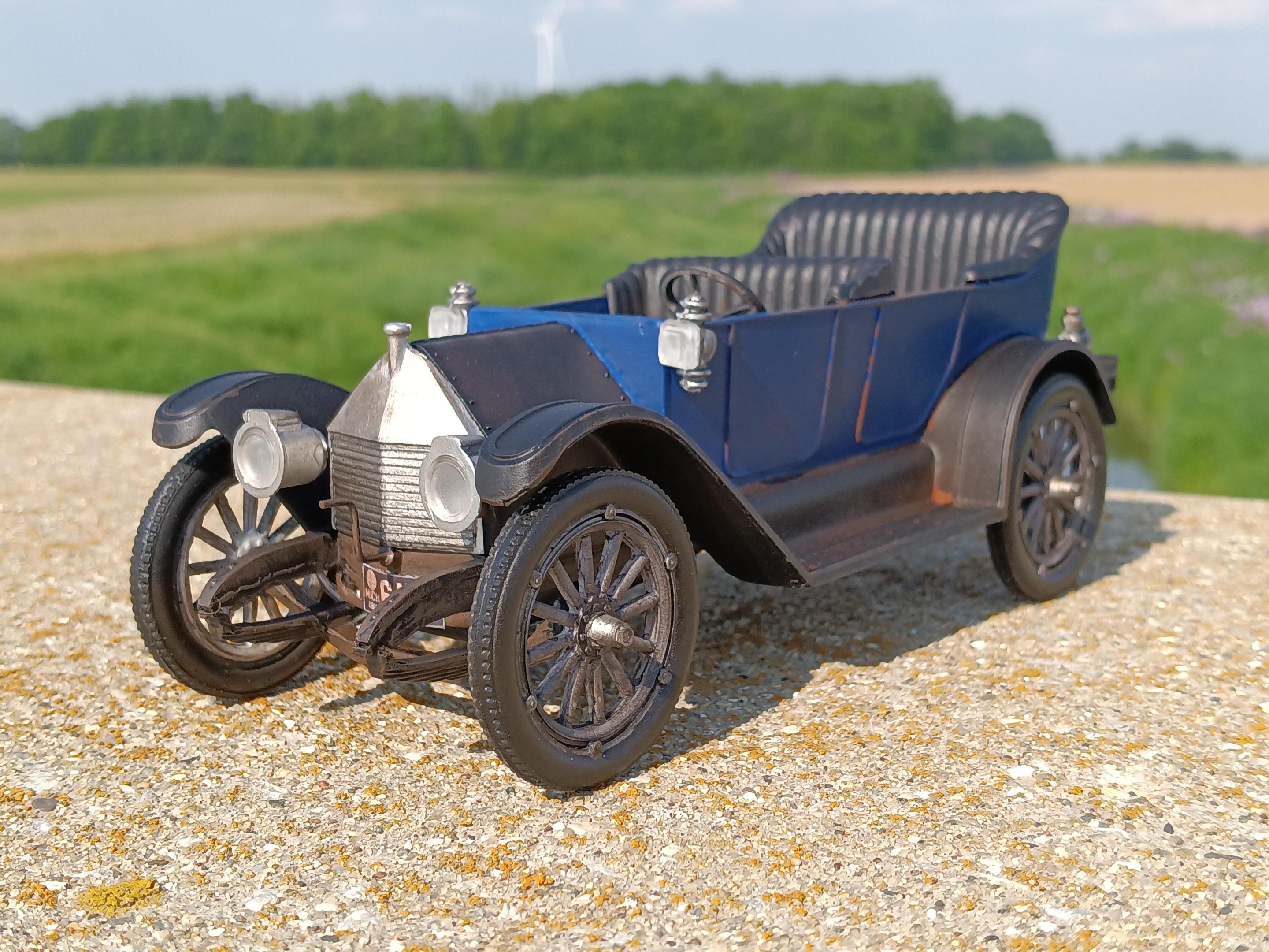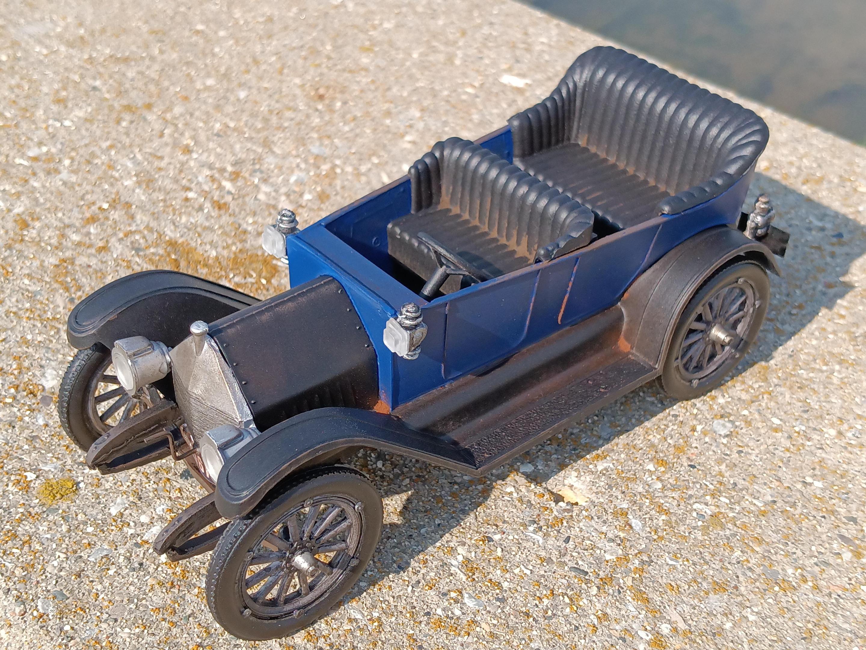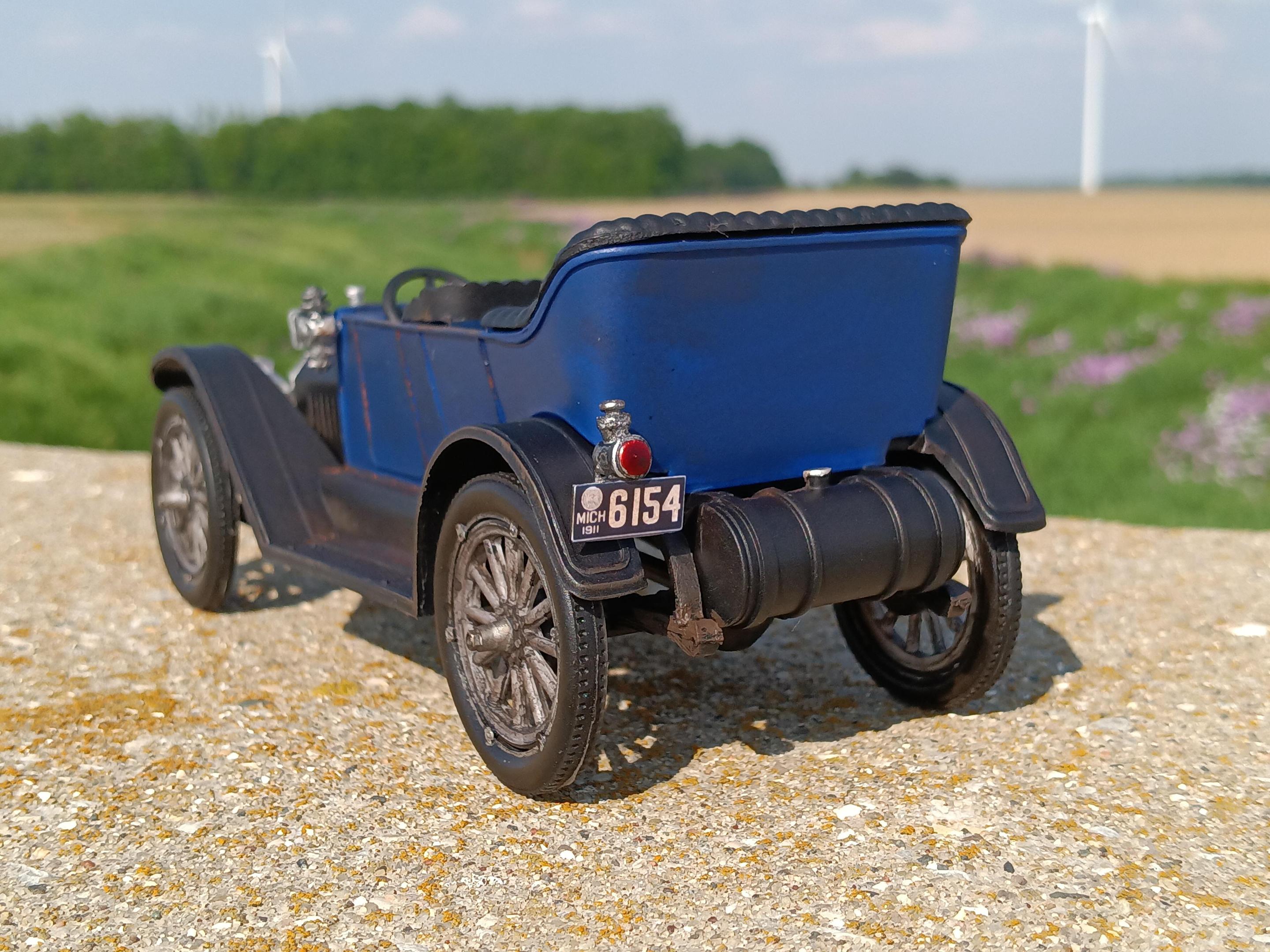 4. The history books will tell you that the two oldest Chevrolets exist in museums. Both are 1913 models. Serial number #323 is restored to it's original glory and resides in the Sloane Museum in Chevrolet's ancestral home of Flint. #93 is in much shabbier condition and calls the Reynolds Alberta Museum in Canada home. But, at one point, there were three known to exist, and this third example has a unique story. And a little mystery... as far as anyone knows, there's a chance it might still be out there. It was 1958, and Harlan Henderson had a plan. Chevrolet was going to be celebrating it's 50th anniversary in 1961. He hit upon the idea of displaying an example of each decade of Chevrolet production in front of his show room for the summer, and he had already lined up some of them. A local farmer had agreed to loan a 1921 stake truck, a friend of Harlan's offered his 1931 coupe, a customer would provide a 1941 sedan delivery, one of his mechanics was the proud owner of a 1951 Bel Air. He also had a backup of a 1941 pickup, which ended up being a part of the display alongside the sedan delivery anyway. And he had planned for the entire 1961 lineup to represent 1961, of course, with a Corvette and an Impala taking pride of place. One problem. Harlan really wanted a Series C Classic Six to represent 1911. Thing is, only one was ever built, a prototype that differed a considerable amount from the production version. After two years of beating bushes, Harlan was able to track down a 1913 model, serial number #352, which had been parked in an unused grainery since 1933. Having secured the car, which was understandably in somewhat rough shape, Henderson Chevrolet's mechanics treated the car to a cosmetic restoration. The car was also modified to resemble the 1911 prototype, although the guys did miss a few things. The nickel plated radiator shell differs from the brass version used on the prototype. They were able to locate nickel plated cowl lights to at least match the appearance of the prototype lights. The car's body was also painted blue, while the actual prototype was most likely black. So it wasn't totally accurate but... Harlan at least had his Classic Six to stand in as a 1911 model. And at least the plates were authentic 1911 vintage. After the summer spent basking in the glory of Chevrolet's first half century, the car spent a few years living in the Henderson Chevrolet show room. The guys were never able to get the car running particularly well, but the spongy old cast iron block still dripped oil, despite the crankcase being empty. This was the main reason it ended up in an unused service bay, as Harlan (and others) began to wonder if having an always-wet drip pan under the car in the showroom was a fire hazard, or at least a particularly healthy thing to have in a common area. After the dealership was sold in 1964, so was the 1911-in-air-quotes car. It bounced to a couple local collectors, before ending up in a warehouse in Chicago. It was beloved to have been destroyed when that warehouse caught fire in 1984, but rumors persist to this day that the car is squirreled away somewhere, waiting to be found. It might still be in Chicago, at least one guy swears it's in northern Minnesota, and a few people (incorrectly) think it's the Sloane car. Maybe it'll resurface one of these days. Okay. So that story you just read is total BS. Mostly because I can't say much about the actual model. It is the Missing Link 1911 Chevrolet. I got it just after Kevin stopped casting them, around 2014 or so. It sat around all this time until last weekend. Actual assembly took mere hours. It's a simple kit and Kevin's castings are always wonderful. It's built straight from the box aside from a crank bent from brass wire (because I lost the kit crank) and 1911 Michigan plates from Three Inches Under. The backstory about a 1913 dummied up to resemble the 1911 prototype came about because it was fun ( for me at least), and let me avoid the whole making a windshield, cowl, and top and changing the lights to make it a proper 1913. This kit is oddball enough I didn't feel like going the extra half mile. ?