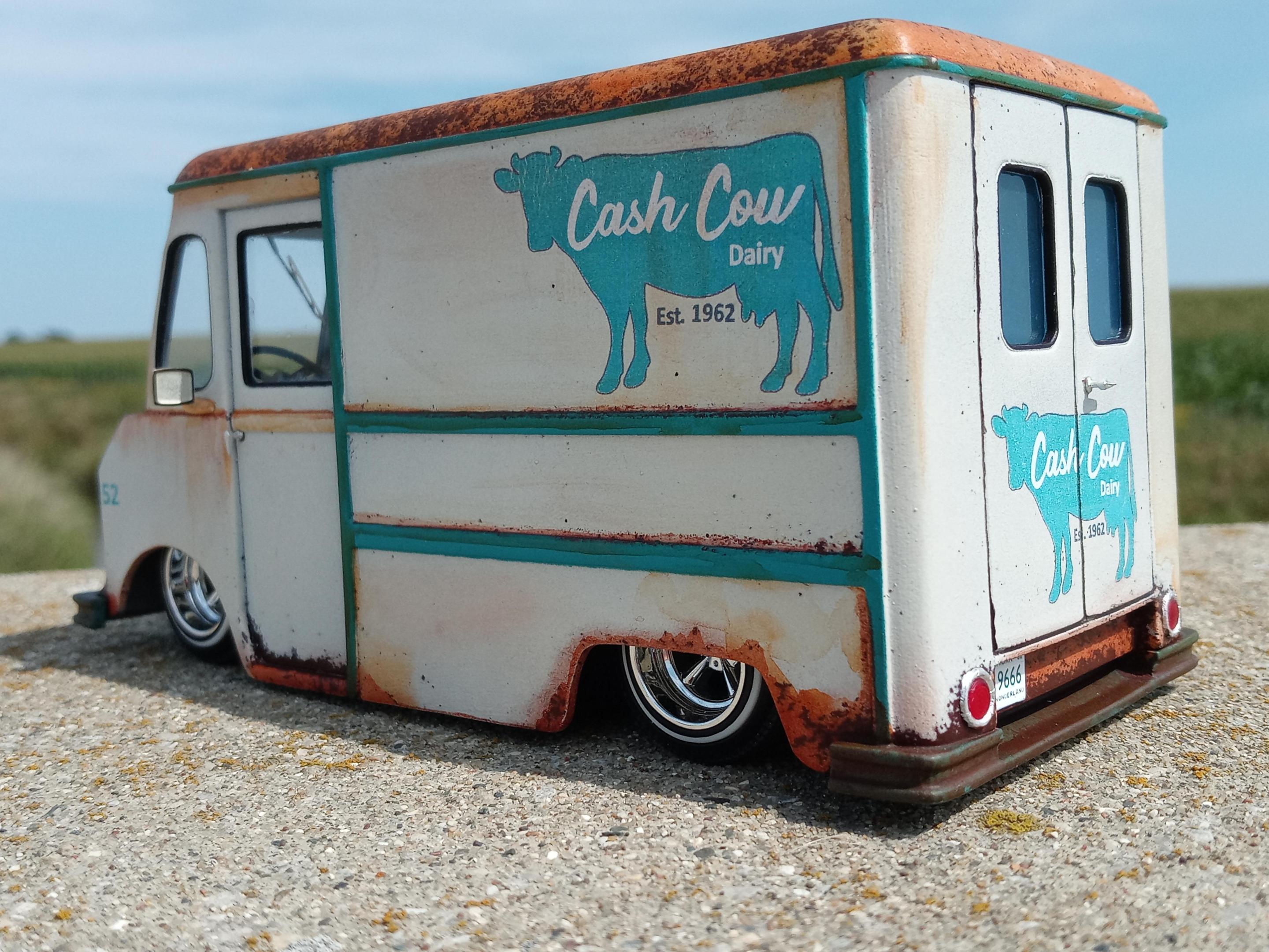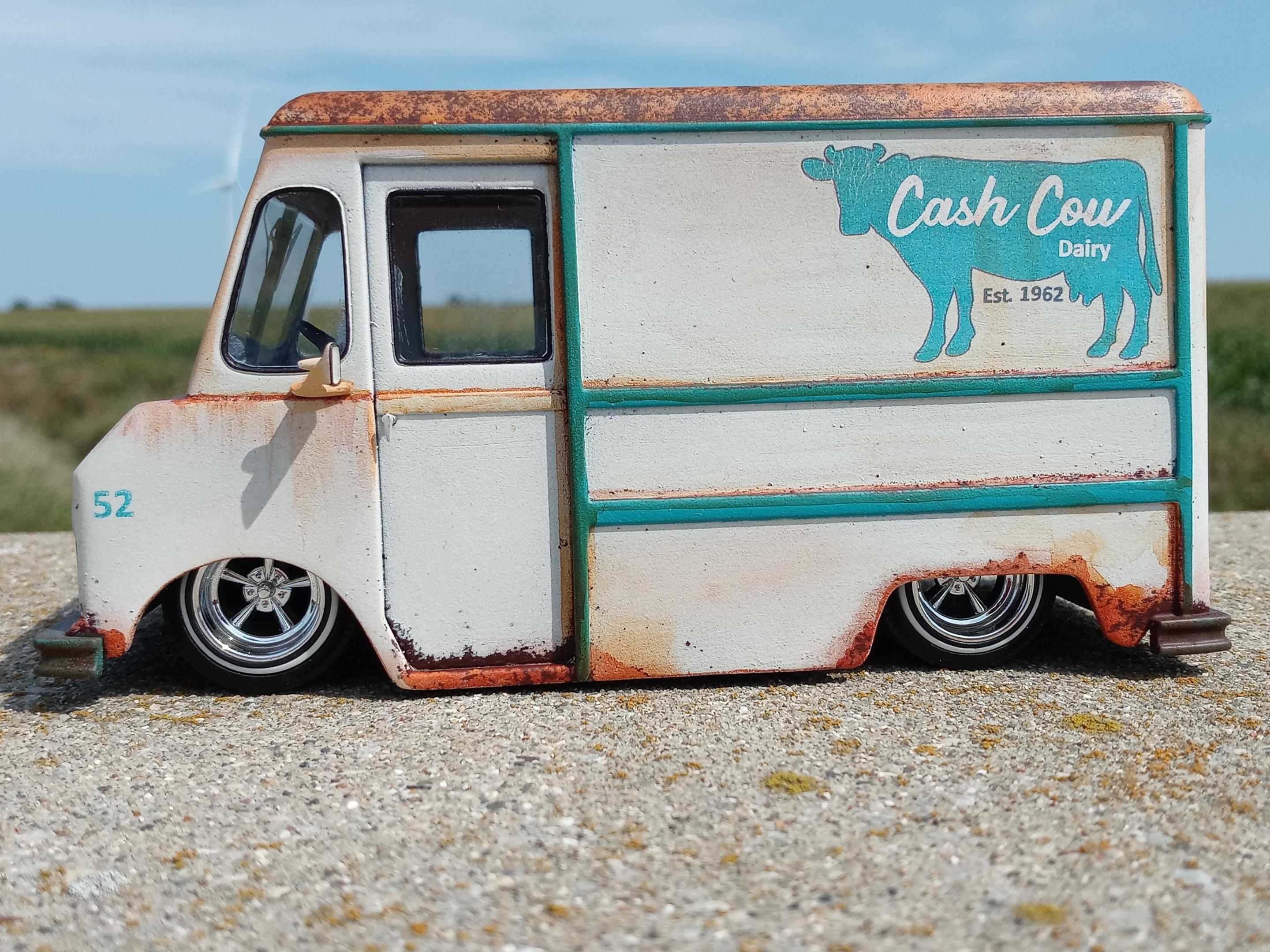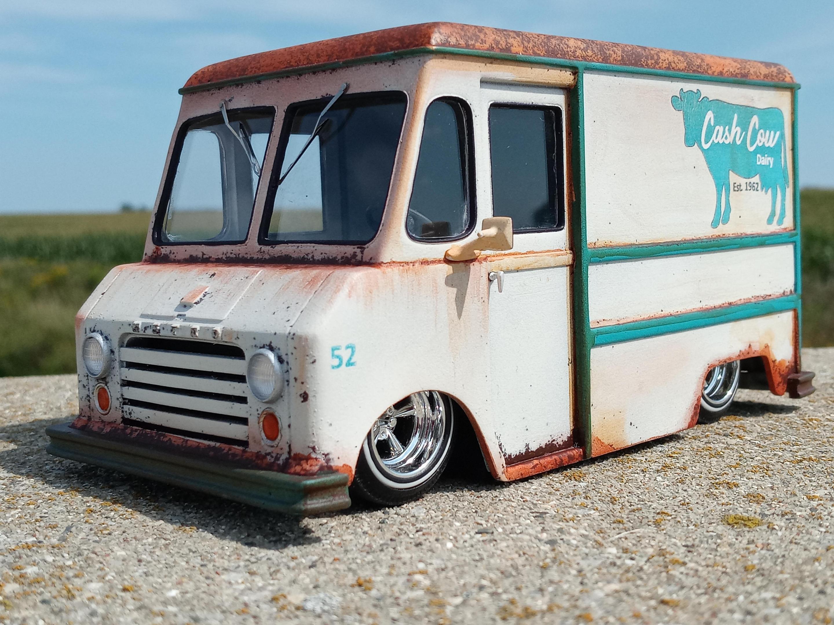 This is the @IceMan Collections printed resin kit. It was a limited run and I managed to nab one of the last of the milk truck version. After debating on a paint scheme I thought "why not just use the supplied graphics?" It's tubbed at both ends to represent an "aired out" suspension with Pegasus wheels and tires. Paint is good old Krylon chalky rattle can paint, distressed with salt, Vallejo rust washes, AK Interactive weathering pencils, and Monroe powders. Inside is a GM tilt column, a ridiculous stereo system, the air suspension components... And a crate containing a quartet of milk bottles.