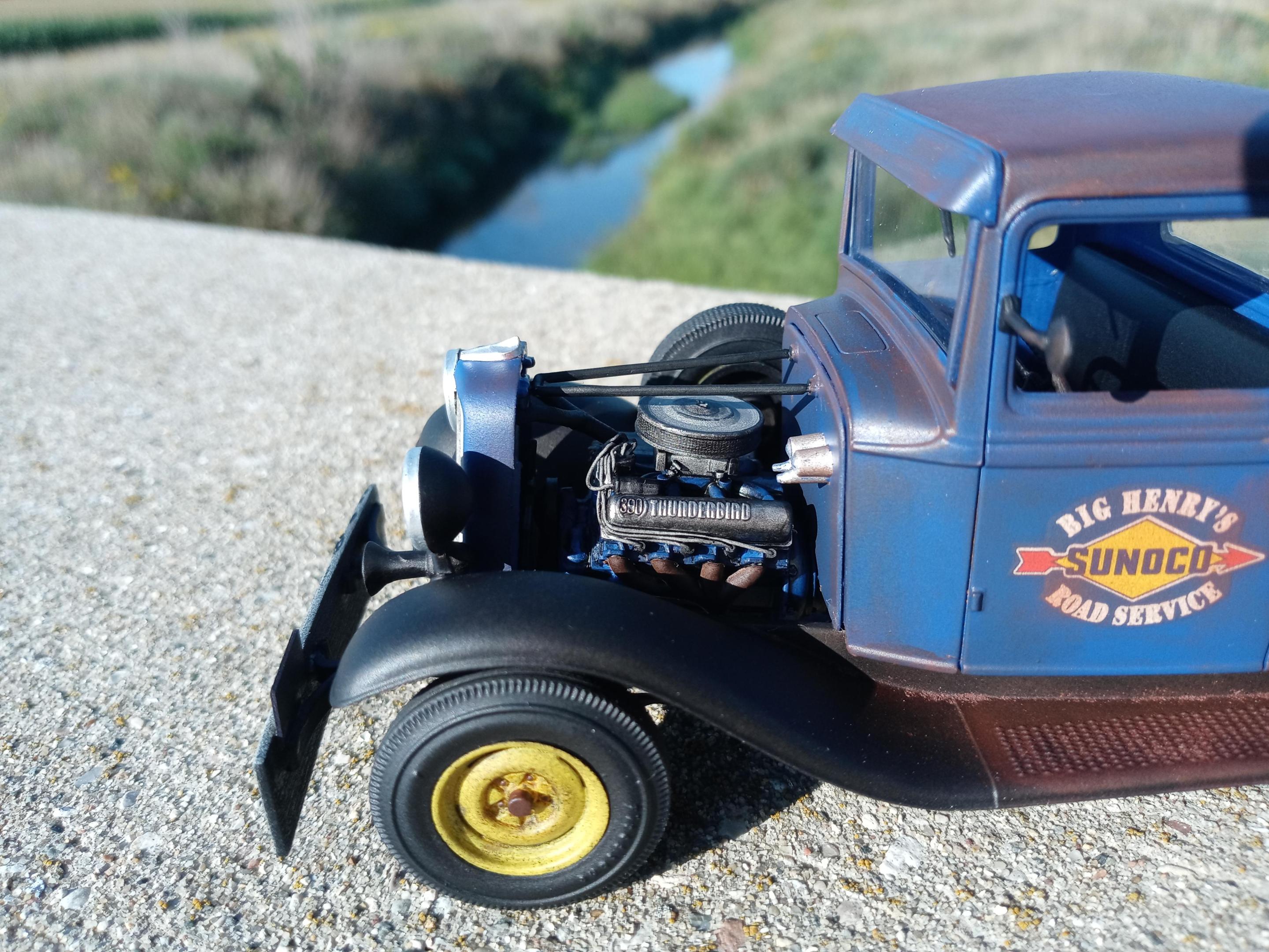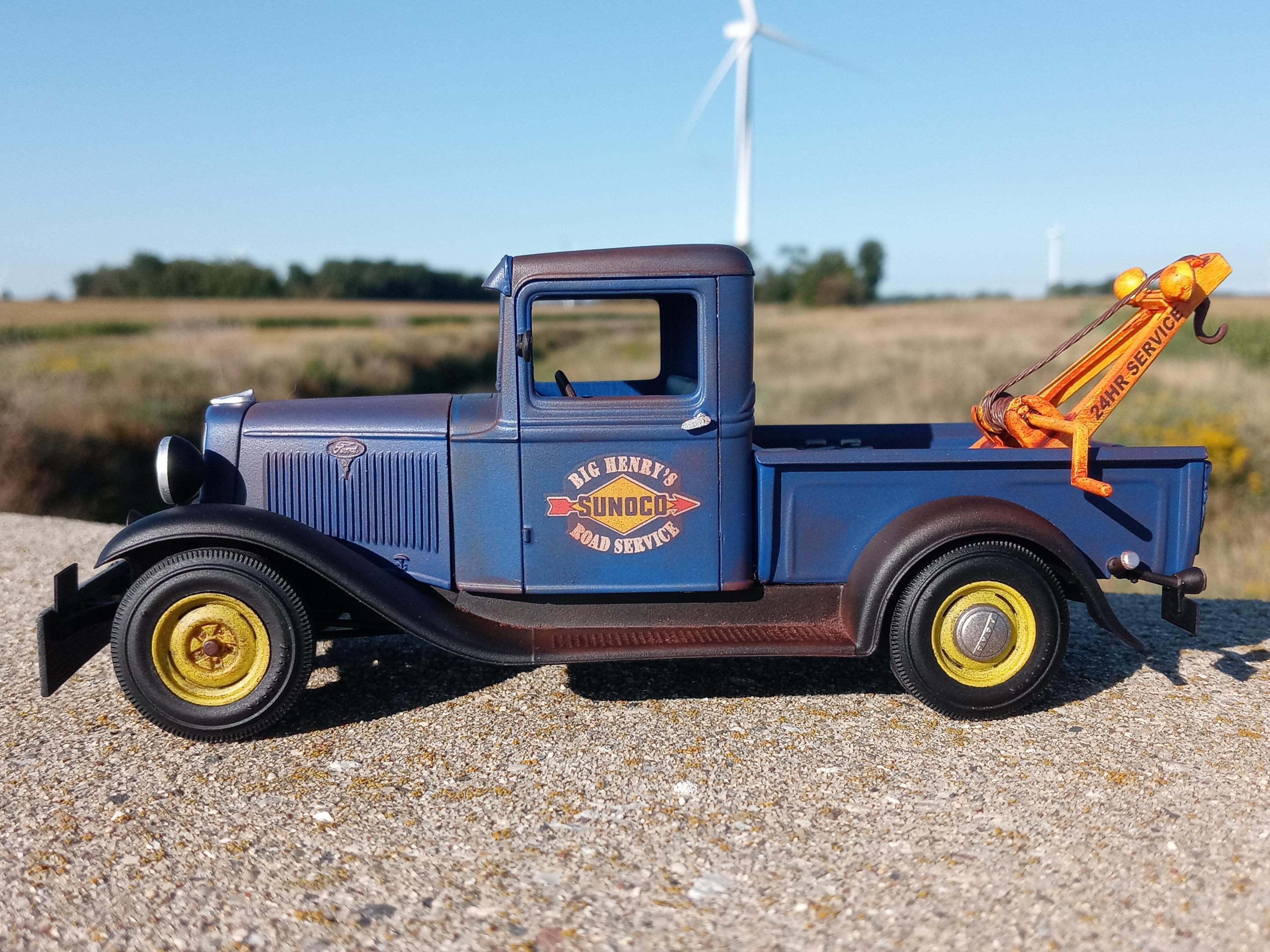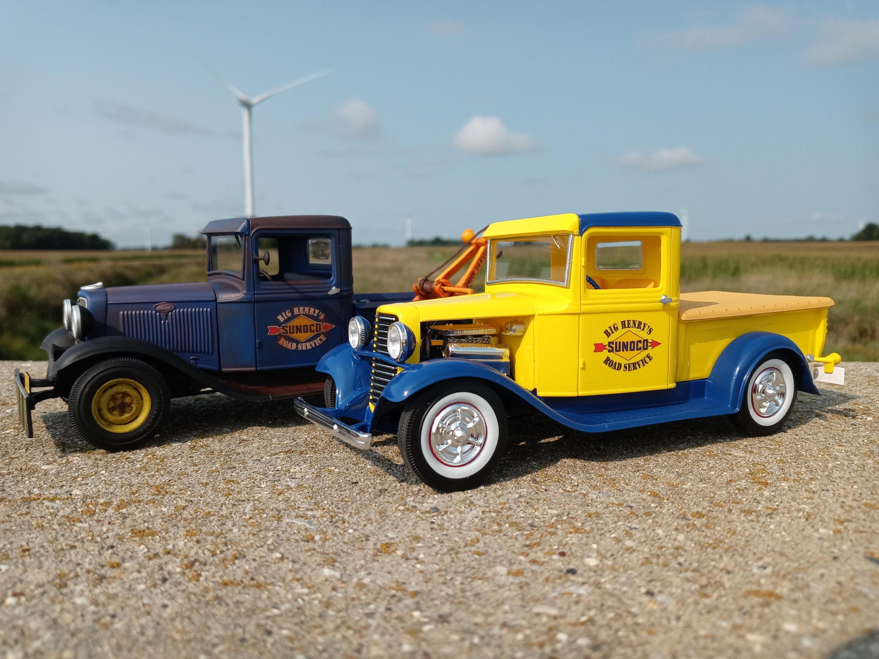 The wrecker is the new Sunoco reissue. I kept it mostly box stock aside from some 53 F100 wheels and some extra junk in the bed. I used the kit supplied 390 but I wanted something a bit more utilitarian than the three two setup, so that was replaced with a 4 barrel intake and heads from a Moebius F100. The street rod is a 2000s Lindberg reissue but was inspired by the AMT Sunoco box side panel. Again it has F100 wheels and covers this time. The pleated tonneau cover came from a 1992 Lindberg reissue. Decals, of course, are left over from the Wrecker. About those decals. They adhere right now and don't like to budge once off the backer. Wetting them and the doors with soapy water was a must to position the things. Not really a problem... If you're expecting it. ?