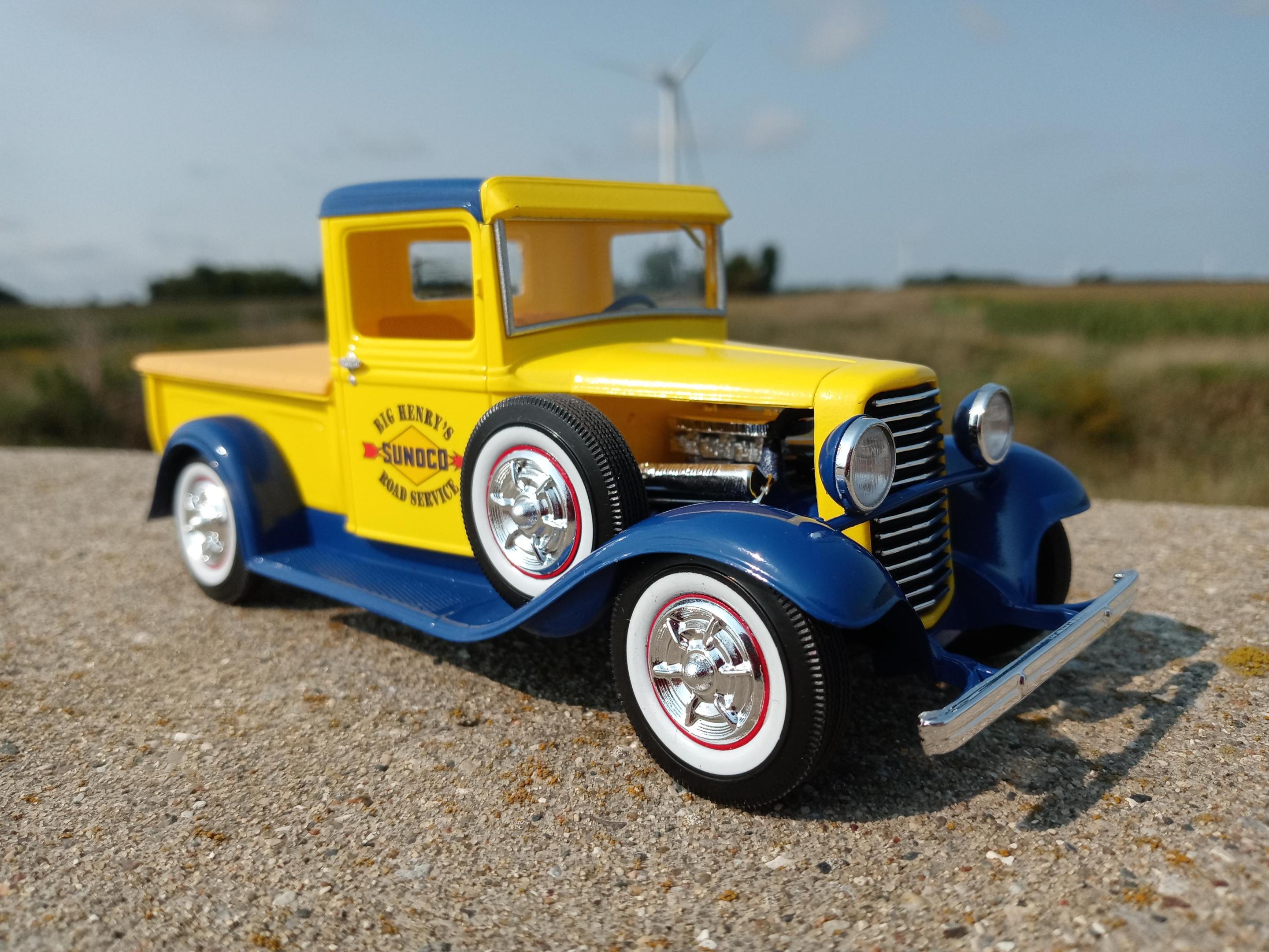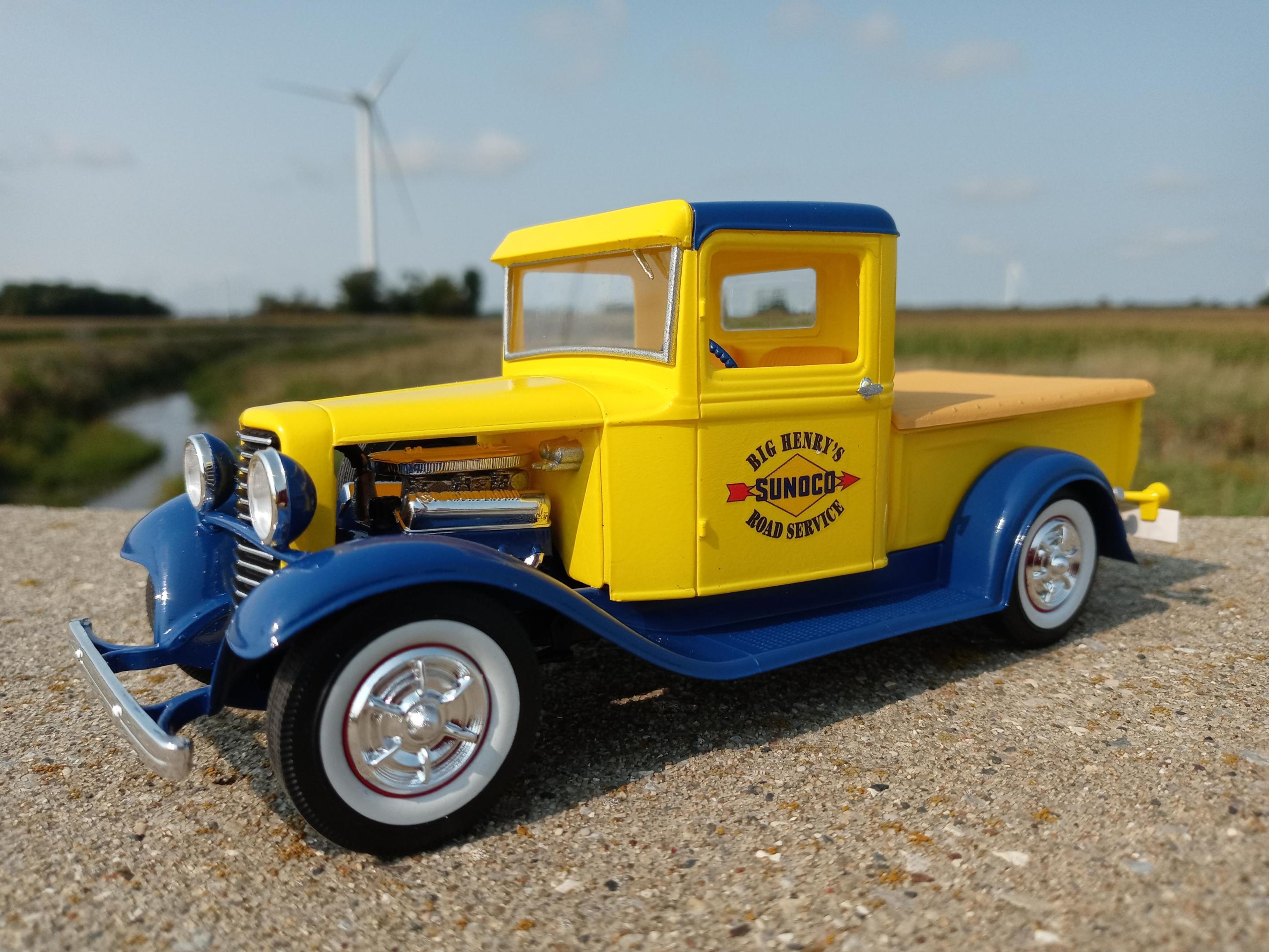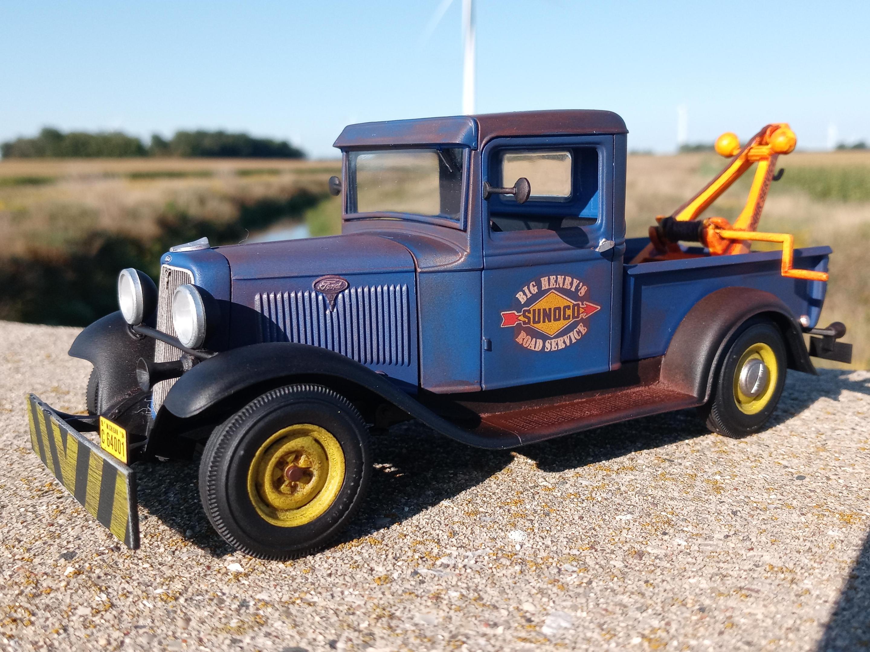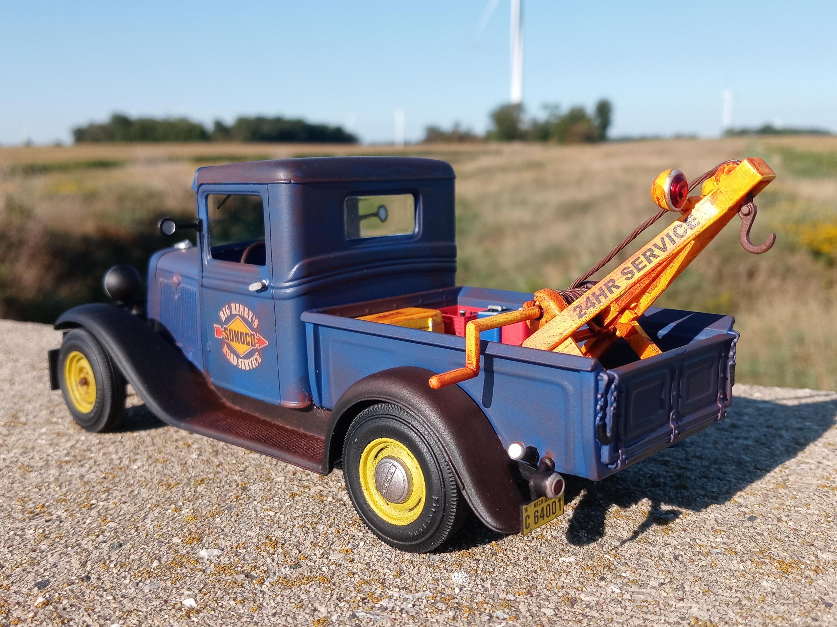 The wrecker is the new Sunoco reissue. I kept it mostly box stock aside from some 53 F100 wheels and some extra junk in the bed. I used the kit supplied 390 but I wanted something a bit more utilitarian than the three two setup, so that was replaced with a 4 barrel intake and heads from a Moebius F100. The street rod is a 2000s Lindberg reissue but was inspired by the AMT Sunoco box side panel. Again it has F100 wheels and covers this time. The pleated tonneau cover came from a 1992 Lindberg reissue. Decals, of course, are left over from the Wrecker. About those decals. They adhere right now and don't like to budge once off the backer. Wetting them and the doors with soapy water was a must to position the things. Not really a problem... If you're expecting it. ?