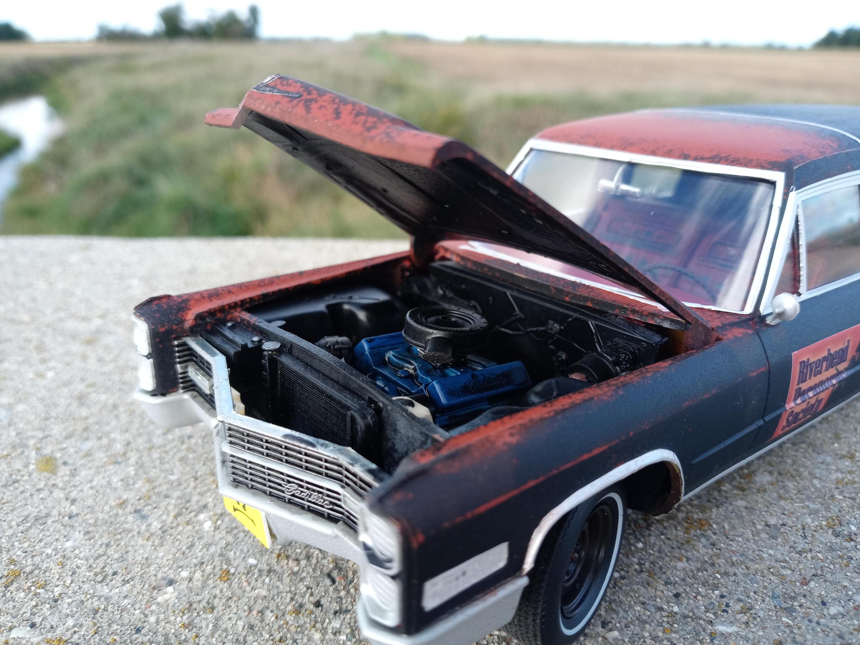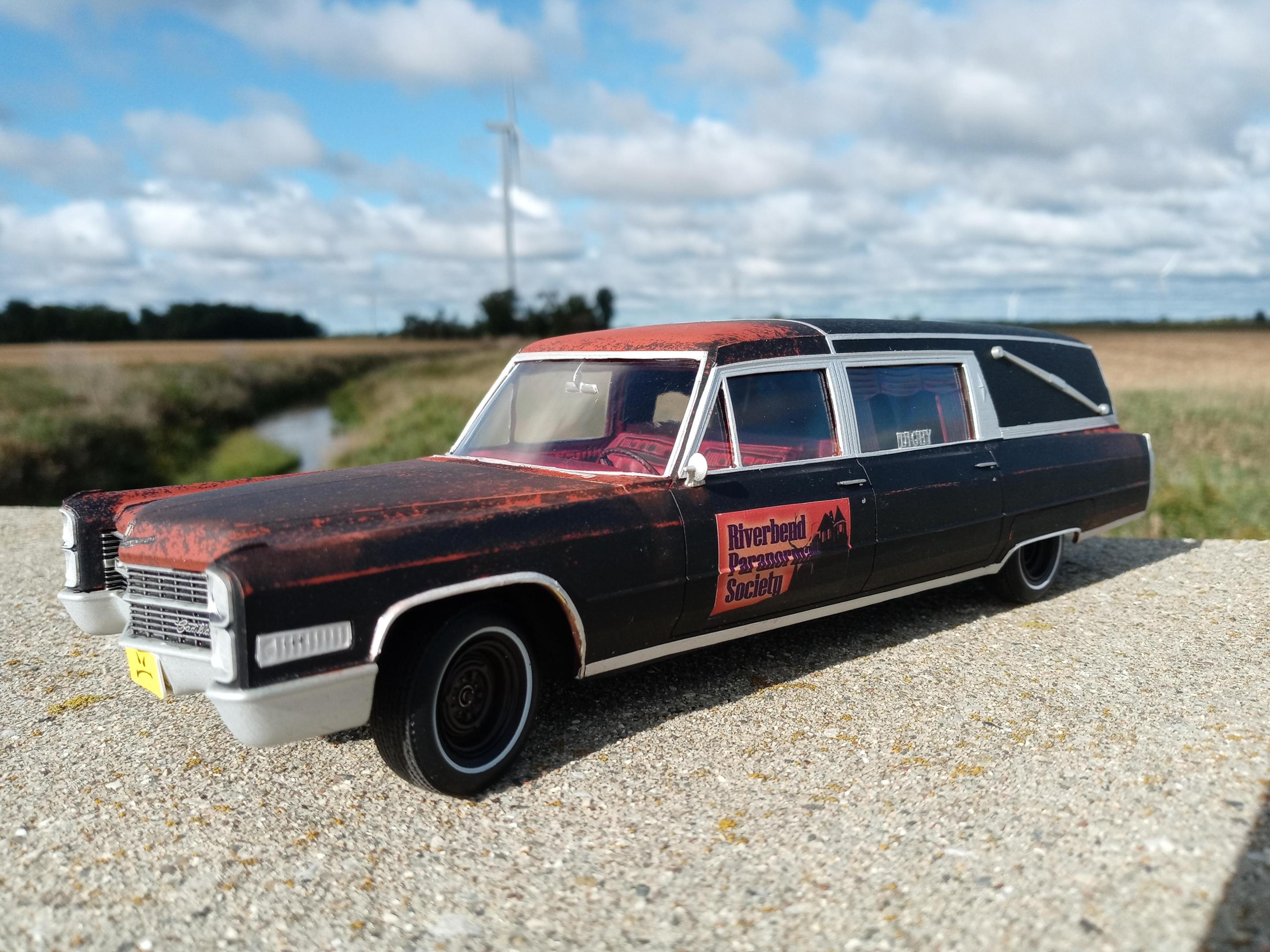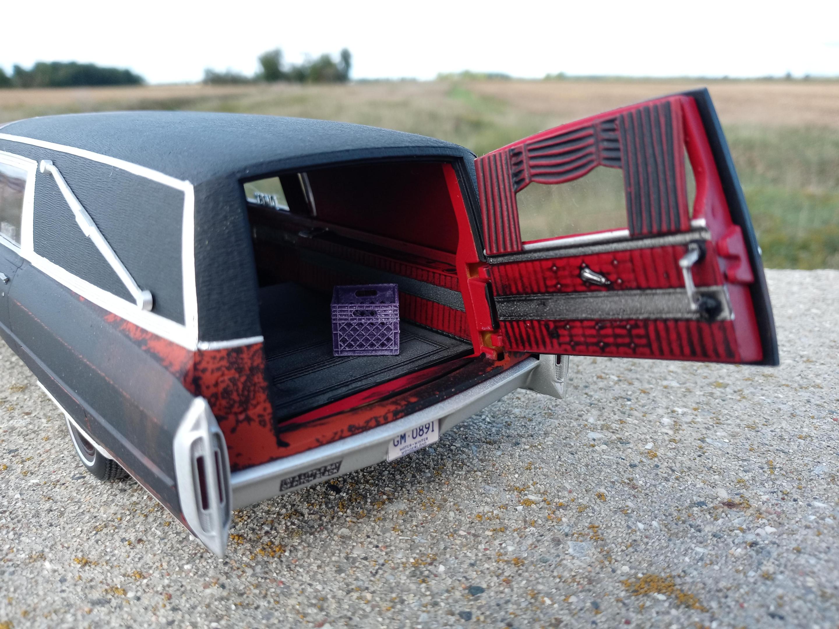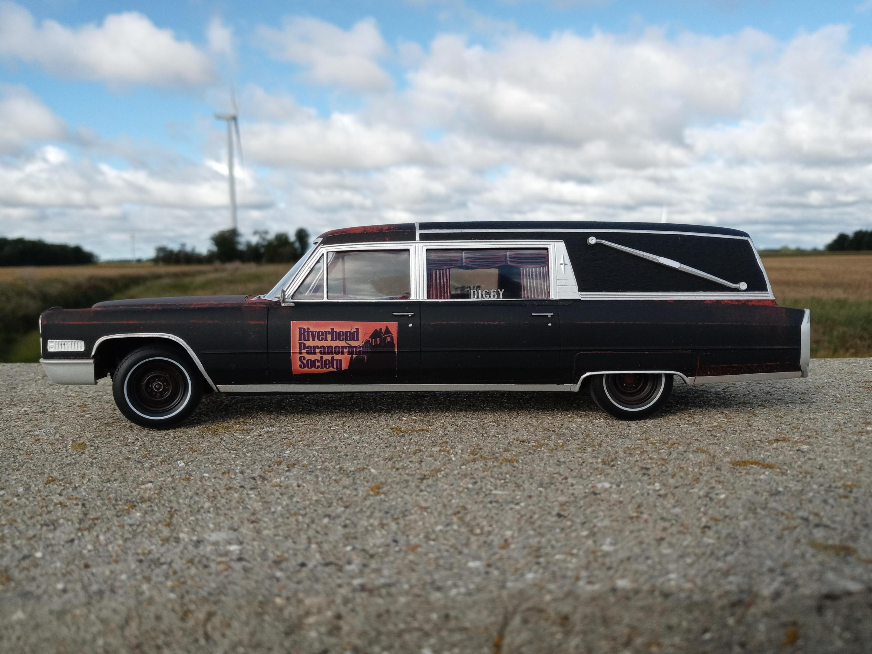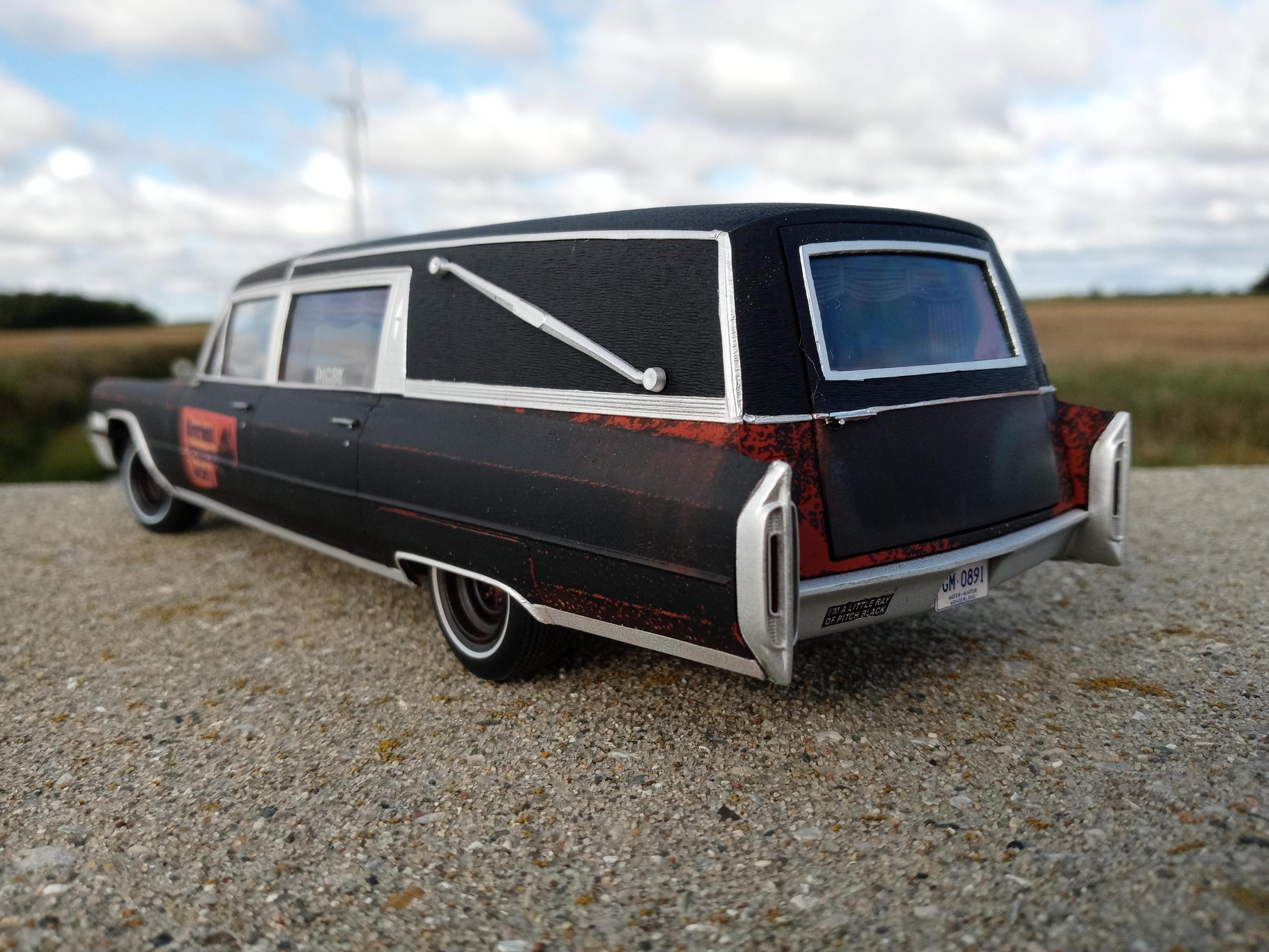 This was a Heavenly Hearse kit I've had laying around for years. The idea was to make it part of a Halloween display. The overall rundown appearance was inspired by a 1:1 70s Oldsmobile hearse used by a local haunted attraction. Other than some AMT wheels and tires and a crate in back it is box stock. The graphics were done by my buddy Erik. Eventually the rear will be full of ghost hunting equipment (hence the crate) and set on a base.