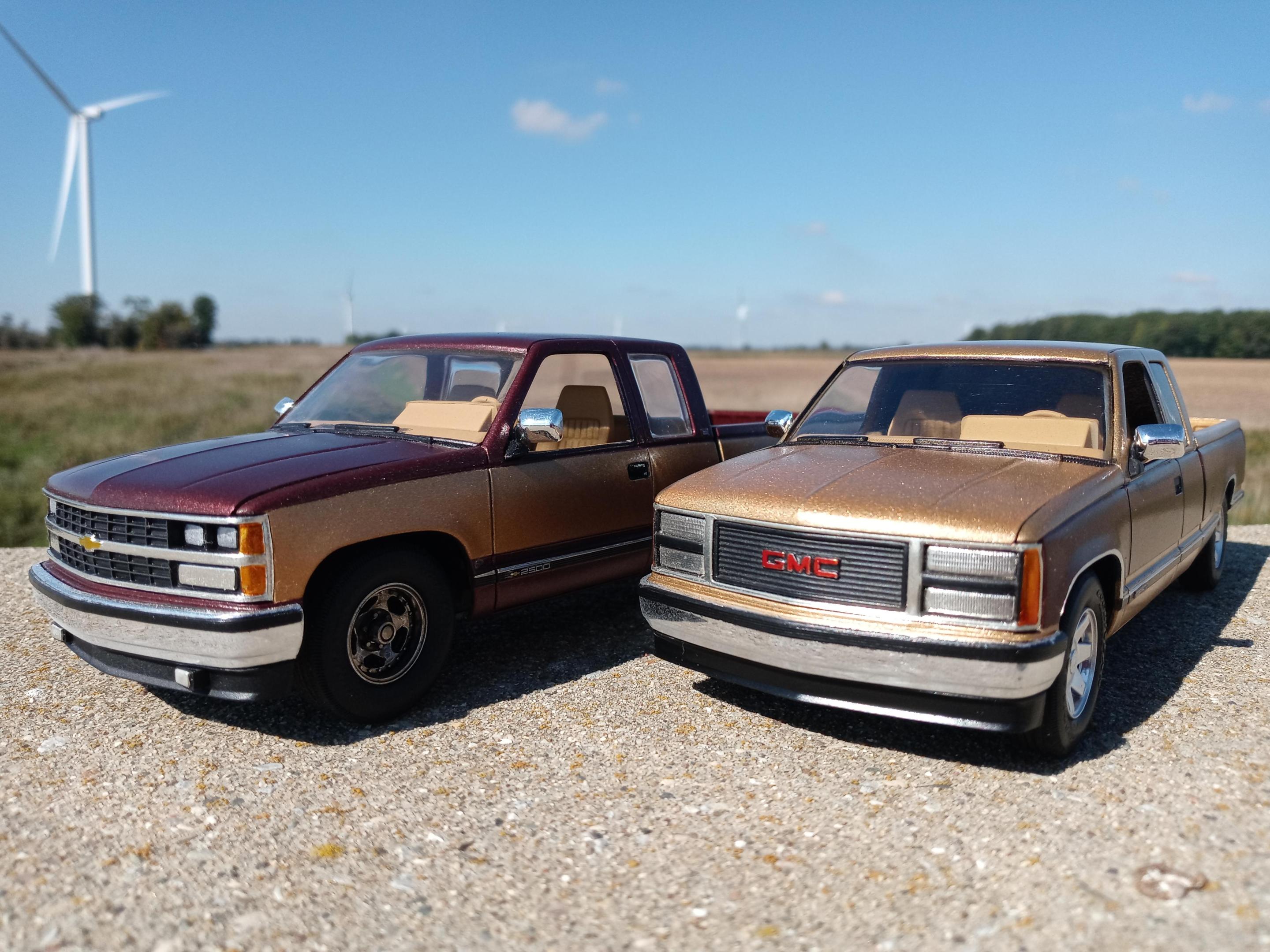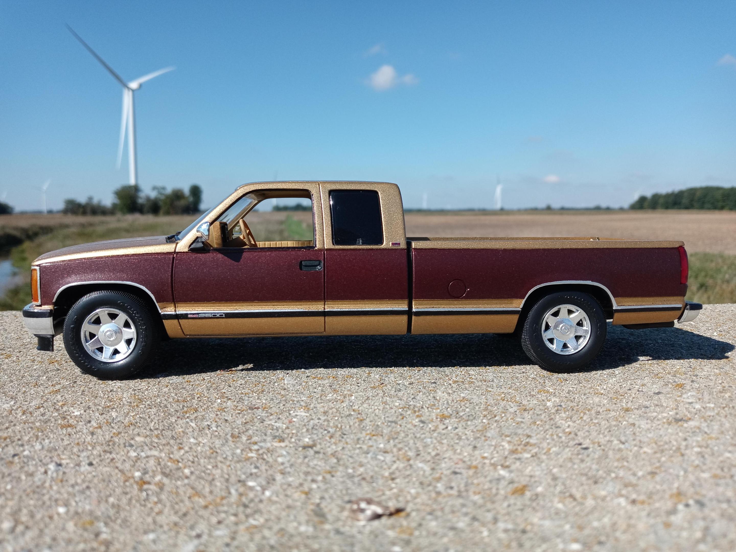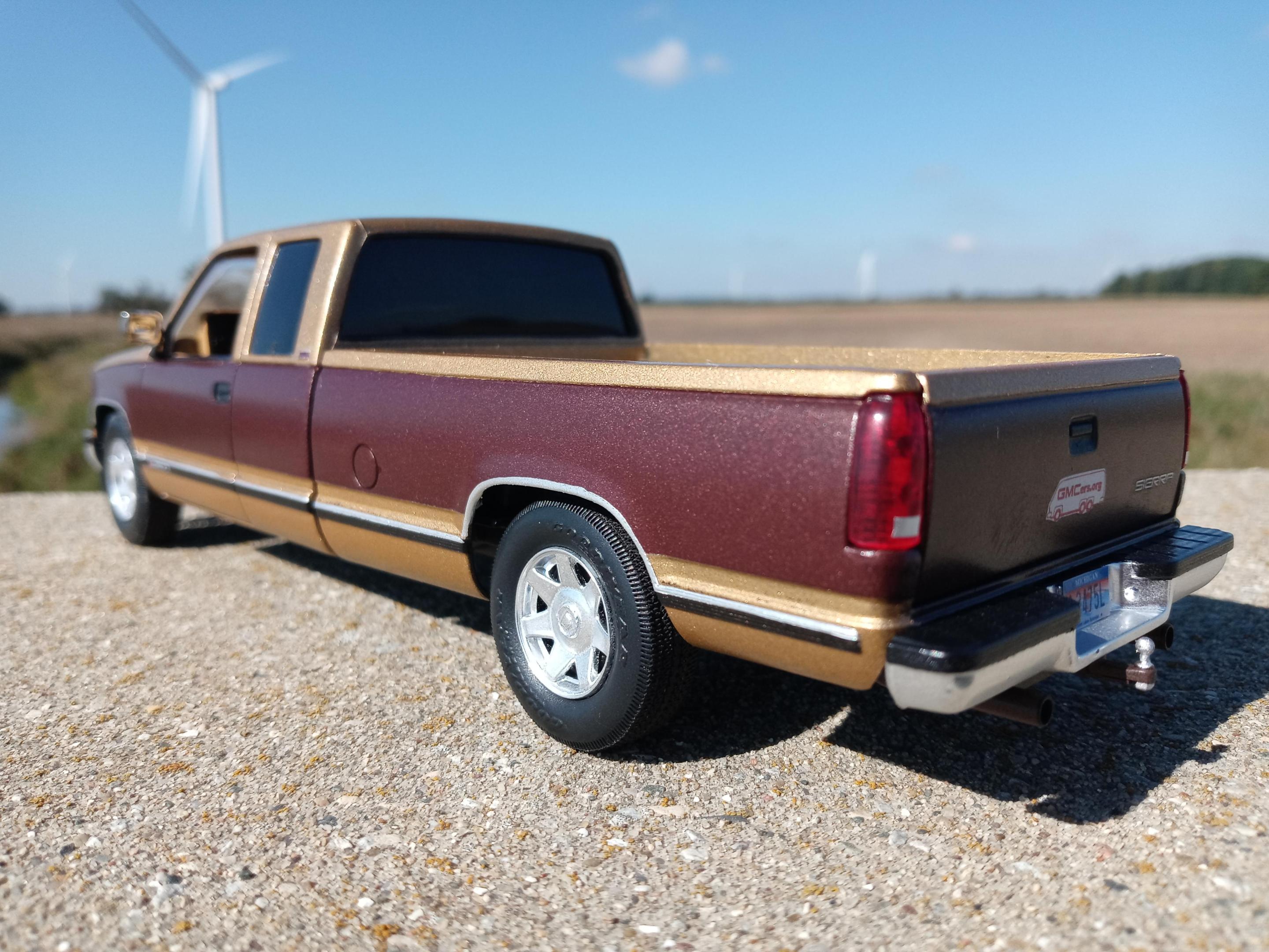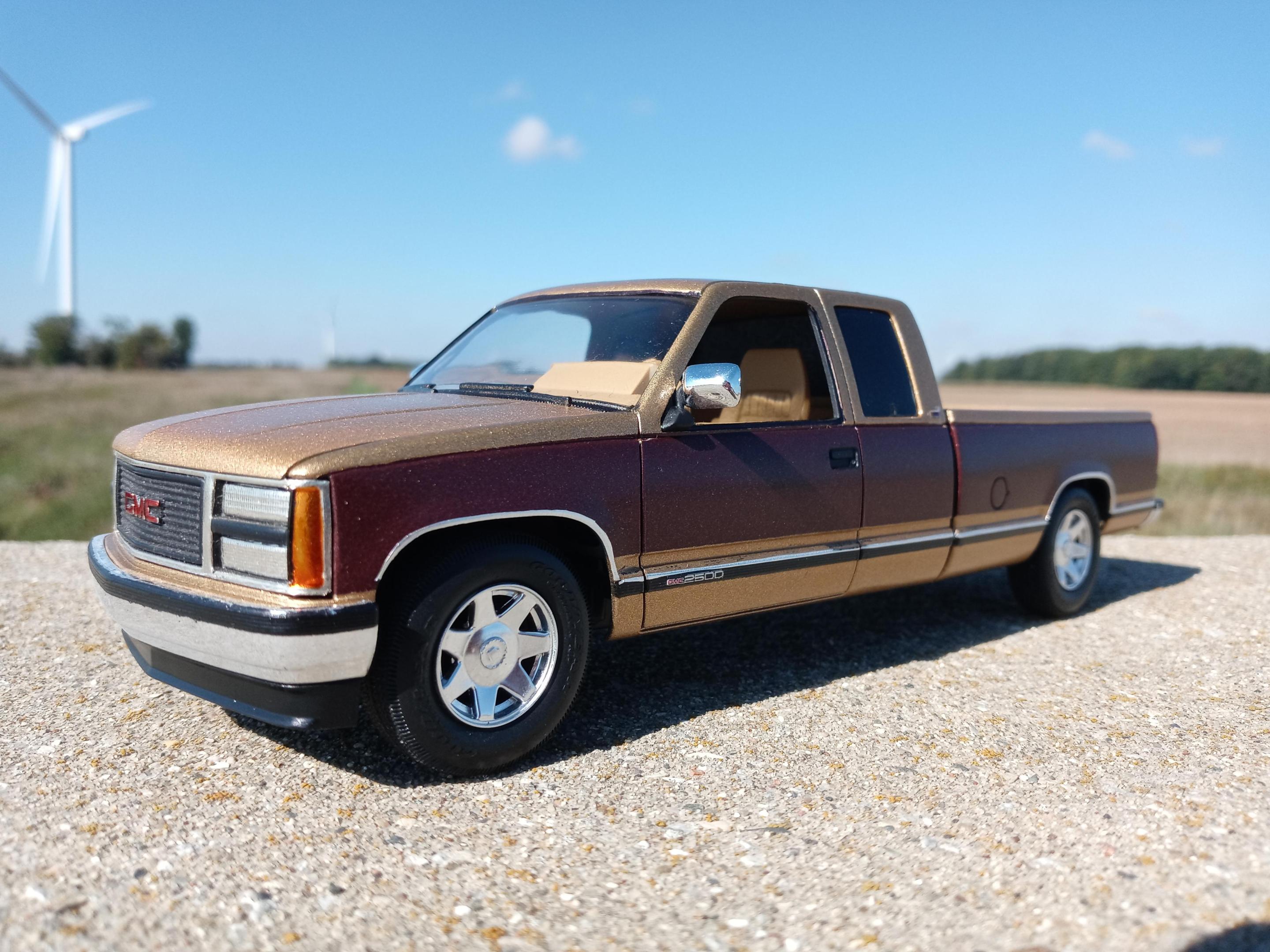 A while back I did a brown over gold 1989 Chevrolet C2500 extended cab, starting with the AMT 1993 snap kit. I had the GMC grille (phantom dually piece with the GMC logo from a Sonoma) done some time ago, and I had another perfectly good extended cab (or Club Coupe as GMC called it) kit so I decided to do a slightly newer GMC version with the color scheme flipped. Wheels and tires came from an AMT Escalade EXT, and the 2500 emblems and Sierra tailgate badge came from @echoxrayniner, aka Ray's Kits Decals. The gmcers.org sticker was printed off the internet. Needs a little foil touch up but it's a decent shelf model and a nice companion to the 1989 Chev.