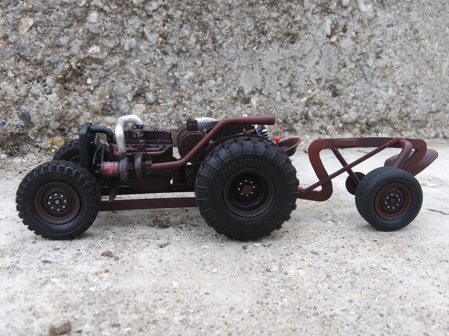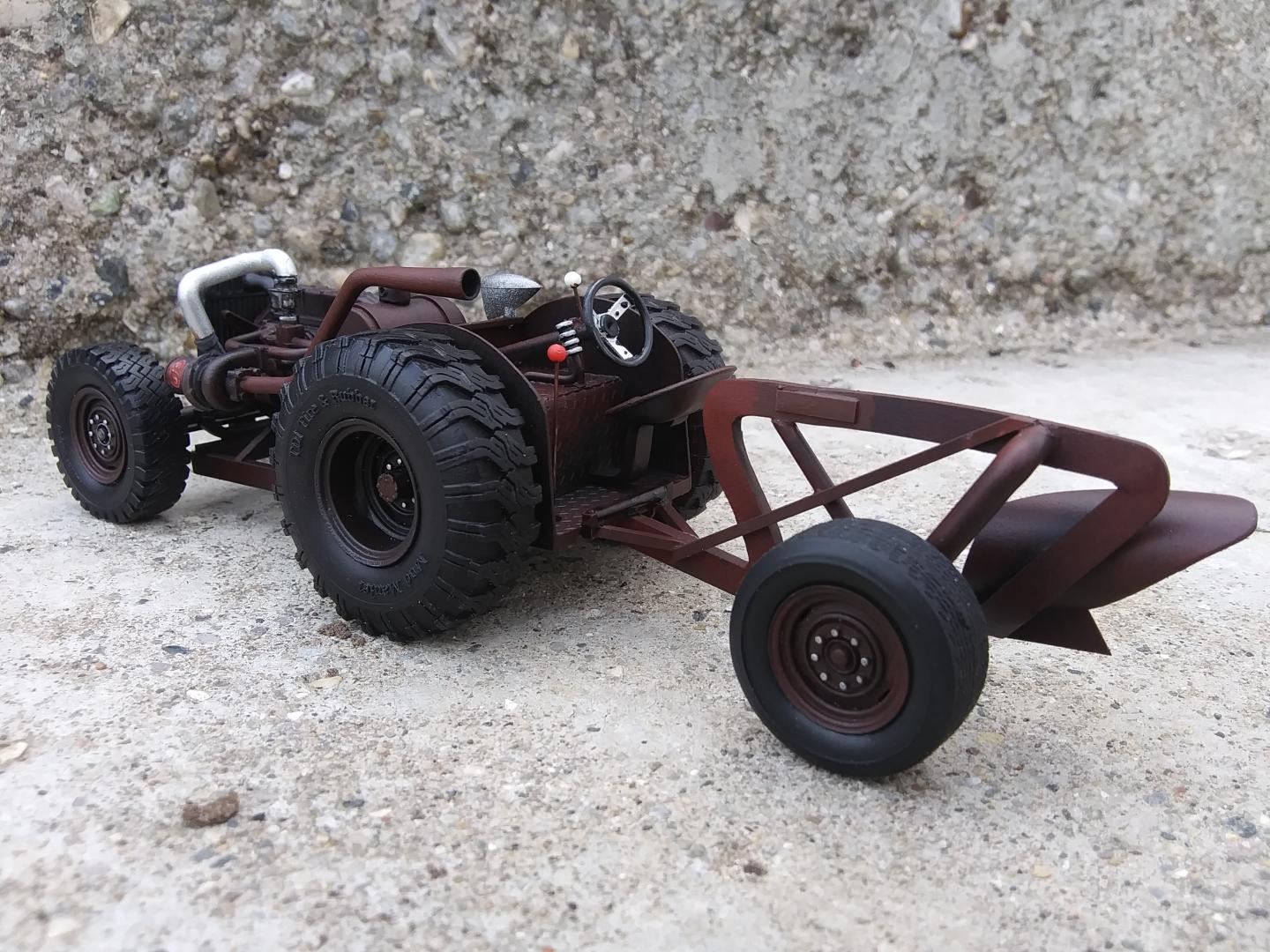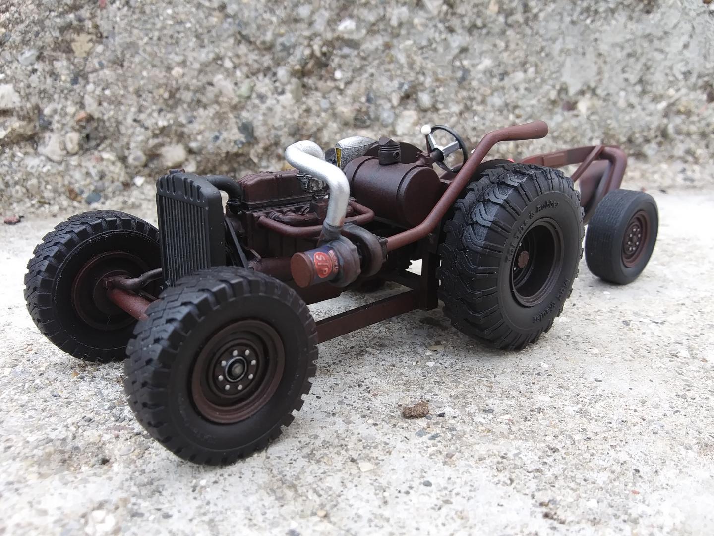 Years ago, I saw a very beaten SSII which had it's rusted rear quarter panels patched in with replacements from an S10. For years the image stuck in my mind and I decided to try it on a model. I didn't have an S10 kit in the stash but I had a junk Ranger snap kit bed laying around so I used that for the quarter panels instead. The real Scout I remember had the soft top, but I decided to add a "junkyard" hard top and doors. I left the trim on the doors to suggest they're off another Scout, and added some body and rust damage. The hole under the driver's headlight was a last-second addition, after I saw a Scout online with a similar hole. The winch came from a Deserer GMC and it sits in a homemade bumper.