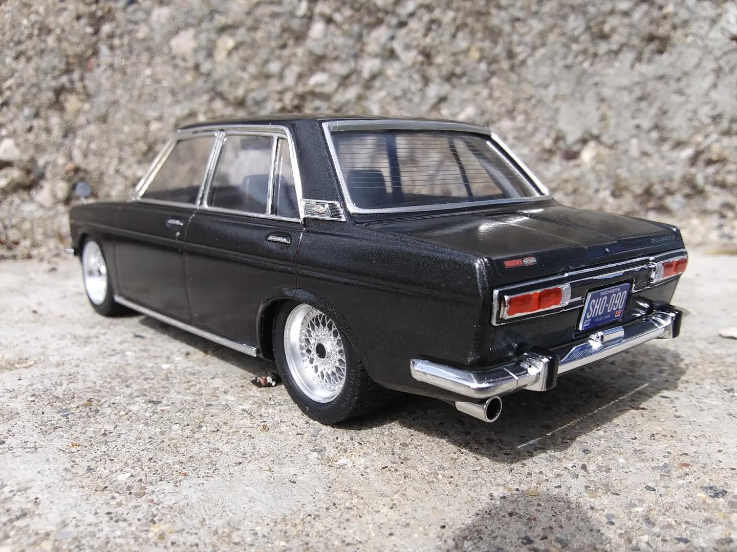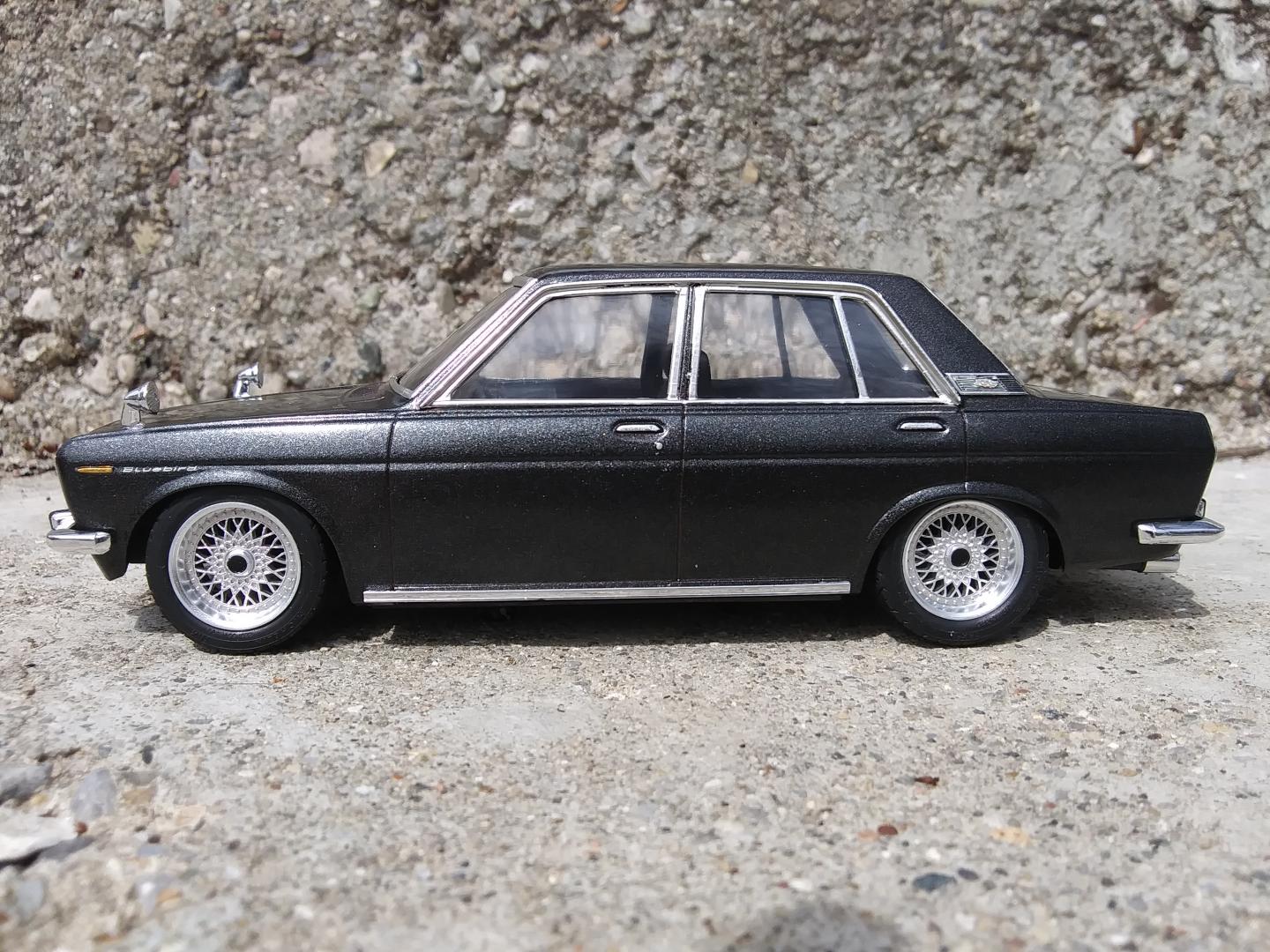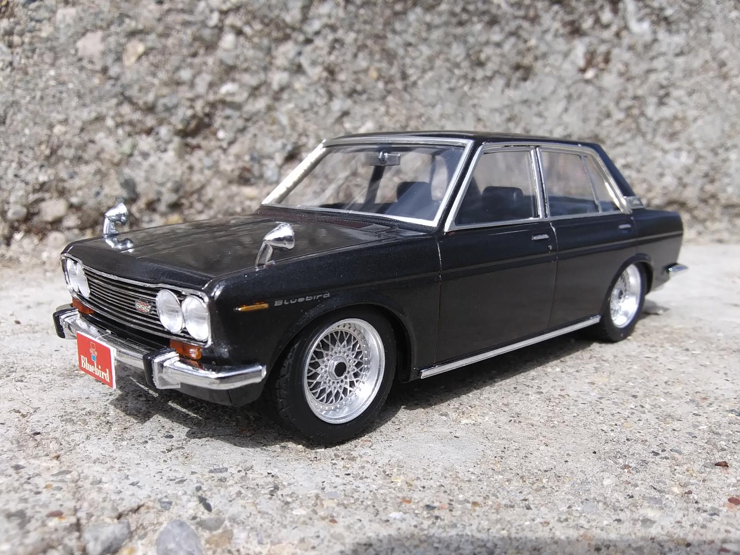 This began as the Hasegawa Nissan Bluebird 1600 SSS. I added Fujimi BBS wheels and converted it to LHD but left the Bluebird trim for a little JDM flair.
