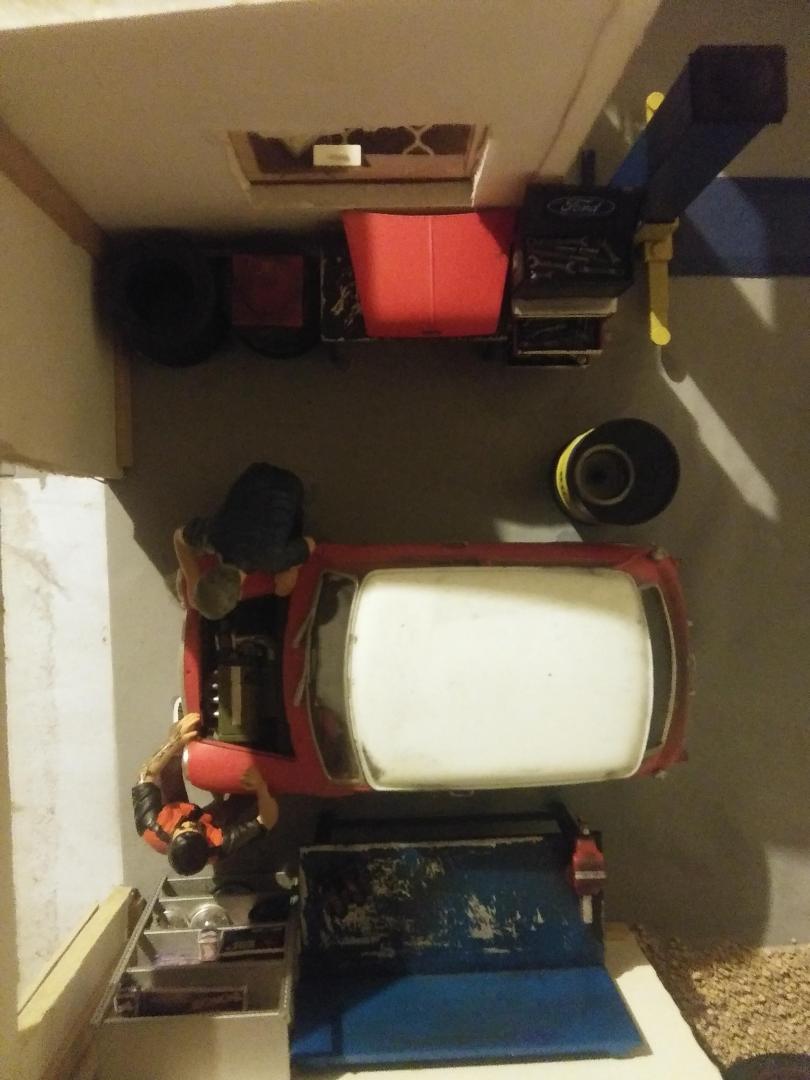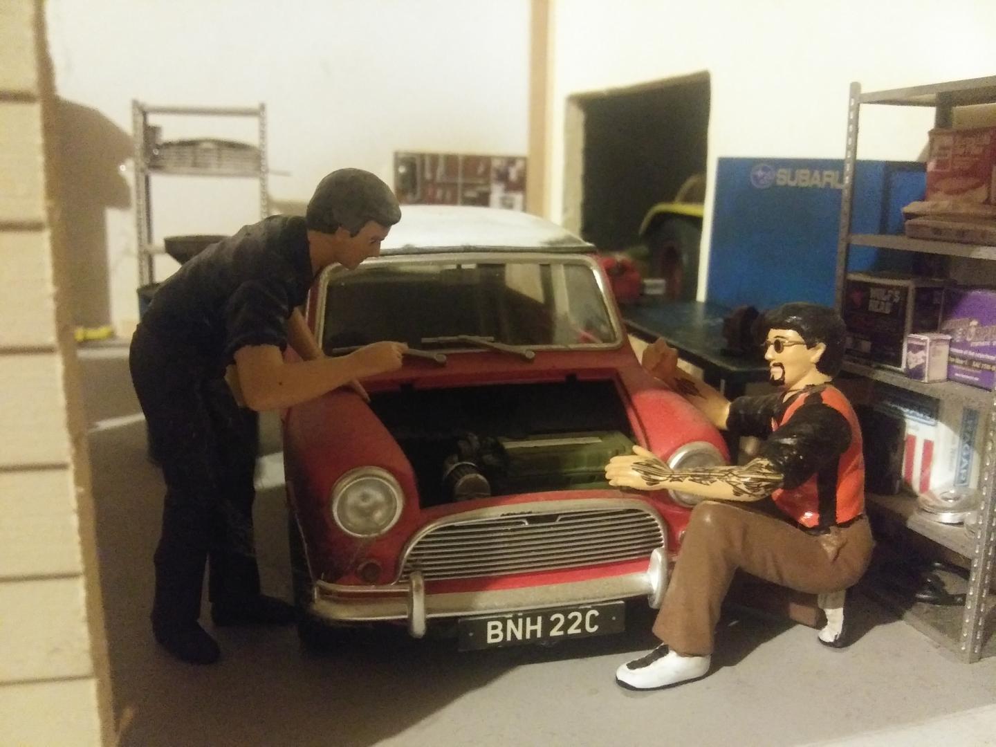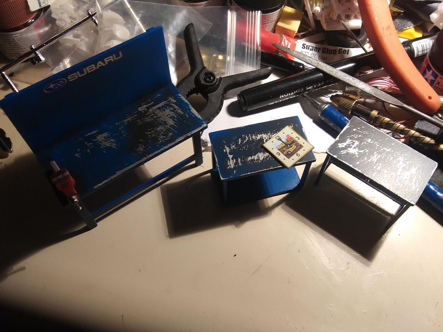 Today I whipped up some work benches. On the left is the one from the new AMT accessories set, the other two are Fujimi. I added BMF to the tops, and after the Ford tractor blue paint had dried, the surface was roughed up and dusted with black weathering powder. The main bench was decorated with a metallic Subaru decal from Hobby Design. The clock is a decal from the same AMT accessories pack.