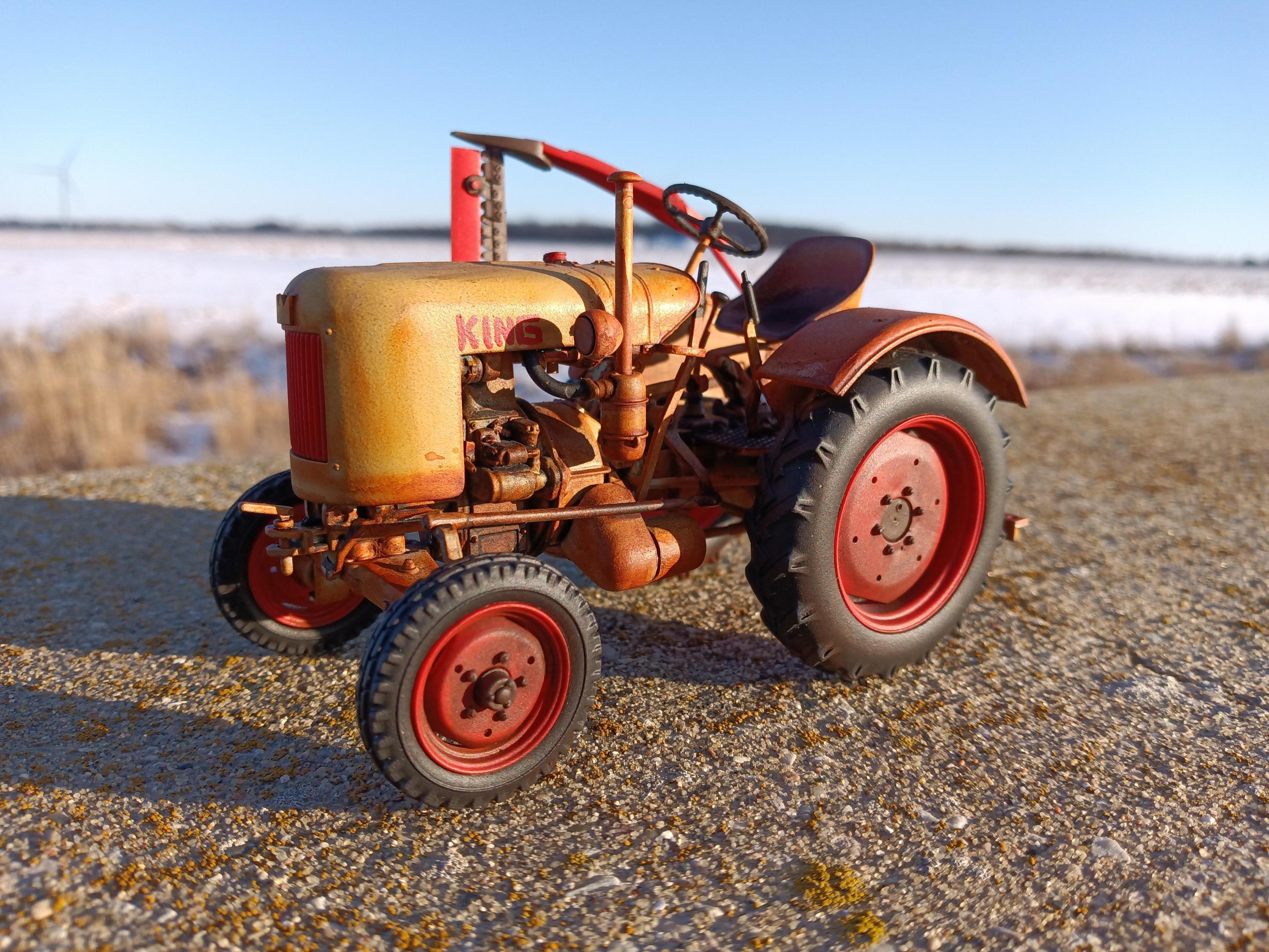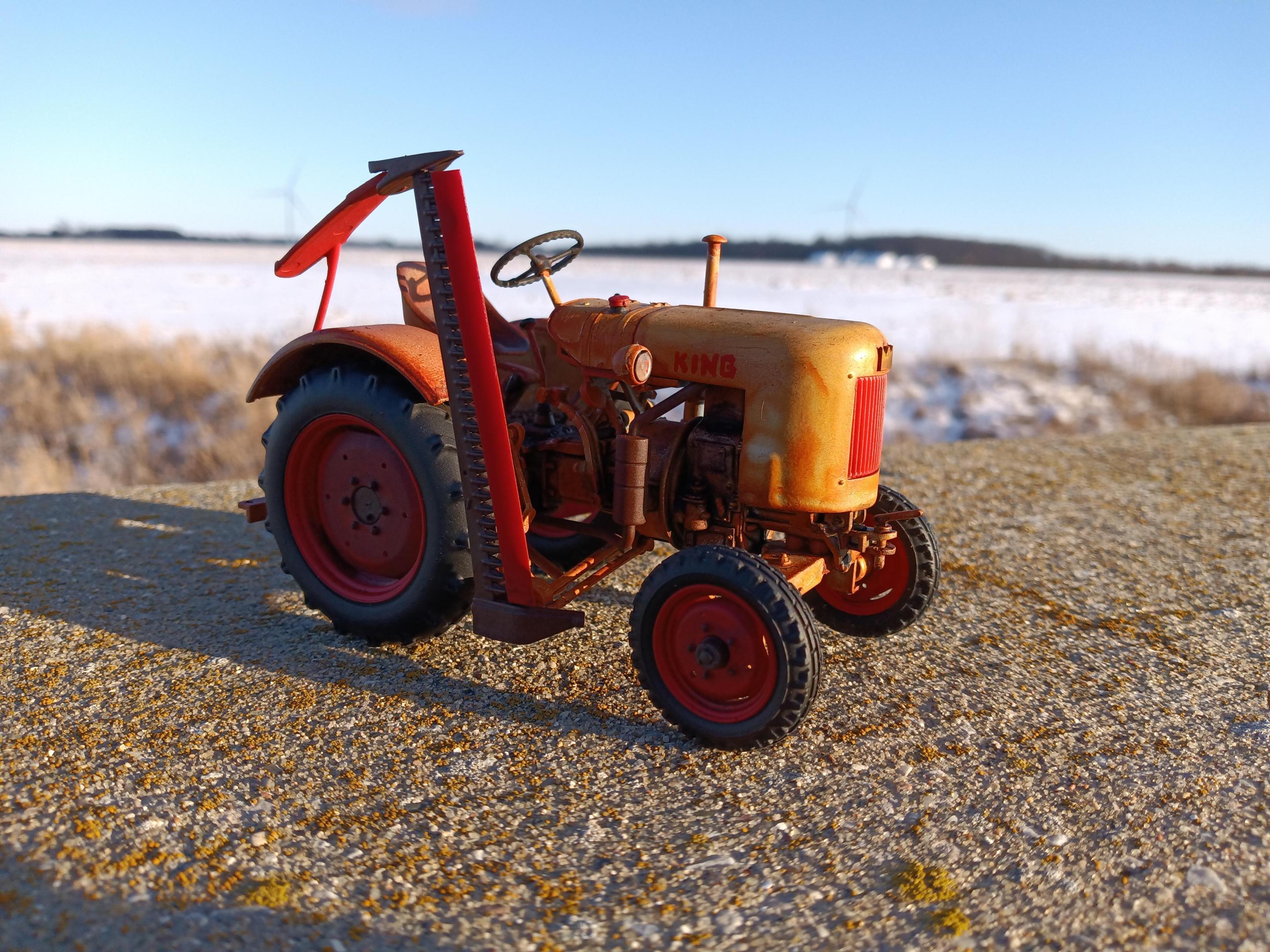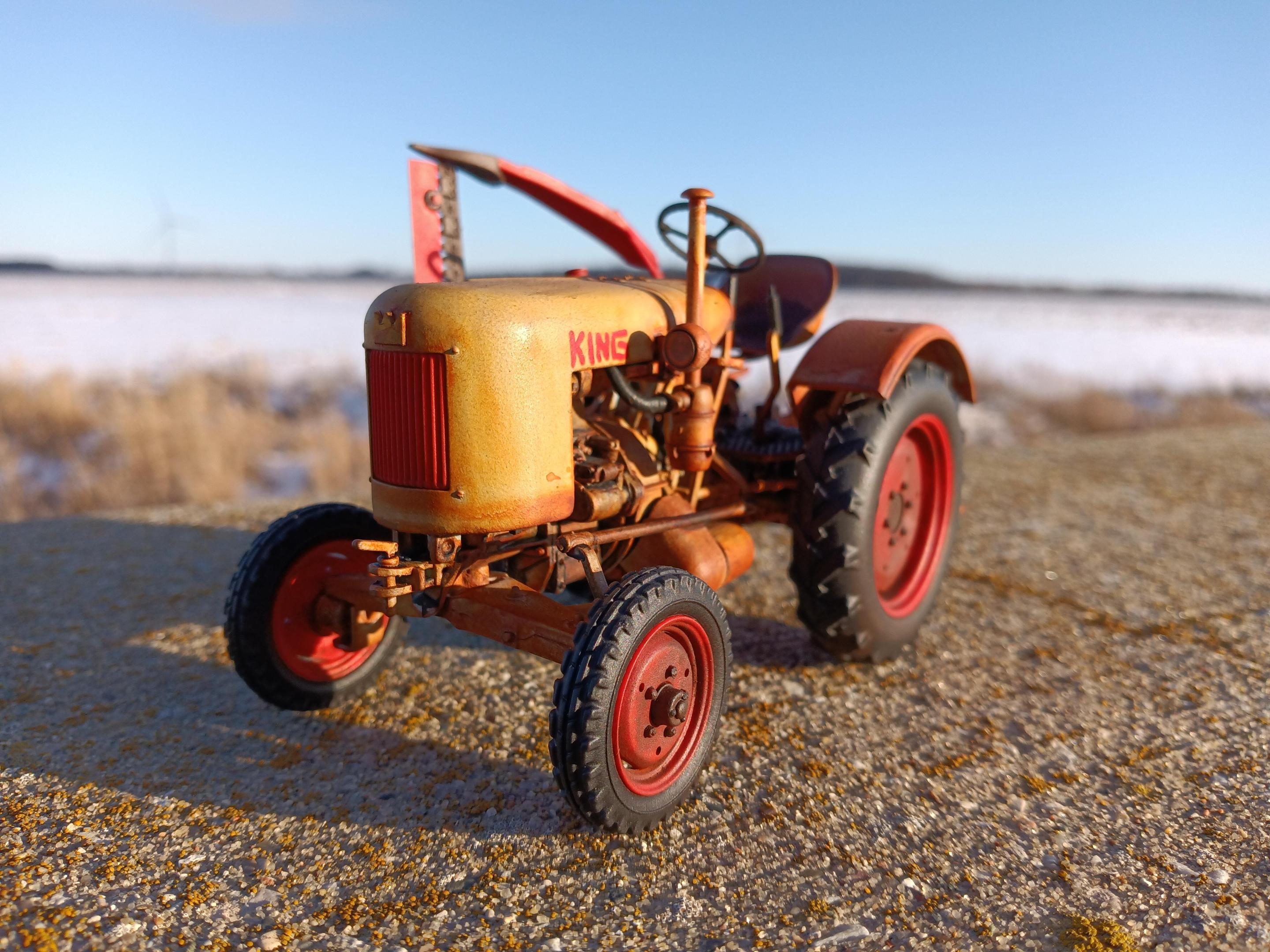 King Equipment Sales is a farm equipment dealer on the outskirts of Sickles, Michigan. Today they're known for their inventory of well-used equipment and fire sale prices. In the past they've sold new equipment with little luck. Current owner Alex Anderson has joked "Since 1952, King Equipment has sold every brand of farm equipment to go out of business, usually a few months after we started selling them." David Bradley, Gibson, Leyland, David Brown, Roths Industries, Long Agribusiness, Gold Star, and numerous others have been sold new by King Equipment over the years. But for a few glorious months in 1955, King tried to get into manufacturing their own equipment. Sort of. Due to some convoluted horse trading, Alfred King was able to procure components to build the Fendt F20 Dieselross. Communication with Fendt to import their tractors outright fell through, but Alfred was able to rent a decommissioned aircraft hangar and build these "knock down kits" under his own name. Wearing a combination of pale blue and bright red, the King E20 Baby Diesel was announced, built, and discontinued within a 90 day period. Al had hoped to sell at least 150 a year. In the end, he built five and sold three. There were numerous reasons why Al's venture flopped, perhaps mostly his own slightly sketchy reputation and his penchant for exaggerated claims. This is the only known remaining example of the E20 Baby Diesel. It was the fourth unit built and the only one with the optional sickle bar mower. It was one of the two not sold ... It was gifted to the Sickles Village DPW as a promotion, and was used by the village until 1988, by which time Sickles had grown into a city and the King was getting worn out. Not feeling like ordering obsolete Fendt parts from Germany in a pre-eBay world, it was sold at auction to it's current owner, Steve Barnes. Steve used a friend he made while he was stationed in Germany as a connection to obtain parts and has used the King on his farm ever since. Eventually he plans to do a full restoration. And he occasionally shows it, even though it's not looking it's greatest these days. King Equipment has tried to buy it back quite a few times, but so far Steve won't budge. The model is the Revell Fendt F20 Dieselross painted in non-Fendt colors. I deleted the passenger seat and ROPS bar, and all lamps except the headlights. The hood is hand lettered and I made a little crown emblem for the nose. The whole reason for the color scheme and backstory? I wasn't a fan of the Fendt color and I wanted to put an American spin on this German tractor.