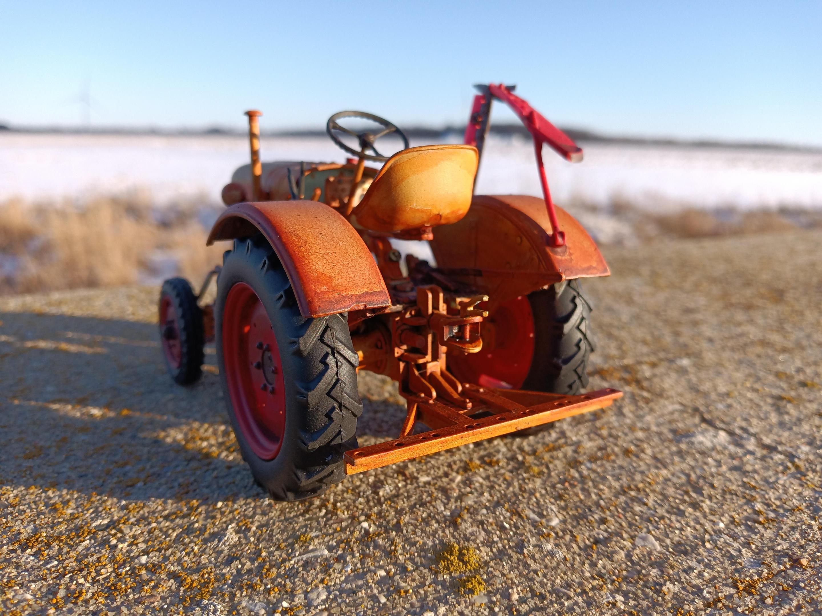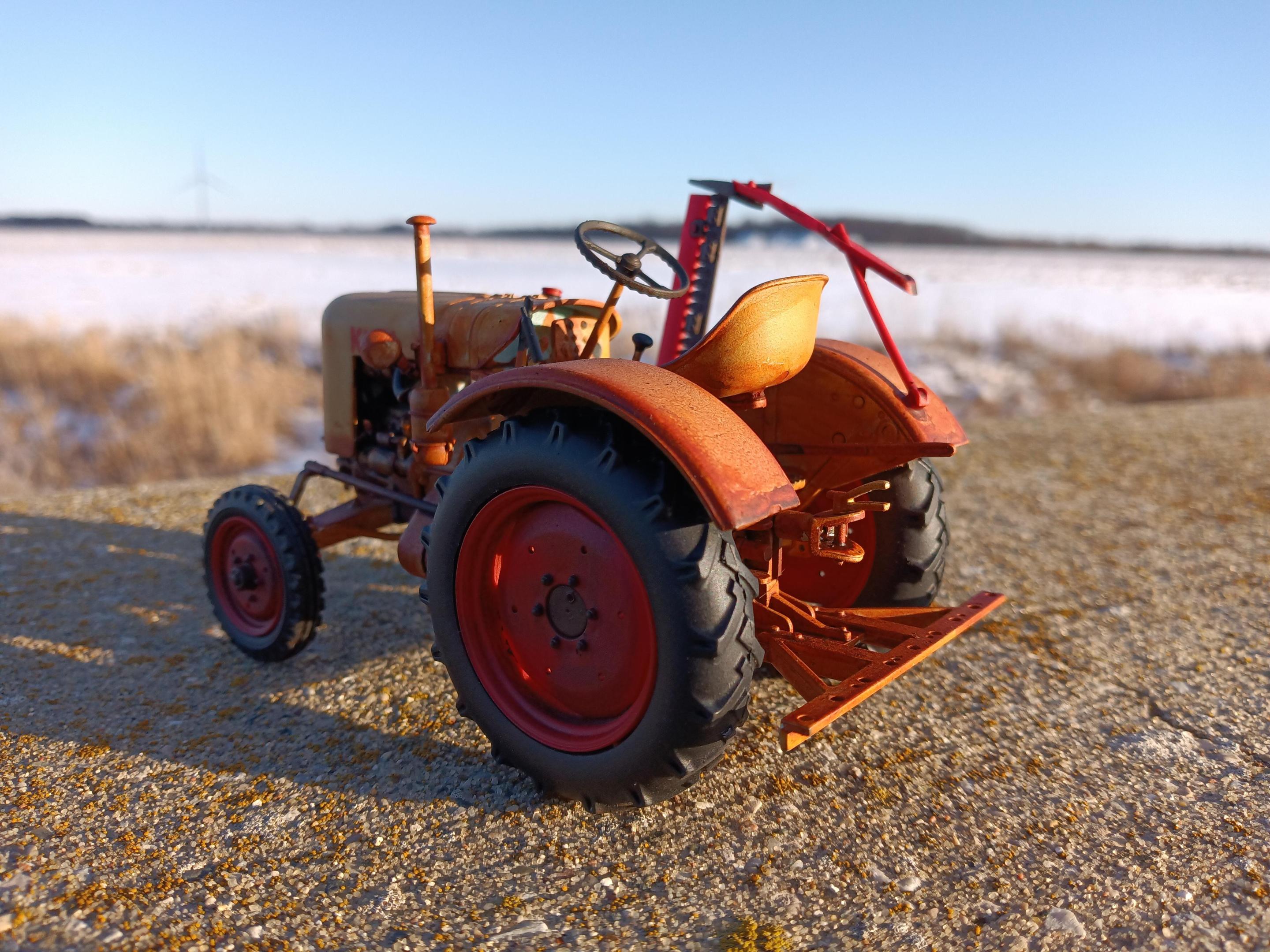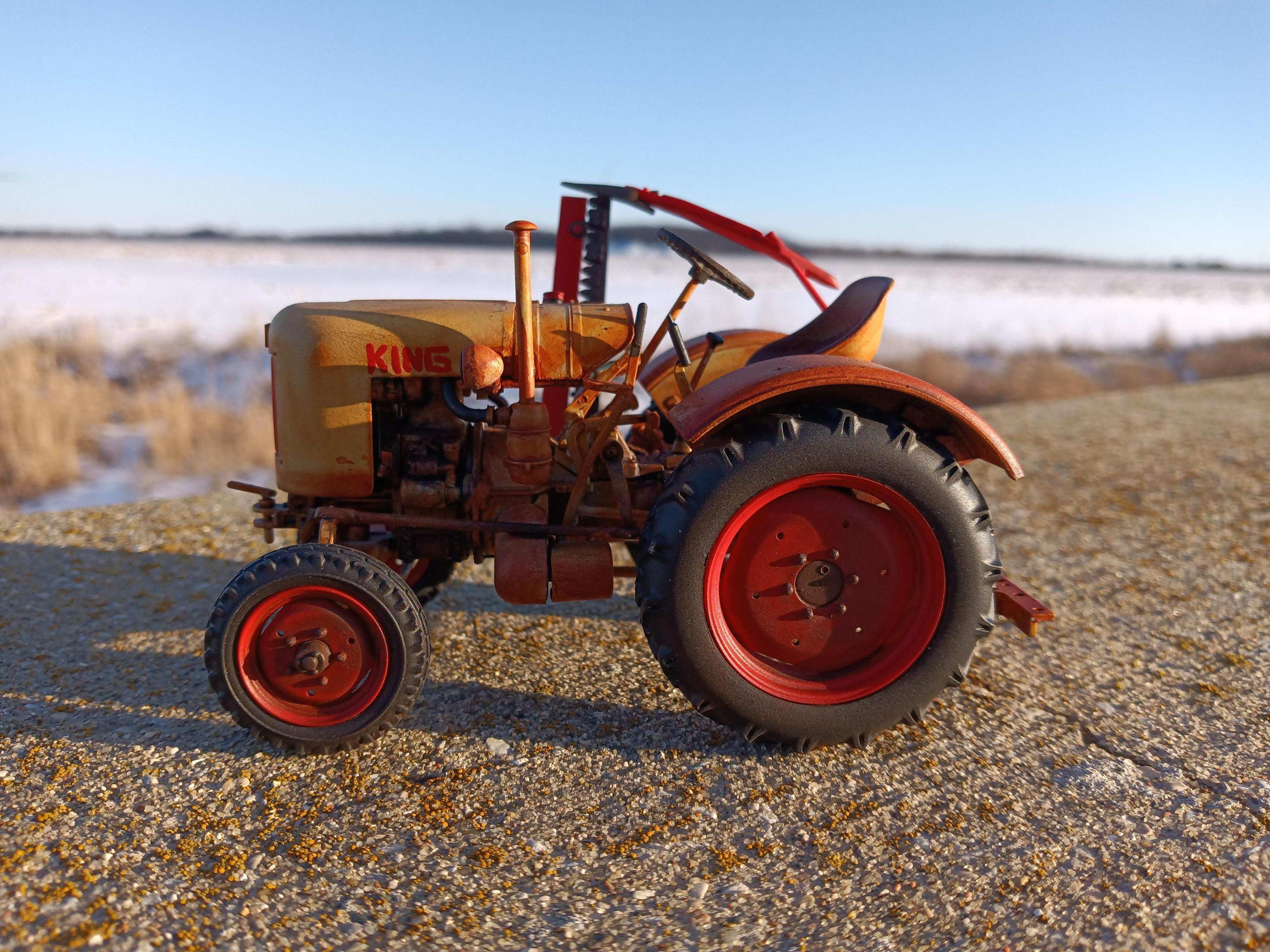 King Equipment Sales is a farm equipment dealer on the outskirts of Sickles, Michigan. Today they're known for their inventory of well-used equipment and fire sale prices. In the past they've sold new equipment with little luck. Current owner Alex Anderson has joked "Since 1952, King Equipment has sold every brand of farm equipment to go out of business, usually a few months after we started selling them." David Bradley, Gibson, Leyland, David Brown, Roths Industries, Long Agribusiness, Gold Star, and numerous others have been sold new by King Equipment over the years. But for a few glorious months in 1955, King tried to get into manufacturing their own equipment. Sort of. Due to some convoluted horse trading, Alfred King was able to procure components to build the Fendt F20 Dieselross. Communication with Fendt to import their tractors outright fell through, but Alfred was able to rent a decommissioned aircraft hangar and build these "knock down kits" under his own name. Wearing a combination of pale blue and bright red, the King E20 Baby Diesel was announced, built, and discontinued within a 90 day period. Al had hoped to sell at least 150 a year. In the end, he built five and sold three. There were numerous reasons why Al's venture flopped, perhaps mostly his own slightly sketchy reputation and his penchant for exaggerated claims. This is the only known remaining example of the E20 Baby Diesel. It was the fourth unit built and the only one with the optional sickle bar mower. It was one of the two not sold ... It was gifted to the Sickles Village DPW as a promotion, and was used by the village until 1988, by which time Sickles had grown into a city and the King was getting worn out. Not feeling like ordering obsolete Fendt parts from Germany in a pre-eBay world, it was sold at auction to it's current owner, Steve Barnes. Steve used a friend he made while he was stationed in Germany as a connection to obtain parts and has used the King on his farm ever since. Eventually he plans to do a full restoration. And he occasionally shows it, even though it's not looking it's greatest these days. King Equipment has tried to buy it back quite a few times, but so far Steve won't budge. The model is the Revell Fendt F20 Dieselross painted in non-Fendt colors. I deleted the passenger seat and ROPS bar, and all lamps except the headlights. The hood is hand lettered and I made a little crown emblem for the nose. The whole reason for the color scheme and backstory? I wasn't a fan of the Fendt color and I wanted to put an American spin on this German tractor.