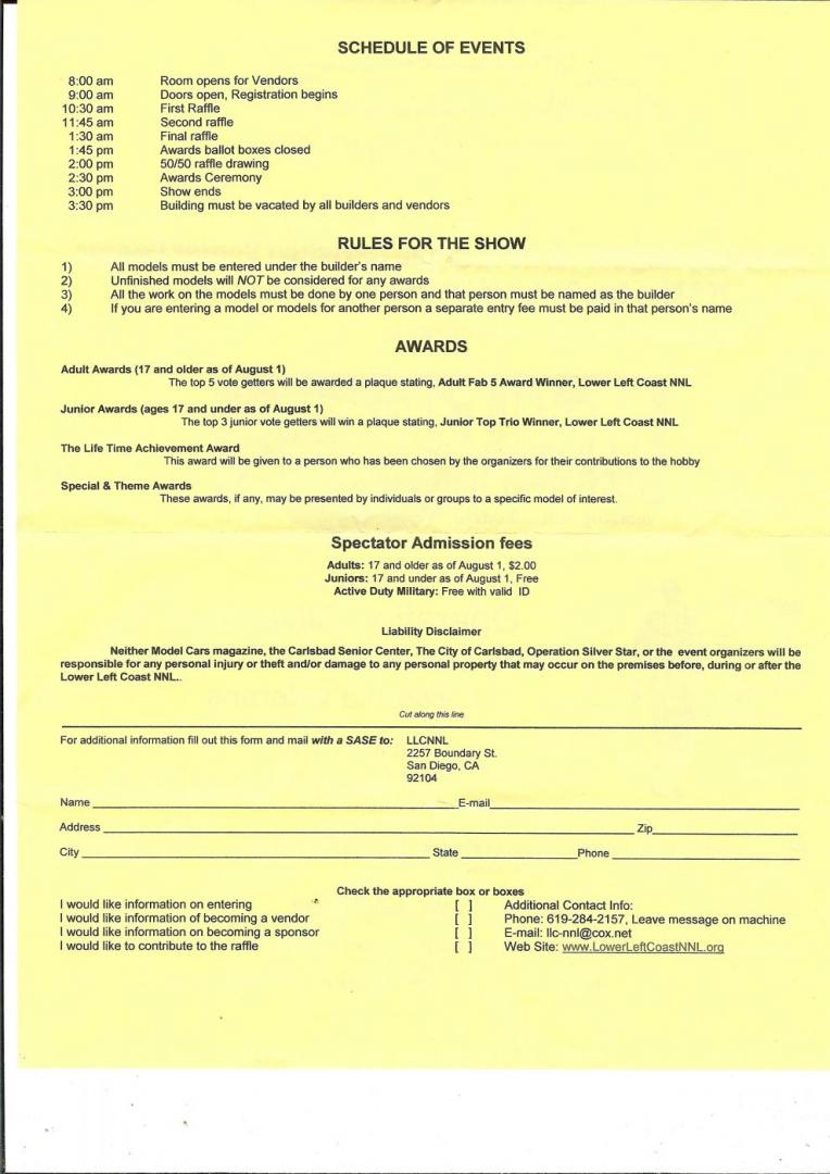 Just got the flyers, all the information is there but please feel free to PM me or email me (see flyer) should you have any other questions. One thing not mentioned on the flyer is that we will have vendor tables available this year, again, PM me or email me if you are interested and I will get back to you with the particulars. Hope to see all of you there. Model Cars Magazine will be there to photograph the show for possible publication. Just a few short week away so finish up those builds.