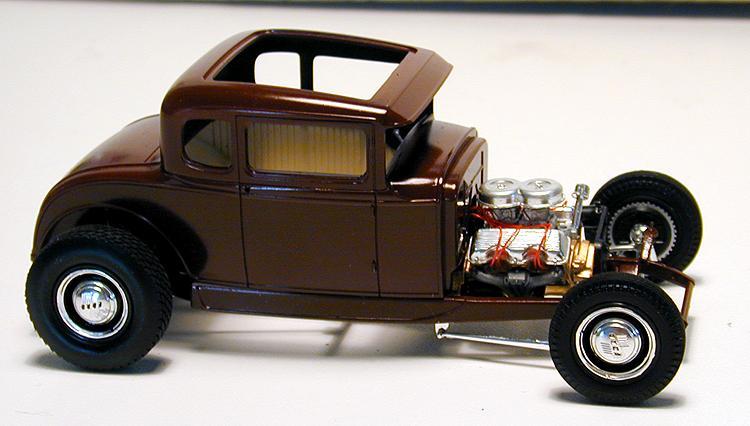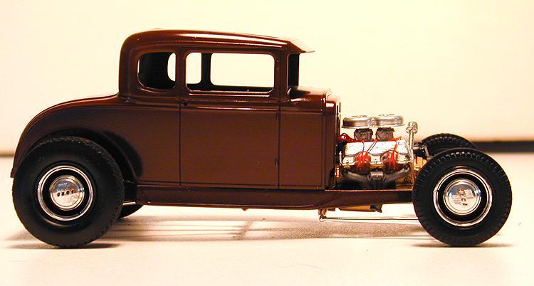 First let me mention that I haven't touched my model work bench or done any model car work at all for at least the last six months, maybe longer. There's no real reason for this other than a general lack of interest and my time being filled with other hobbies and activities. It took Revell's new '30 Model A coupe to get me back. So with that being said, take a look at the progress so far. Using the '32 frame I dropped the front about 2 scale inches improving the stance. The engine is a Chevy 409 from the AMT '62 Bel Air kit with valve covers and air cleaners from spare parts. All of the paint is Testors Model Master. Although it looks brownish in the photos the main color is really a dark maroon made by mixing some Gloss Black into Guards Red until I got the shade I wanted. The interior is black and Sand. The wheels are just Gloss Black. The engine is Gold. I'm not as bothered by the size and shape of the roof opening and the visor as some others have mentioned. I only have two real criticisms of this kit. One is the small block Chevy engine. It looks too generic to me. Just doesn't really capture the "look" very well. The other is the decal sheet which is a complete waste of paper. Other than that I really like this kit, mostly because I really like Model A coupes, and I'll probably buy several more. Now, the question is; who's going to be the first one to use two bodies and make a stock height roof?