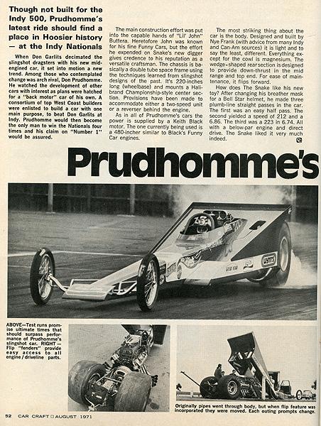 I did a search and didn't find anything on this new kit so I hope I'm not going over covered ground. I got my hands on this kit yesterday and have been digging in to it. The frame, engine, etc are all from the original MPC Garlits mid-engined Swamp Rat 1R. That makes the frame incorrect as Prodhomme's car was built by Lil' John Buttera and didn't use a Garlits' frame. I don't see this as any problem however on a full body car like this because the only part of the frame that really shows is the roll cage. It's different from the kit but that difference is easy enough to correct with some Evergreen rod. The body, which on the 1:1 car was built by Nye Frank, appears to be an all new piece. It's very close in my initial inspection although the coming around the cockpit may be a little too high, but we'll see. The engine is typical for MPC and would probably best be replaced by one from the early Revell funny car and dragster series kits. The valve covers and injector from Revell are much closer to correct than what's in this kit. Anyway, that's just my first impressions upon opening the box, so here are some reference photos so you can decide for yourself.