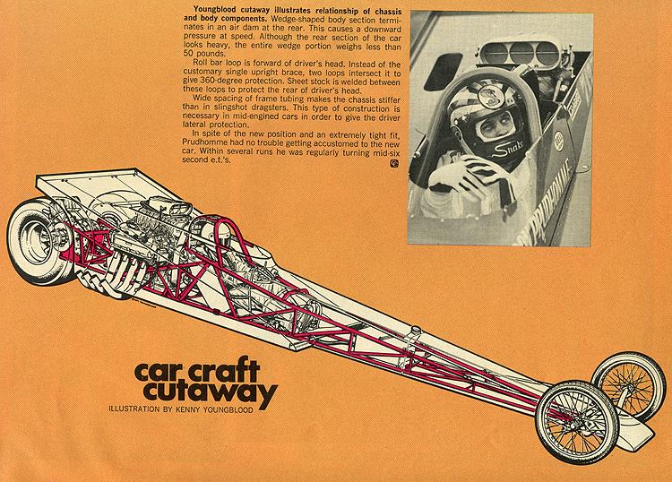 The Car Craft article shows the headers both ways. In the black and white photos and in the cutaway illustration, the headers are the funny car style. Also the "Hot Wheels" logo and other markings are different on the museum car than they are in the Car Craft photos.