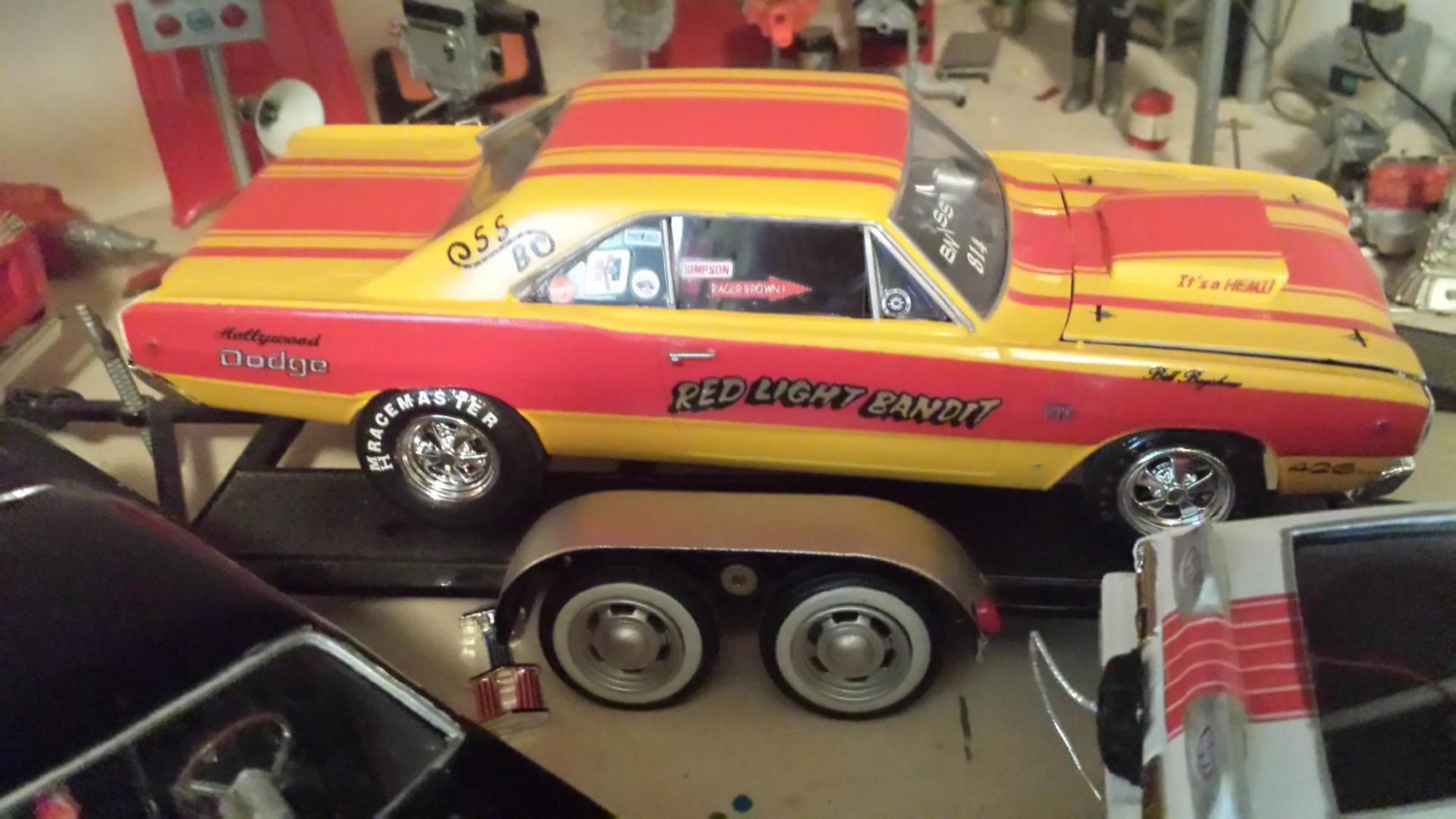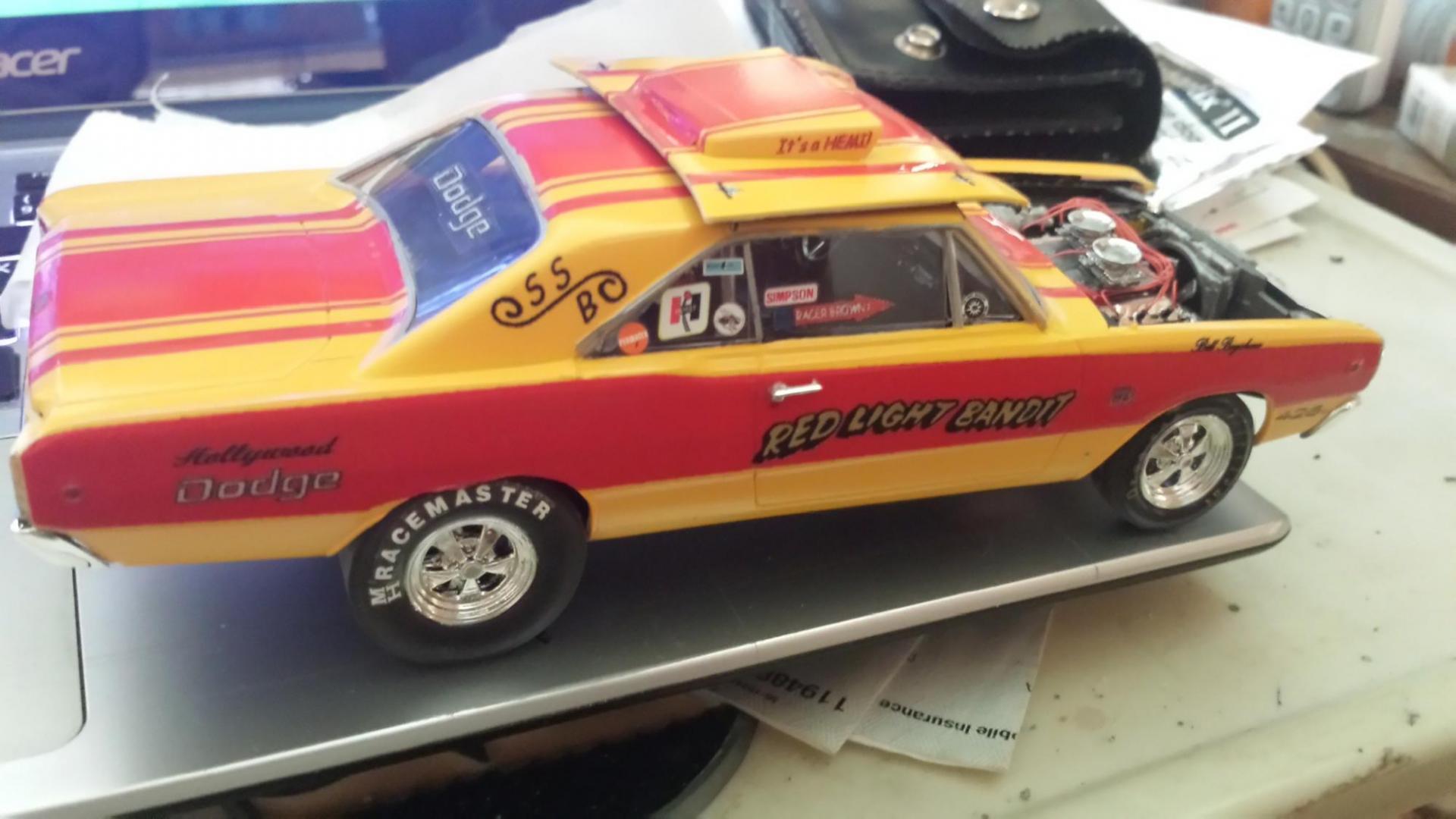Here is the 68 Dart the classic Red light Bandit, wired it up, ad'ed battery cables sanded slicks, this was a fun build, used the Revell hemi kit. I'll post a few more pics now that I have my cell cam set right had it on wrong mode, kept taking to big a pics.