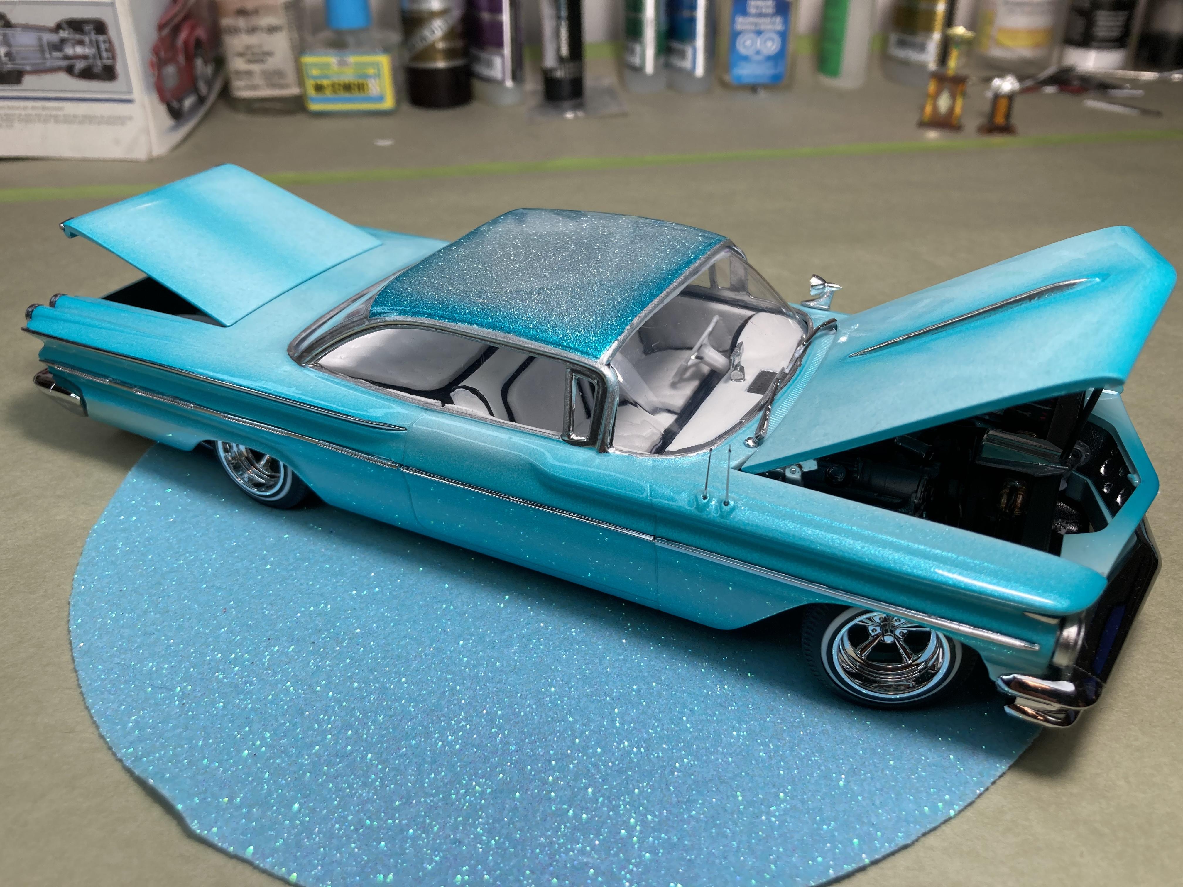 This is a Thumpeter 1960 Bonneville, A first for me to build a Thumpeter Kit , It went together pretty well , I bought this as a not complete kit, missing its interior door cards and the rear seat , not a big problem, I made new doors cards with a white diamond tuck pattern and made a complete rear seat cover , the rest of the build went pretty smooth, shaved doors, French antennas, lowered and riding on a set of Pegasus Astro Supremes plus a pearl white base color with a candy teal fade and silver metal flake top give it a cool 1960’s vibe . All in all it’s a good kit and builds into a pretty decent look model, thanks for looking !