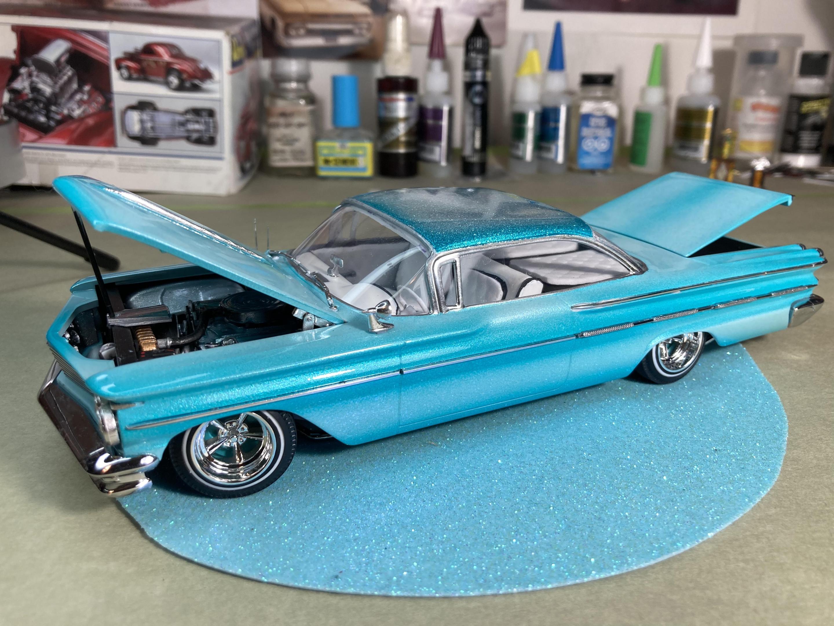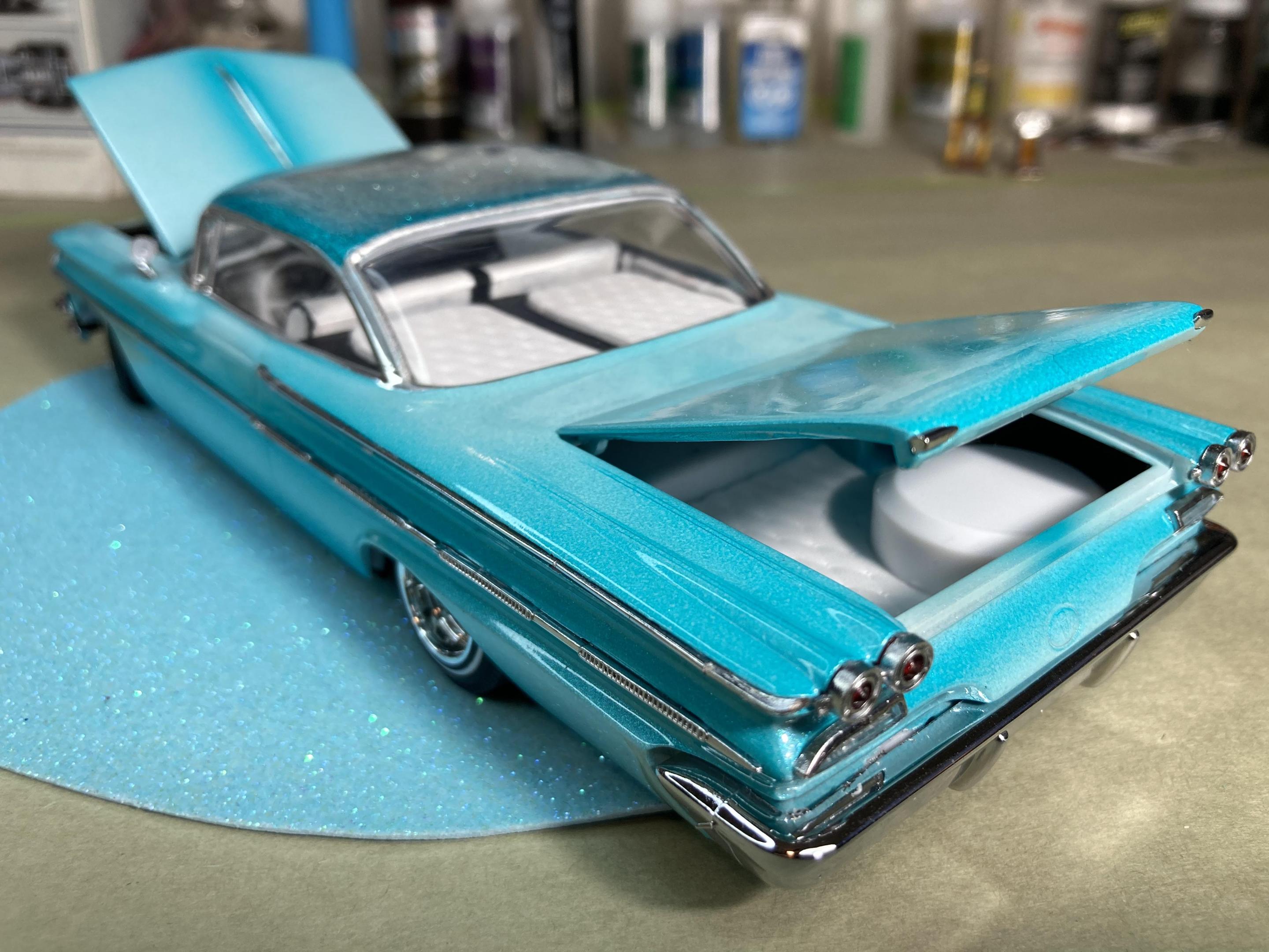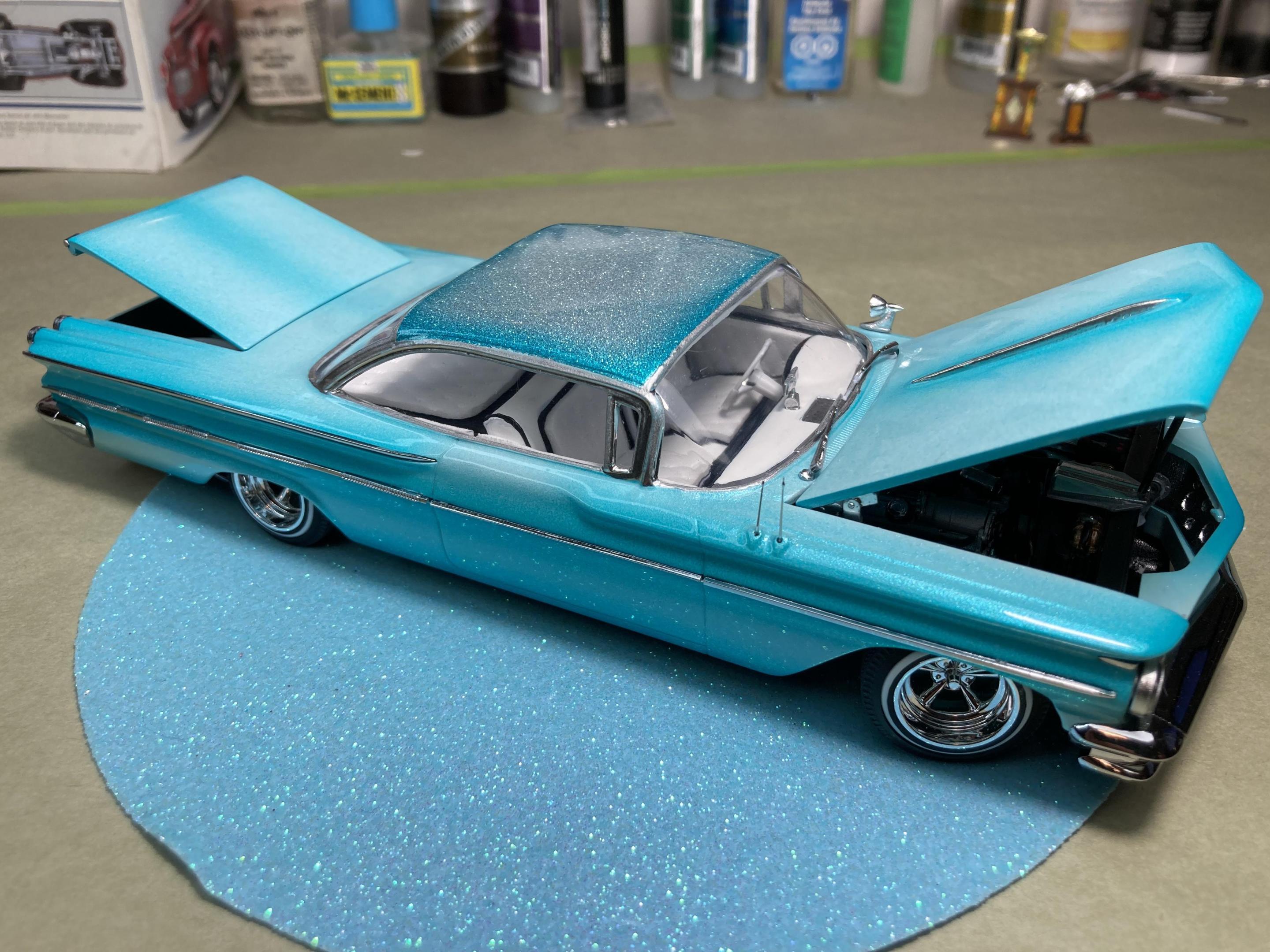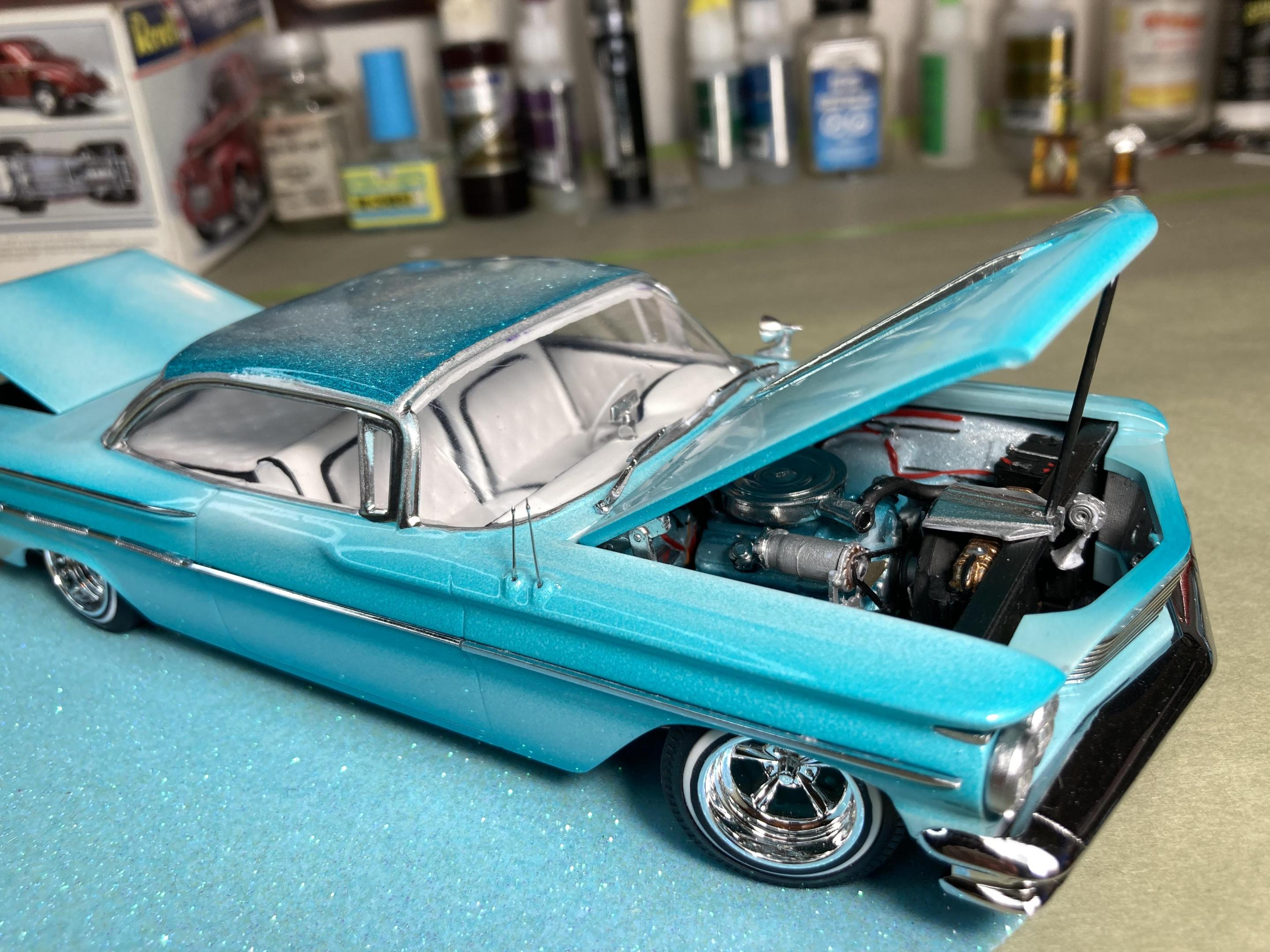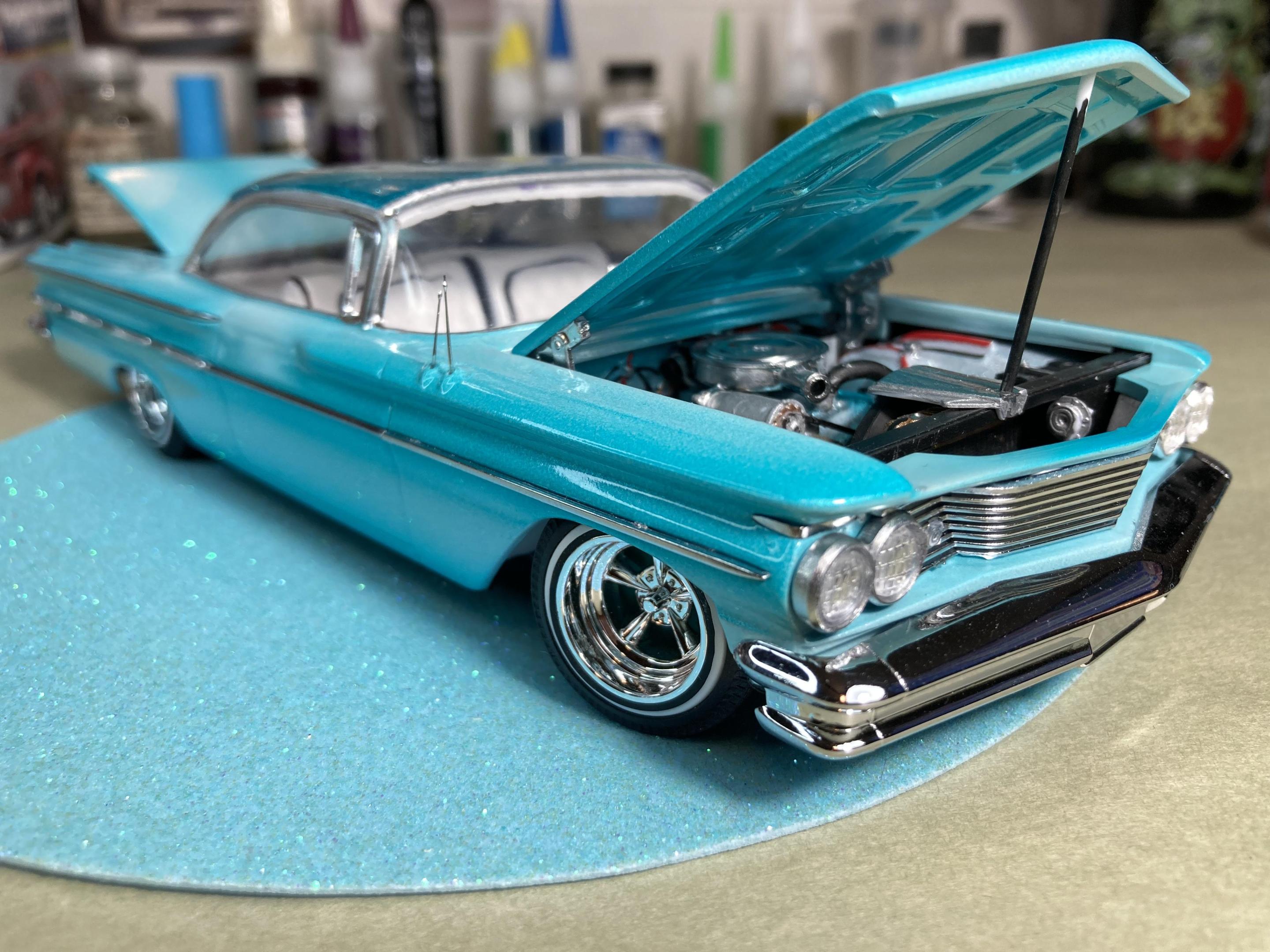 9. Hi guys, I haven’t posted anything for a while so I grabbed a kit off the shelf and put her together, This is a Thumpeter 1960 Bonneville, A first for me to build a Thumpeter Kit , It went together pretty well , I bought this as a not complete kit, missing its interior door cards and the rear seat , not a big problem, I made new doors cards with a white diamond tuck pattern and made a complete rear seat cover , the rest of the build went pretty smooth, shaved doors, French antennas, lowered and riding on a set of Pegasus Astro Supremes plus a pearl white base color with a candy teal fade and silver metal flake top give it a cool 1960’s vibe . All in all it’s a good kit and builds into a pretty decent look model, thanks for looking !