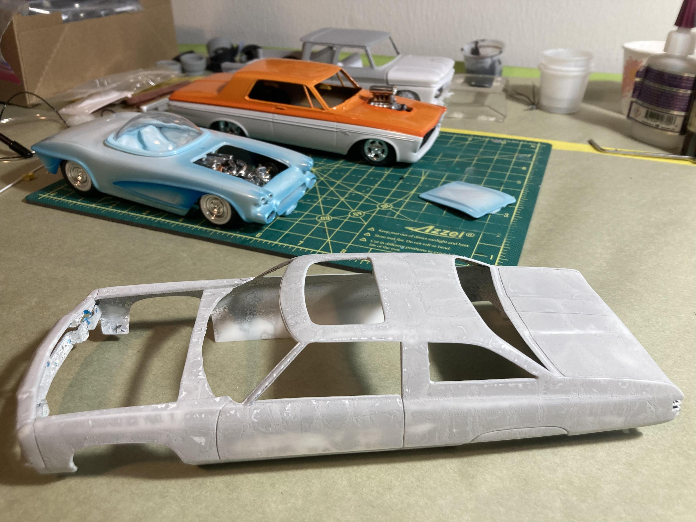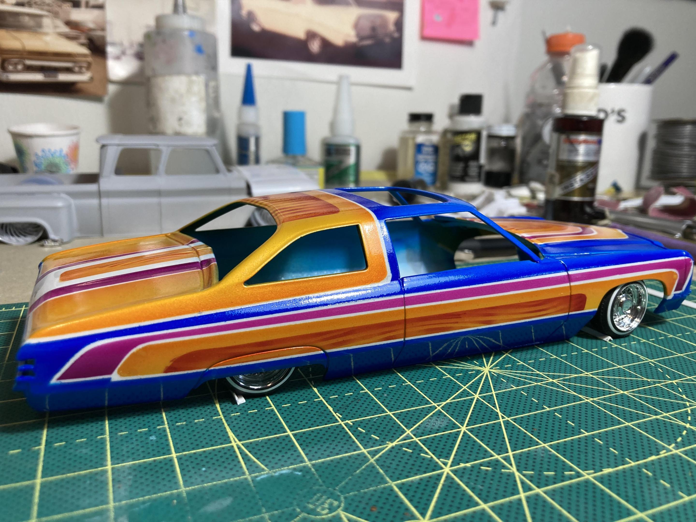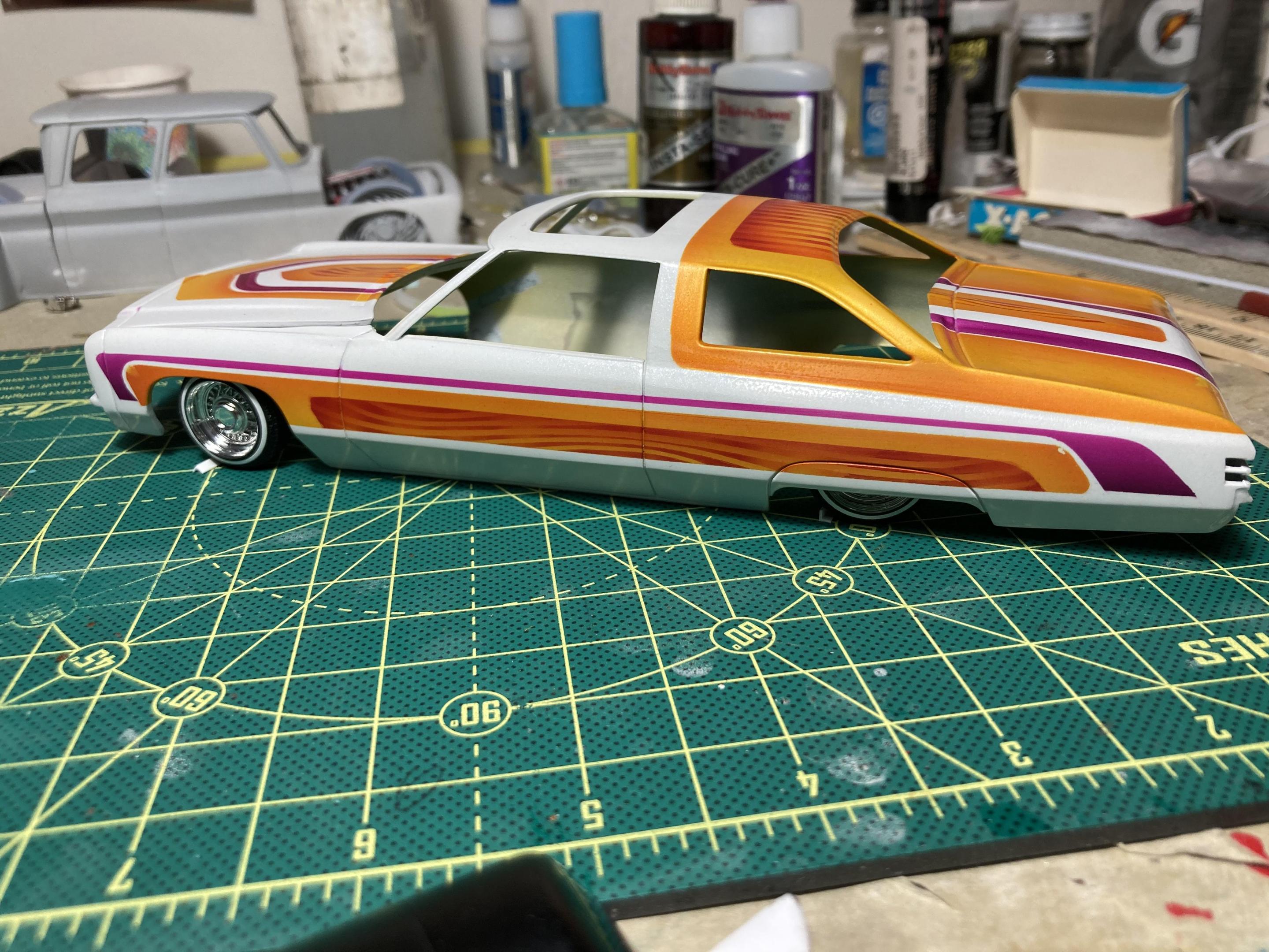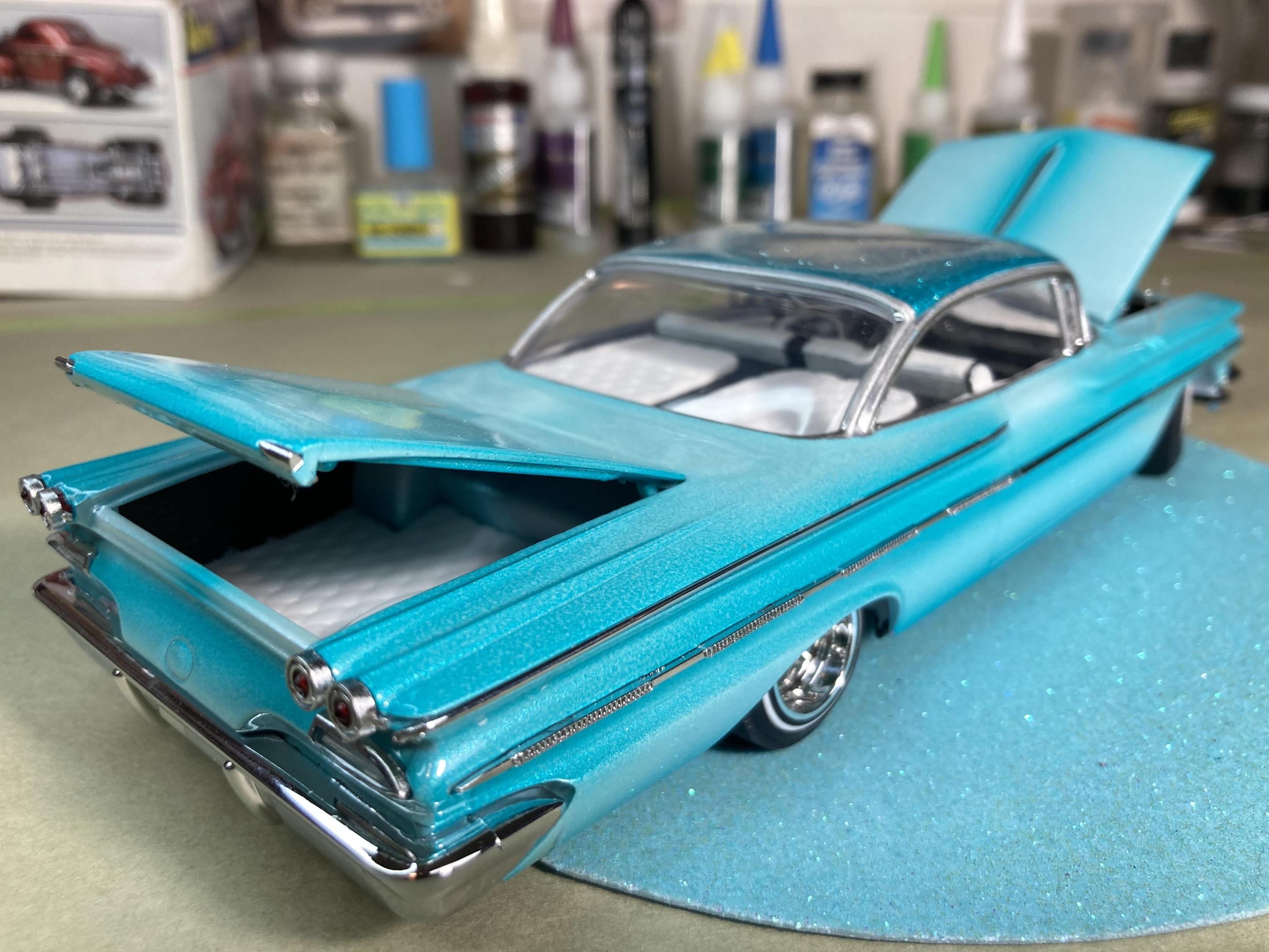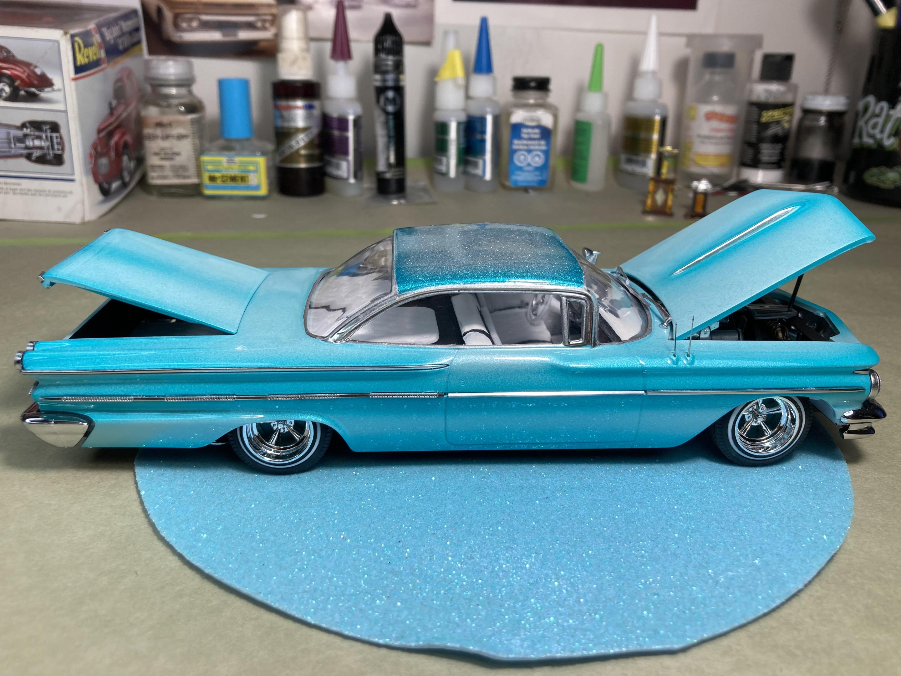 9. Hi guys, I haven’t posted anything for a while so I grabbed a kit off the shelf and put her together, This is a Thumpeter 1960 Bonneville, A first for me to build a Thumpeter Kit , It went together pretty well , I bought this as a not complete kit, missing its interior door cards and the rear seat , not a big problem, I made new doors cards with a white diamond tuck pattern and made a complete rear seat cover , the rest of the build went pretty smooth, shaved doors, French antennas, lowered and riding on a set of Pegasus Astro Supremes plus a pearl white base color with a candy teal fade and silver metal flake top give it a cool 1960’s vibe . All in all it’s a good kit and builds into a pretty decent look model, thanks for looking !
