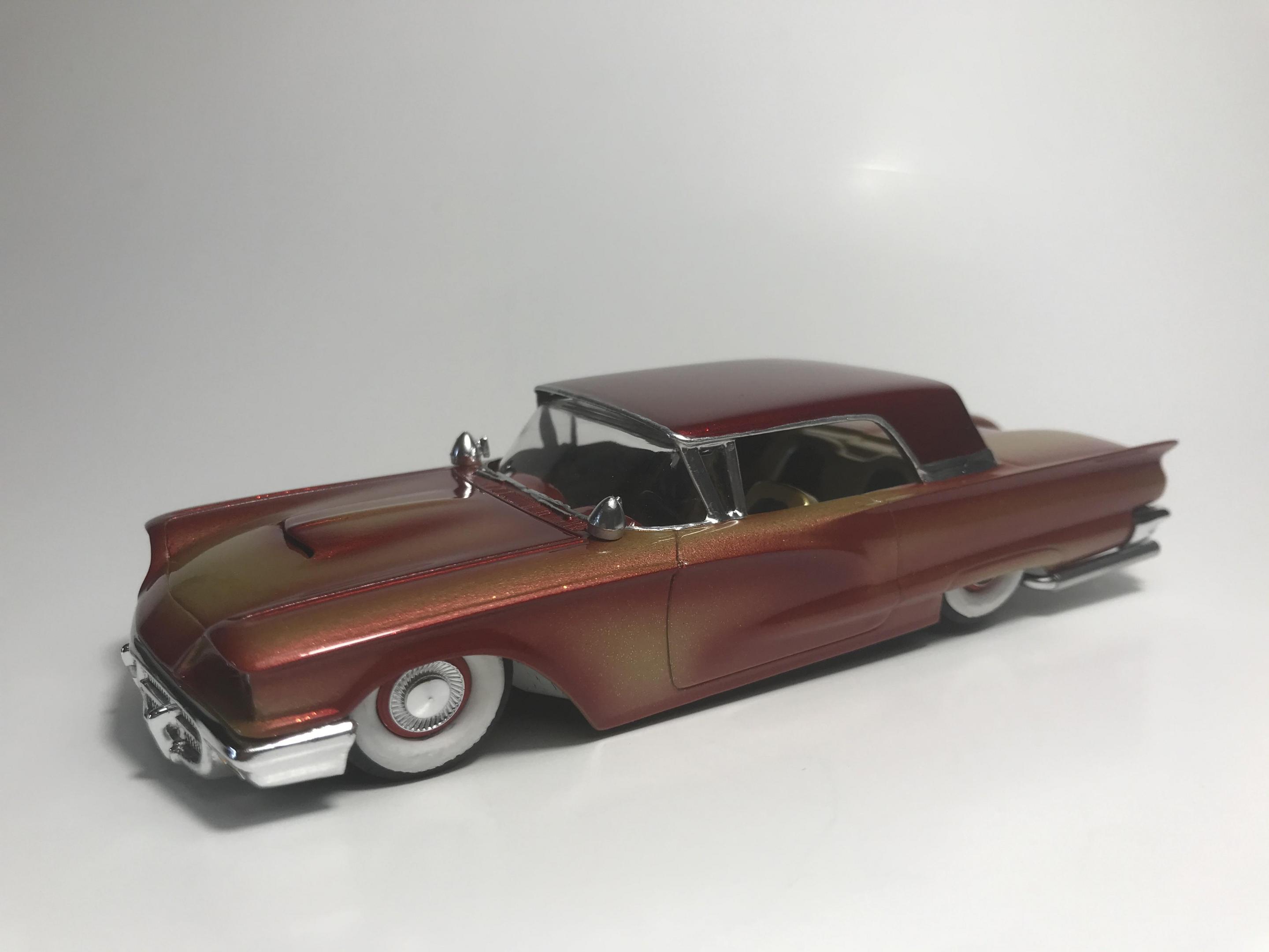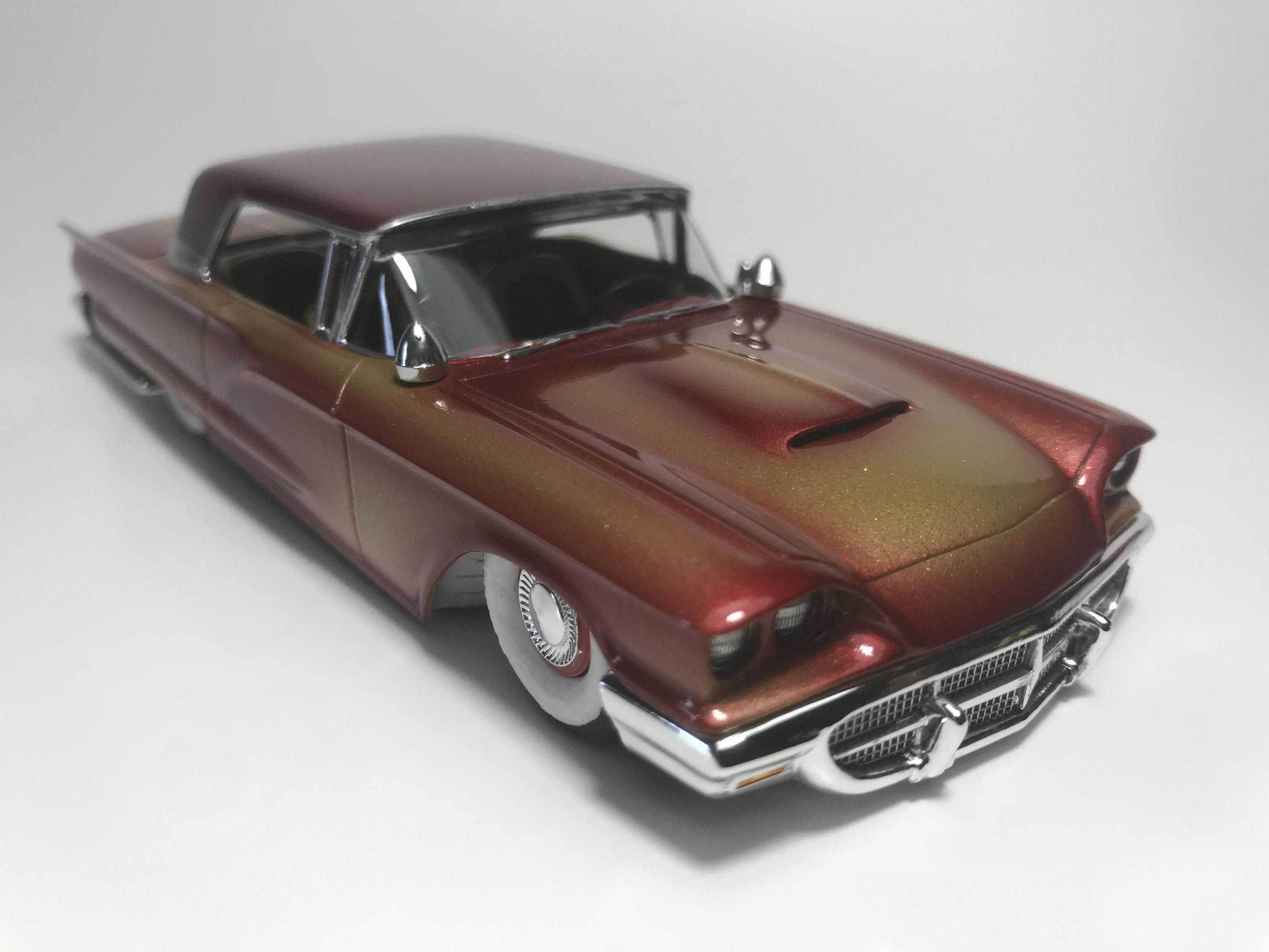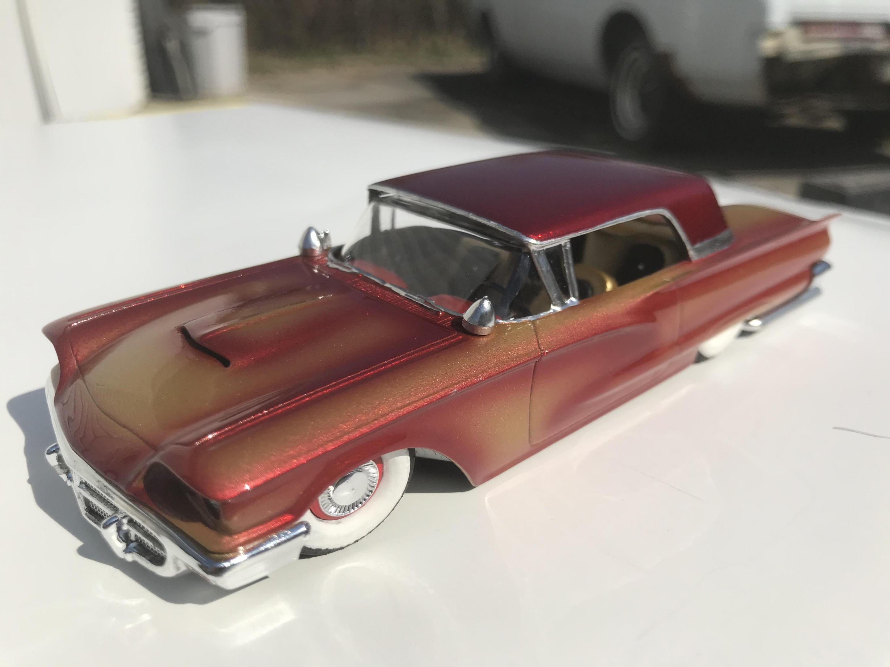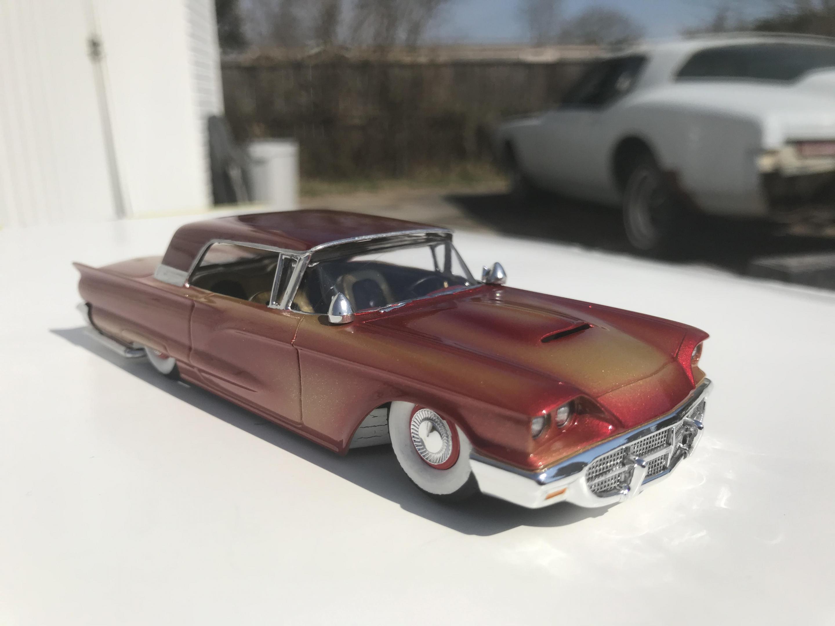 Here’s a first for me , amt thunderbird 1/32 scale!! I’ve never built anything 1/32 scale before but since I was building a monogram 58 thunderbird this 60 caught my eye and the hobby shop, it cost 17 bucks so I thought why not ! Had to be a Watson style custom from early ‘60s for me , molded body lines, lowered, pair of Bellflower pipes, Appleton spot lights and metal flake gold base and candy brandy wine top and fogging, hope you like !!