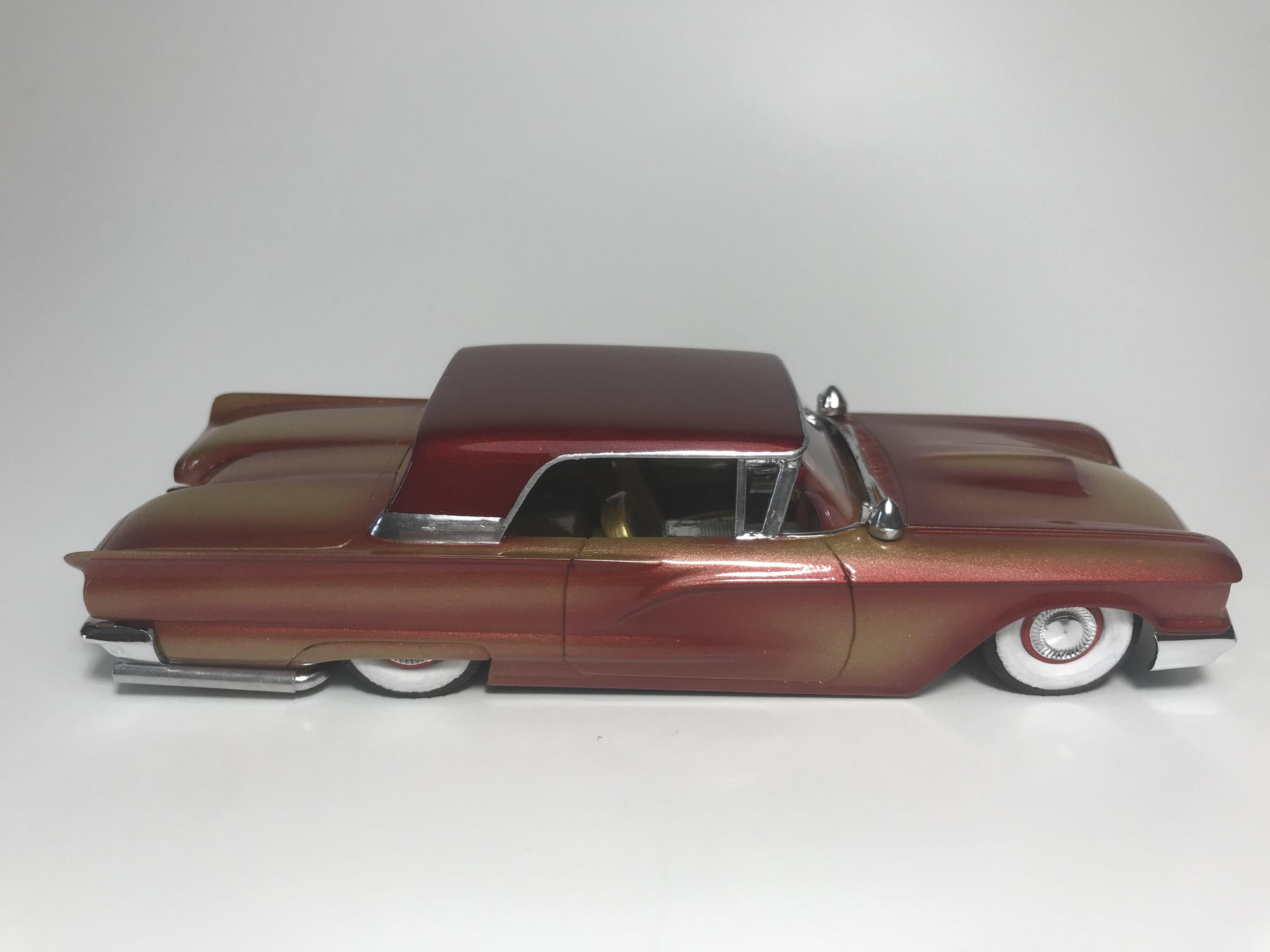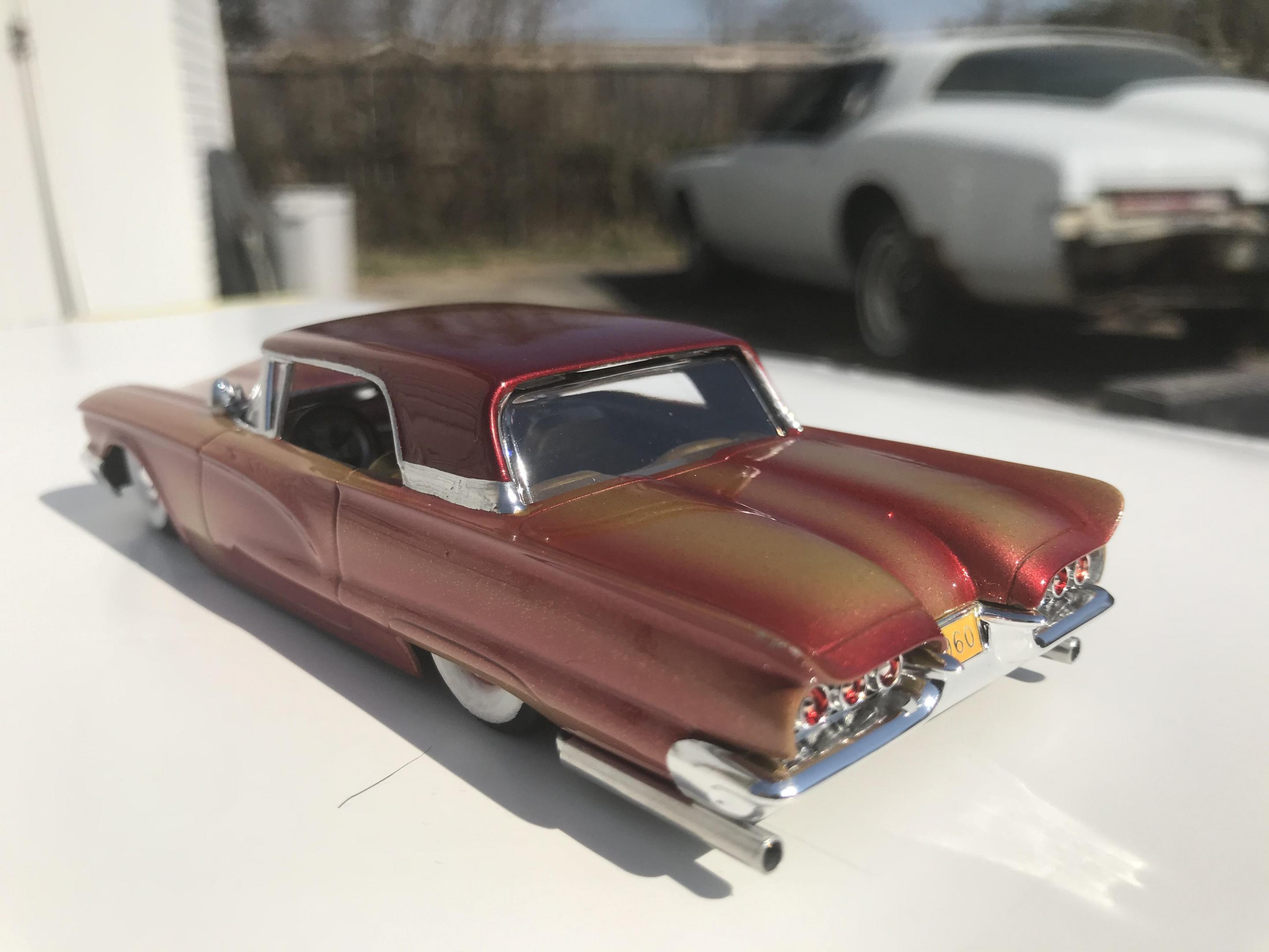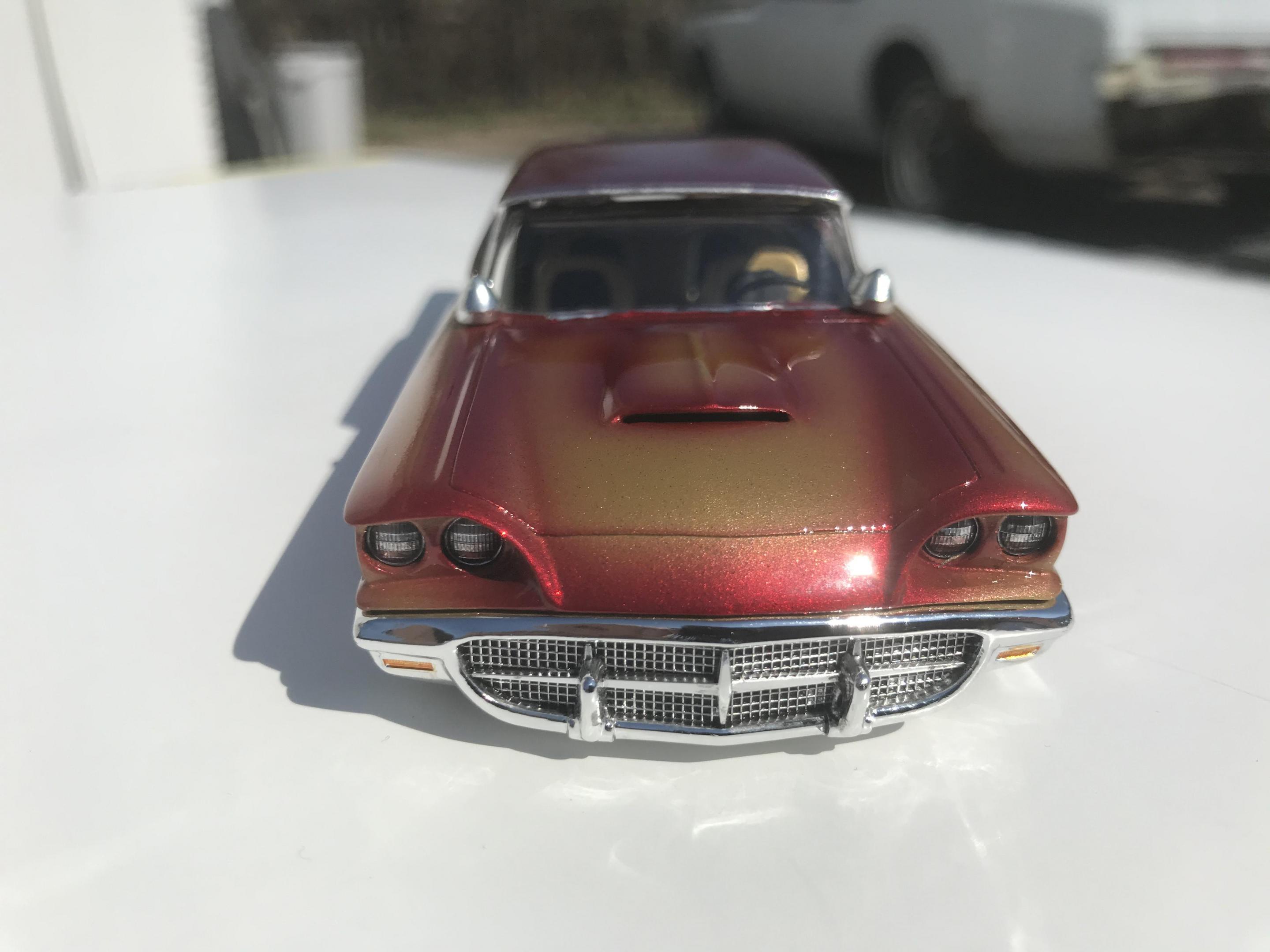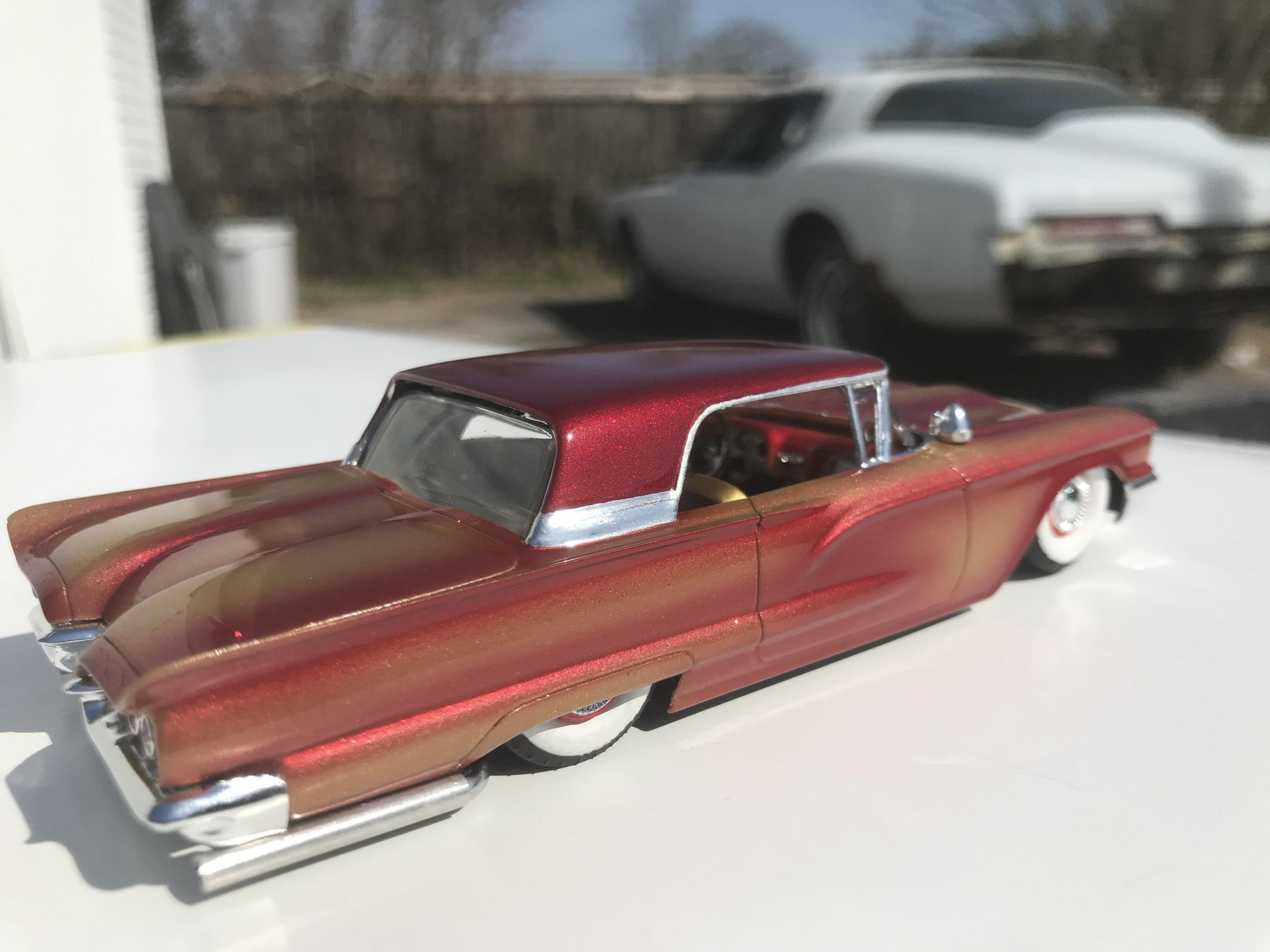 Here’s a first for me , amt thunderbird 1/32 scale!! I’ve never built anything 1/32 scale before but since I was building a monogram 58 thunderbird this 60 caught my eye and the hobby shop, it cost 17 bucks so I thought why not ! Had to be a Watson style custom from early ‘60s for me , molded body lines, lowered, pair of Bellflower pipes, Appleton spot lights and metal flake gold base and candy brandy wine top and fogging, hope you like !!