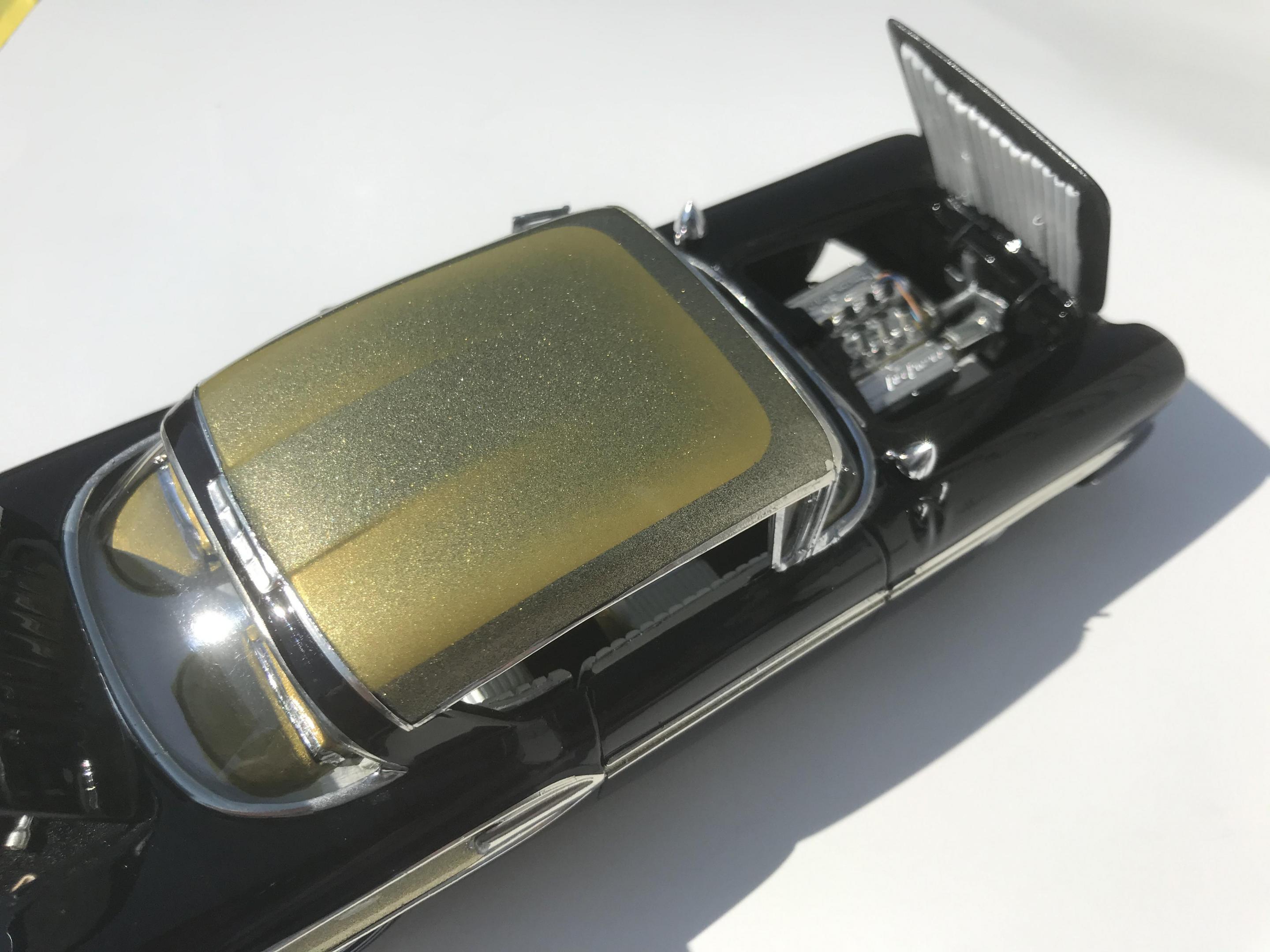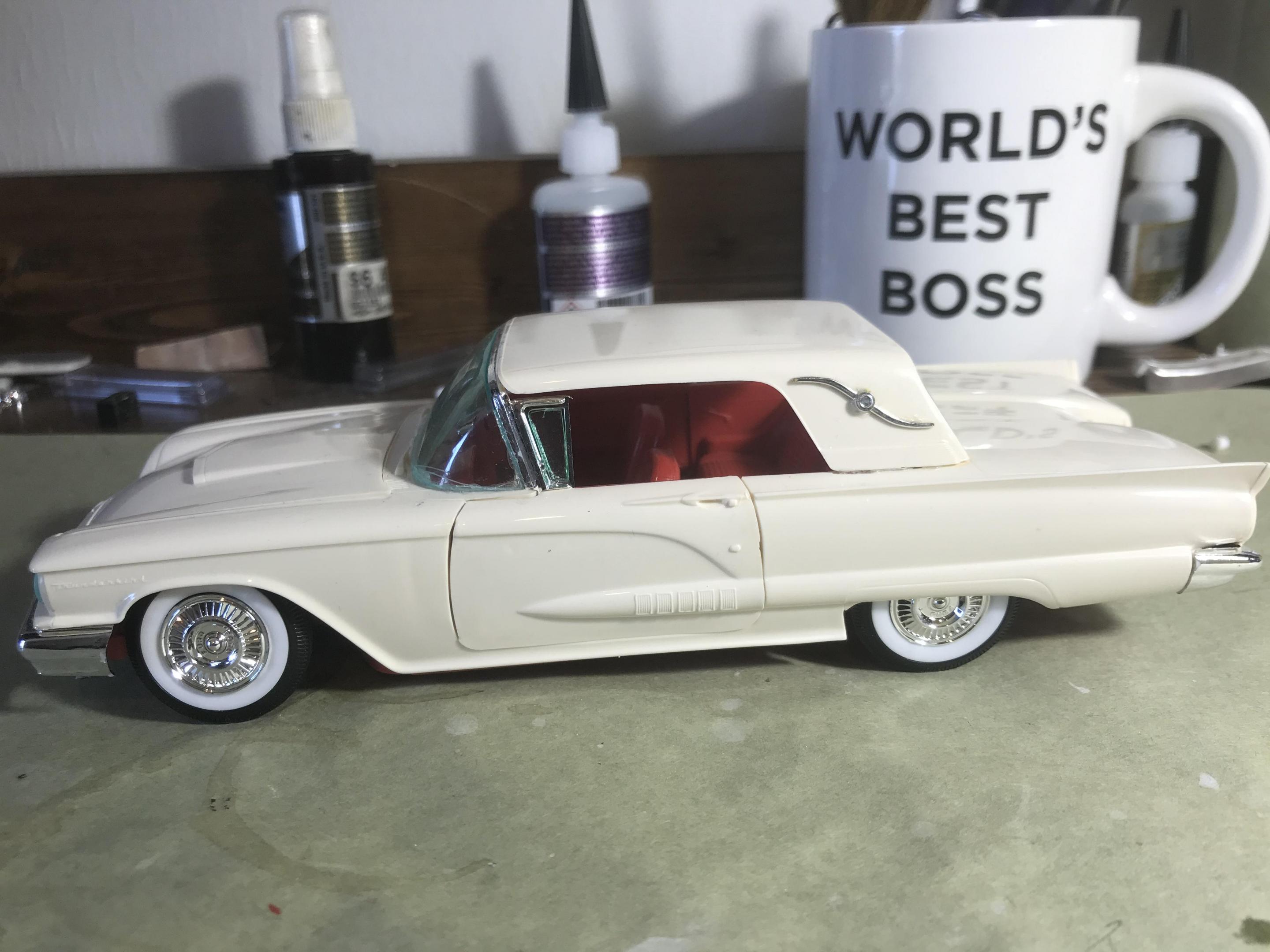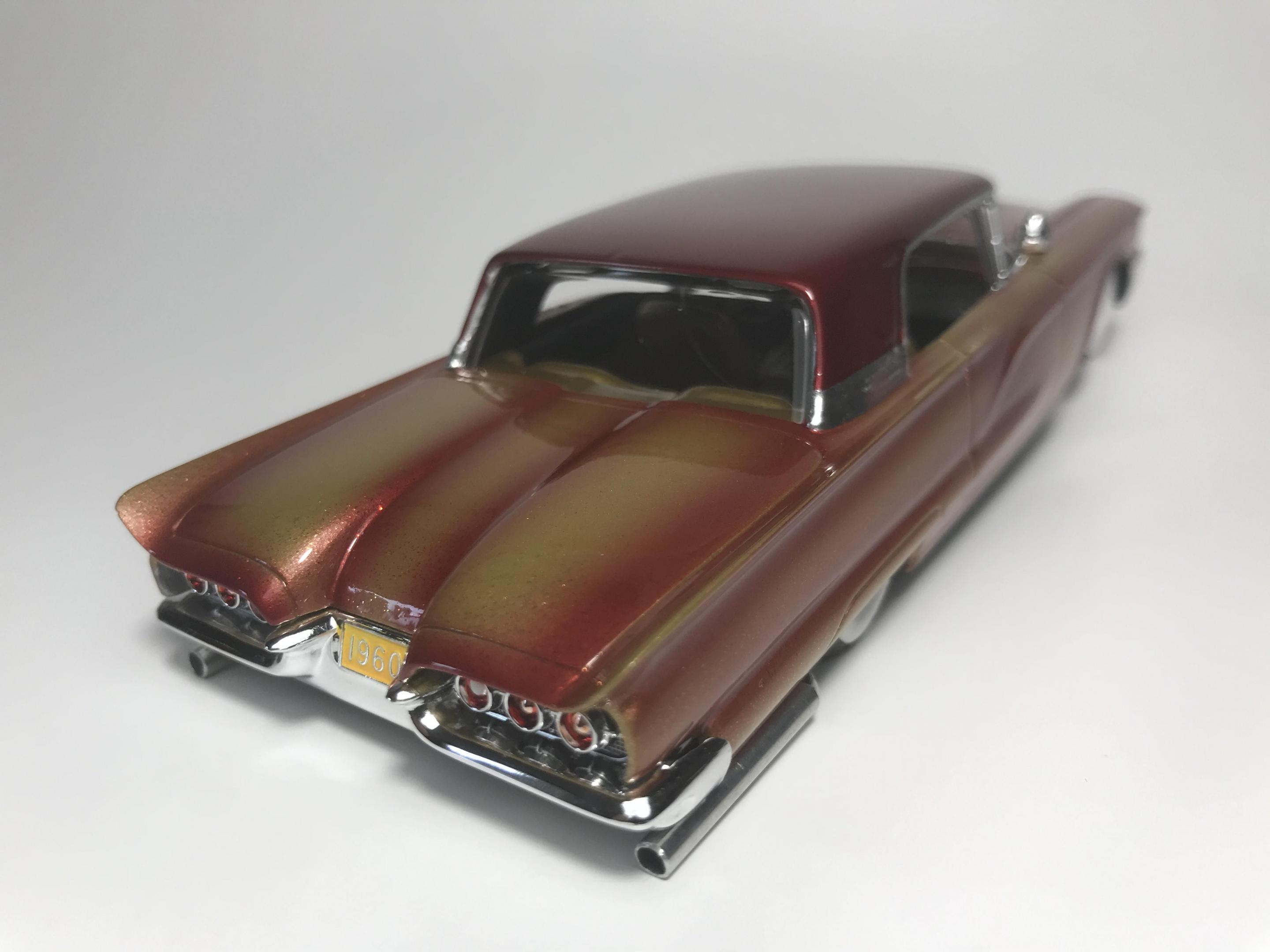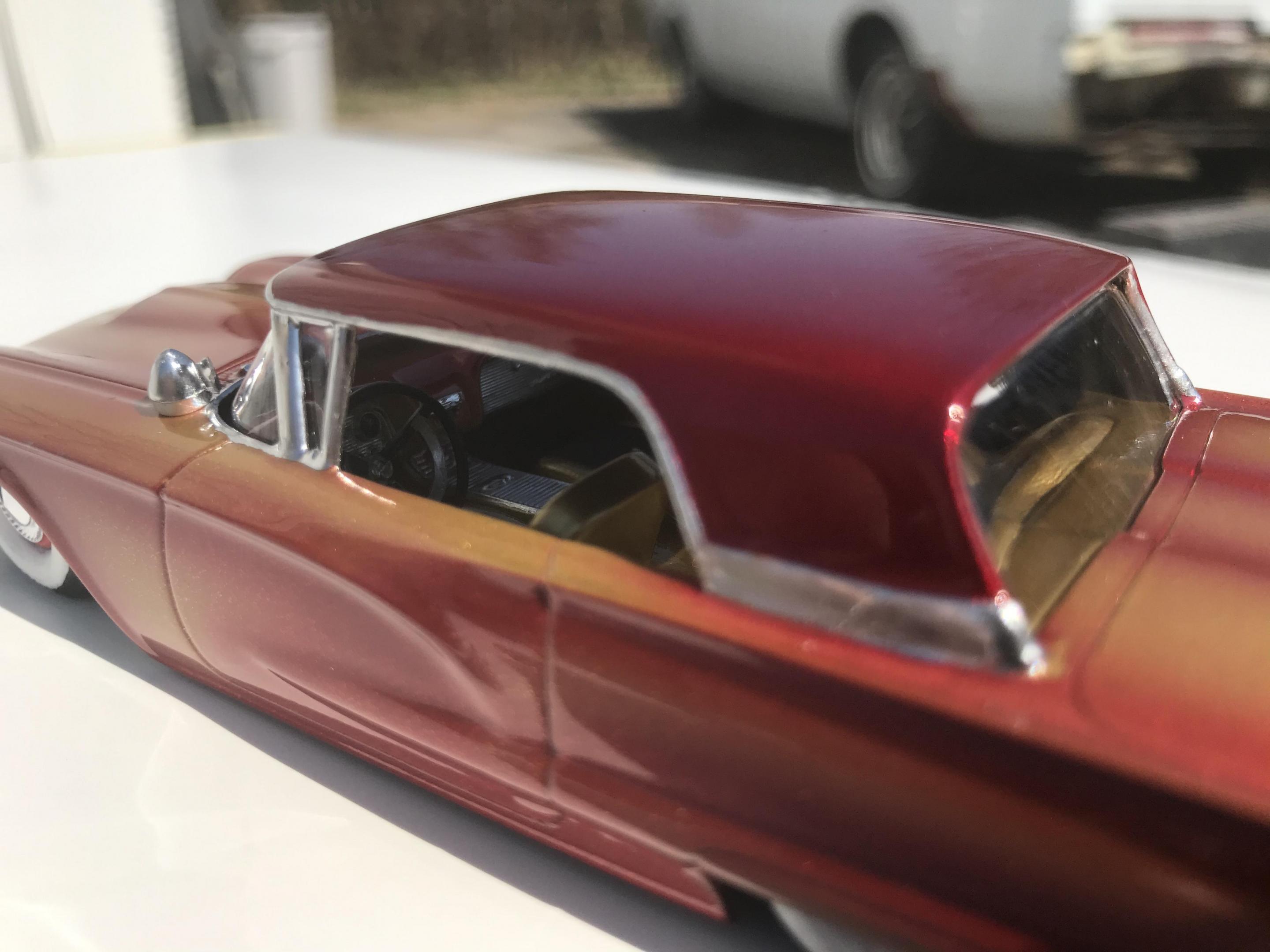 Here’s a first for me , amt thunderbird 1/32 scale!! I’ve never built anything 1/32 scale before but since I was building a monogram 58 thunderbird this 60 caught my eye and the hobby shop, it cost 17 bucks so I thought why not ! Had to be a Watson style custom from early ‘60s for me , molded body lines, lowered, pair of Bellflower pipes, Appleton spot lights and metal flake gold base and candy brandy wine top and fogging, hope you like !!
