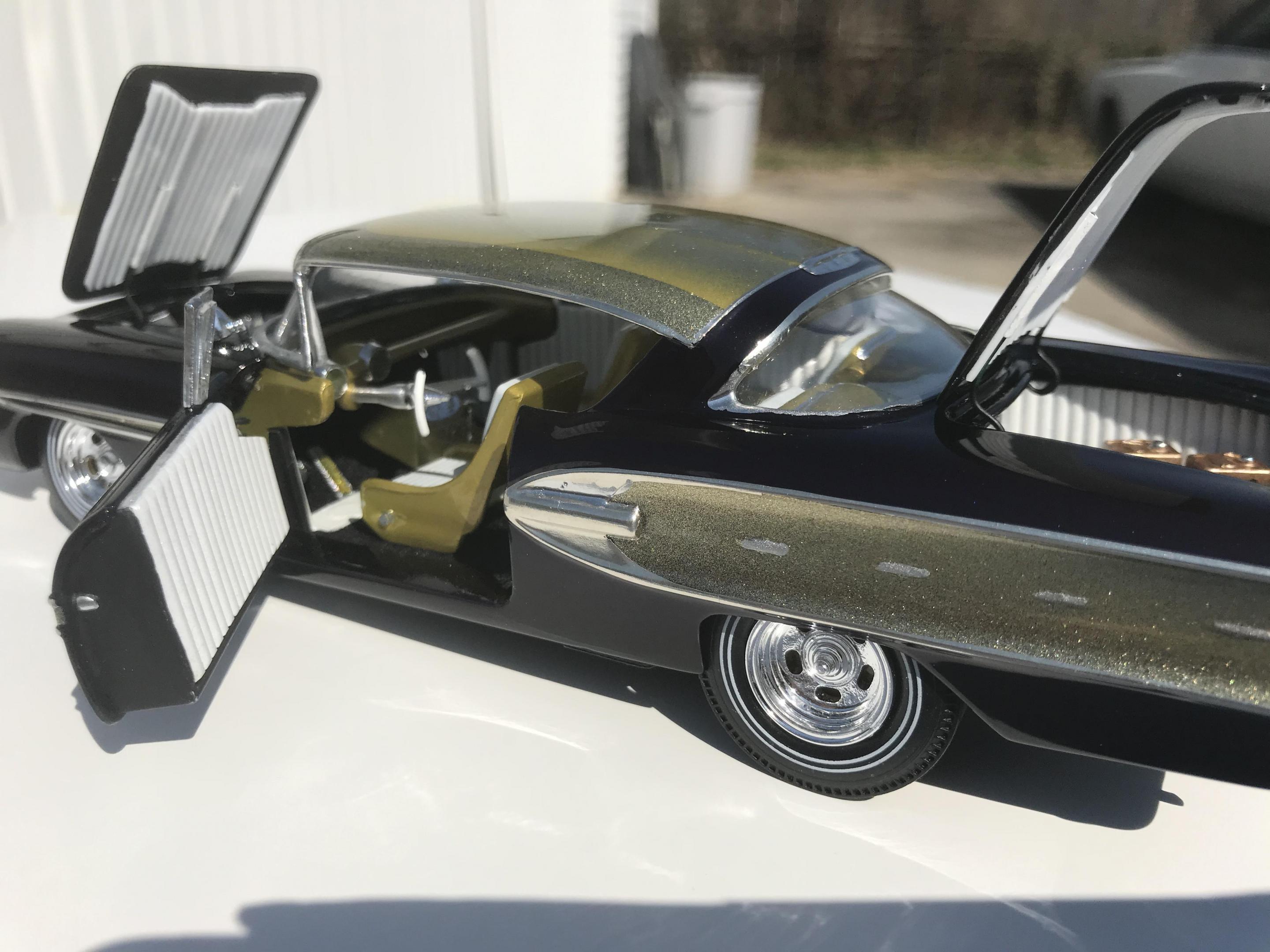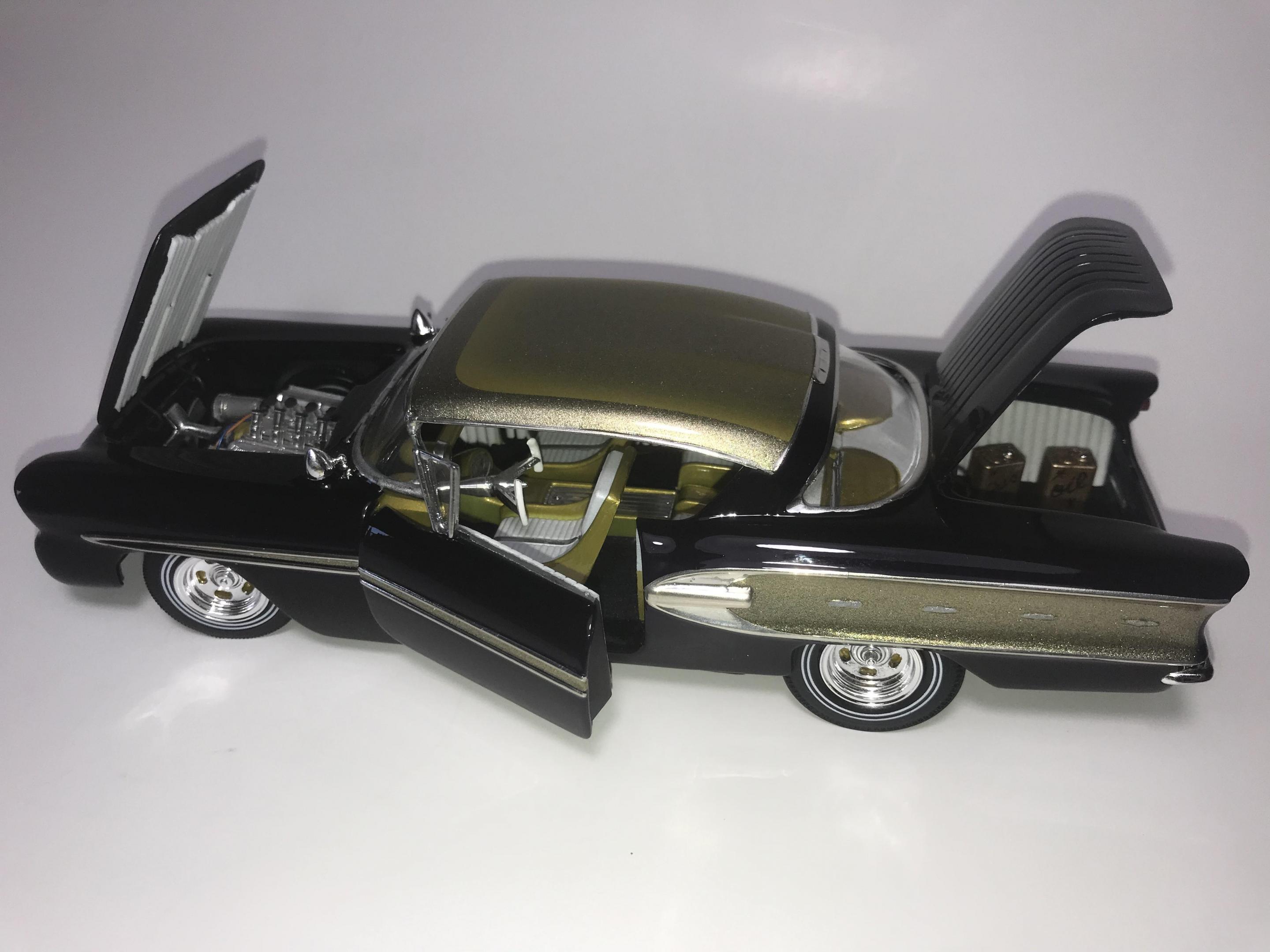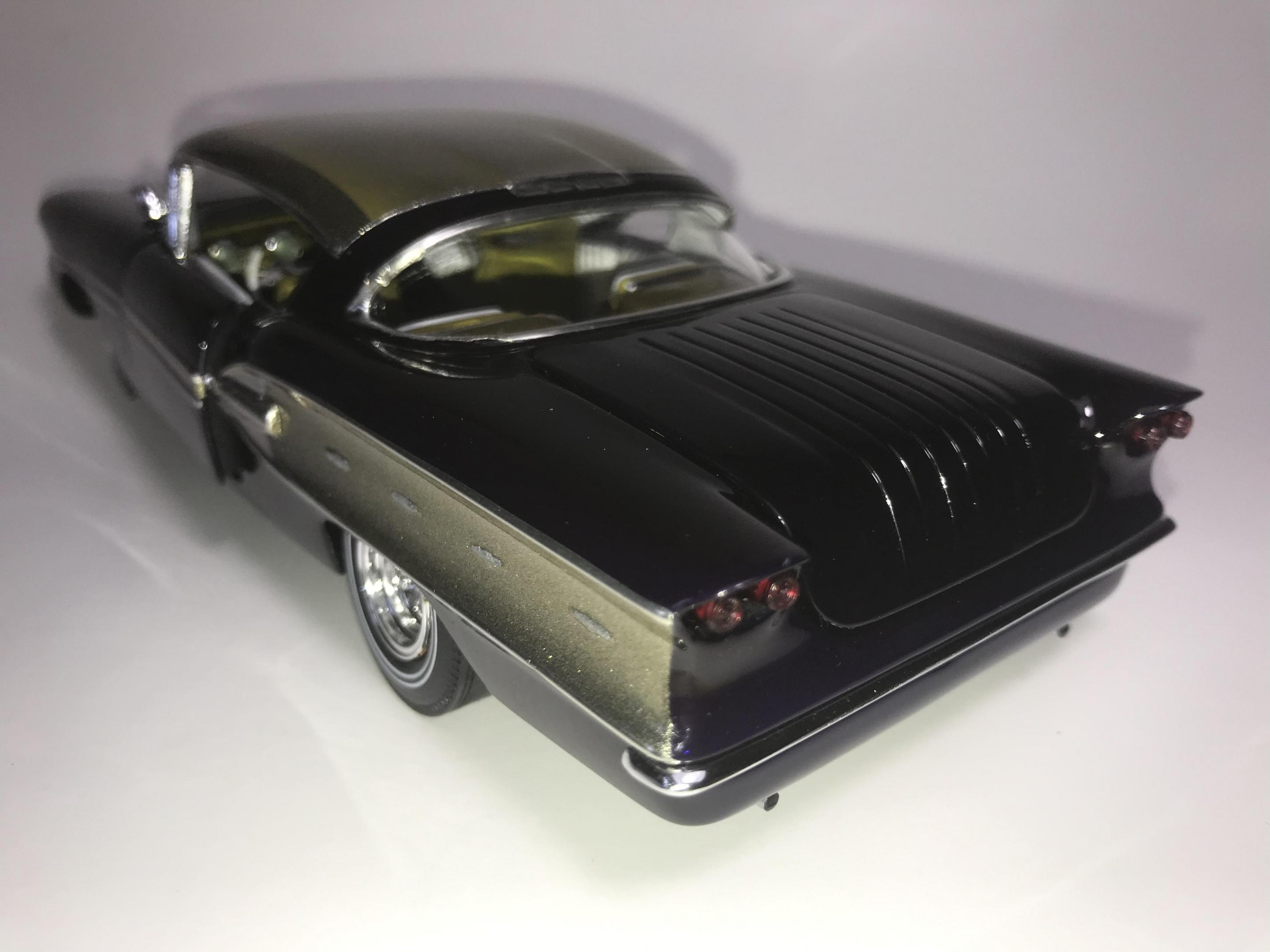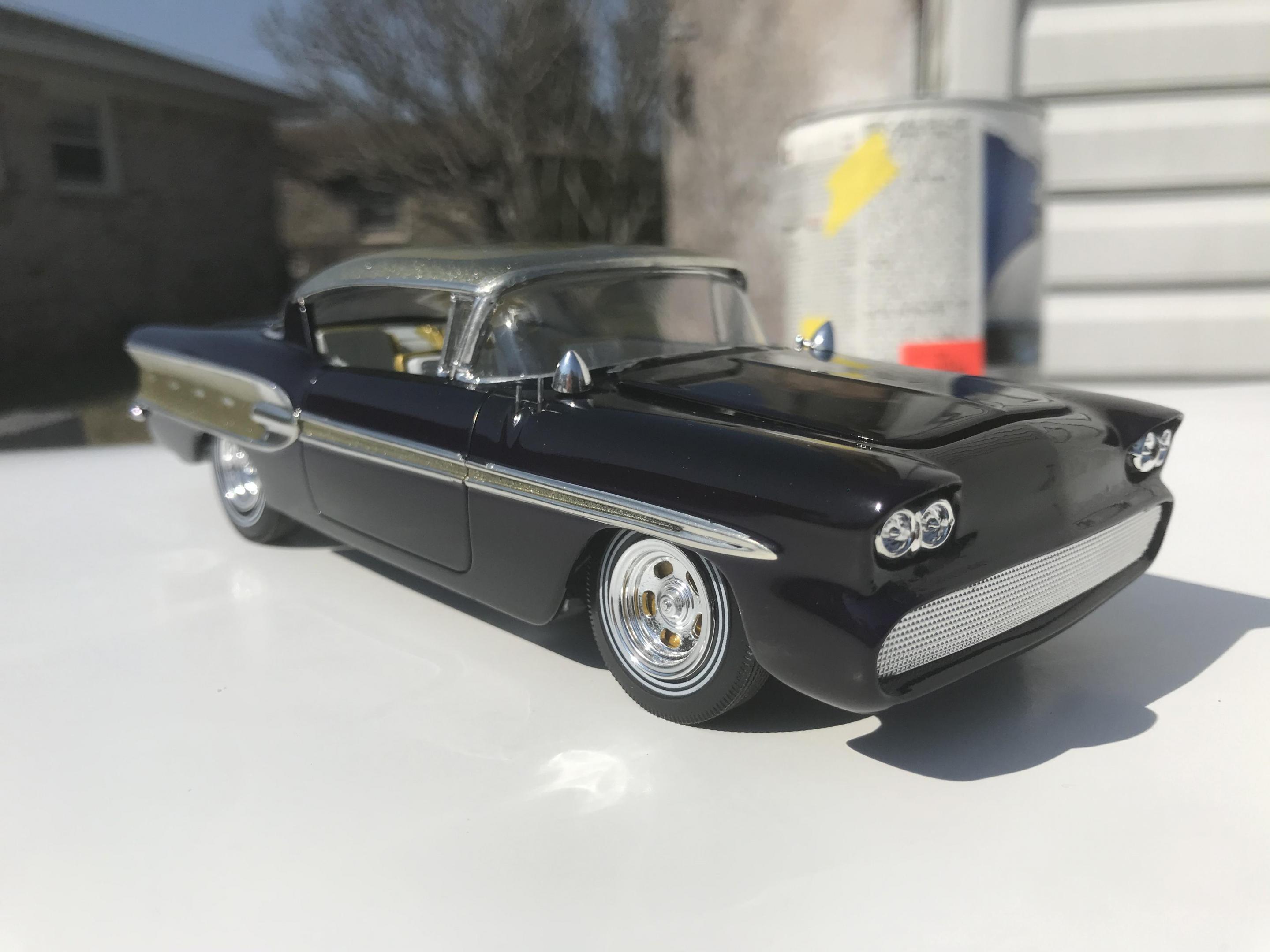 Here’s what once was a very badly busted up glue bomb, but for some reason I couldn’t just toss it in the trash, I worked on this on and off for about 7 years!! I had this picture of a early’60’s show car in my head with this model, so I started with piercing the body back together and then cutting it back apart, I pan caked the hood,then hinging the door, hood and trunk then rounding all the corners and molding all the jams, useing the custom interior, windows and chassis from the amt 58 Chevy impala made everything a lot easier on this build, tuck in roll interior, trunk and hood, motor is from a monogram predicta, wheels and tires are from the amt surf woody, custom rear bumper and front grille, topped with black and a pearl purple for the bitty and gold flake top everything topped with a 2 k clear, I’m sure I’m for getting something , I’m really glad to finally have this finished and on my shelf and out of my head !! I posted a lot of pics, may too many !!! Hope you like !! Thanks for looking!!