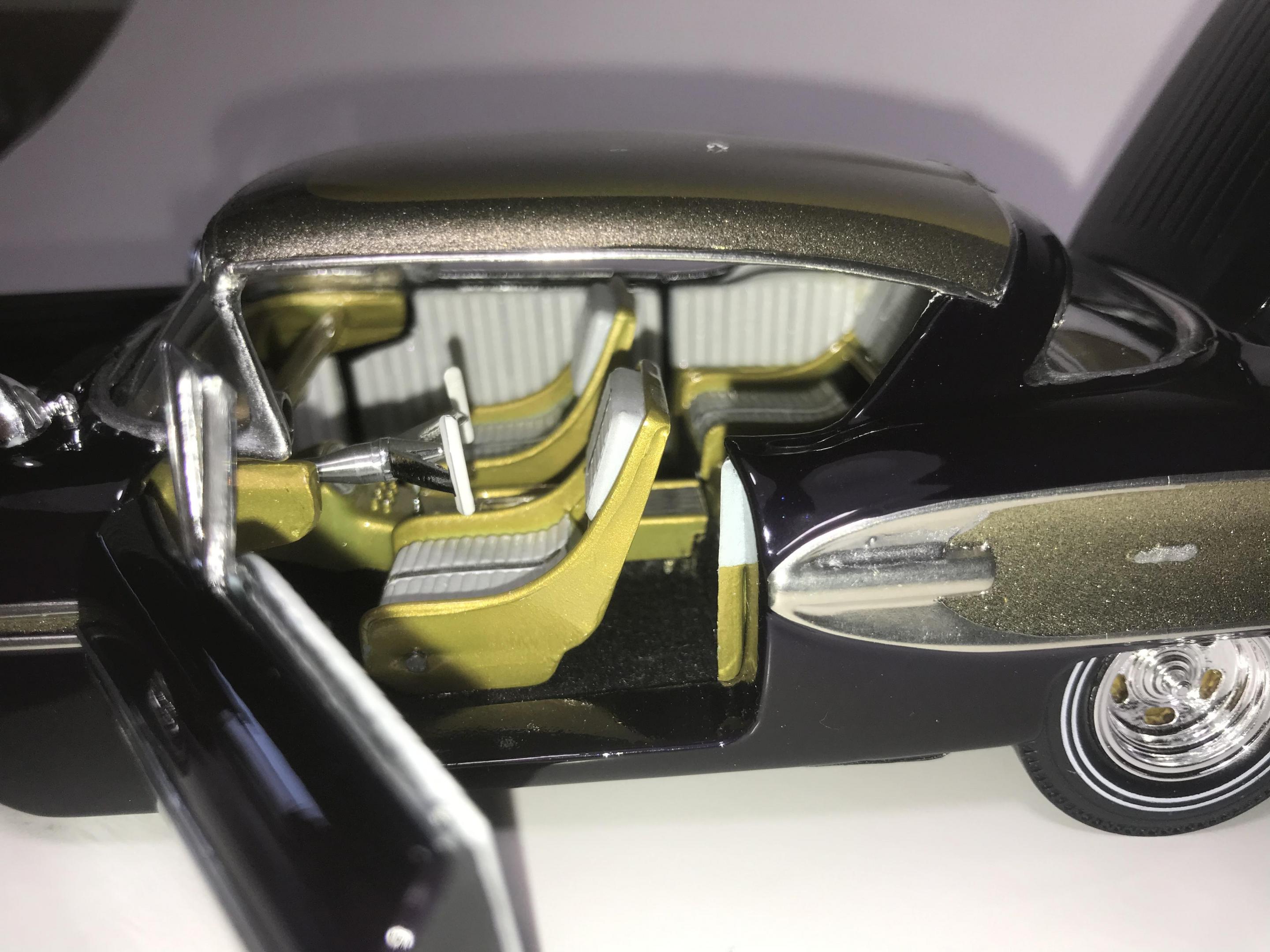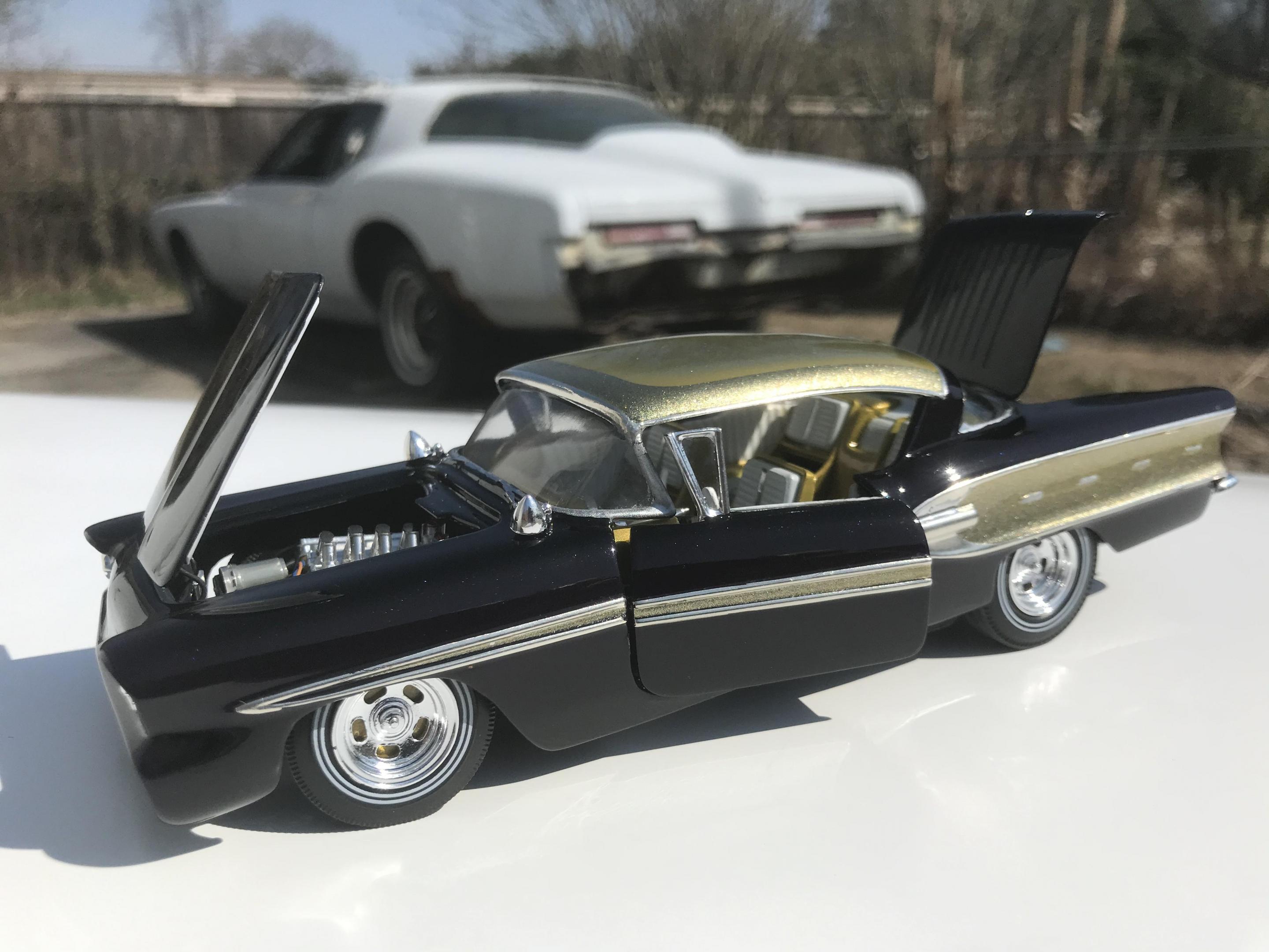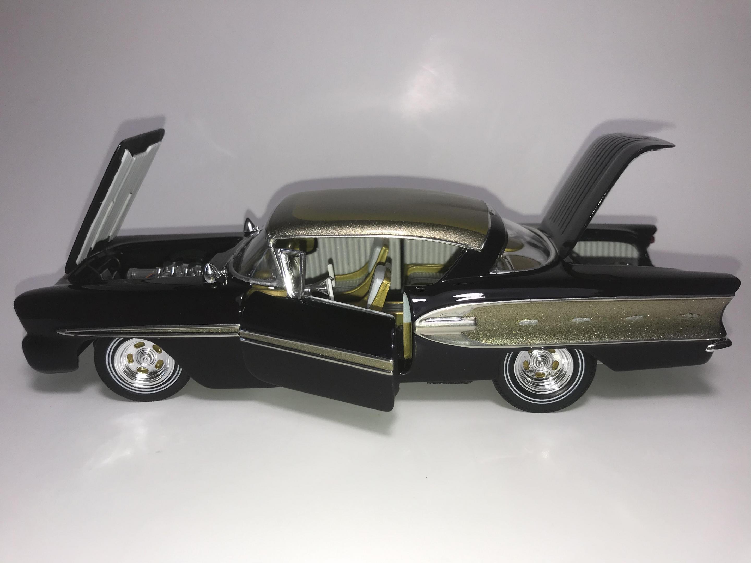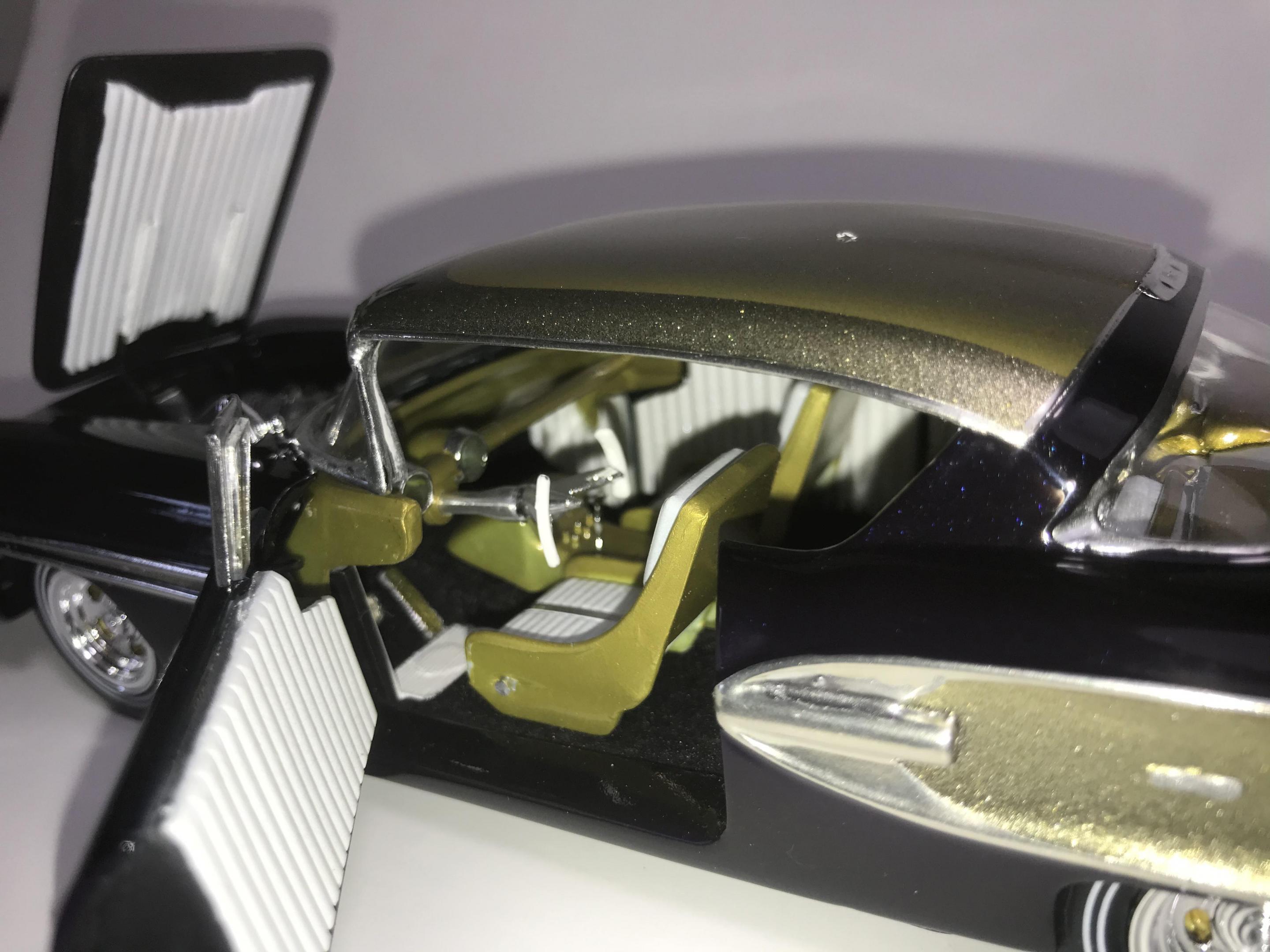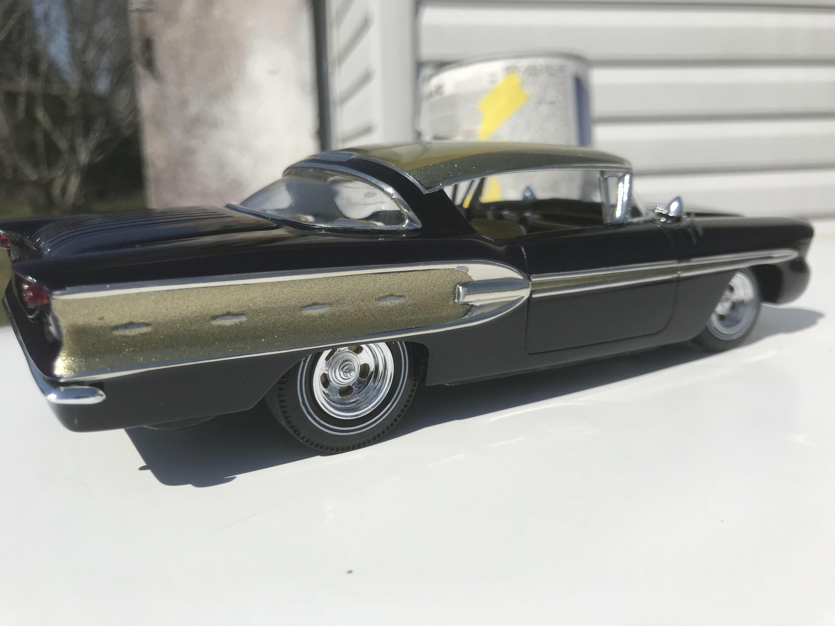 Here’s what once was a very badly busted up glue bomb, but for some reason I couldn’t just toss it in the trash, I worked on this on and off for about 7 years!! I had this picture of a early’60’s show car in my head with this model, so I started with piercing the body back together and then cutting it back apart, I pan caked the hood,then hinging the door, hood and trunk then rounding all the corners and molding all the jams, useing the custom interior, windows and chassis from the amt 58 Chevy impala made everything a lot easier on this build, tuck in roll interior, trunk and hood, motor is from a monogram predicta, wheels and tires are from the amt surf woody, custom rear bumper and front grille, topped with black and a pearl purple for the bitty and gold flake top everything topped with a 2 k clear, I’m sure I’m for getting something , I’m really glad to finally have this finished and on my shelf and out of my head !! I posted a lot of pics, may too many !!! Hope you like !! Thanks for looking!!
