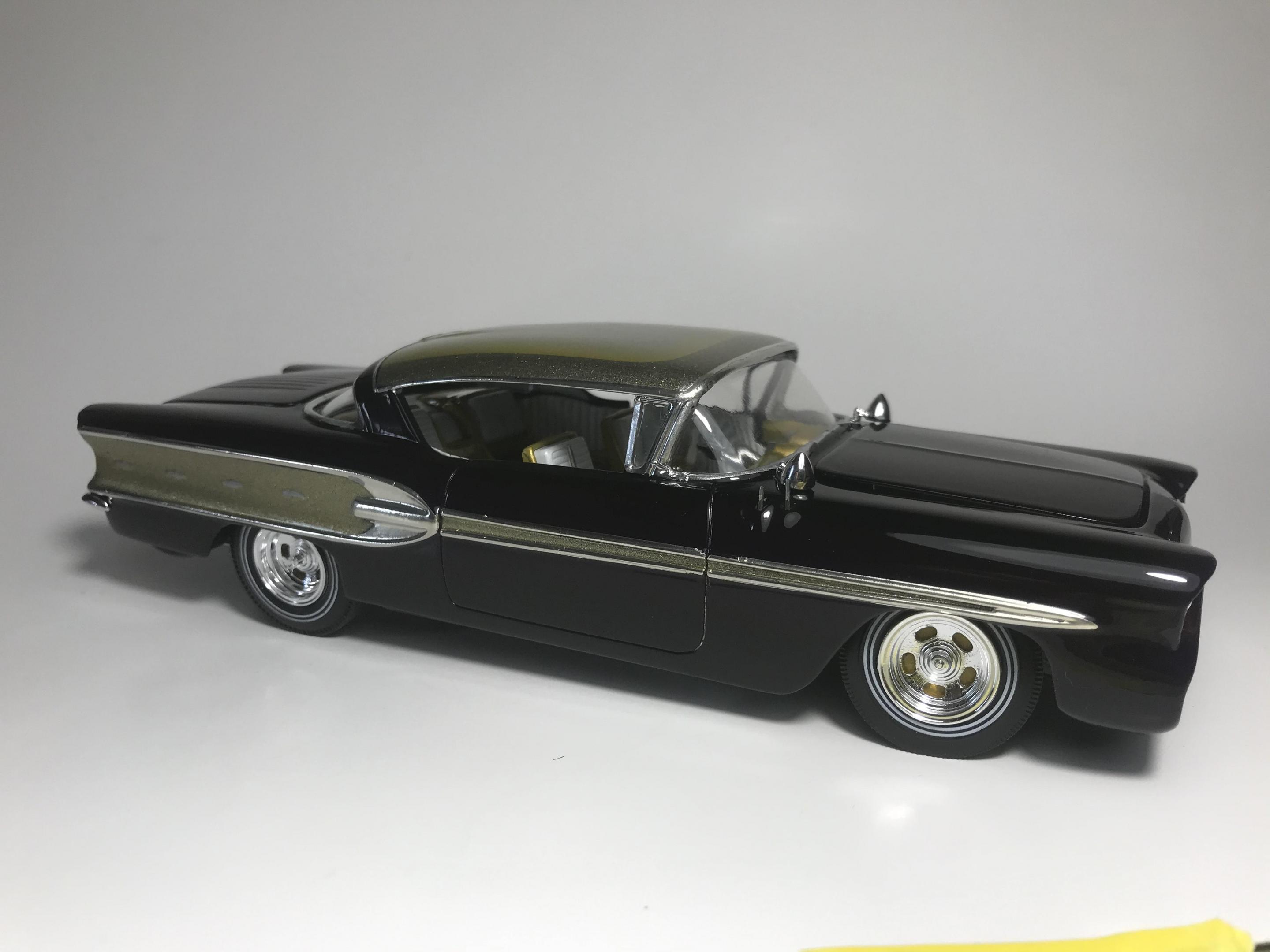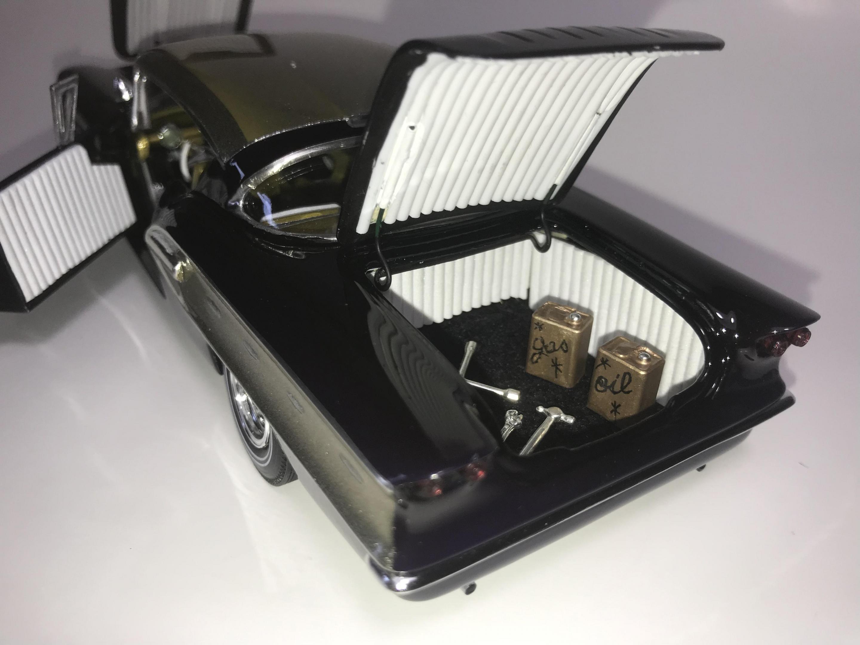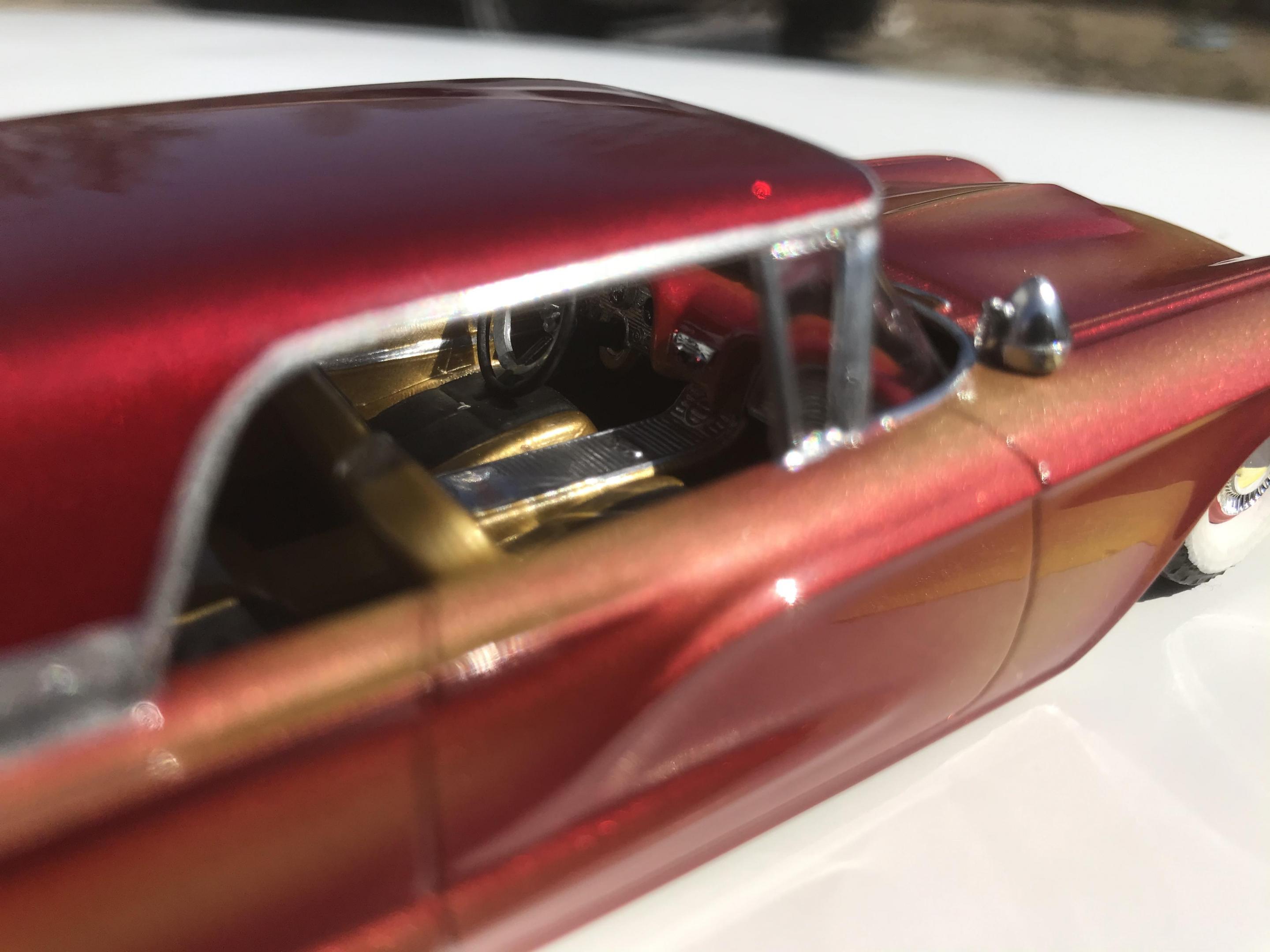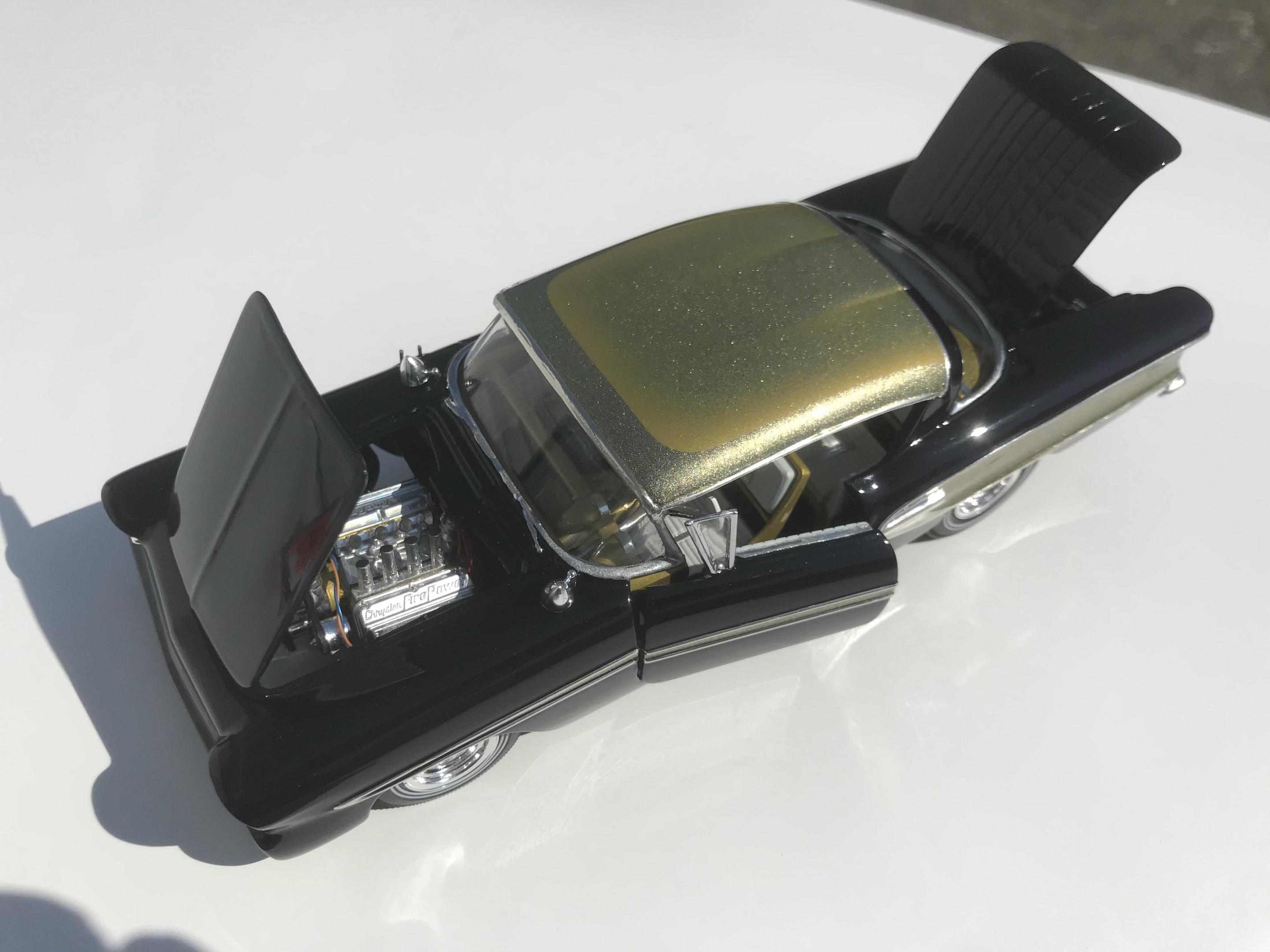 Here’s what once was a very badly busted up glue bomb, but for some reason I couldn’t just toss it in the trash, I worked on this on and off for about 7 years!! I had this picture of a early’60’s show car in my head with this model, so I started with piercing the body back together and then cutting it back apart, I pan caked the hood,then hinging the door, hood and trunk then rounding all the corners and molding all the jams, useing the custom interior, windows and chassis from the amt 58 Chevy impala made everything a lot easier on this build, tuck in roll interior, trunk and hood, motor is from a monogram predicta, wheels and tires are from the amt surf woody, custom rear bumper and front grille, topped with black and a pearl purple for the bitty and gold flake top everything topped with a 2 k clear, I’m sure I’m for getting something , I’m really glad to finally have this finished and on my shelf and out of my head !! I posted a lot of pics, may too many !!! Hope you like !! Thanks for looking!!