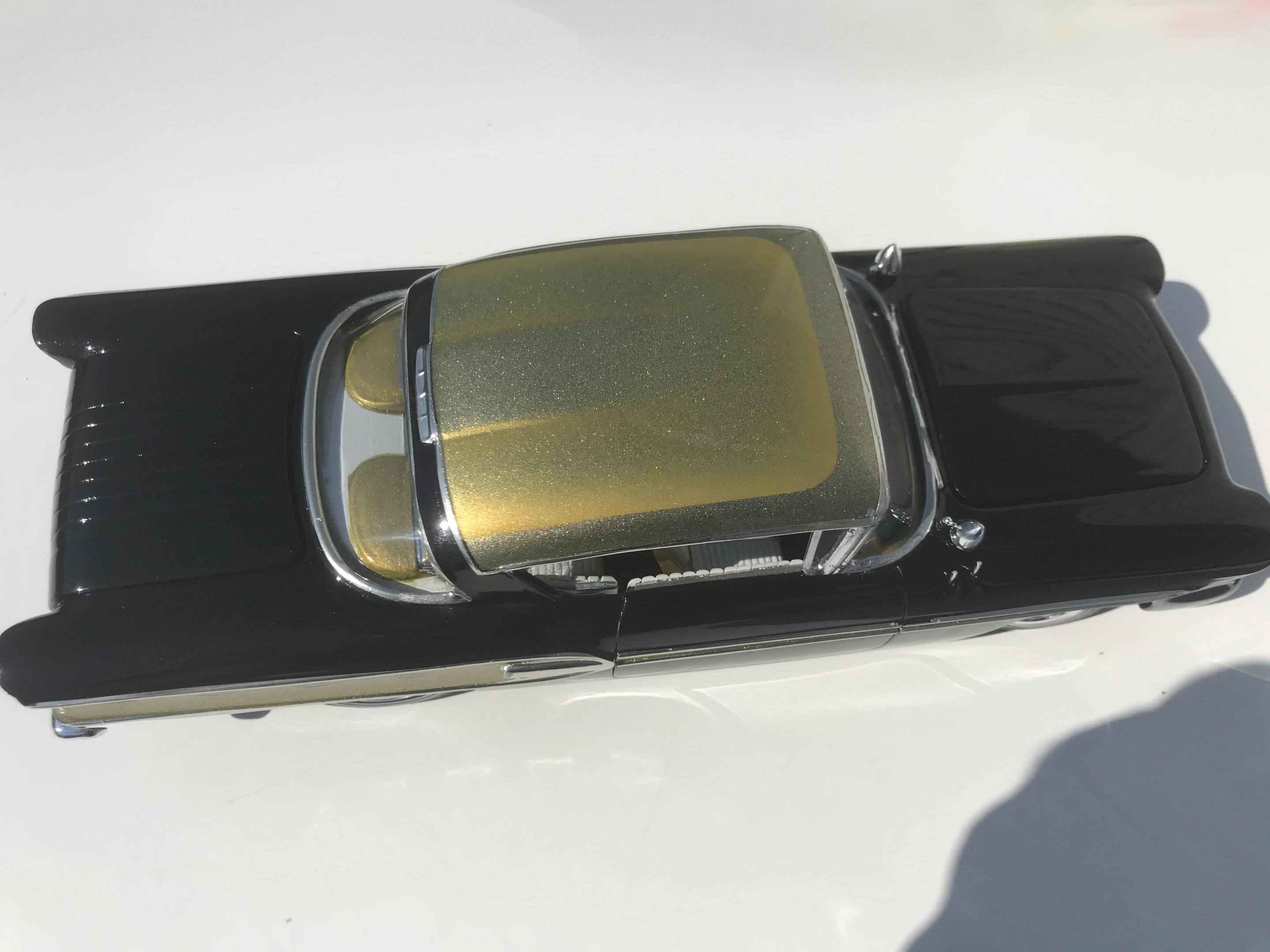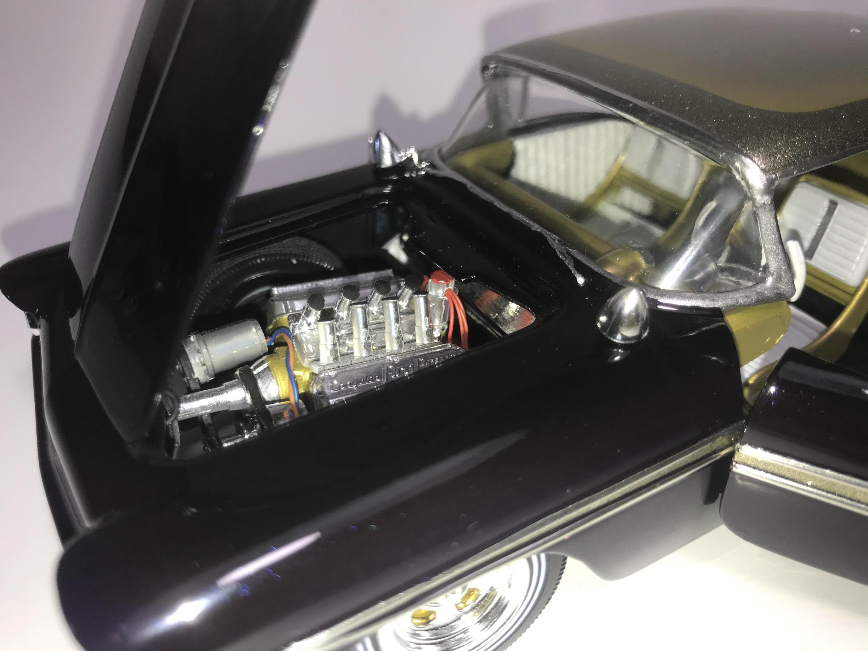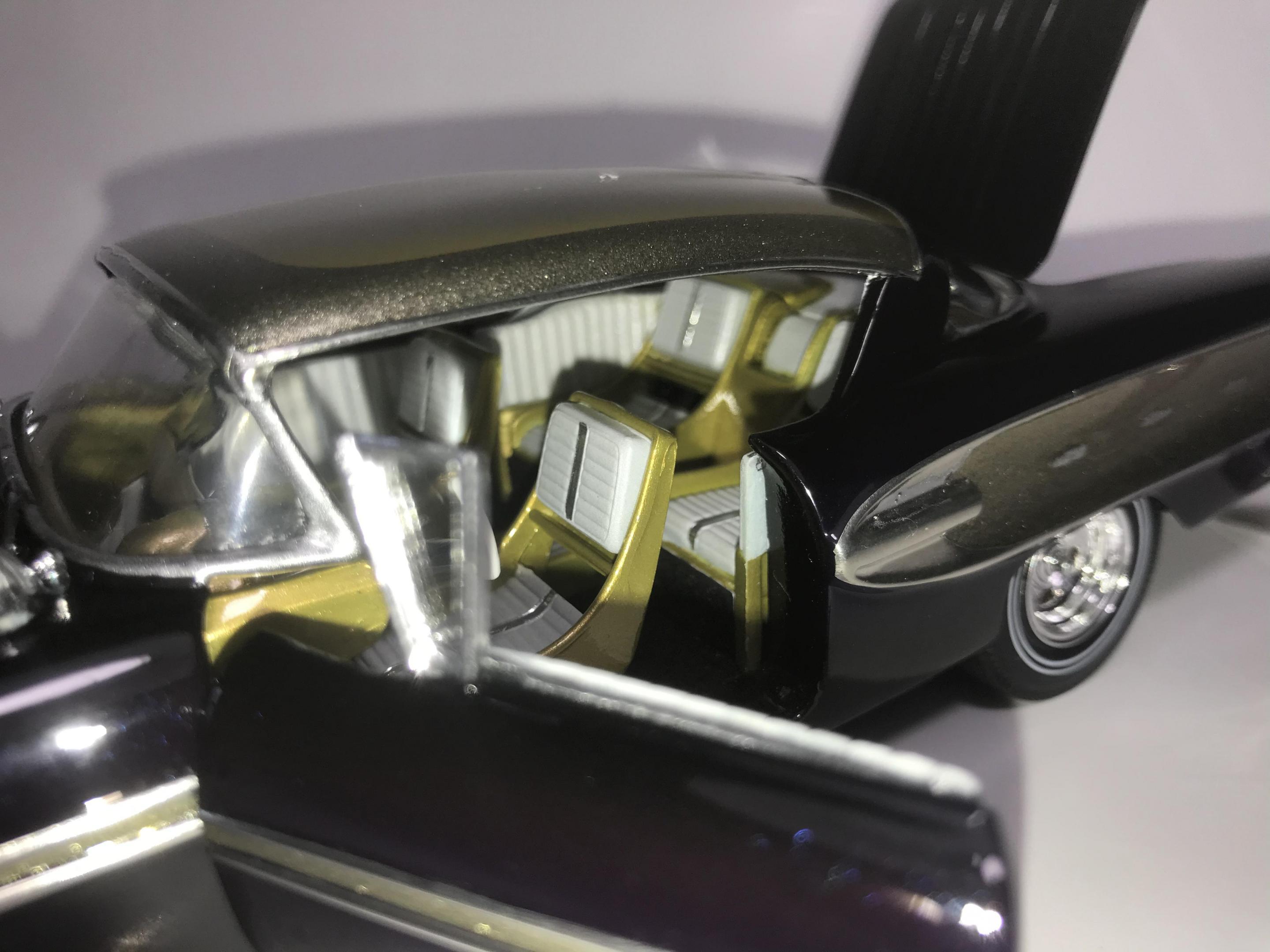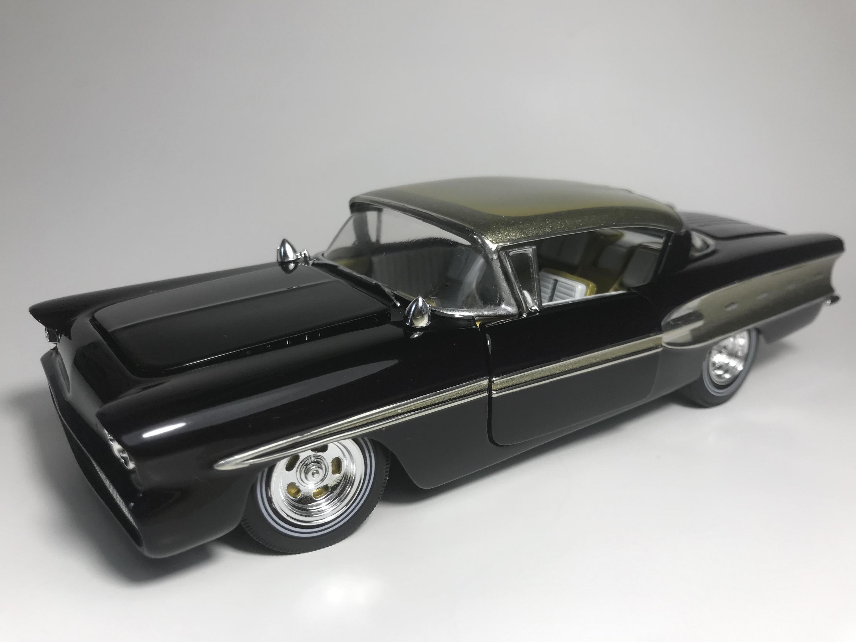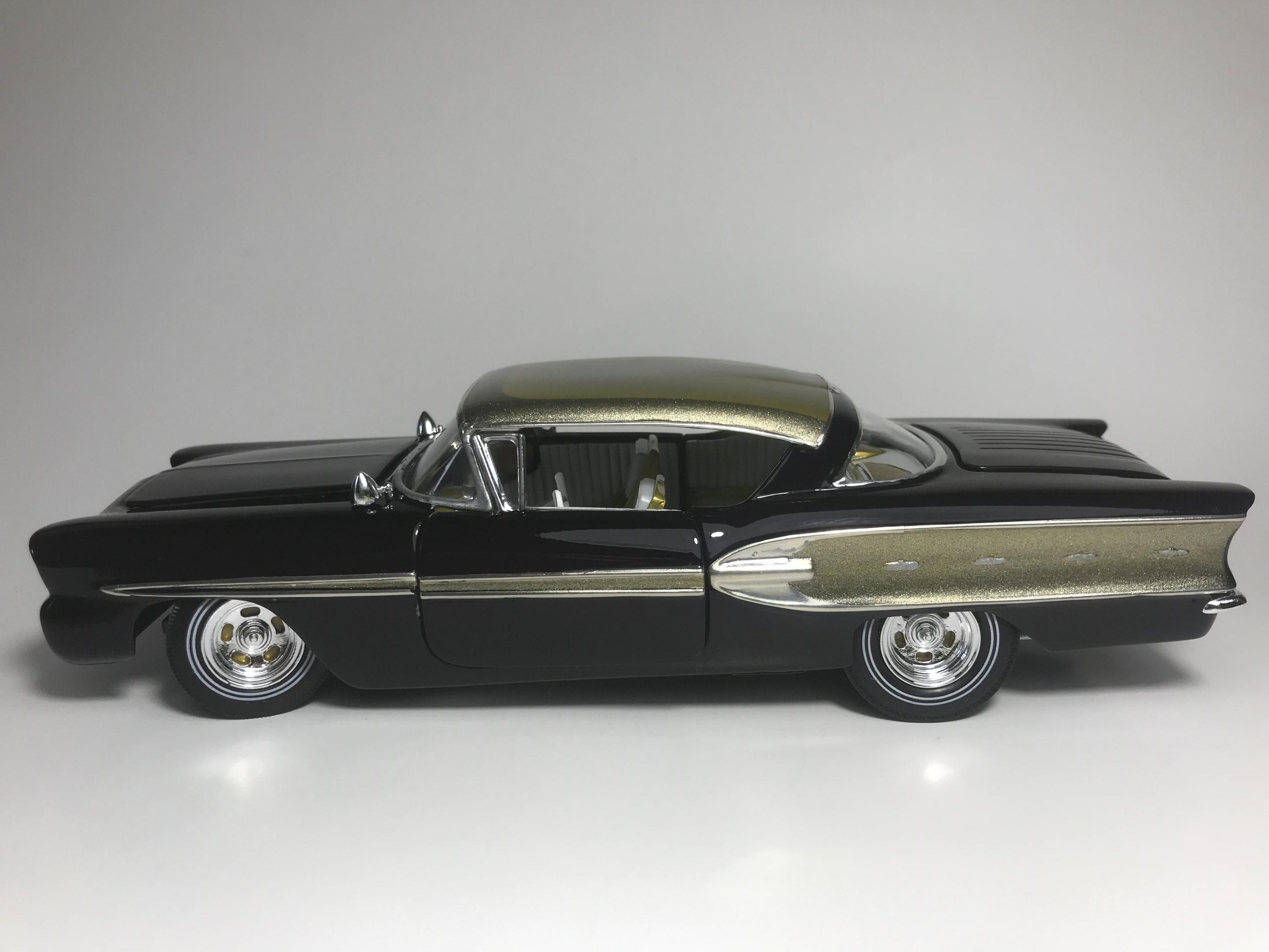 Here’s what once was a very badly busted up glue bomb, but for some reason I couldn’t just toss it in the trash, I worked on this on and off for about 7 years!! I had this picture of a early’60’s show car in my head with this model, so I started with piercing the body back together and then cutting it back apart, I pan caked the hood,then hinging the door, hood and trunk then rounding all the corners and molding all the jams, useing the custom interior, windows and chassis from the amt 58 Chevy impala made everything a lot easier on this build, tuck in roll interior, trunk and hood, motor is from a monogram predicta, wheels and tires are from the amt surf woody, custom rear bumper and front grille, topped with black and a pearl purple for the bitty and gold flake top everything topped with a 2 k clear, I’m sure I’m for getting something , I’m really glad to finally have this finished and on my shelf and out of my head !! I posted a lot of pics, may too many !!! Hope you like !! Thanks for looking!!