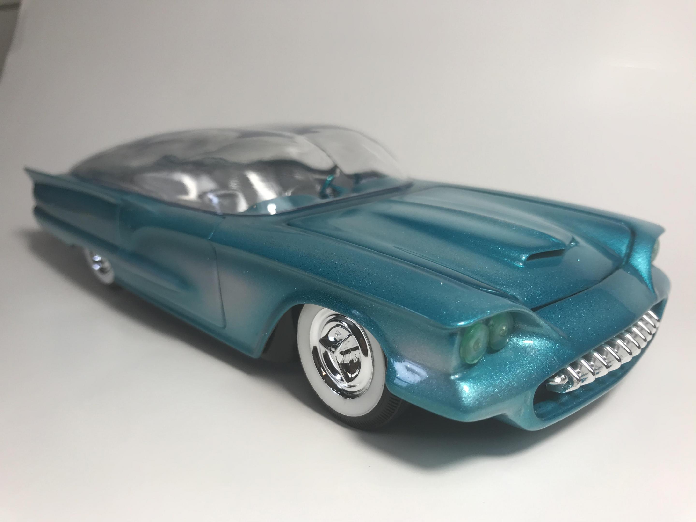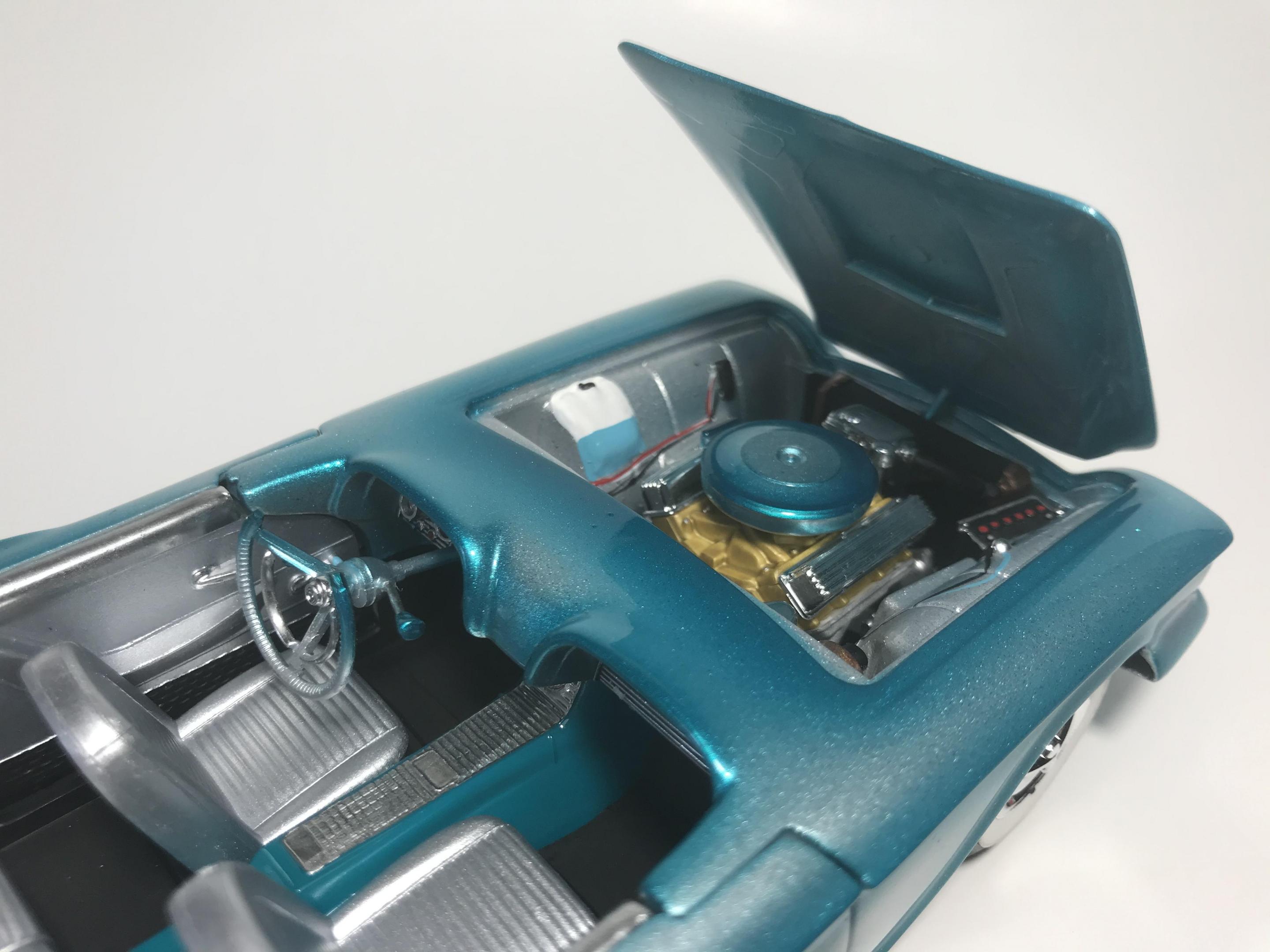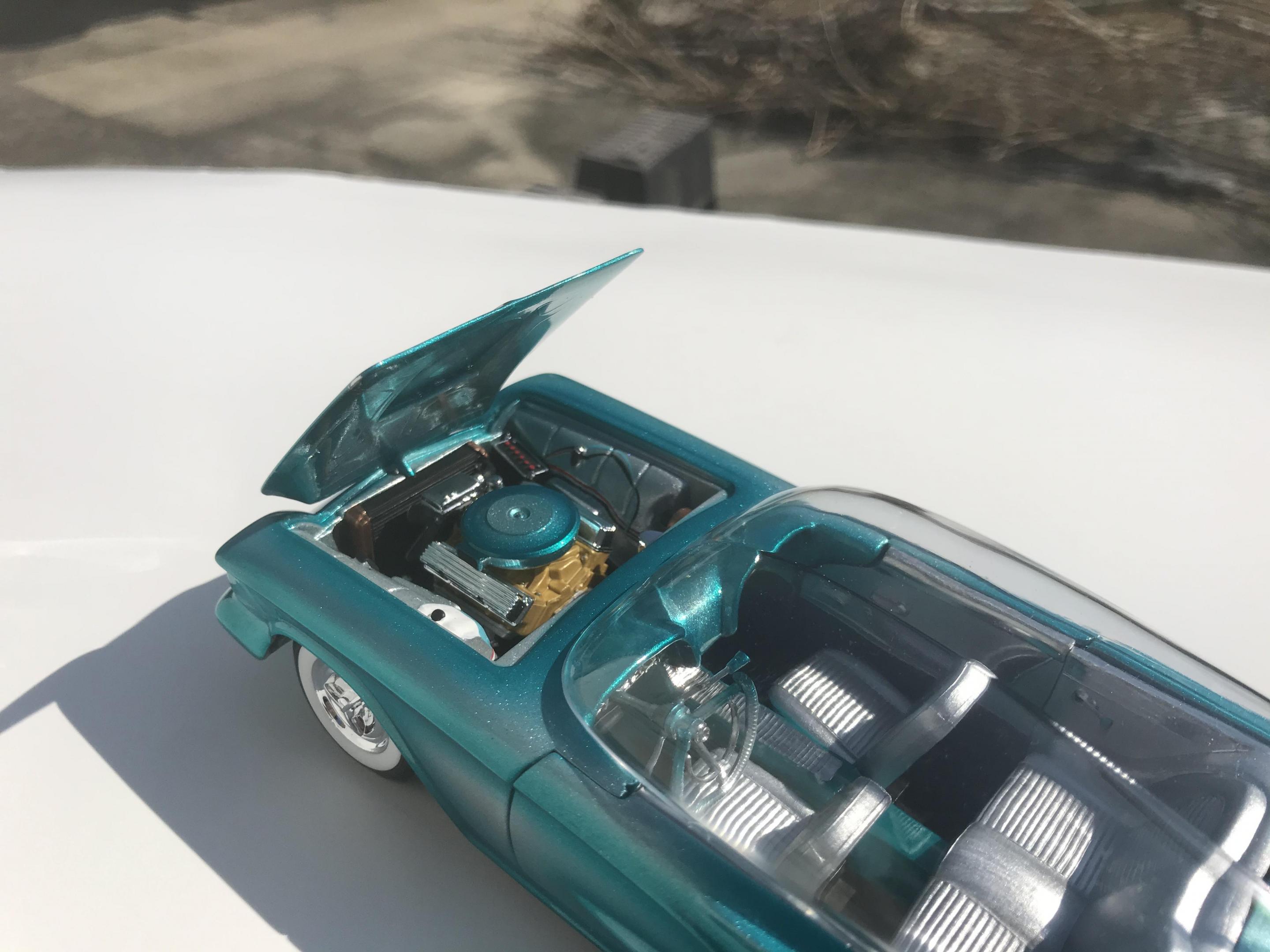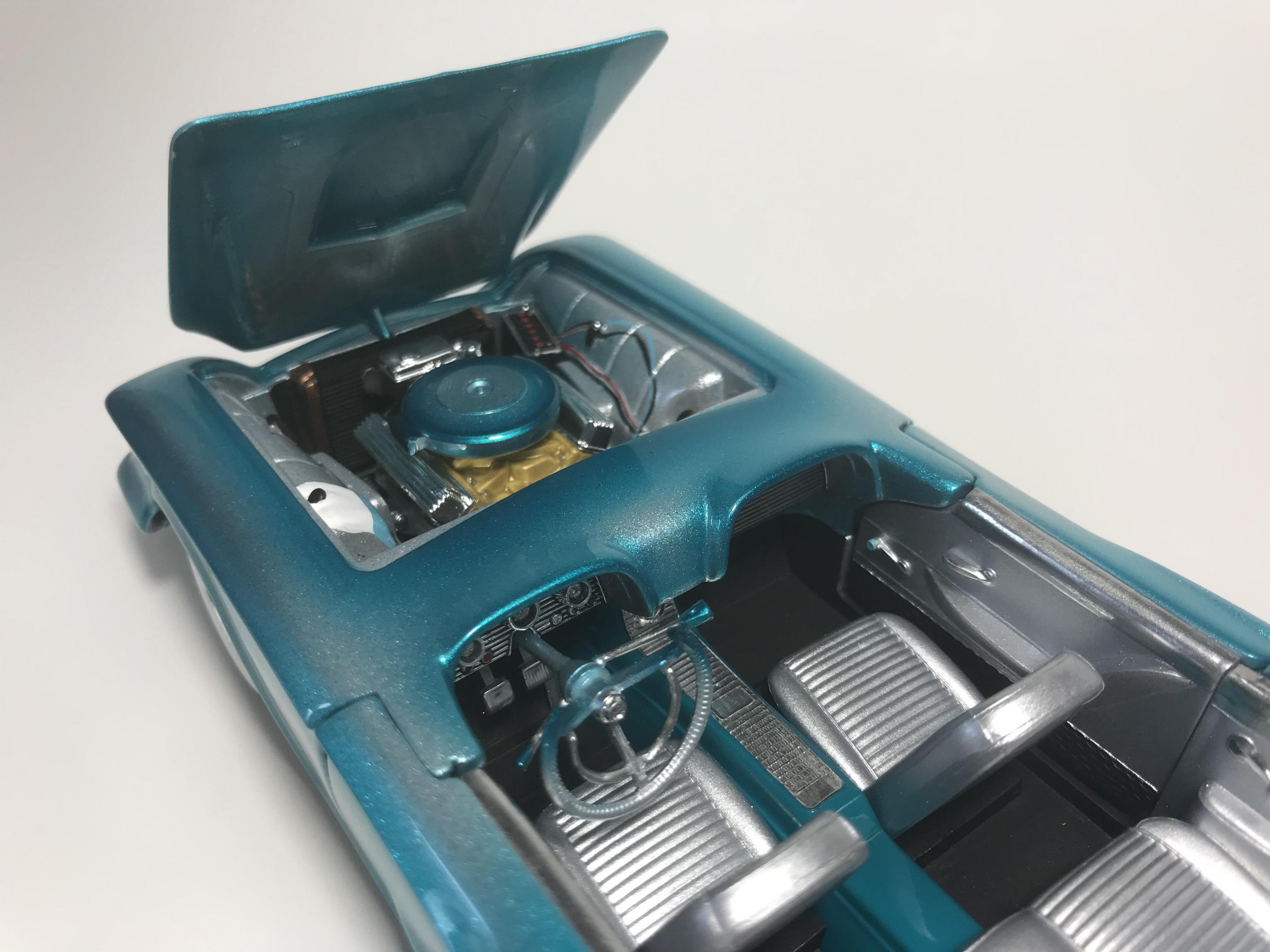 First time for me building this kit, monogram 1958 thunderbird bubble top, this pretty much went together with no problem, with exception of the doors, those at the last minutes of the build got glued shut, wanting it to look pretty custom I shaved everything, added round rod to the body lines and molded in , rounded hood corners, also reworked front bumper and molded it in, then adding a metal flake silver base and fogging with house of kolor candy teal and a 2 part automotive clear, silver and teal interior, built box stock, I went ahead and painted the stock roof so I can switch if I like, all in all a fun and neat kit and took about two weeks on and off to build, Thanks for looking guys !!