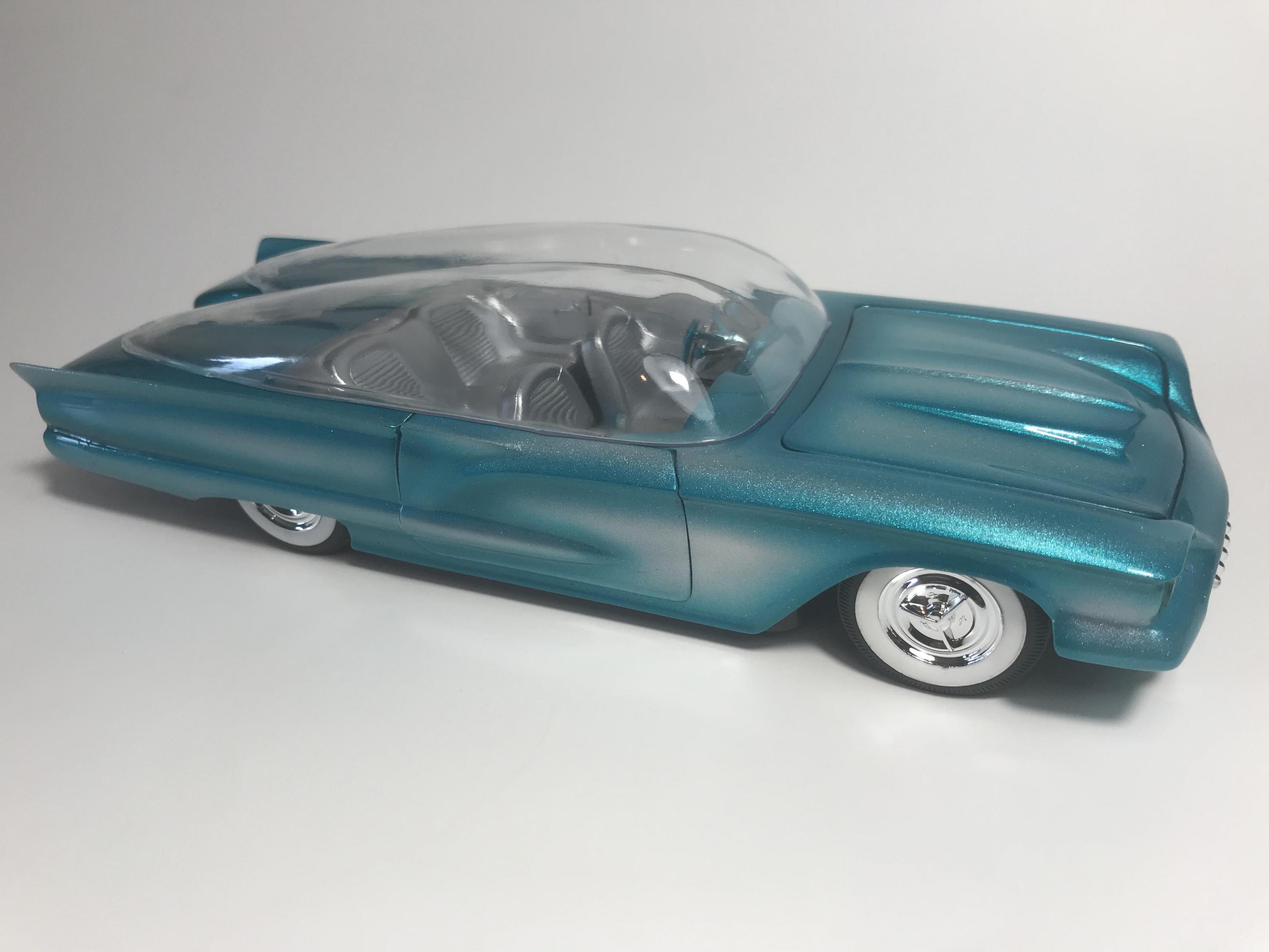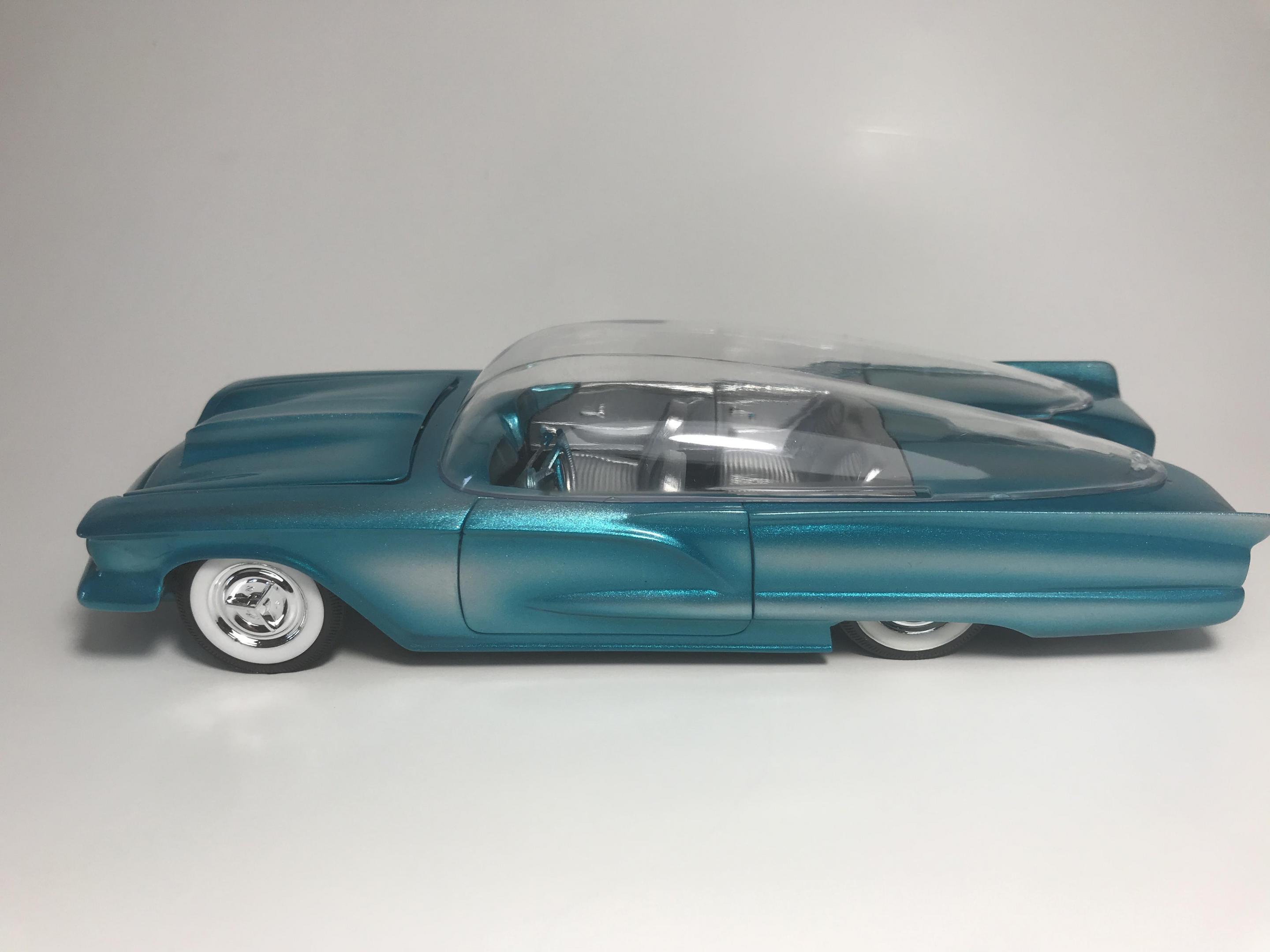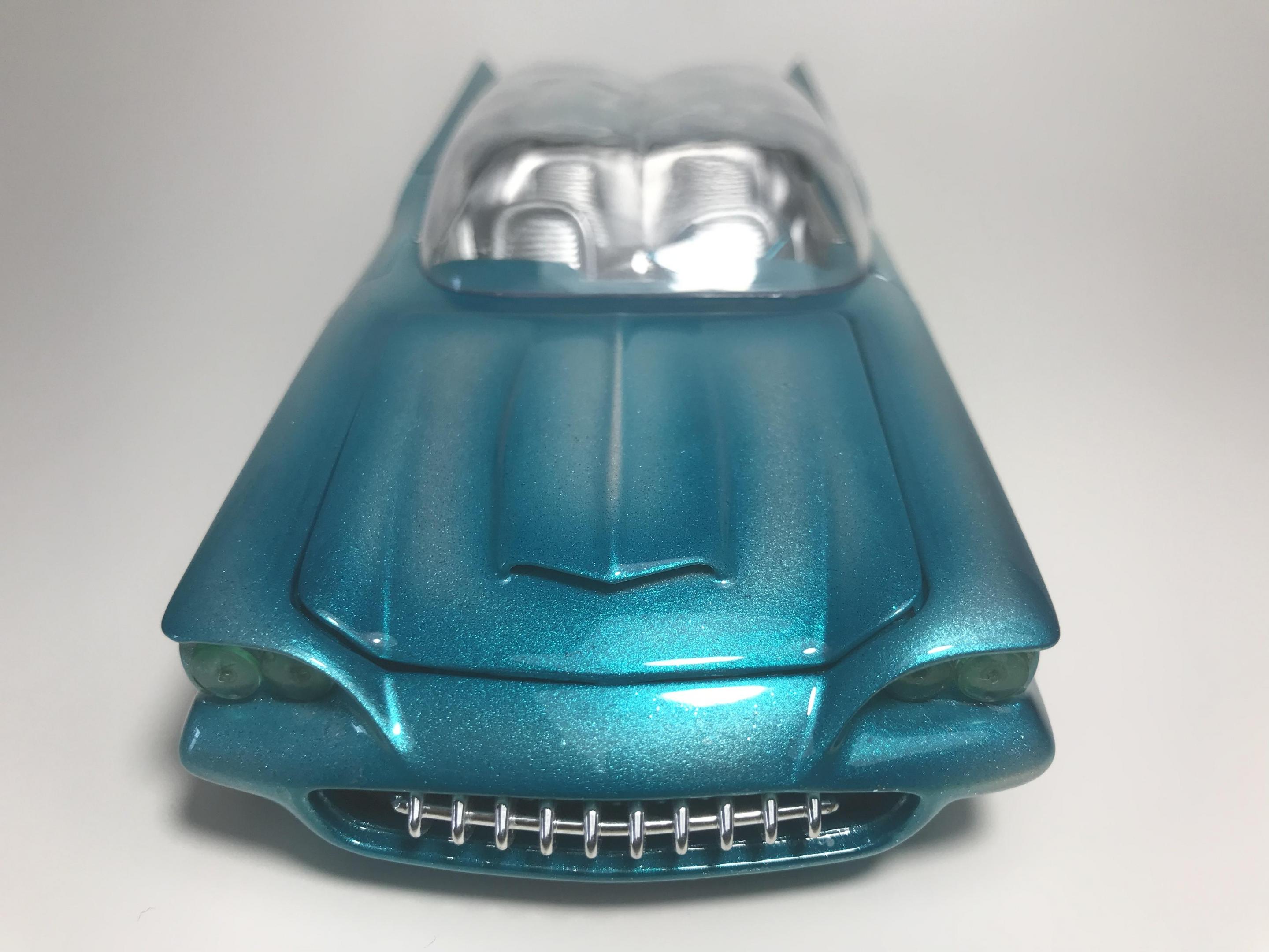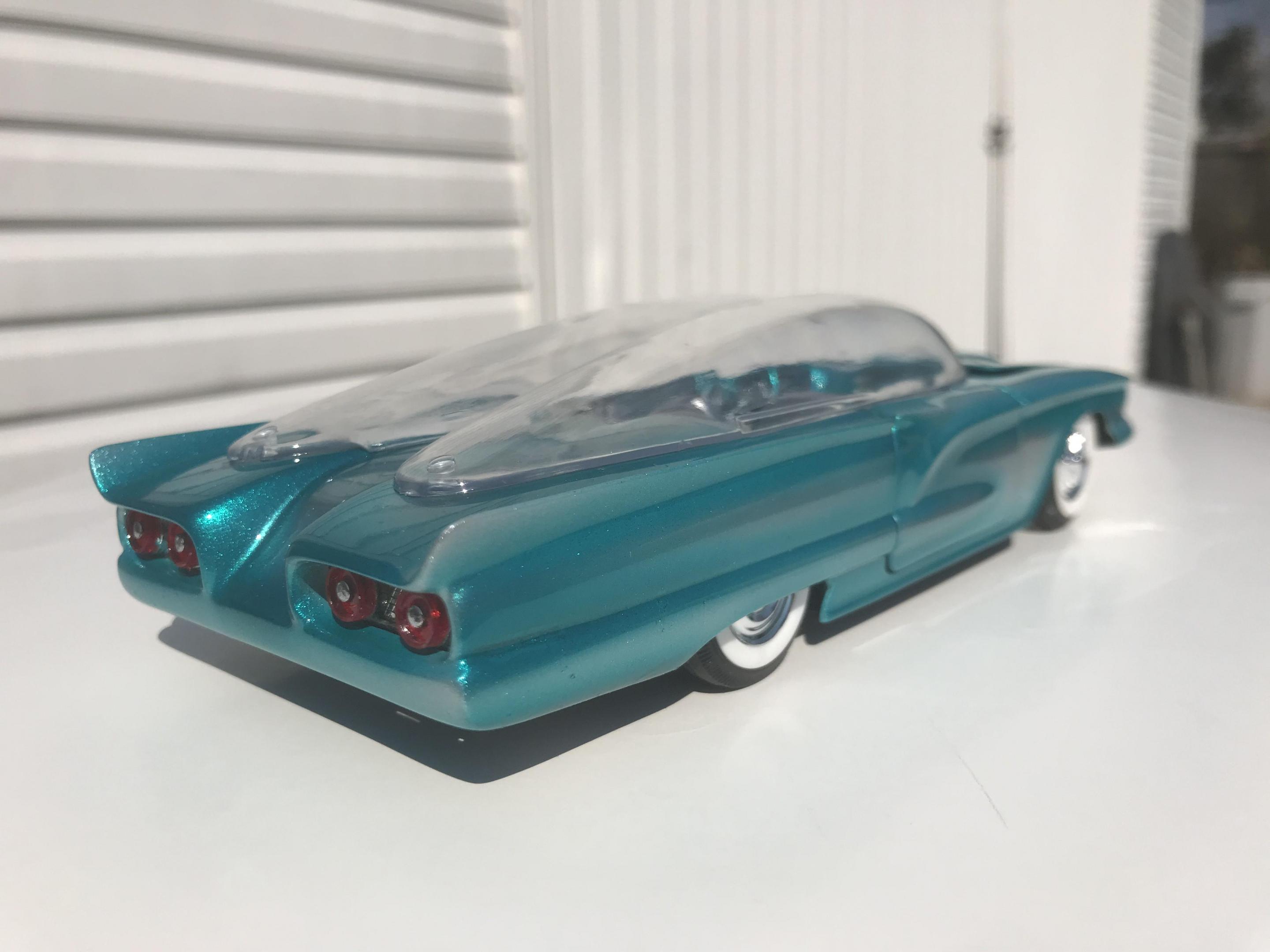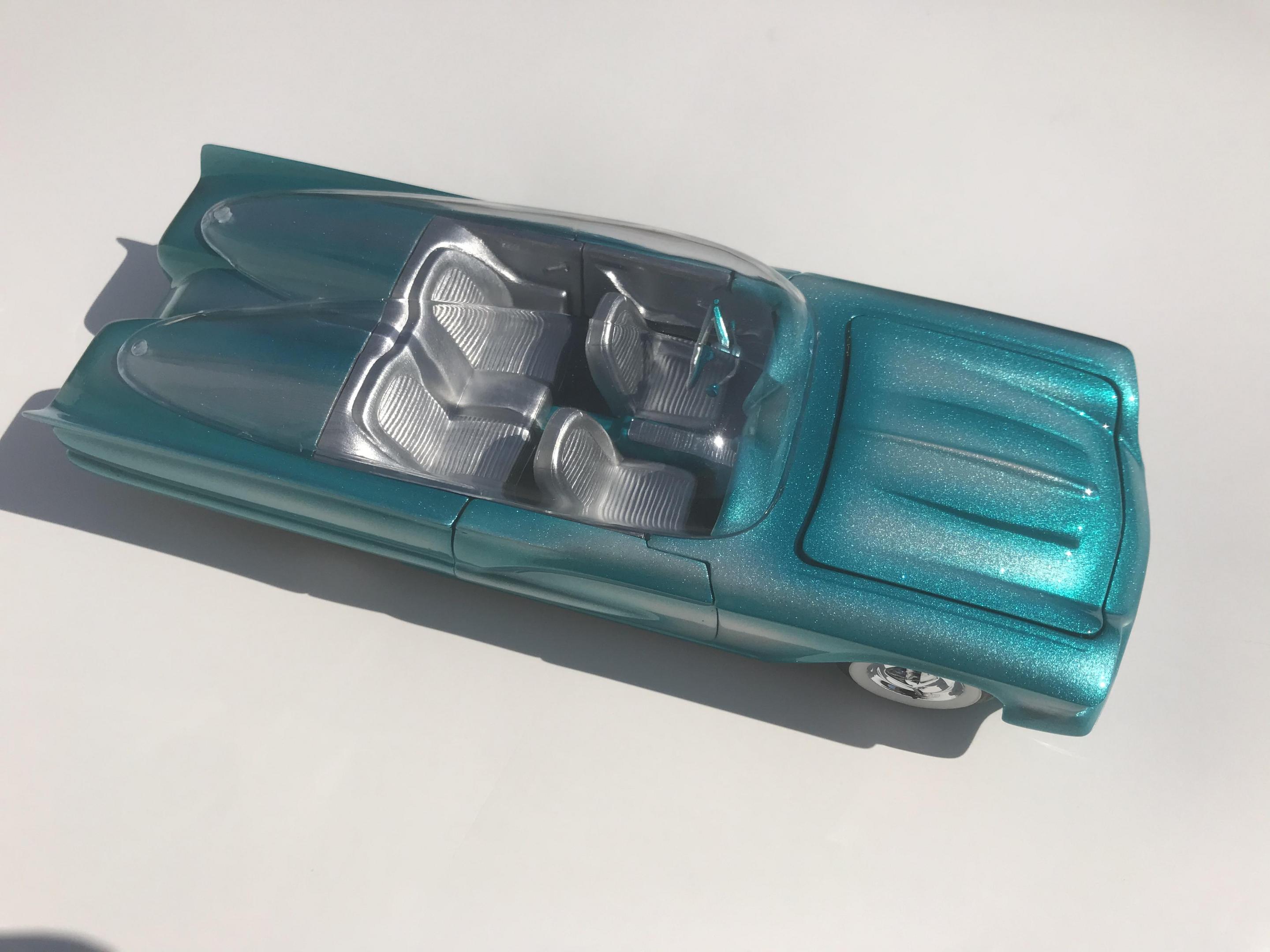 First time for me building this kit, monogram 1958 thunderbird bubble top, this pretty much went together with no problem, with exception of the doors, those at the last minutes of the build got glued shut, wanting it to look pretty custom I shaved everything, added round rod to the body lines and molded in , rounded hood corners, also reworked front bumper and molded it in, then adding a metal flake silver base and fogging with house of kolor candy teal and a 2 part automotive clear, silver and teal interior, built box stock, I went ahead and painted the stock roof so I can switch if I like, all in all a fun and neat kit and took about two weeks on and off to build, Thanks for looking guys !!