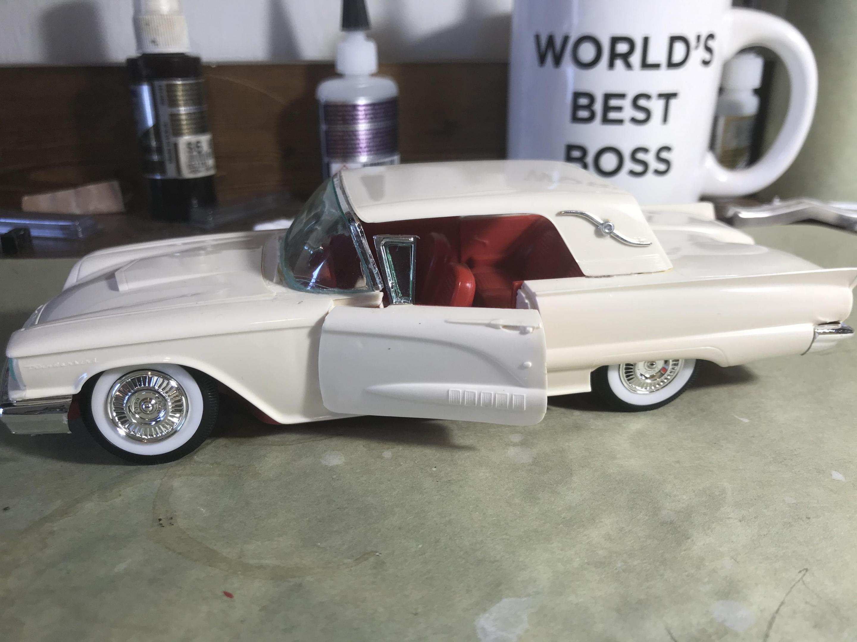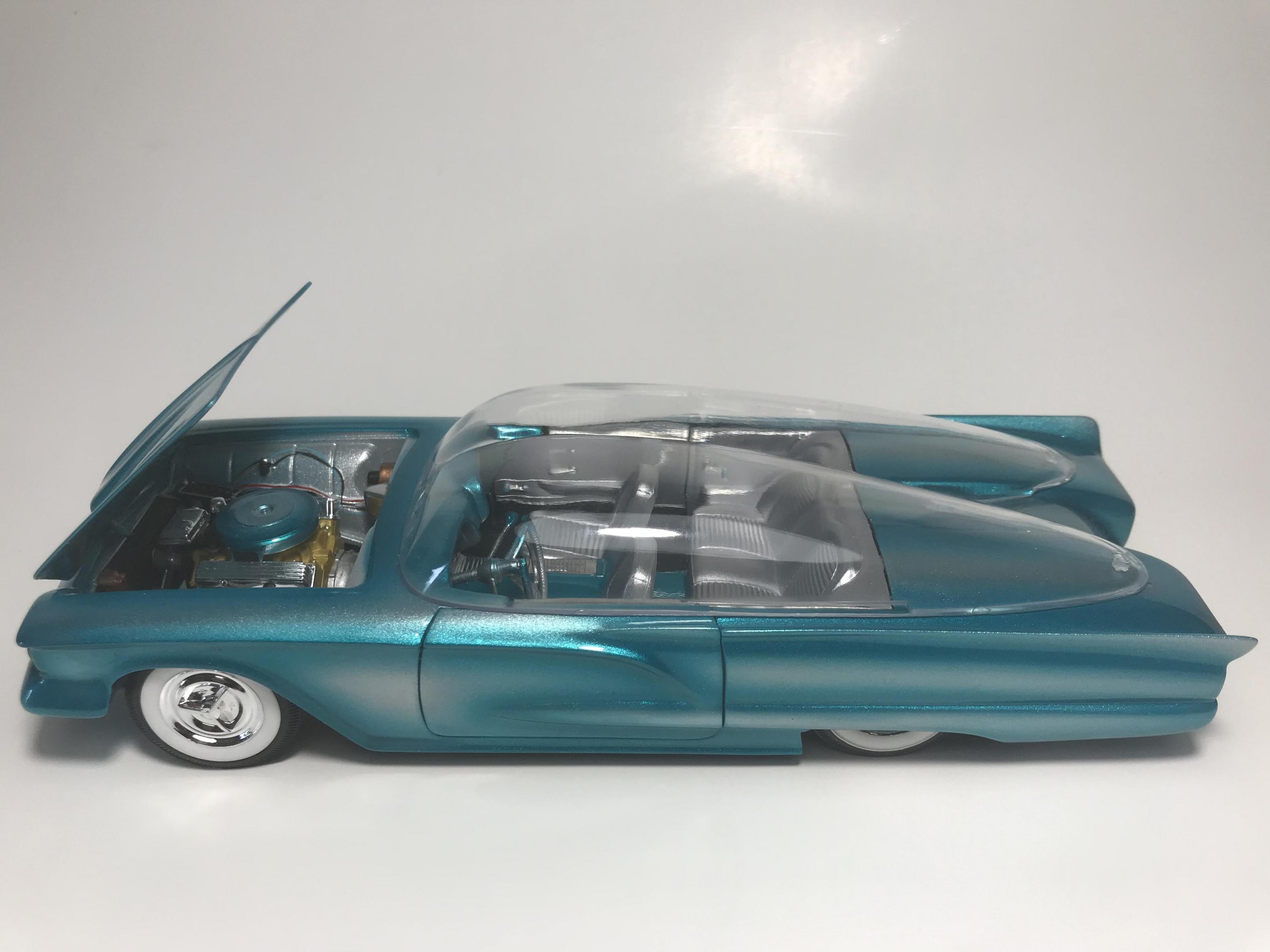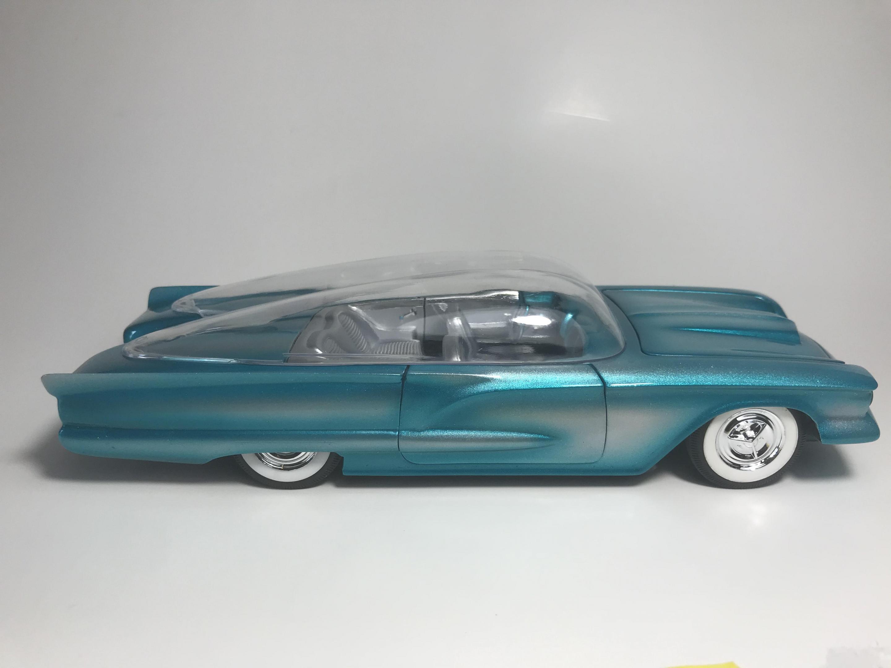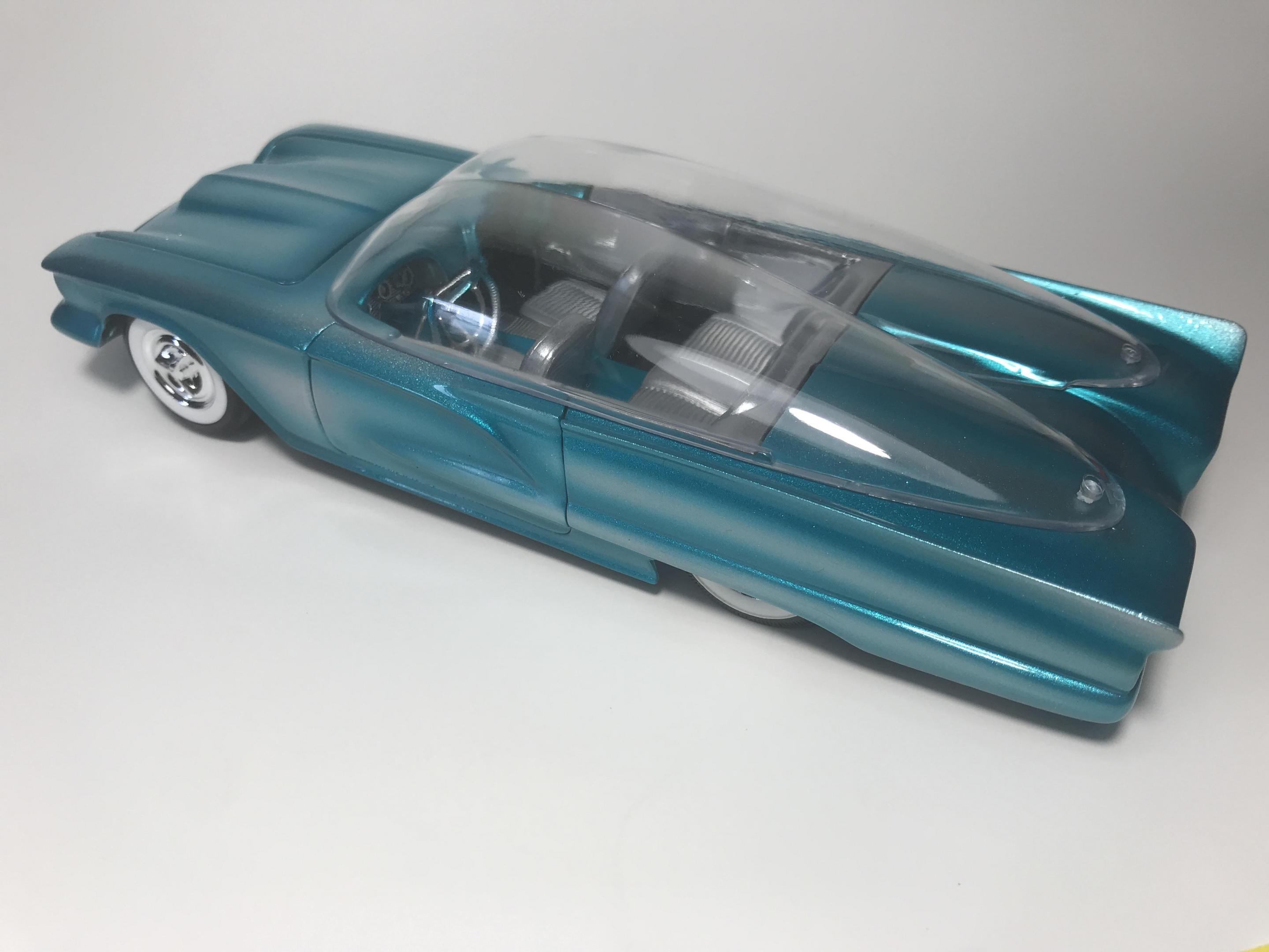 First time for me building this kit, monogram 1958 thunderbird bubble top, this pretty much went together with no problem, with exception of the doors, those at the last minutes of the build got glued shut, wanting it to look pretty custom I shaved everything, added round rod to the body lines and molded in , rounded hood corners, also reworked front bumper and molded it in, then adding a metal flake silver base and fogging with house of kolor candy teal and a 2 part automotive clear, silver and teal interior, built box stock, I went ahead and painted the stock roof so I can switch if I like, all in all a fun and neat kit and took about two weeks on and off to build, Thanks for looking guys !!