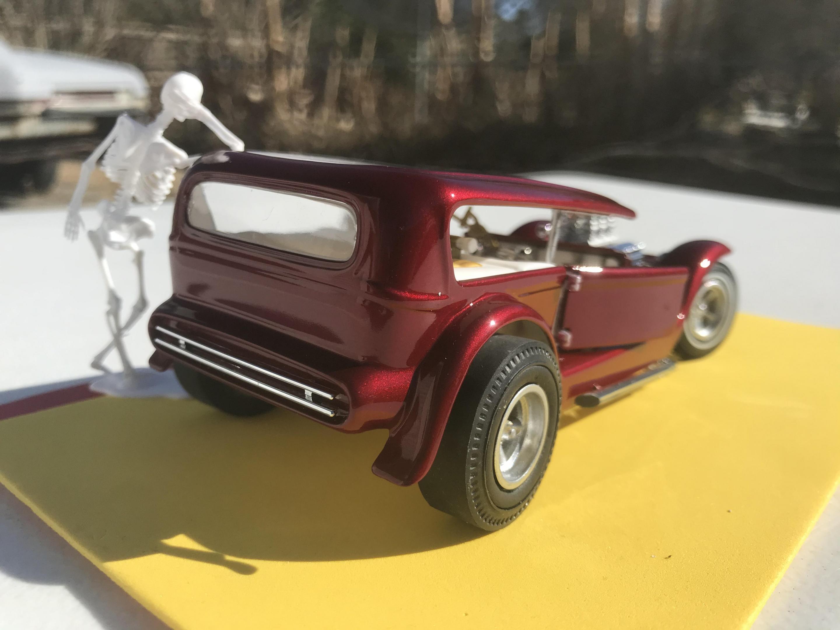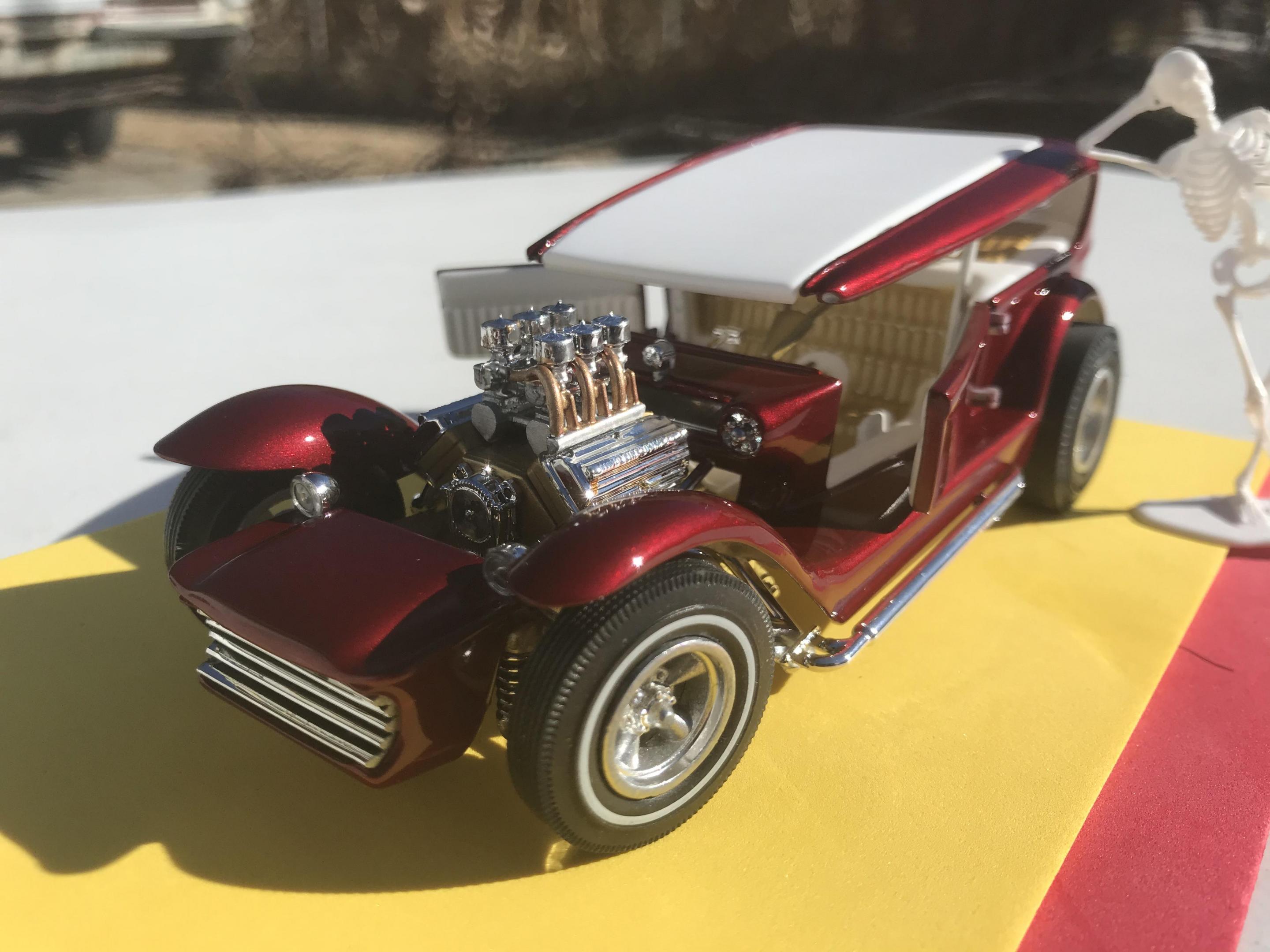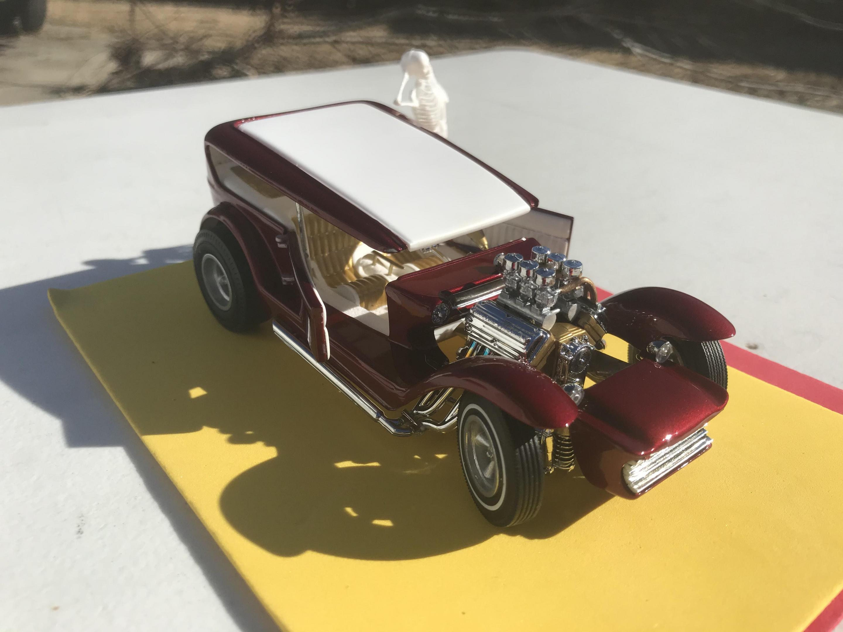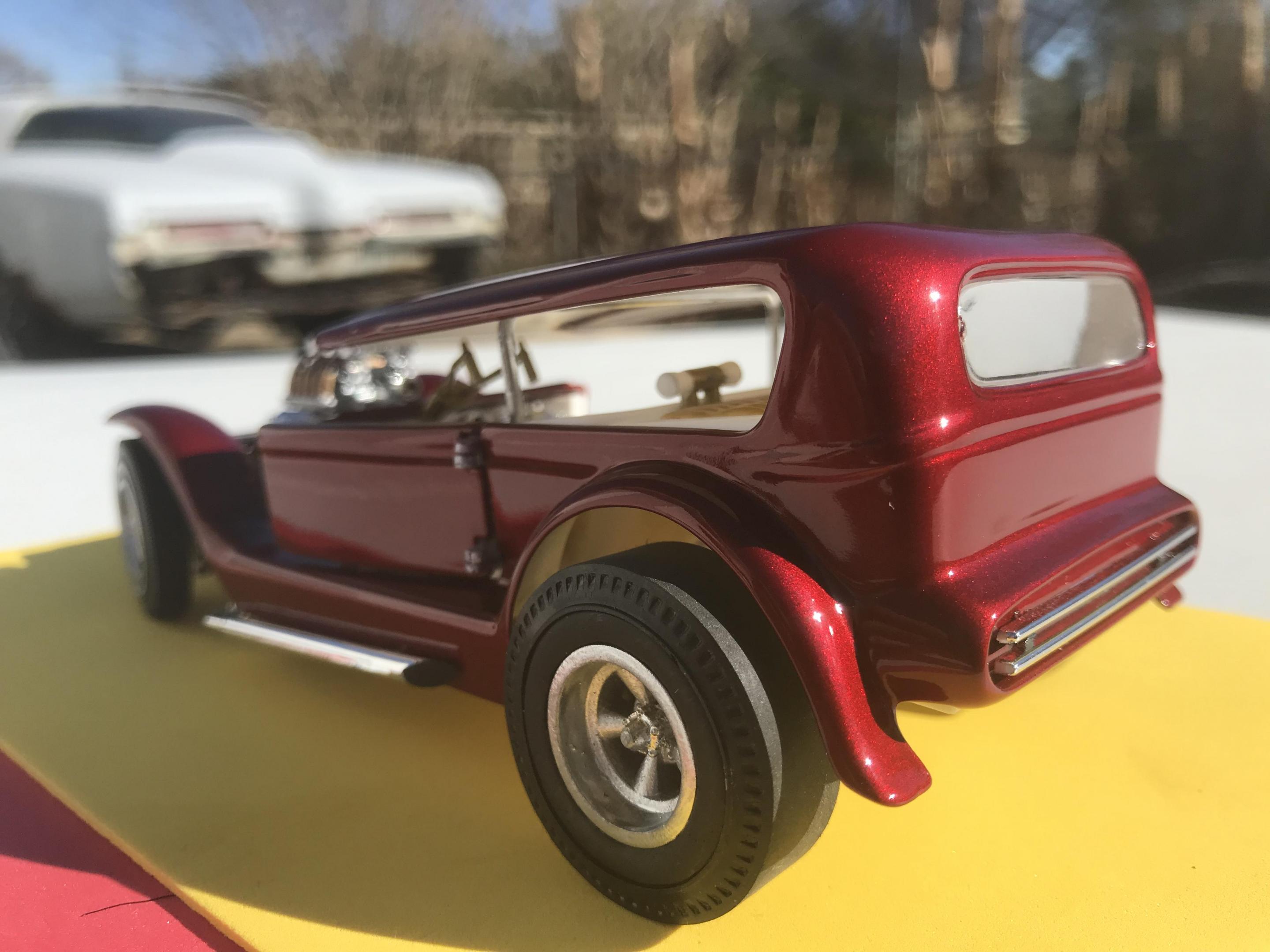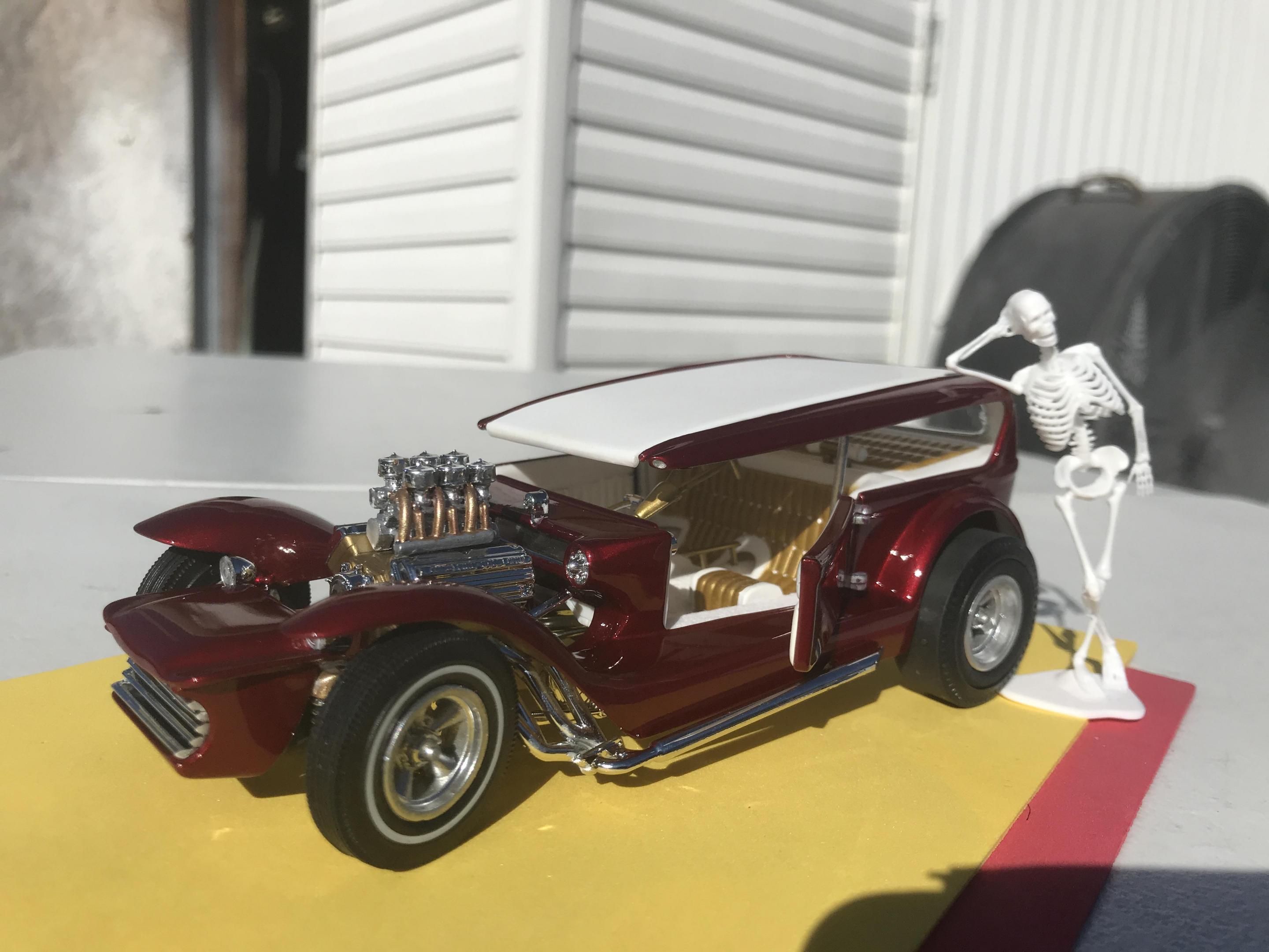 I’ve had in my stash for years but have never built, the Lil Coffin, wanting to get as close to the real car as I could I googled the car and found lots of pics of it ,built pretty box stock and adding no extra details , only thing I did change was the tires to the black wall rear slicks and thin white wall tires up front, didn’t really see any early 60’s pictures of the car with the wide white tires that are on the restored Lil Coffin except on model car boxes, did the interior as close to the early pics I found with gold and pearl white and the outside of the car was painted a gold base and a candy brandy wine with 4 coats of 2K clear , all and all a nice quick build taking about 2 weeks, not sure why I never built this before but now glad to have this in my show case ! Thanks for looking guys !!!