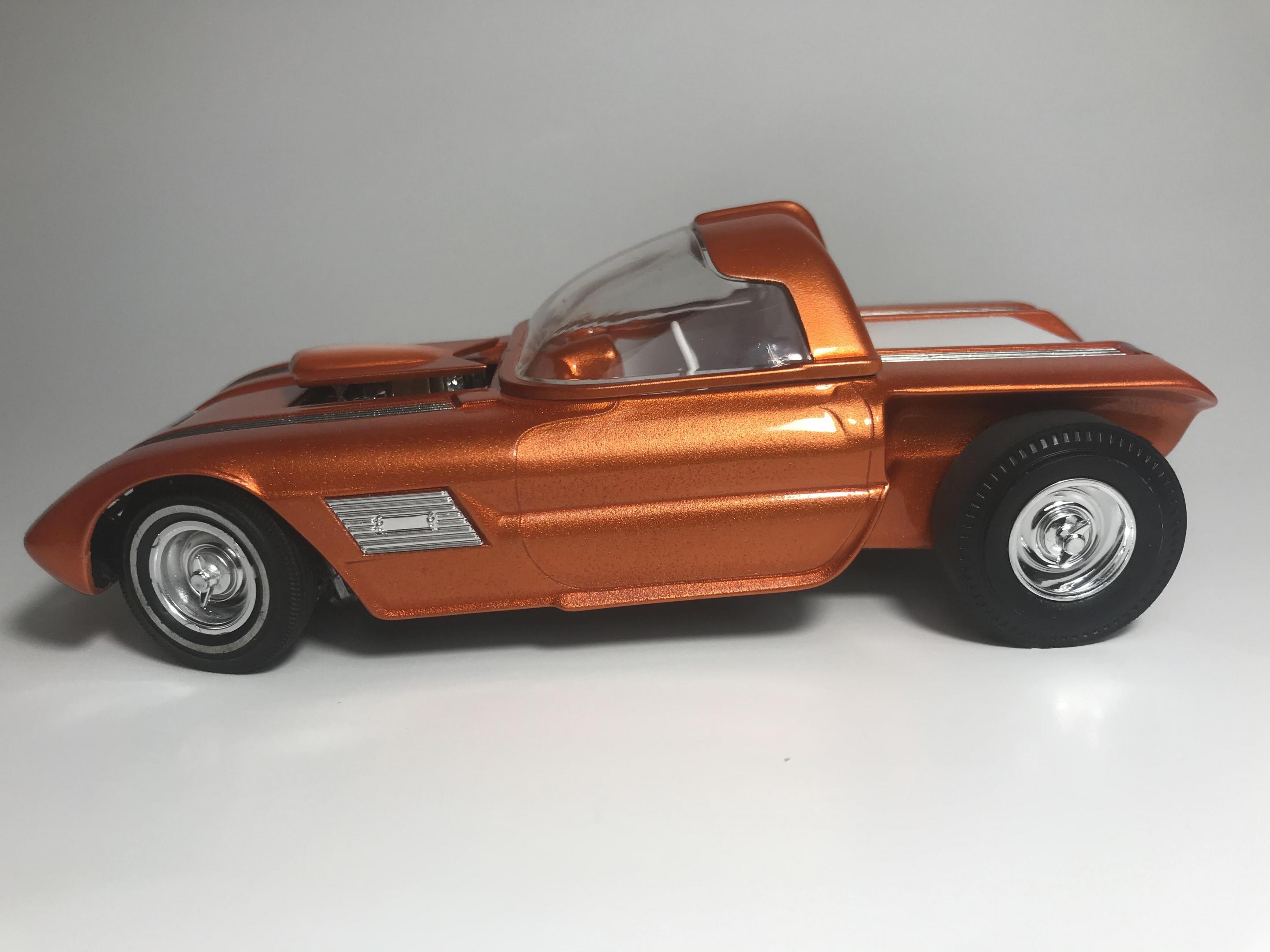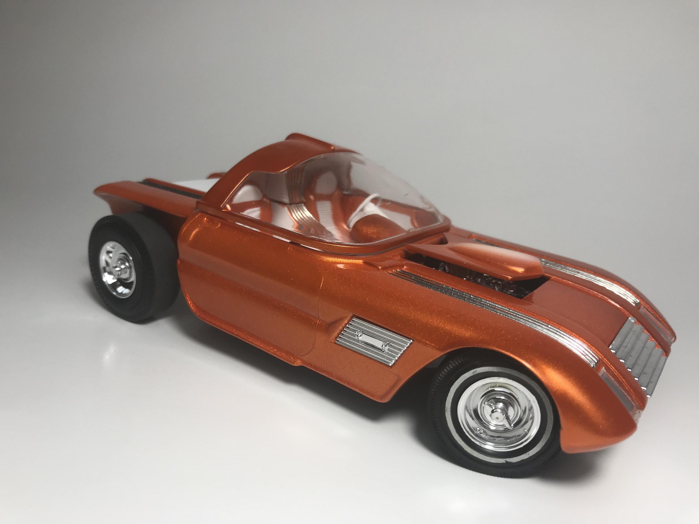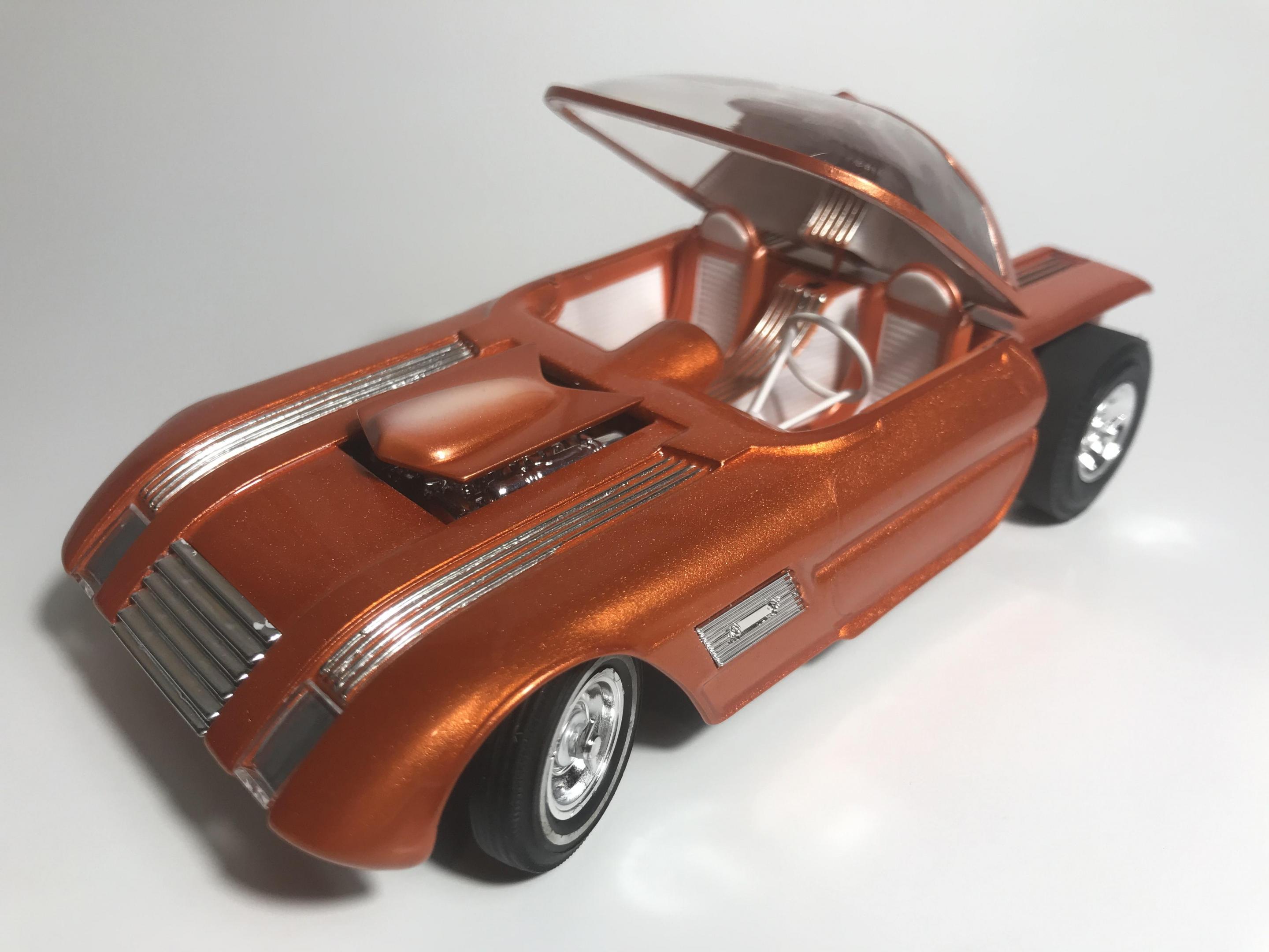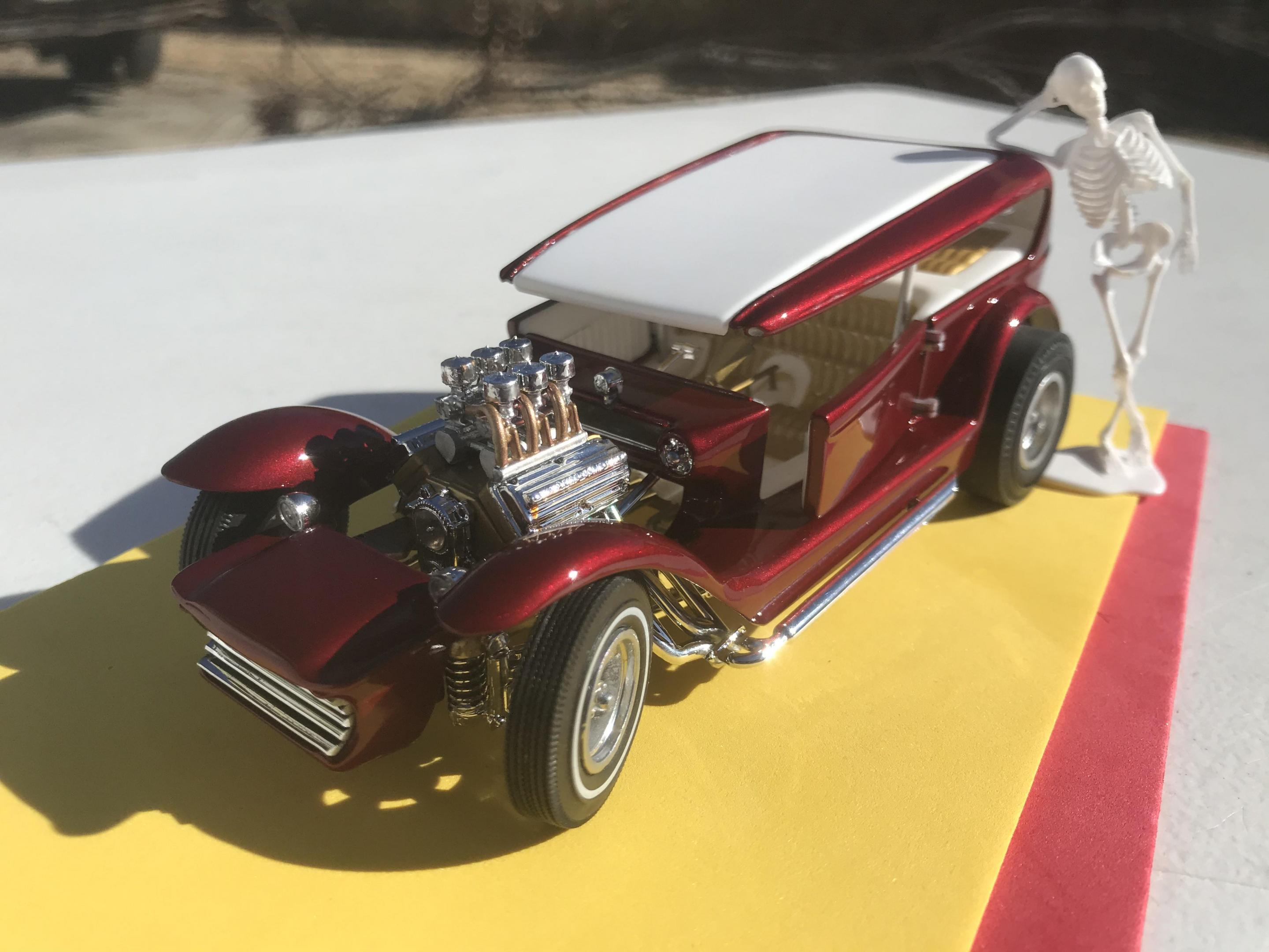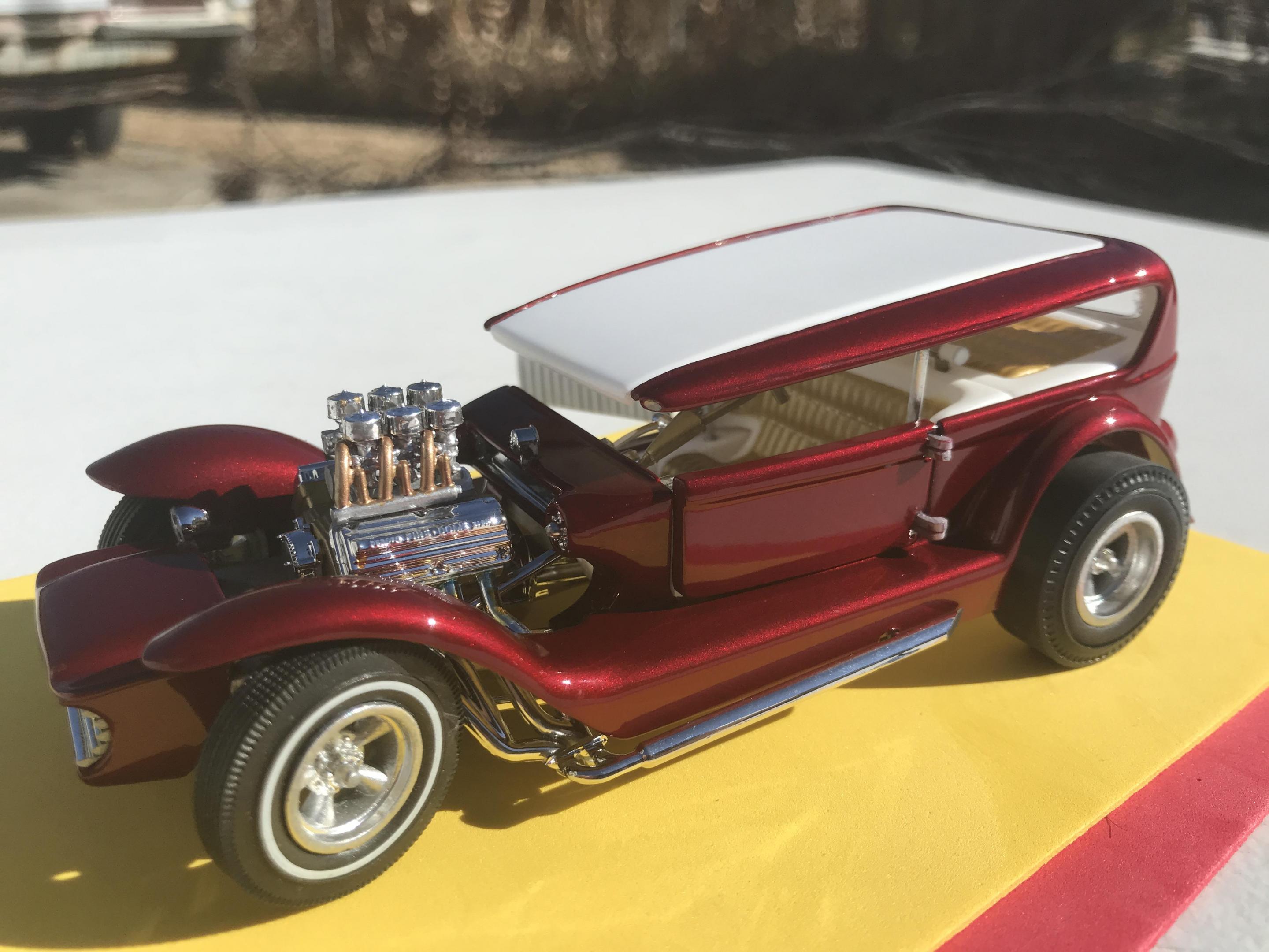 I’ve had in my stash for years but have never built, the Lil Coffin, wanting to get as close to the real car as I could I googled the car and found lots of pics of it ,built pretty box stock and adding no extra details , only thing I did change was the tires to the black wall rear slicks and thin white wall tires up front, didn’t really see any early 60’s pictures of the car with the wide white tires that are on the restored Lil Coffin except on model car boxes, did the interior as close to the early pics I found with gold and pearl white and the outside of the car was painted a gold base and a candy brandy wine with 4 coats of 2K clear , all and all a nice quick build taking about 2 weeks, not sure why I never built this before but now glad to have this in my show case ! Thanks for looking guys !!!