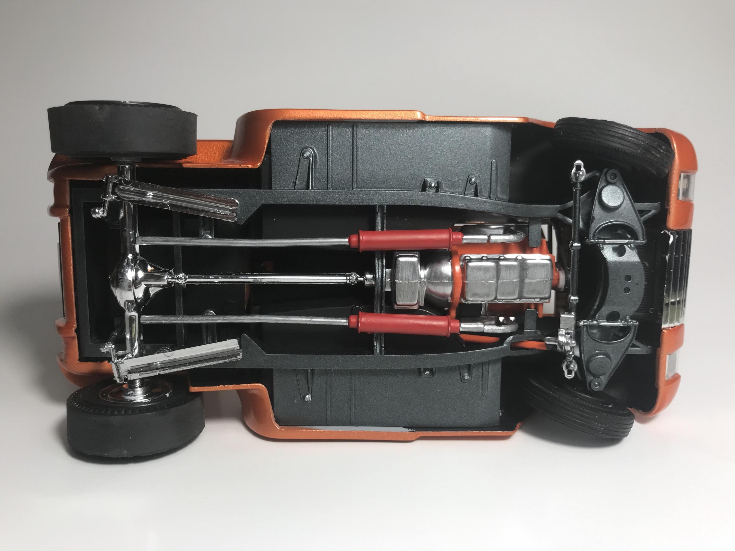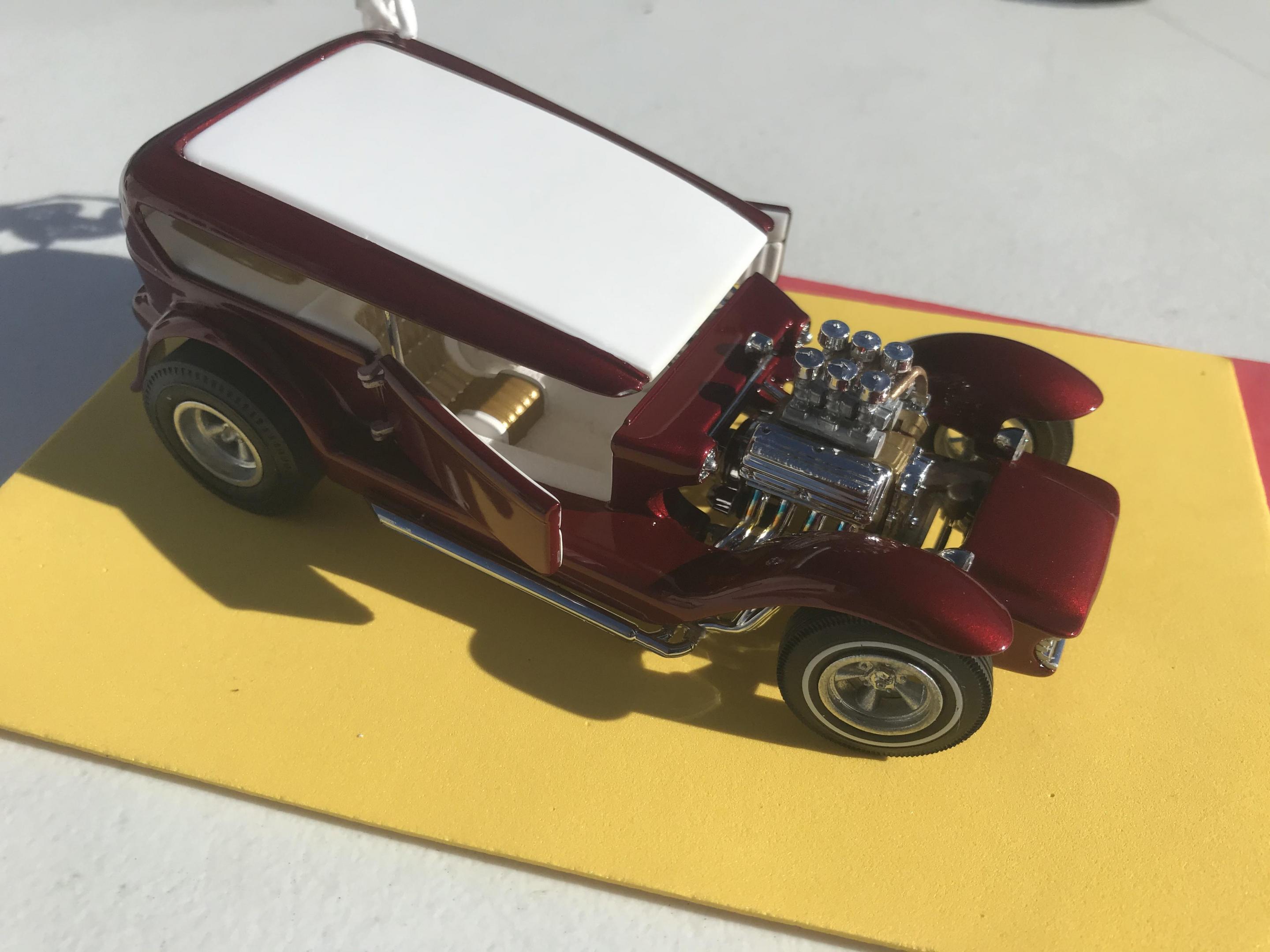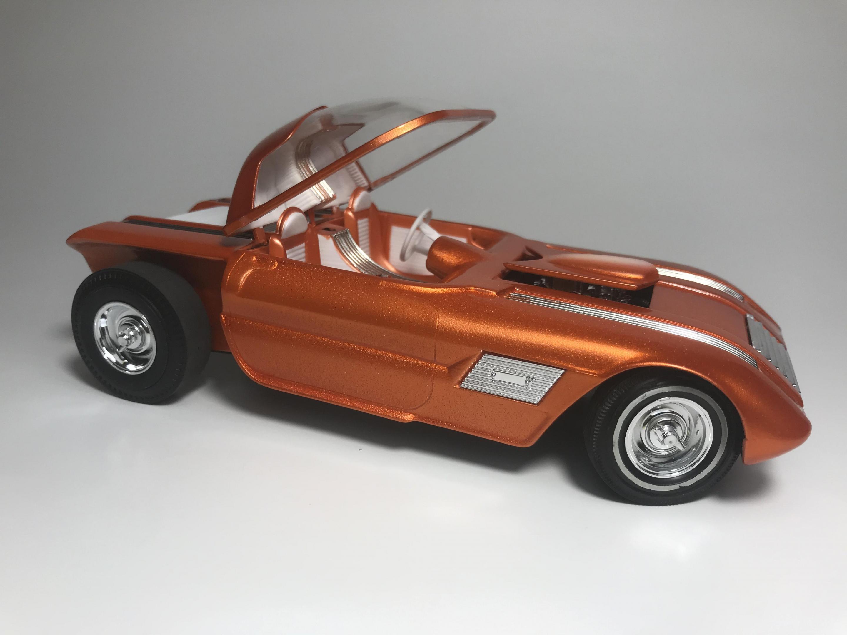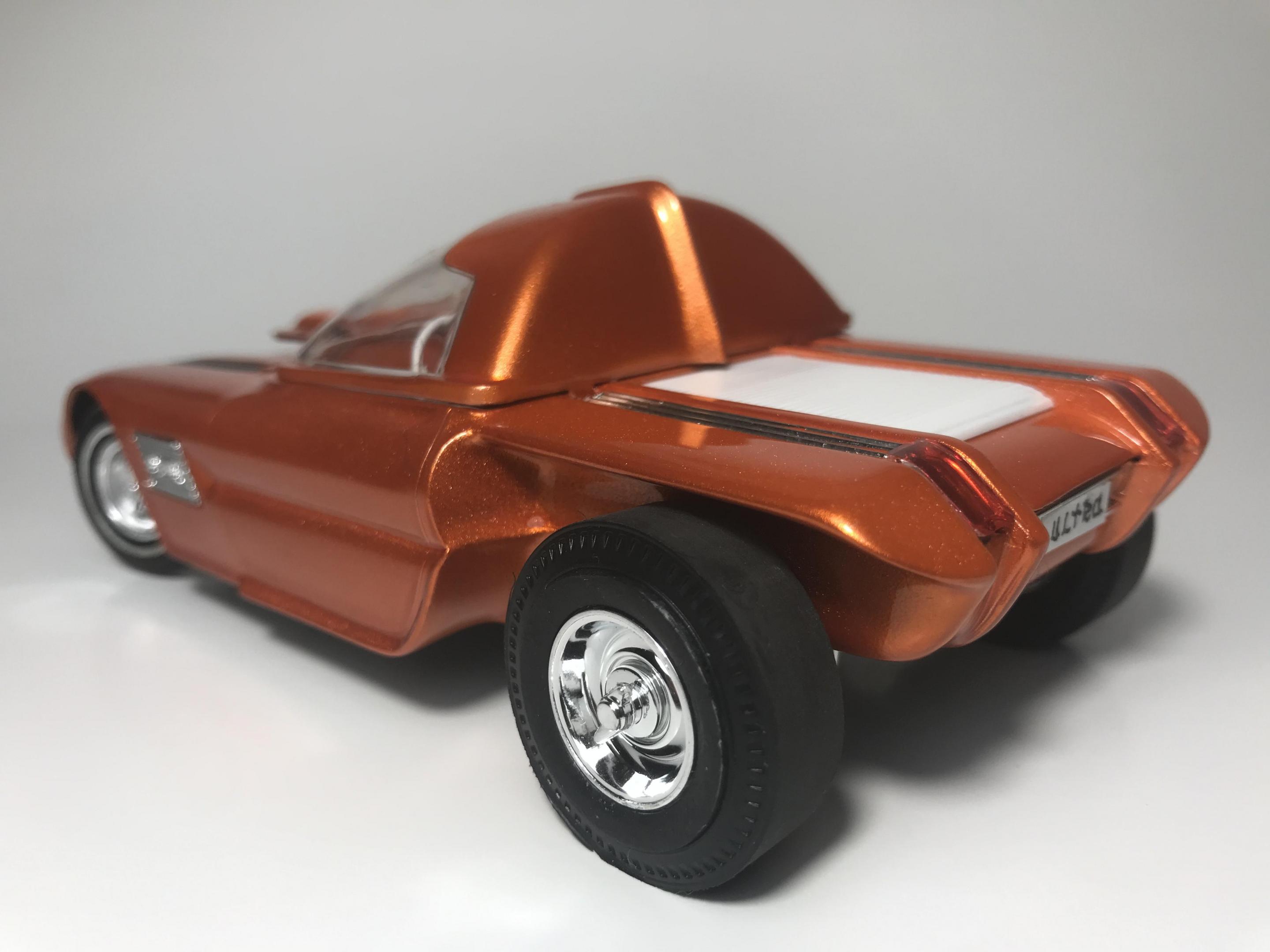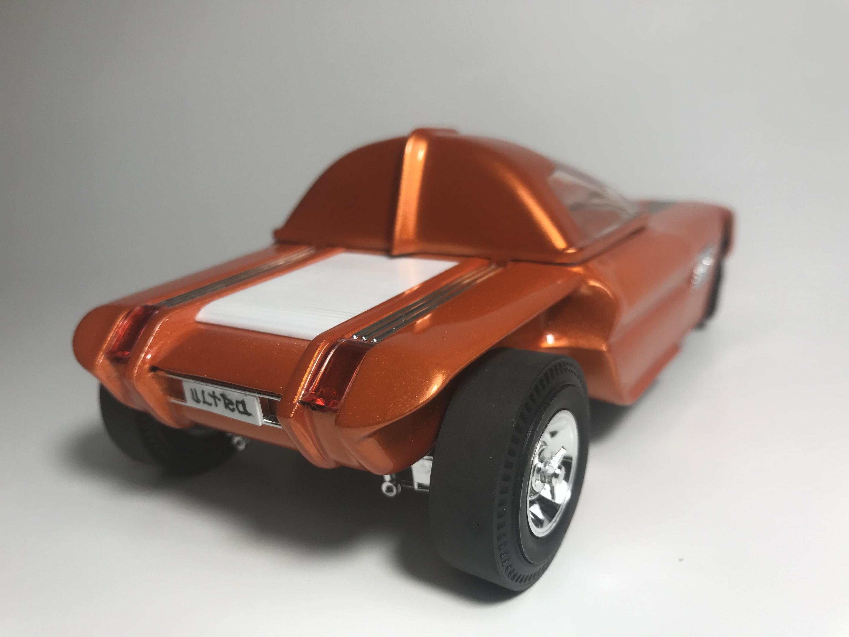 I’ve had in my stash for years but have never built, the Lil Coffin, wanting to get as close to the real car as I could I googled the car and found lots of pics of it ,built pretty box stock and adding no extra details , only thing I did change was the tires to the black wall rear slicks and thin white wall tires up front, didn’t really see any early 60’s pictures of the car with the wide white tires that are on the restored Lil Coffin except on model car boxes, did the interior as close to the early pics I found with gold and pearl white and the outside of the car was painted a gold base and a candy brandy wine with 4 coats of 2K clear , all and all a nice quick build taking about 2 weeks, not sure why I never built this before but now glad to have this in my show case ! Thanks for looking guys !!!