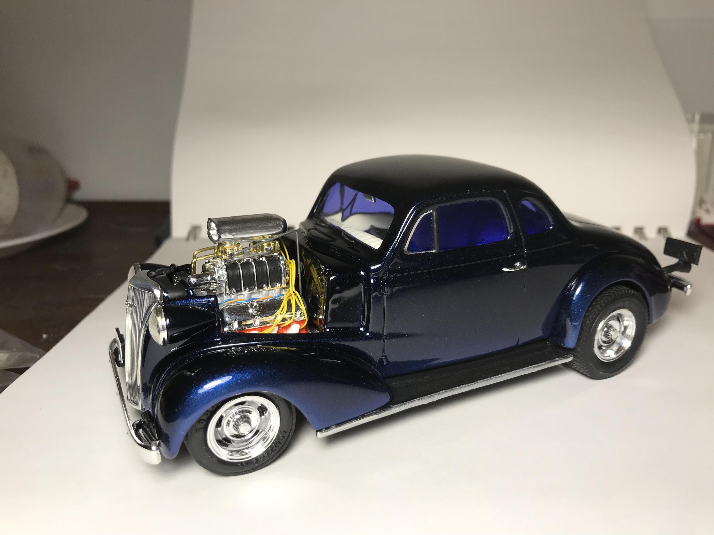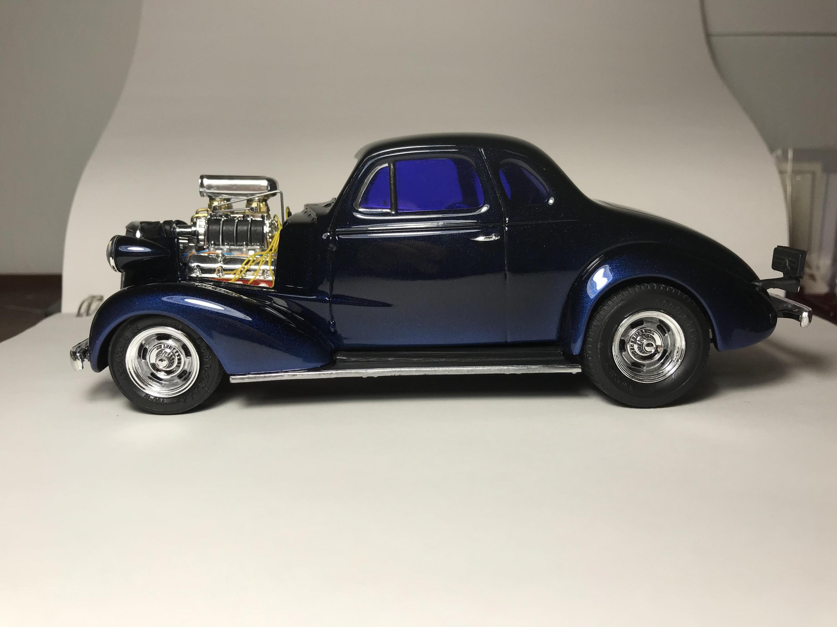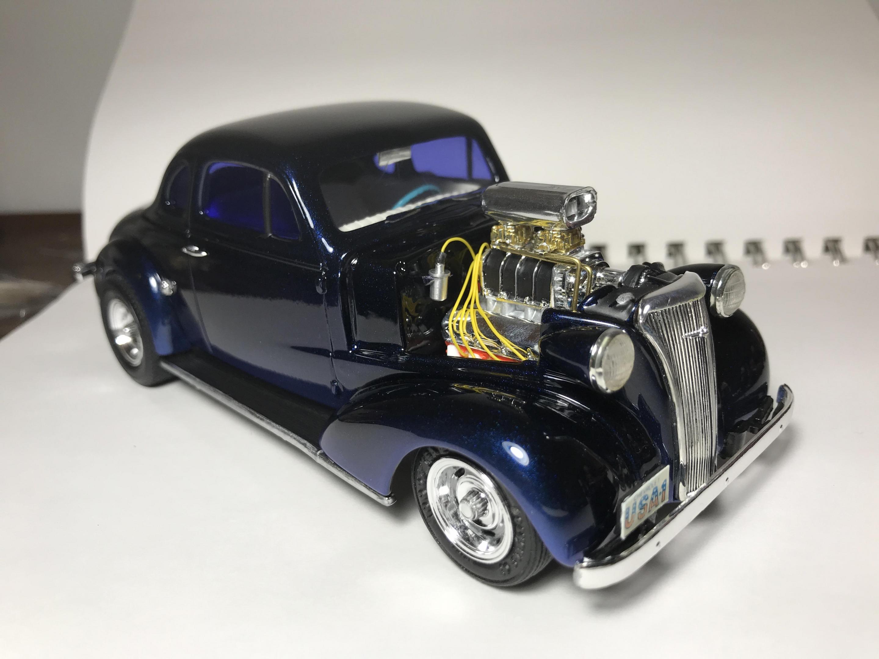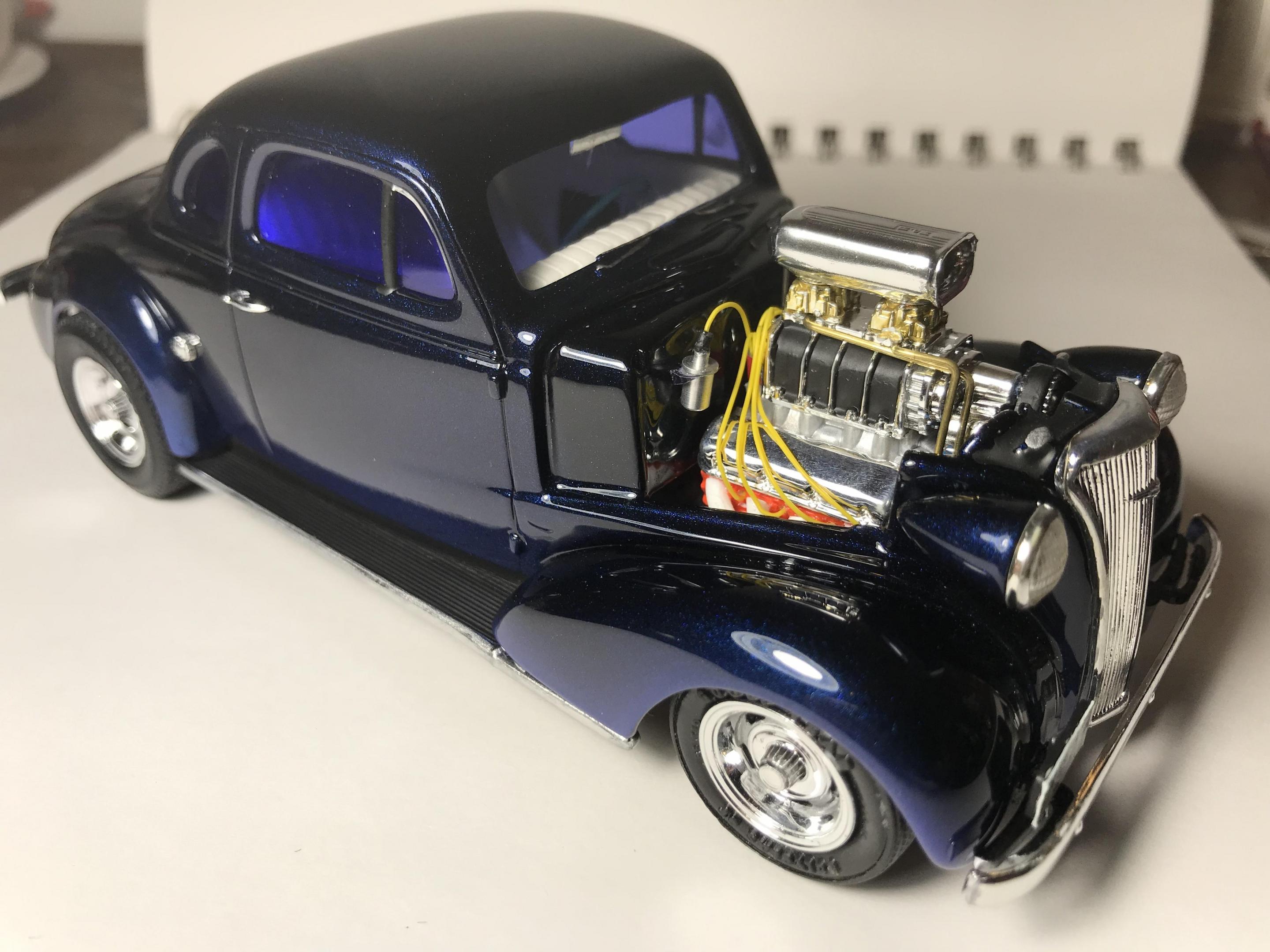 Another 37 Chevy amt , I really like this kit and built several over the years, this build this time is a street rod , body is pretty much stock with the exception of a slightly fared rear wheel wells, painted black with a blue pearl, big Chevy blown 454 motor, Chevy really wheels, blue tinted windows and it’s done, thanks for looking!