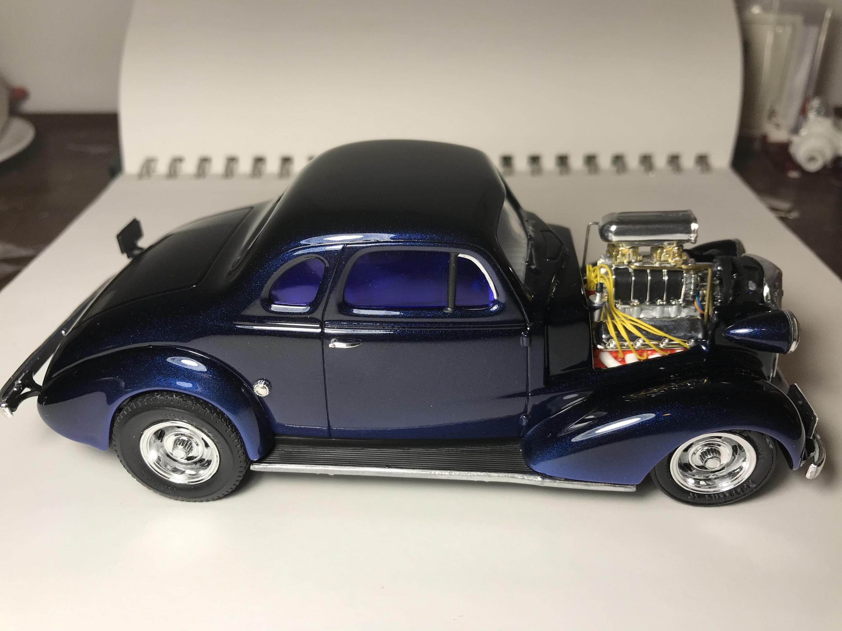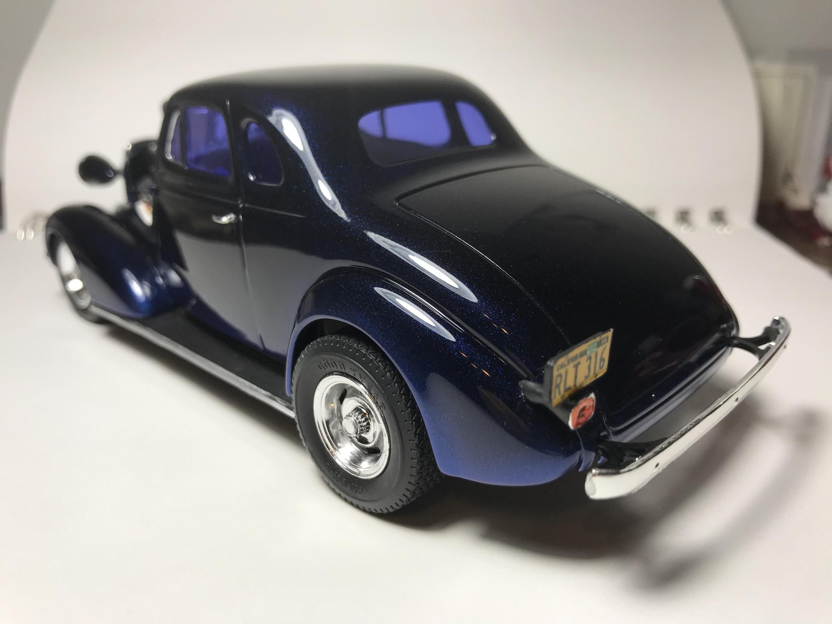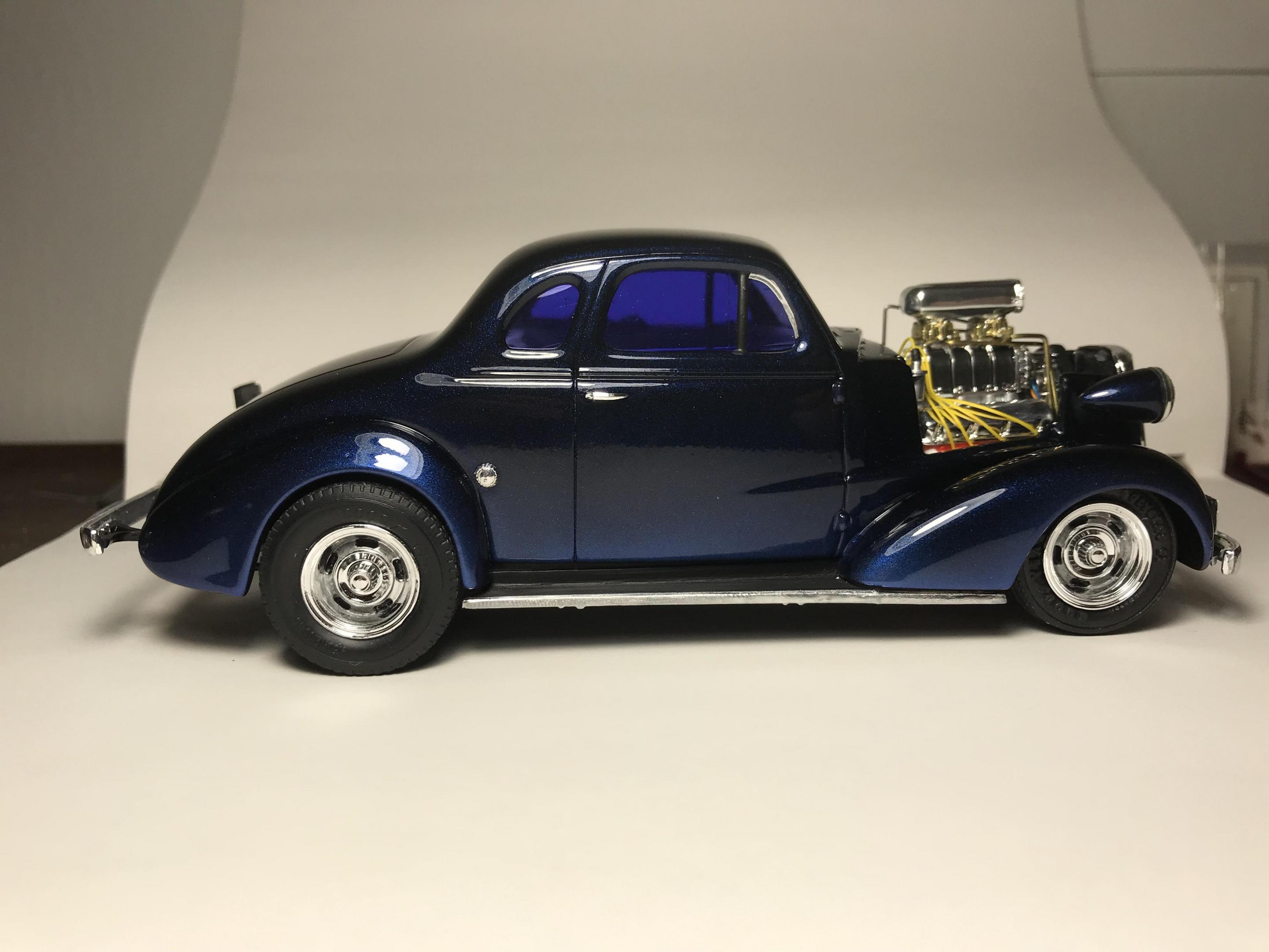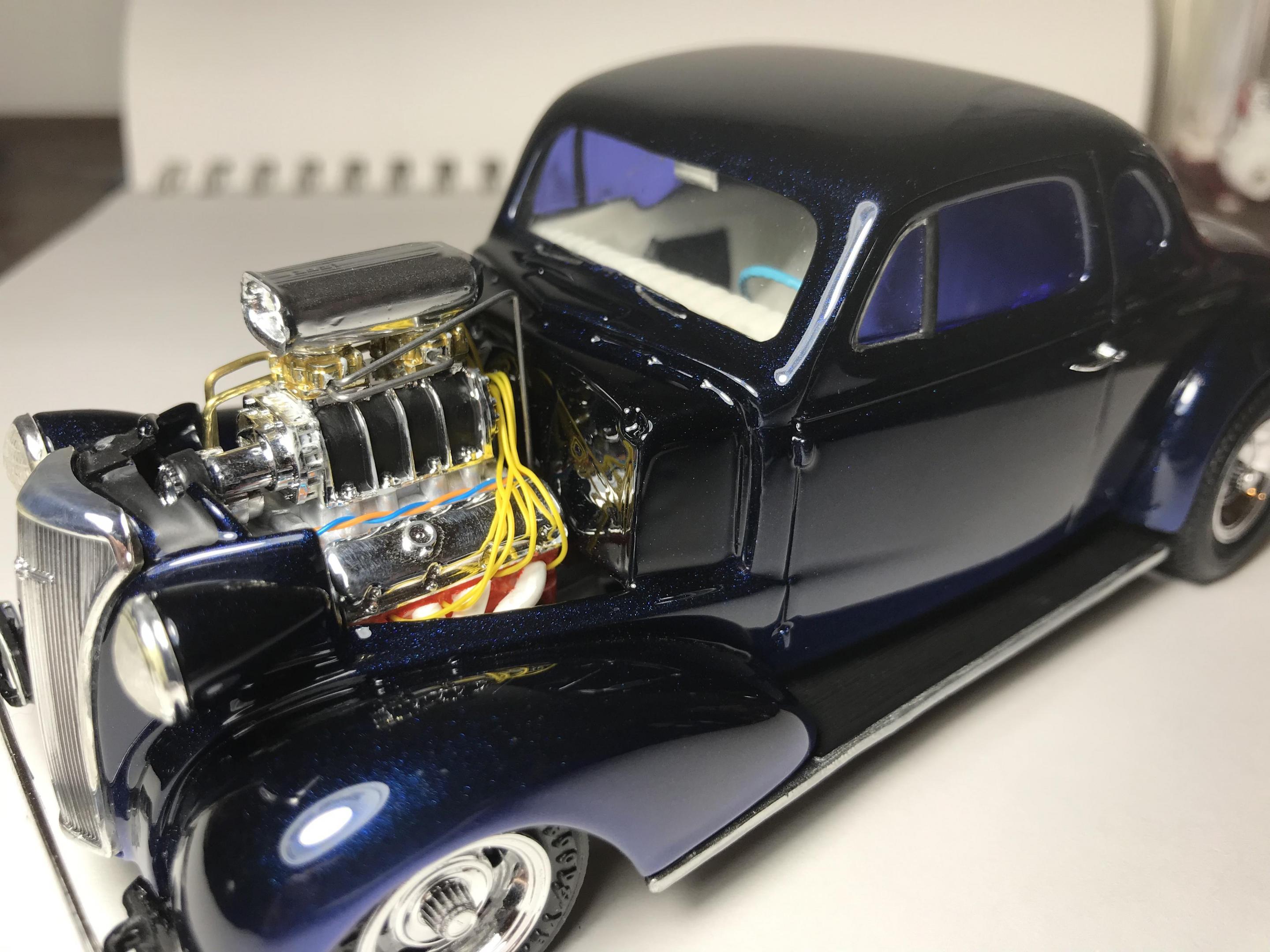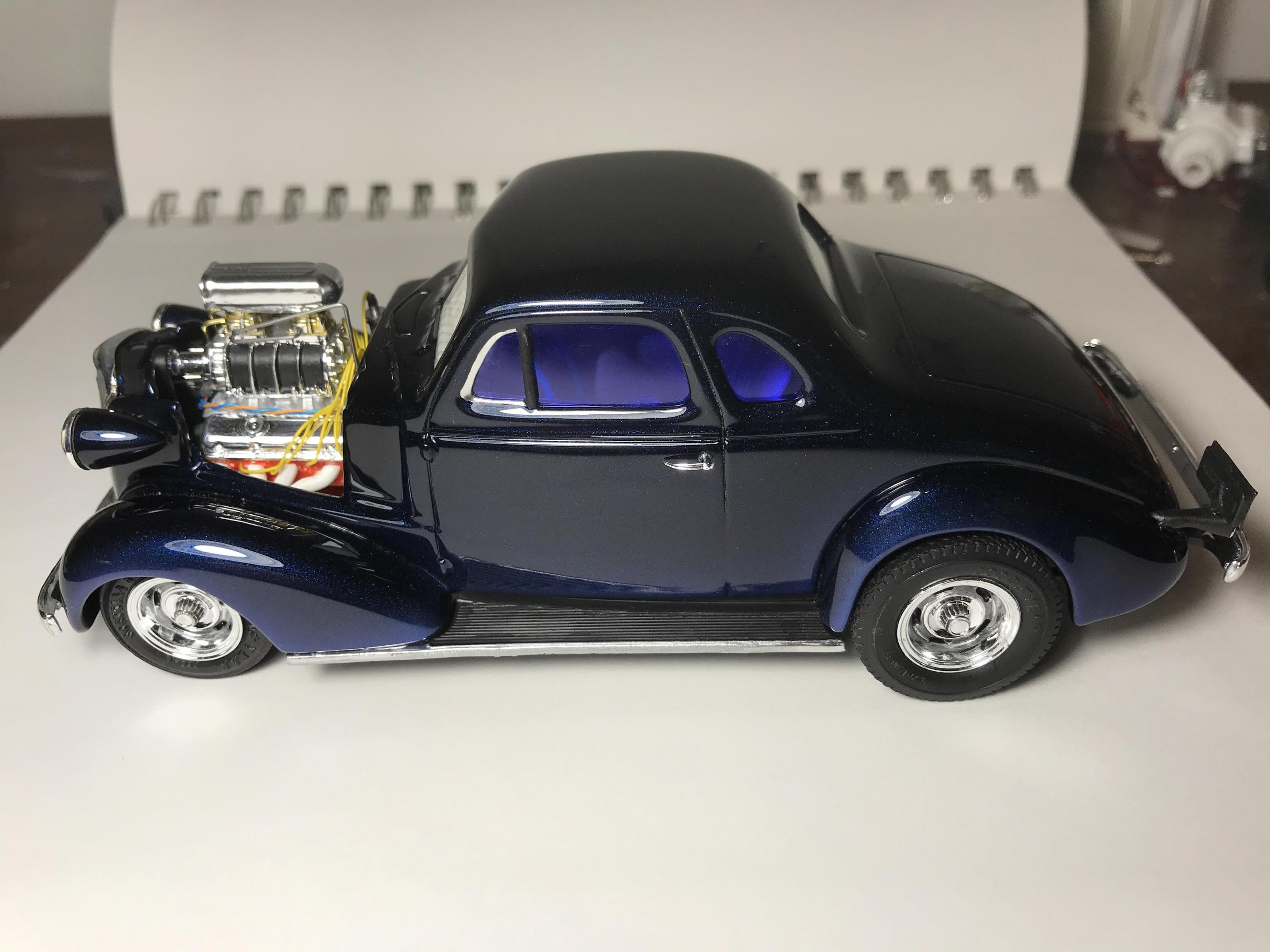 Another 37 Chevy amt , I really like this kit and built several over the years, this build this time is a street rod , body is pretty much stock with the exception of a slightly fared rear wheel wells, painted black with a blue pearl, big Chevy blown 454 motor, Chevy really wheels, blue tinted windows and it’s done, thanks for looking!