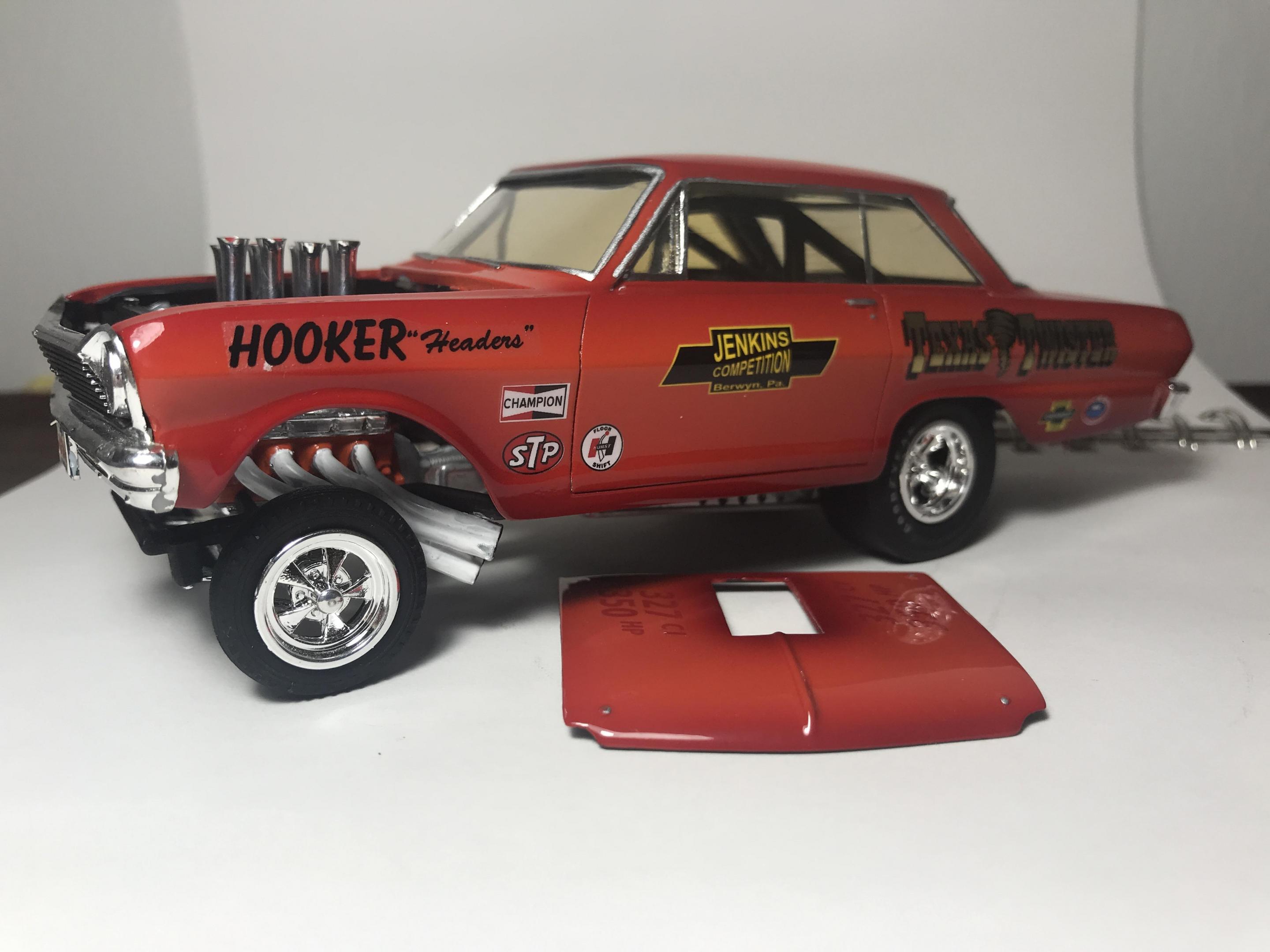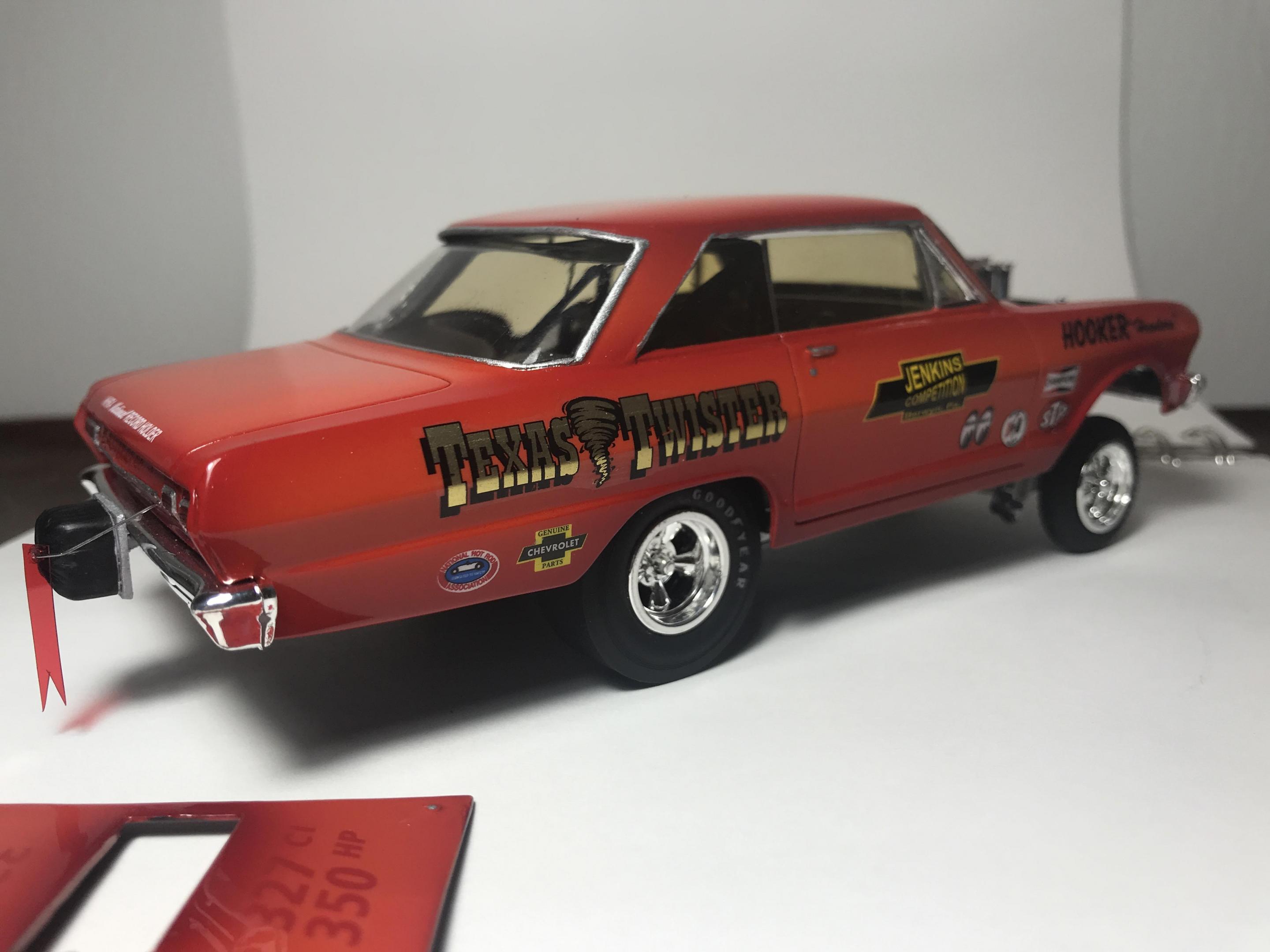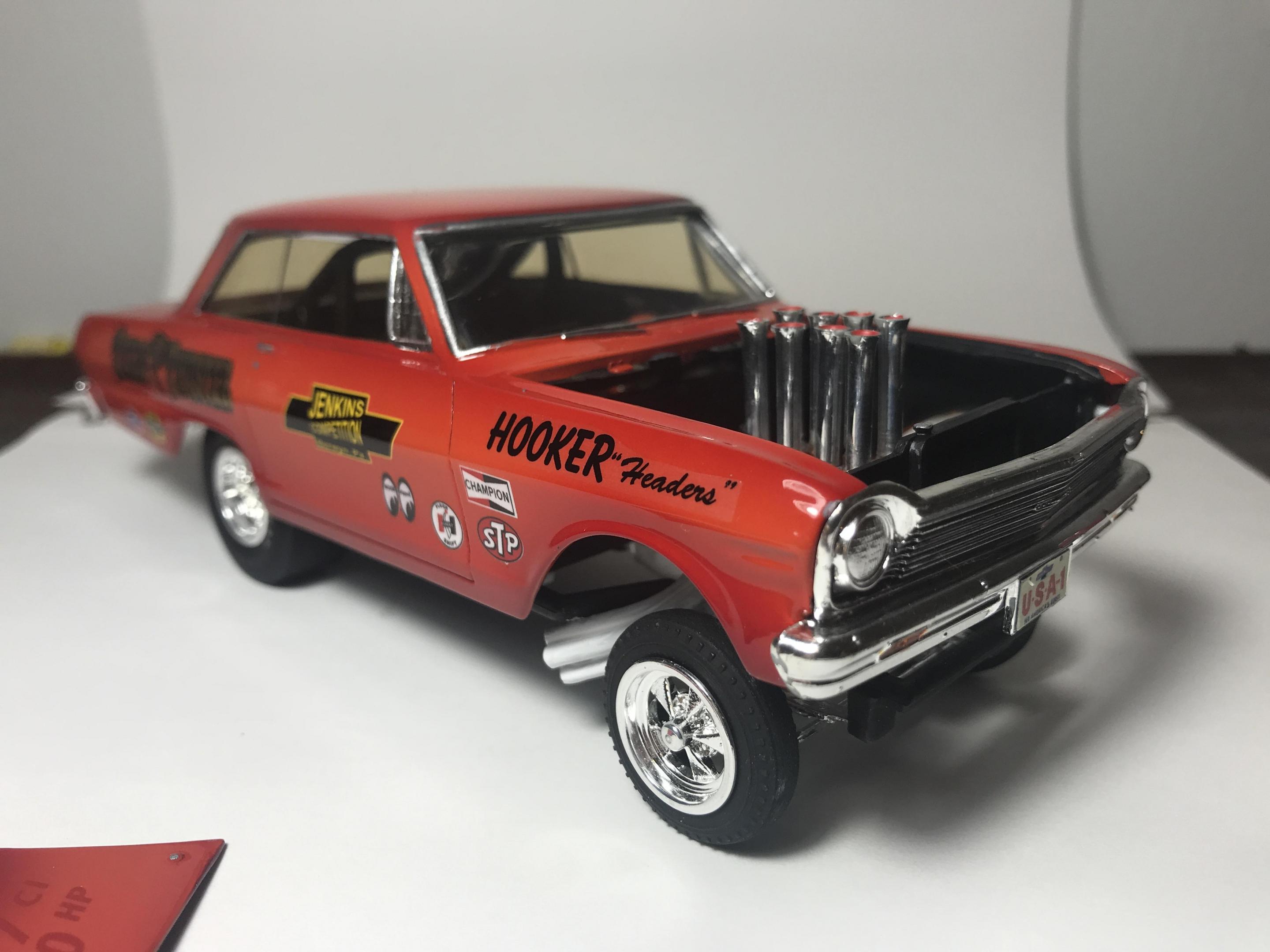 Here’s a amt 65 AWB Chevy 2 , I bought this as a 5 dollar glue bomb , after a total tear down and paint strip it was ready to be built back up to where it is today , Im very happy with the way looks now , covered in a pearl orange and a candy red fade , thanks for looking!