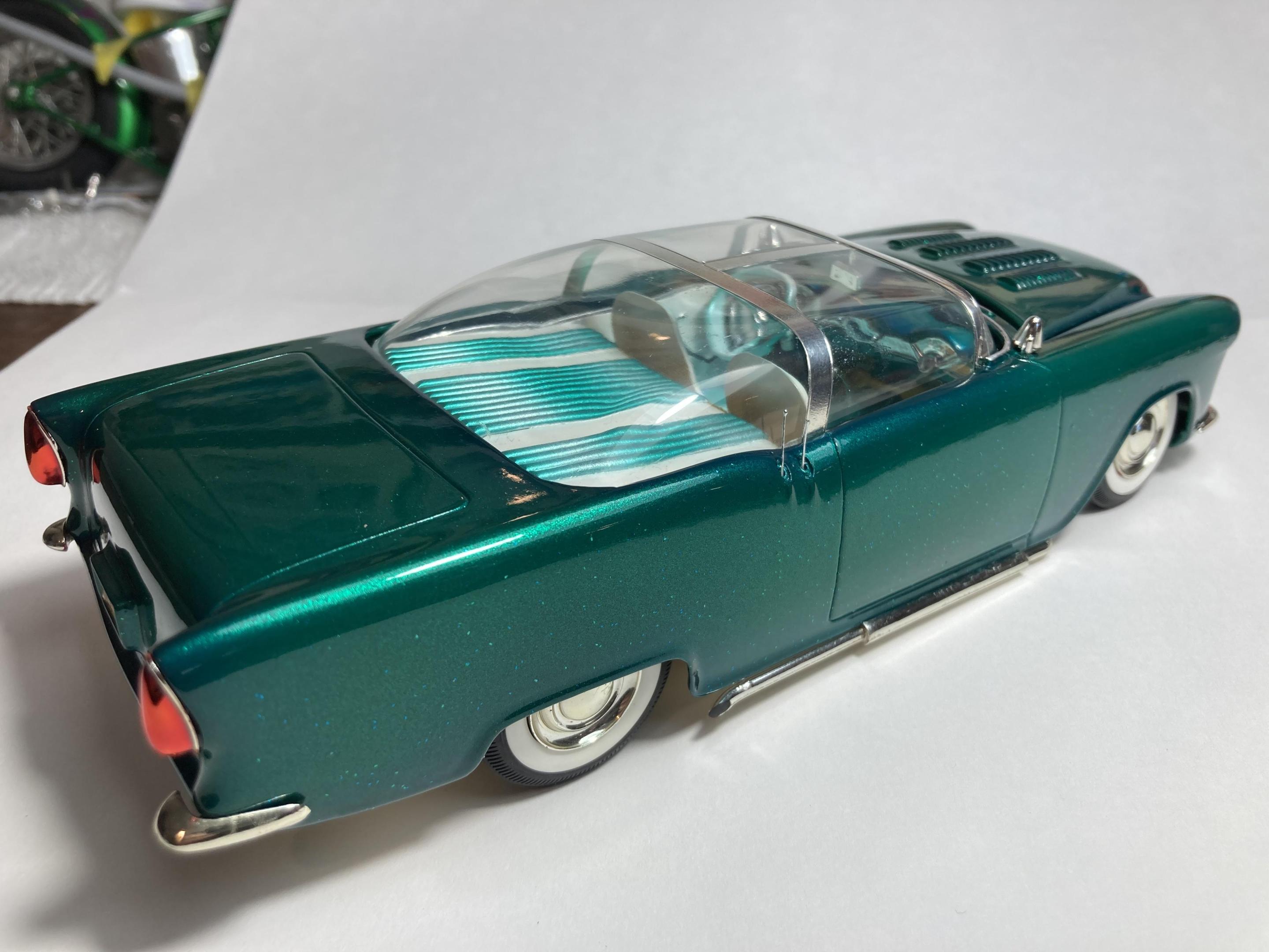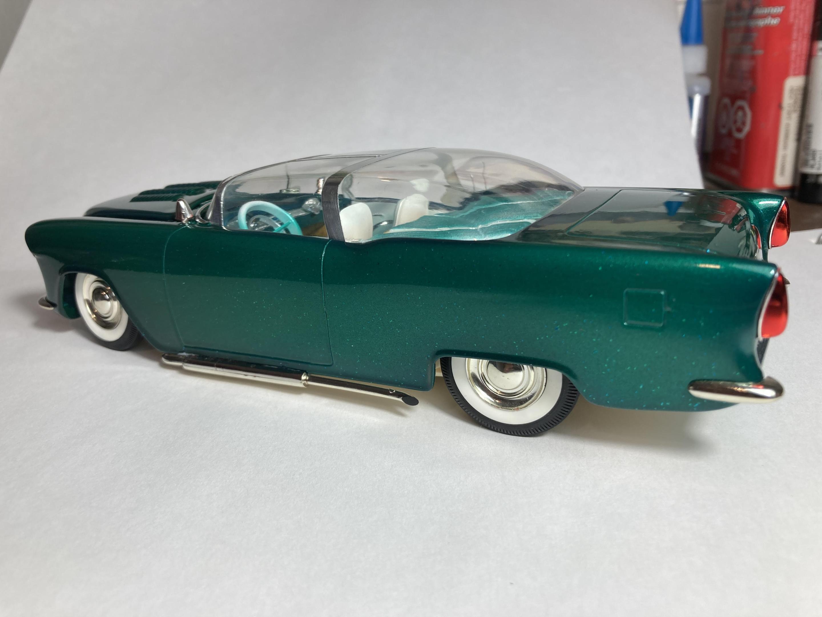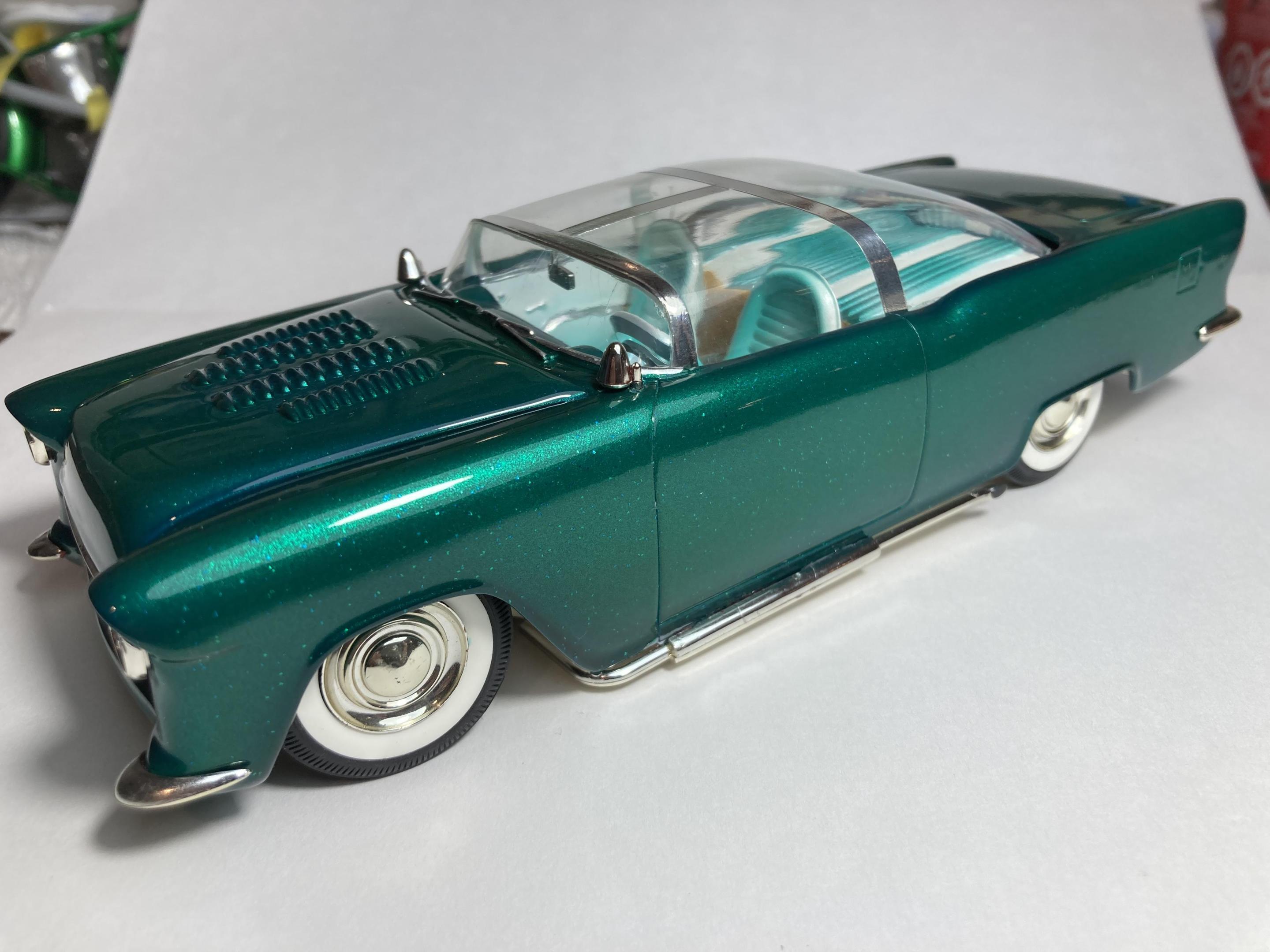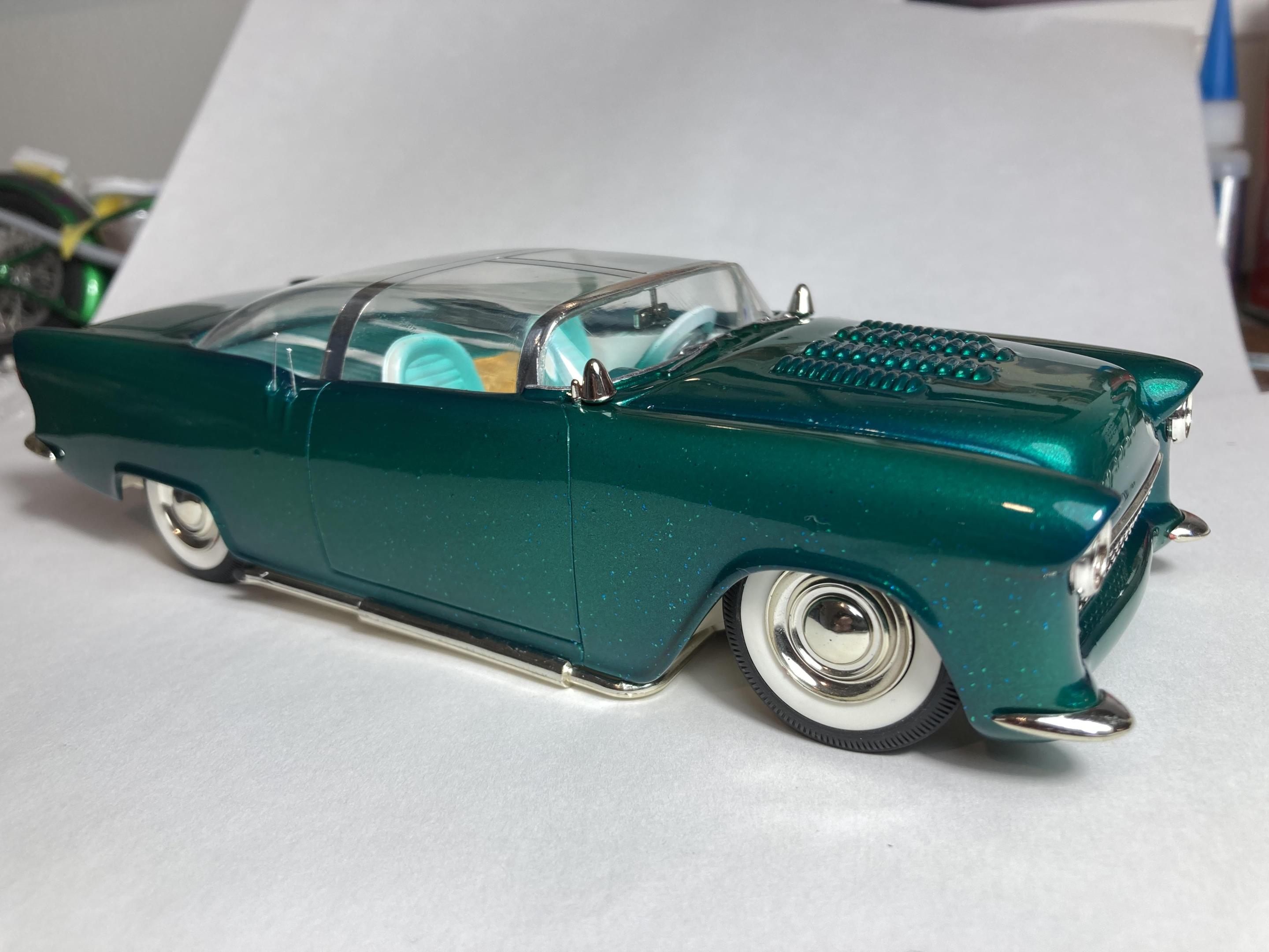 Here’s another one I just finished, this is the early Monogram 1955 Chevy , when I got this kit the windshield post was broken and after trying to repair it a few times I finally just cut it and glued the windshield to the custom bubble top and re made a new windshield post allowing me to be able to chop the top, adding most of the kit supplied custom parts ,shaving all the chrome and giving the car the stance I wanted , it was ready for primer and paint, candy green mixed with candy teal and sprinkle with a rainbow flake, and topped with a 2 K clear coat, all this over a silver metal flake base, pearl white and candy teal interior, I didn’t like the way you could look down though the bubble and see the stock rear seat so I made a rear cover, all in all it was a fun fast build of a vintage kit ,complete build about a week, hope you enjoy.
